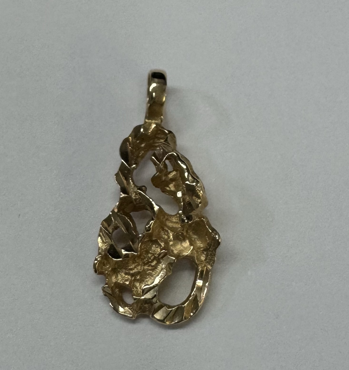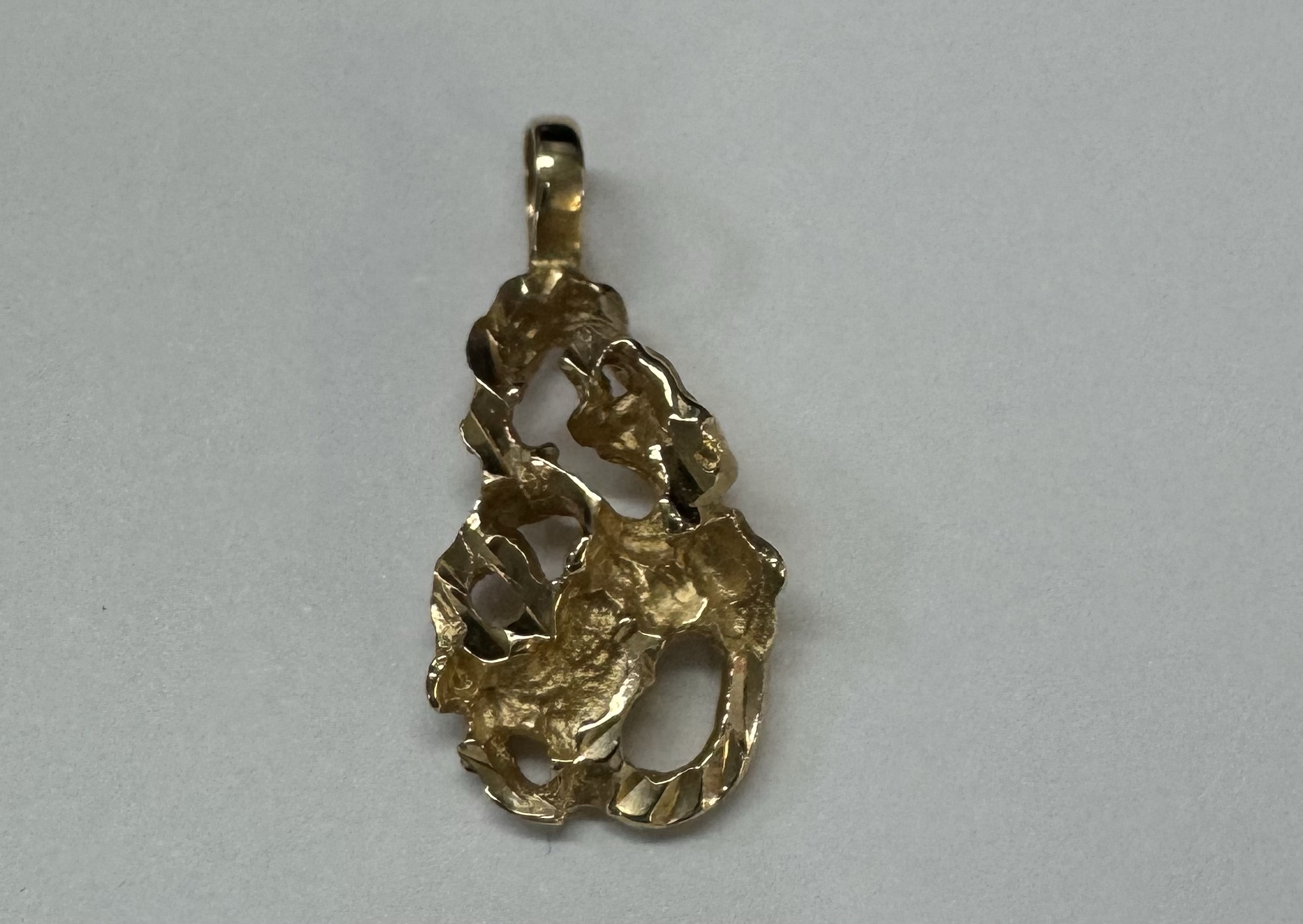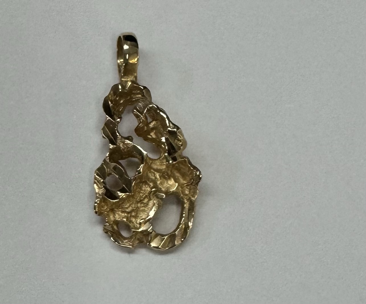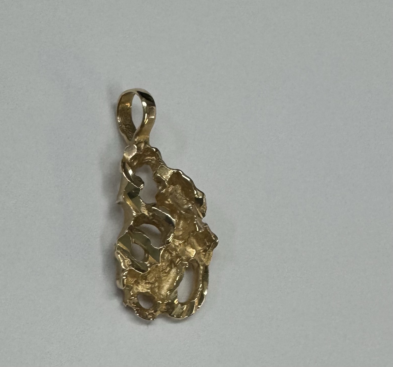 14k yellow gold openwork gold nugget motif charm. This charm has an entire weight of 2.1 grams.