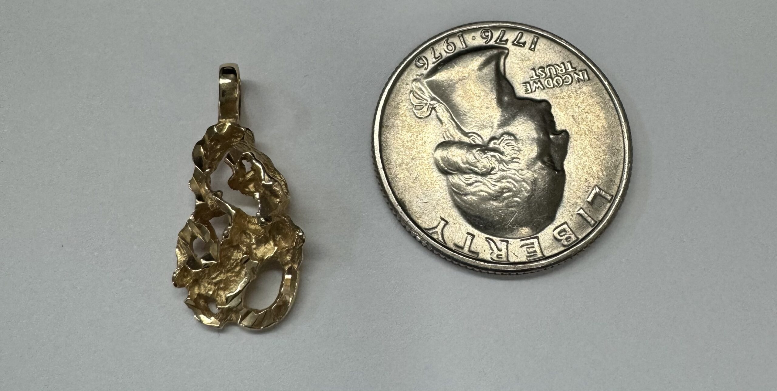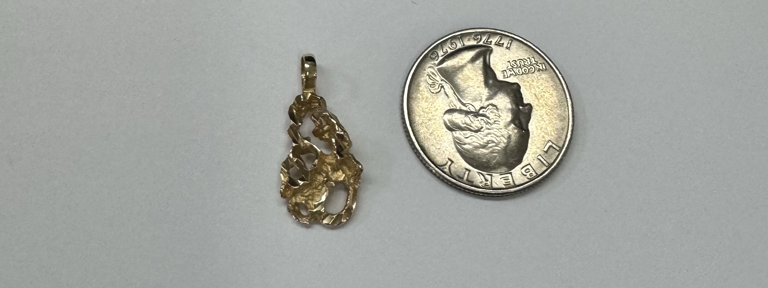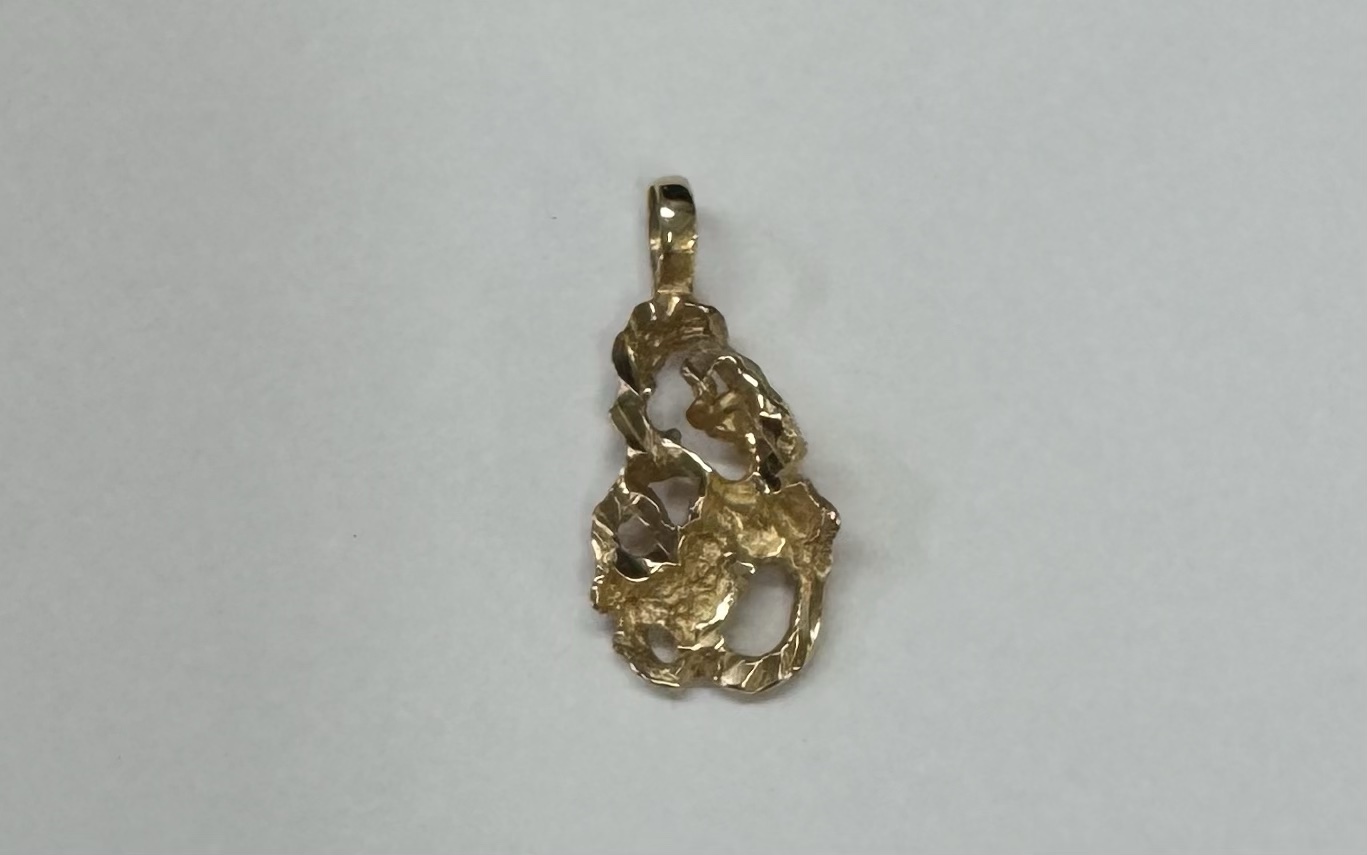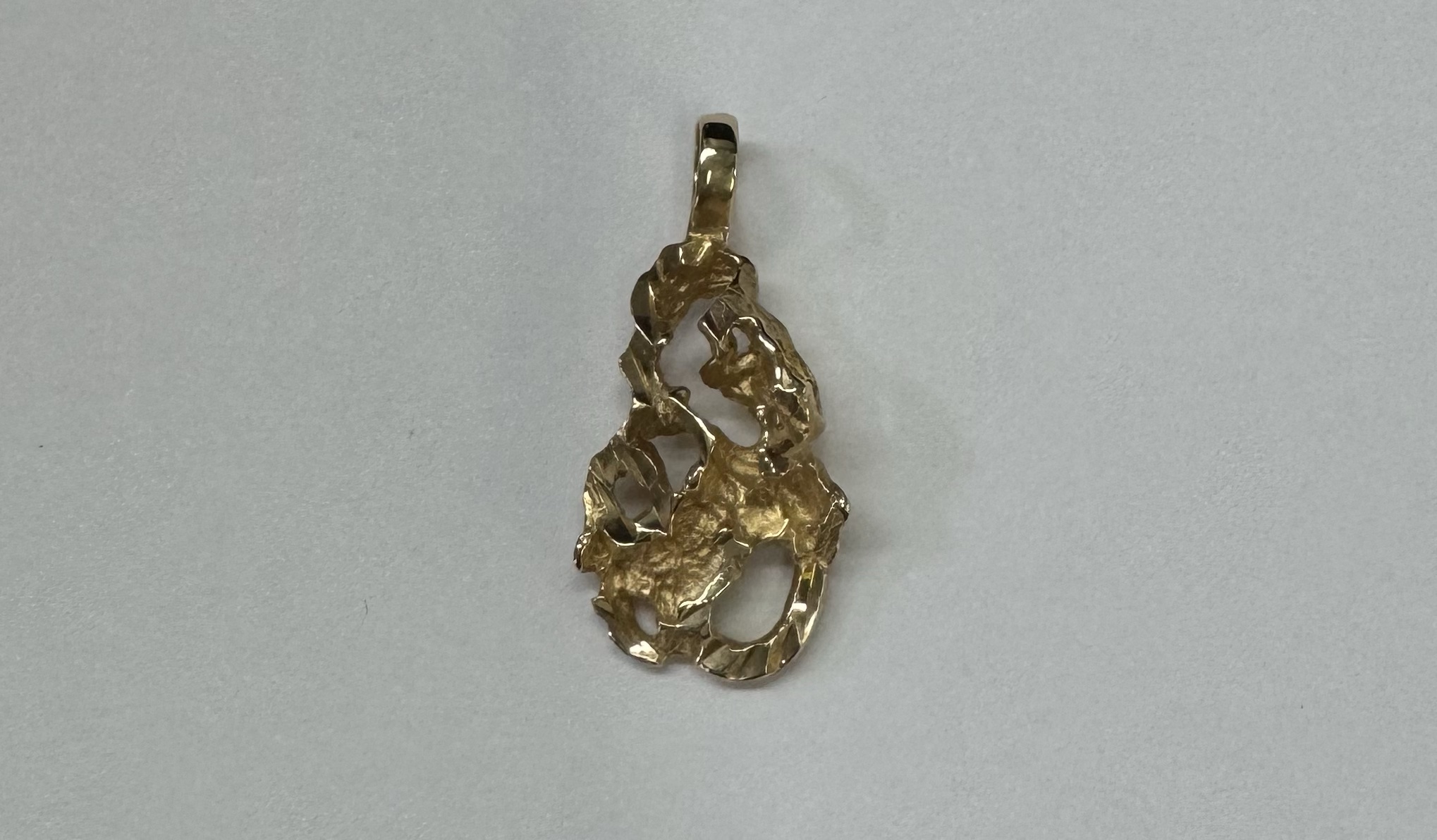 14k yellow gold openwork gold nugget motif charm. This charm has an entire weight of 2.1 grams.