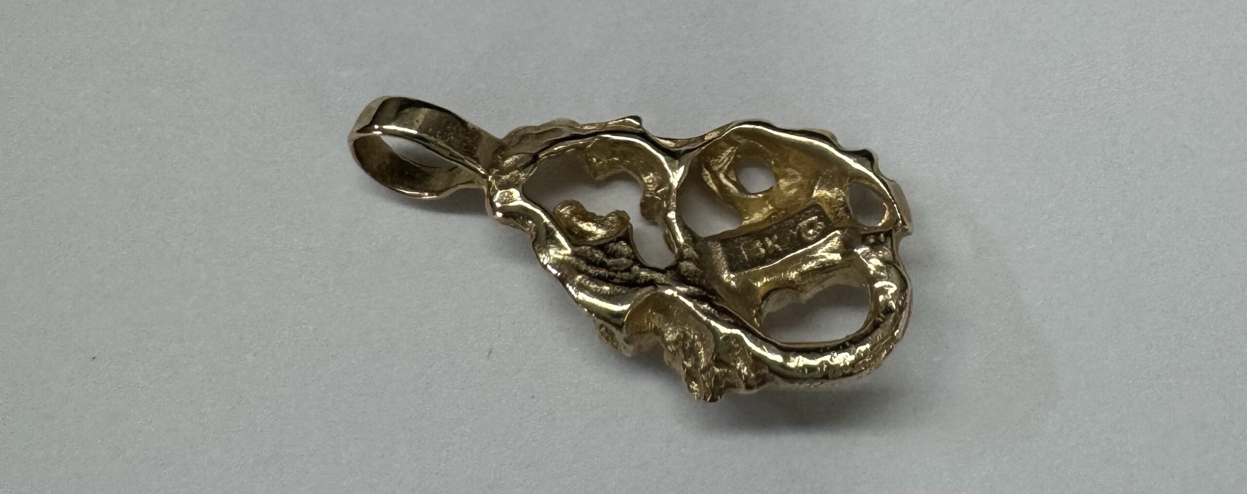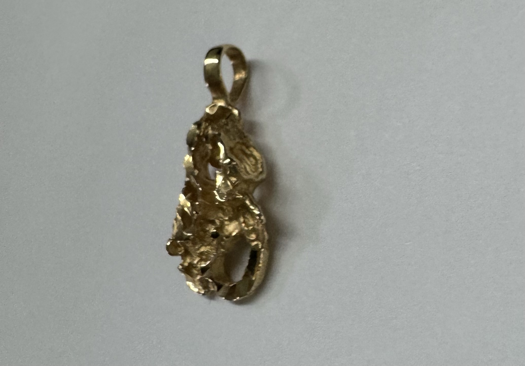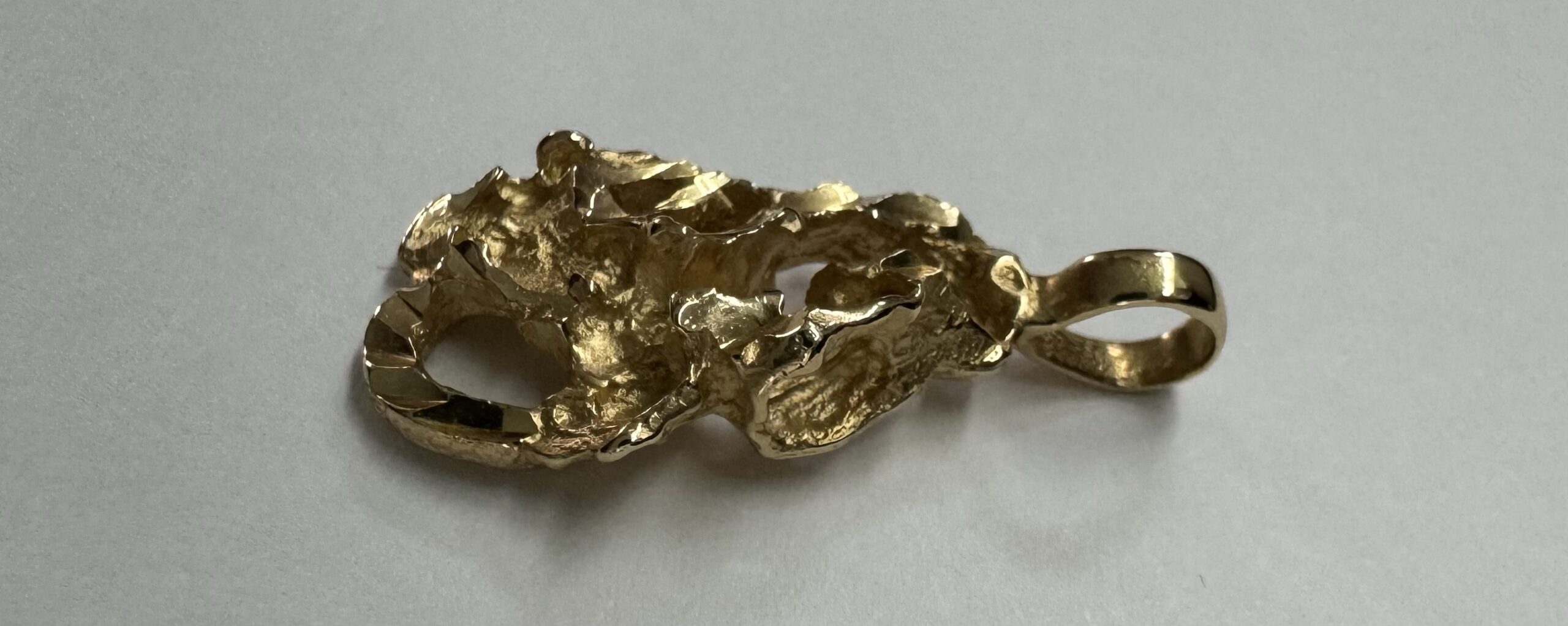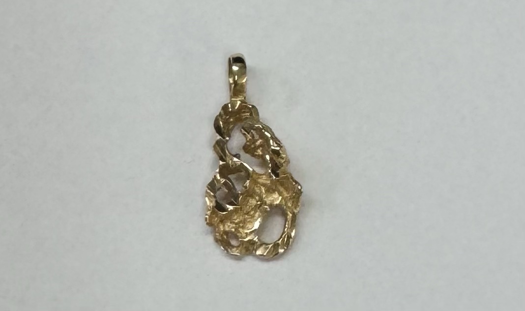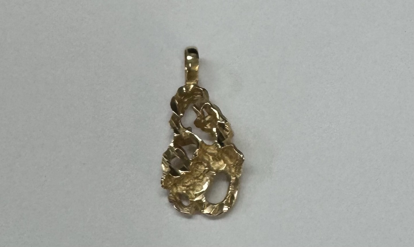 14k yellow gold openwork gold nugget motif charm. This charm has an entire weight of 2.1 grams.