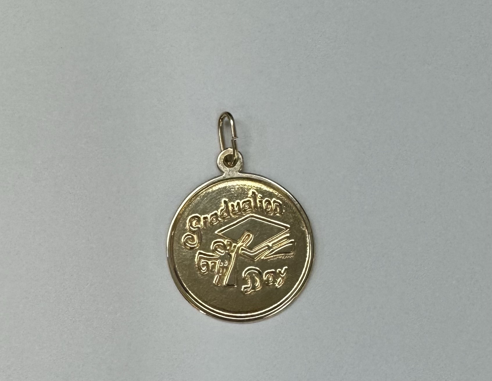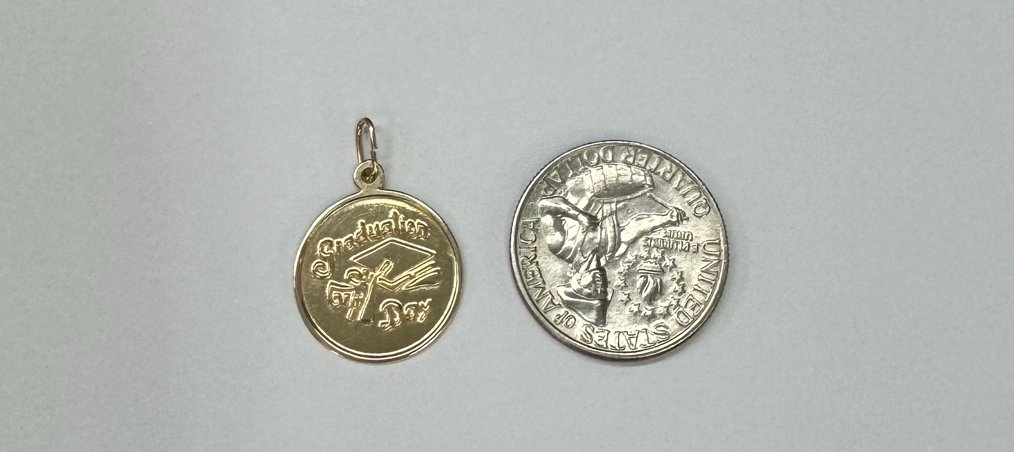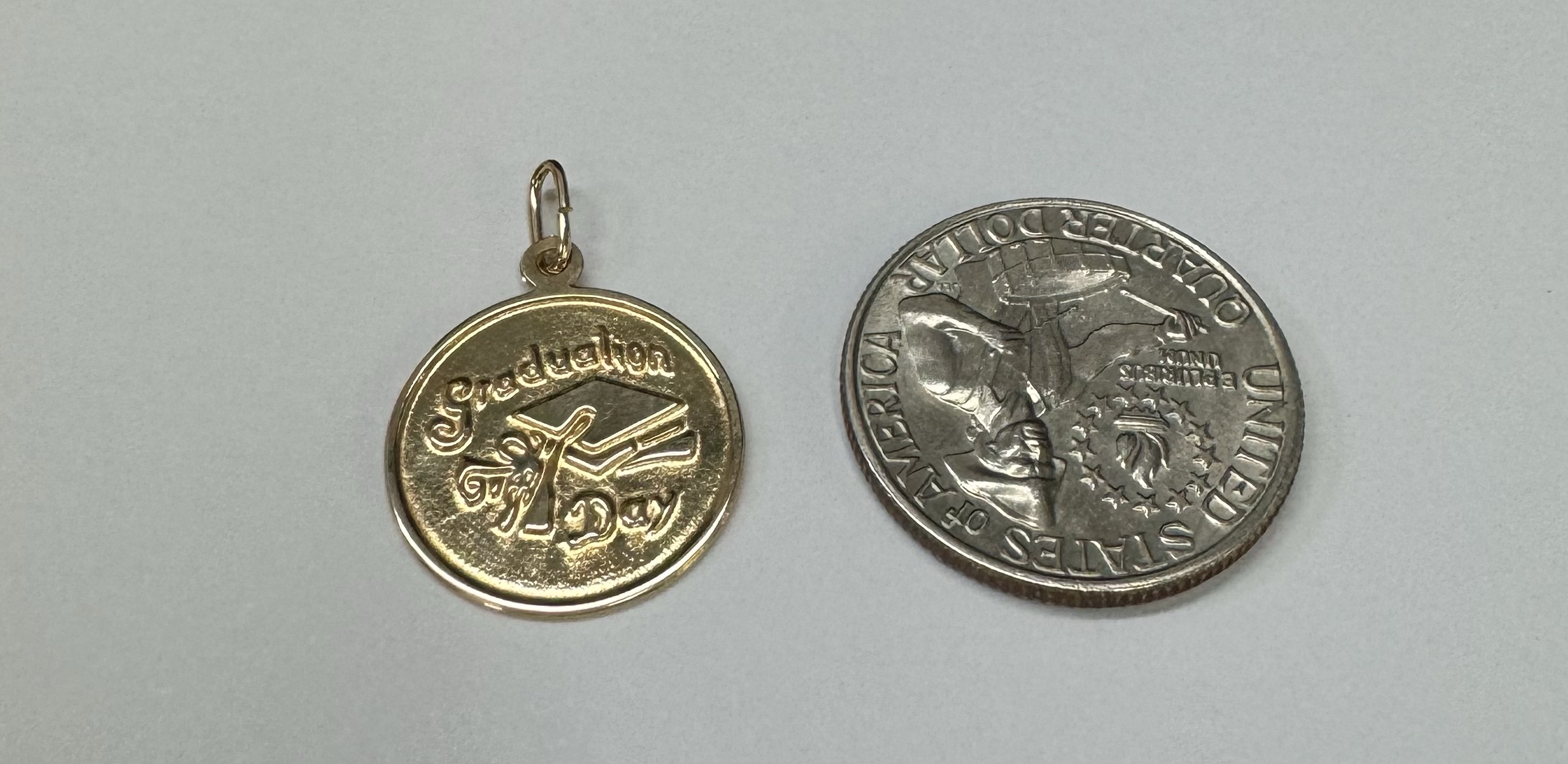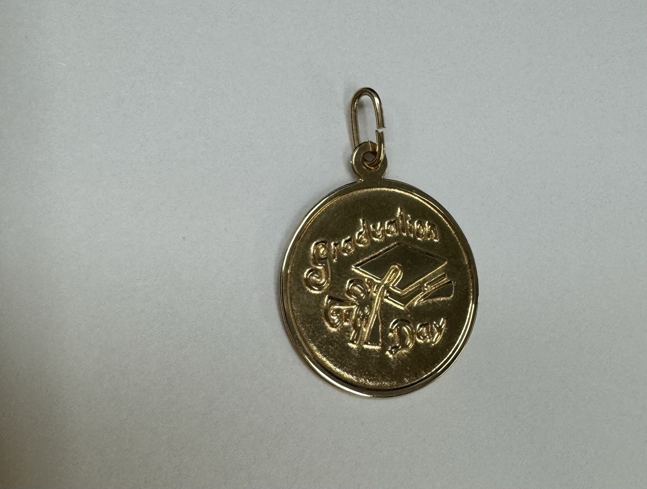 14k yellow gold “Graduation Day” disc charm/pendant. This piece had an entire weight of 1.6 grams.