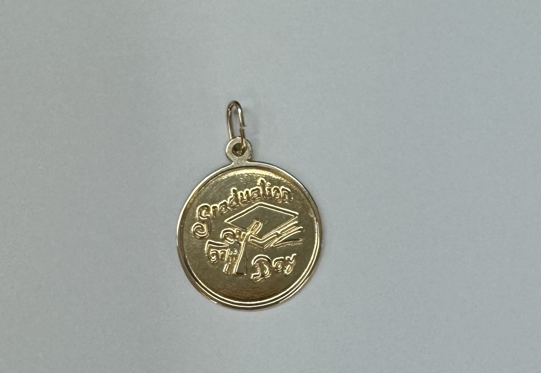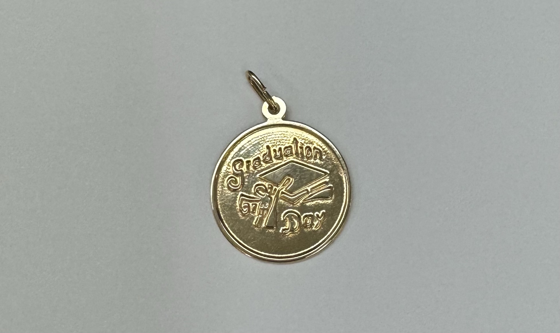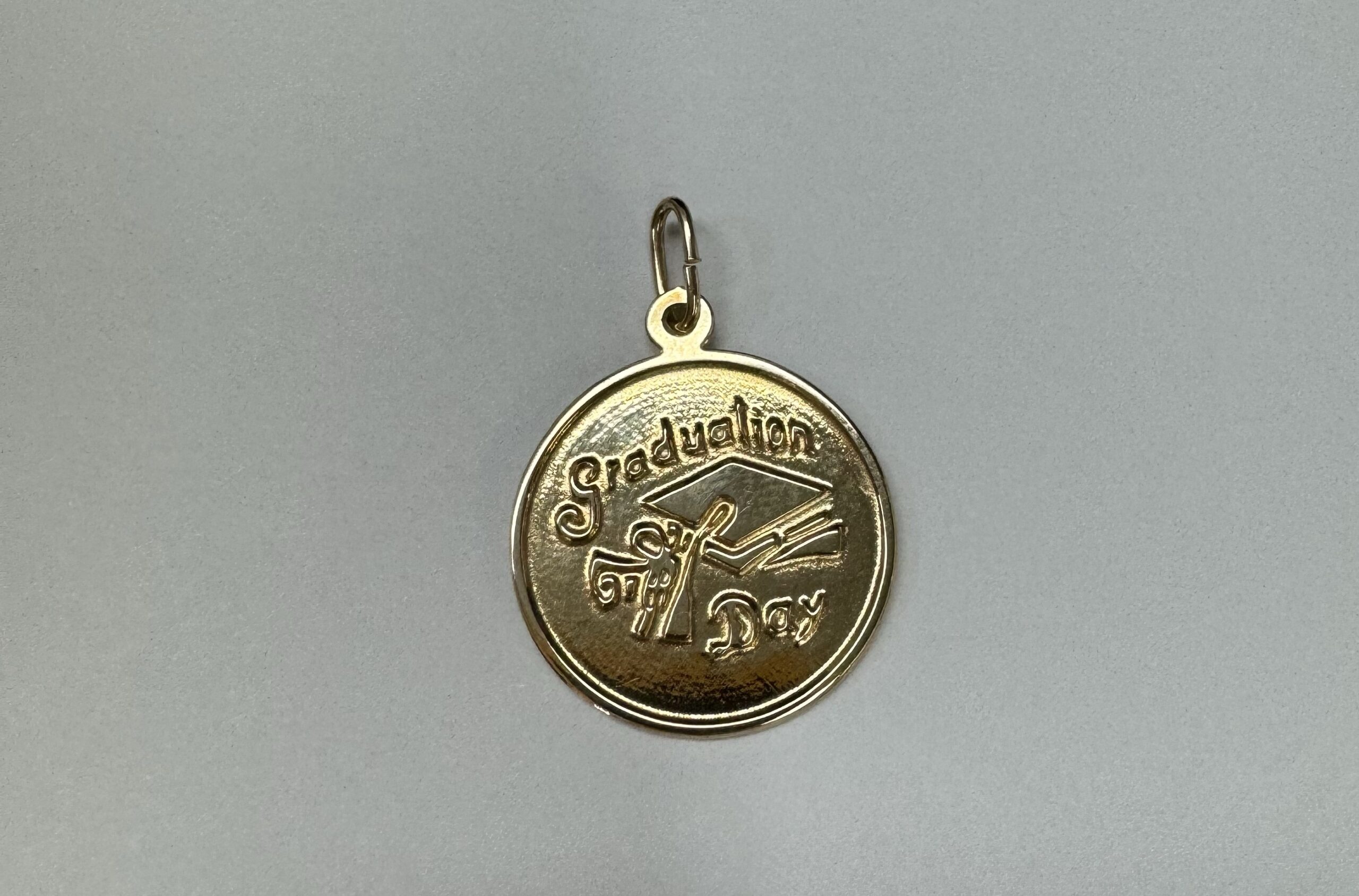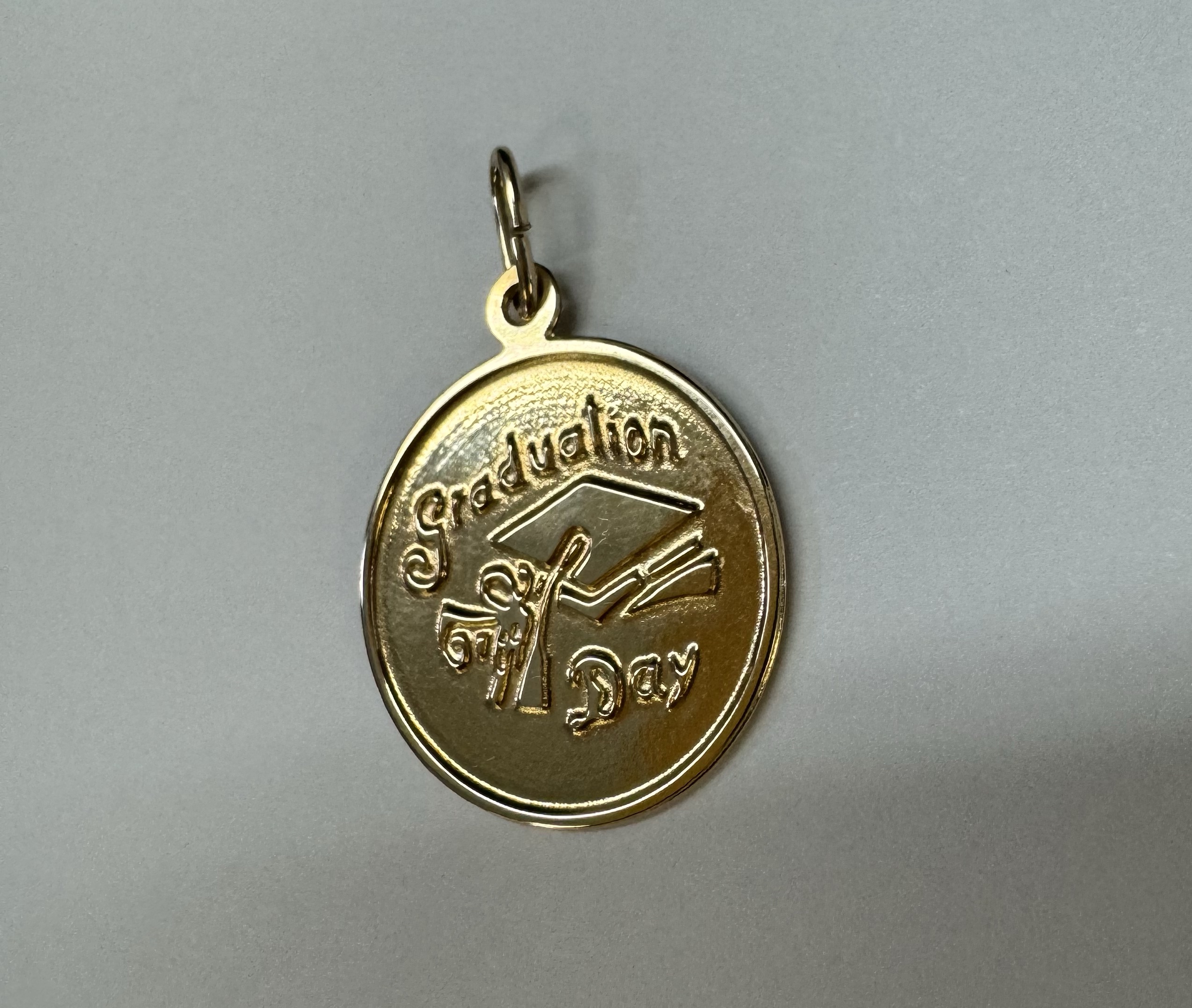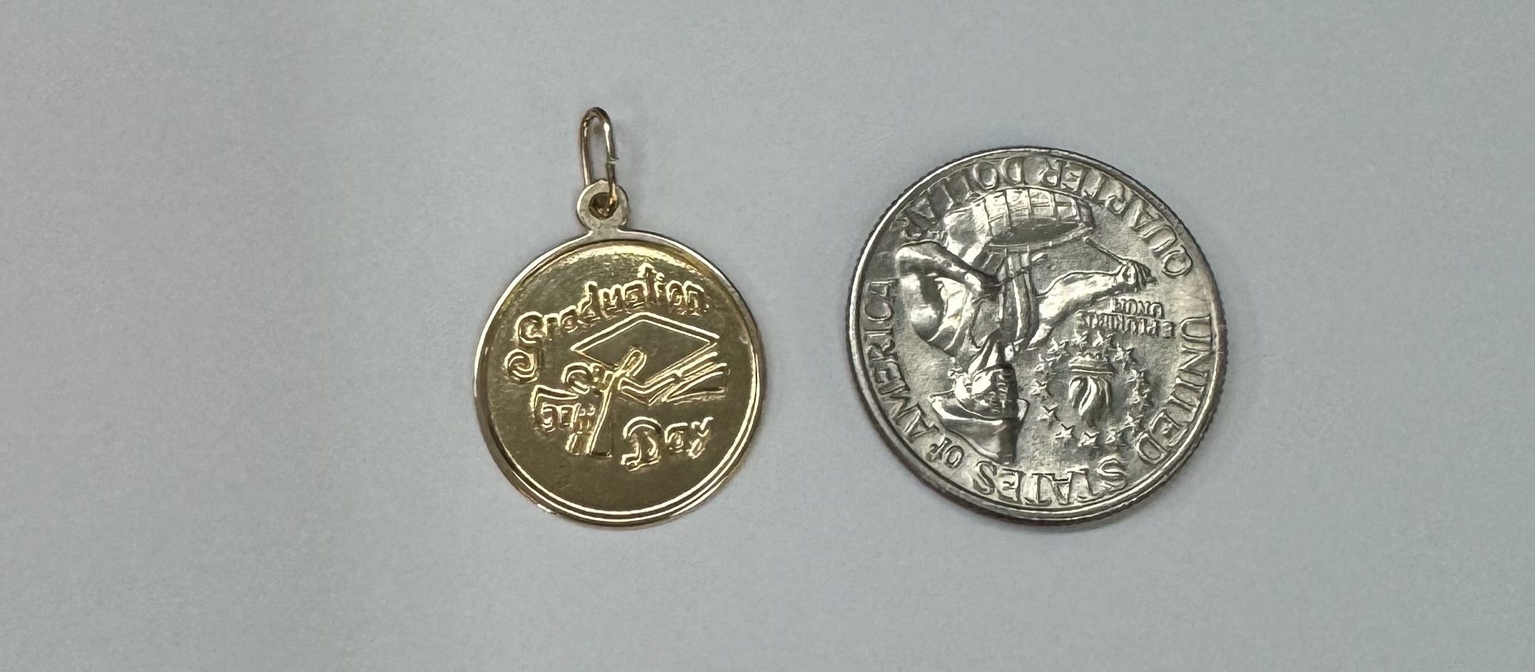 14k yellow gold “Graduation Day” disc charm/pendant. This piece had an entire weight of 1.6 grams.