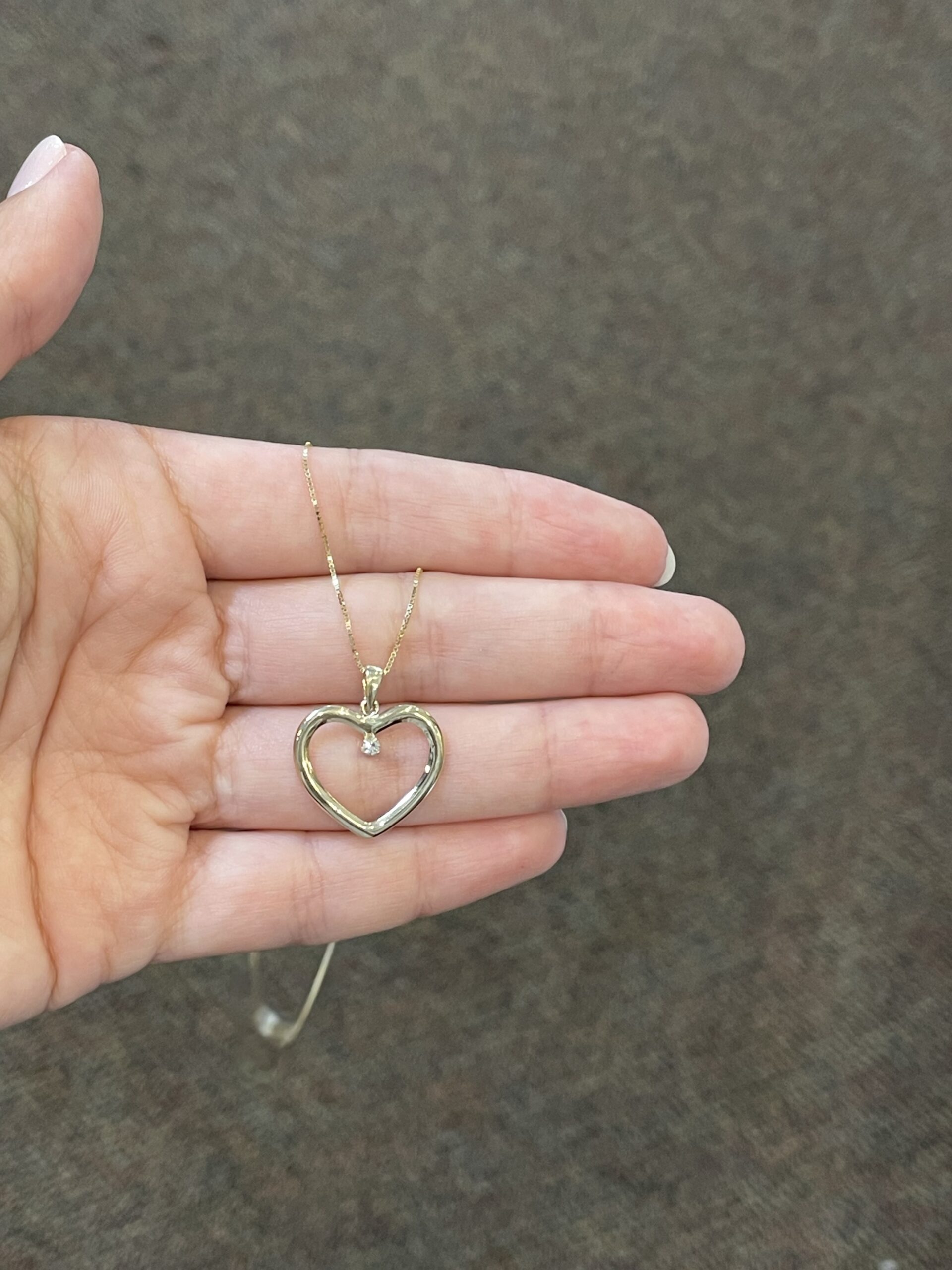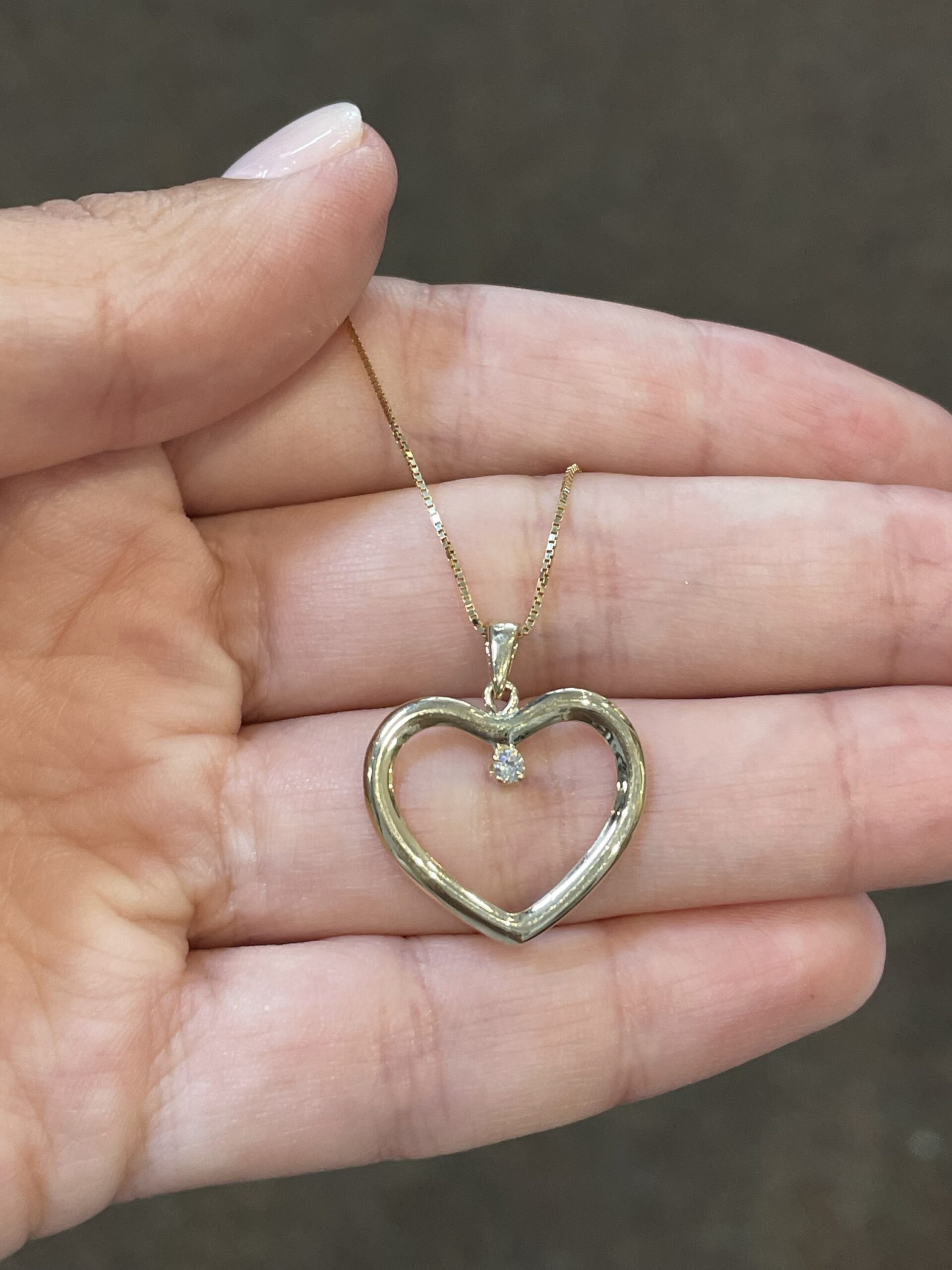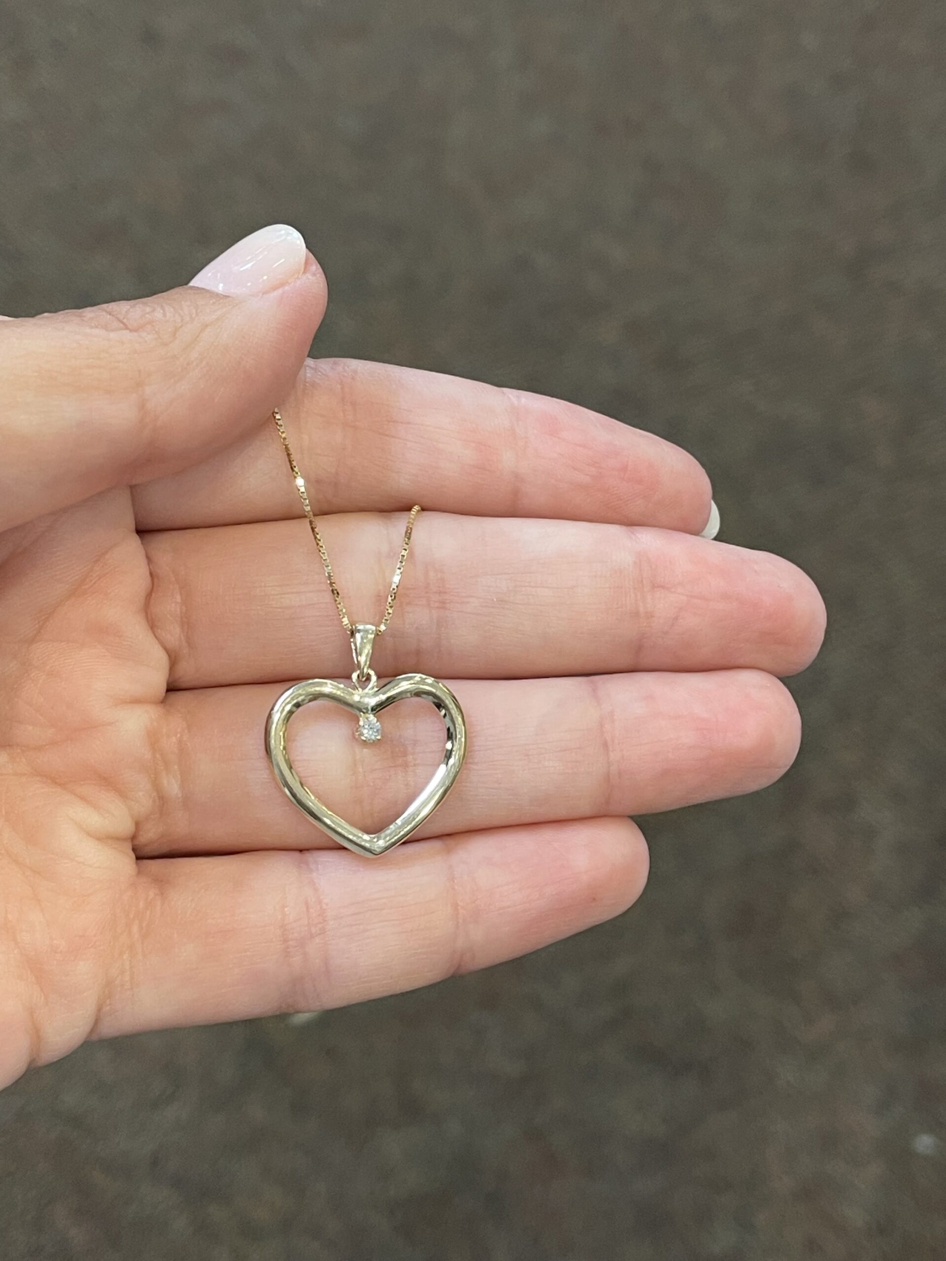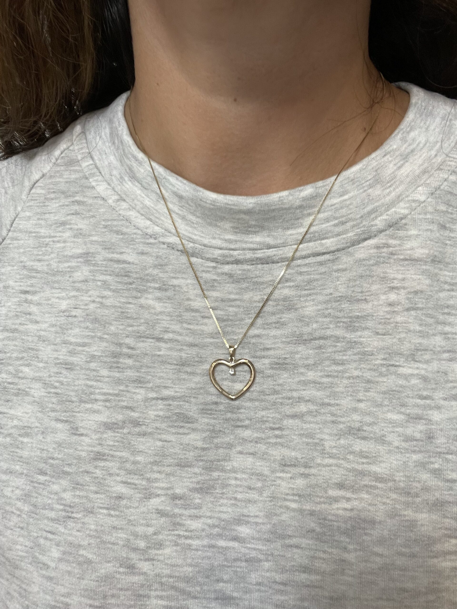 14k yellow gold open heart pendant with one genuine .05 Cttw Round Brilliant Cut diamond accent, suspended from an 18″ 14k yellow gold box chain with spring ring clasp. This diamond has a color grade of H, and a clarity grade of SI.