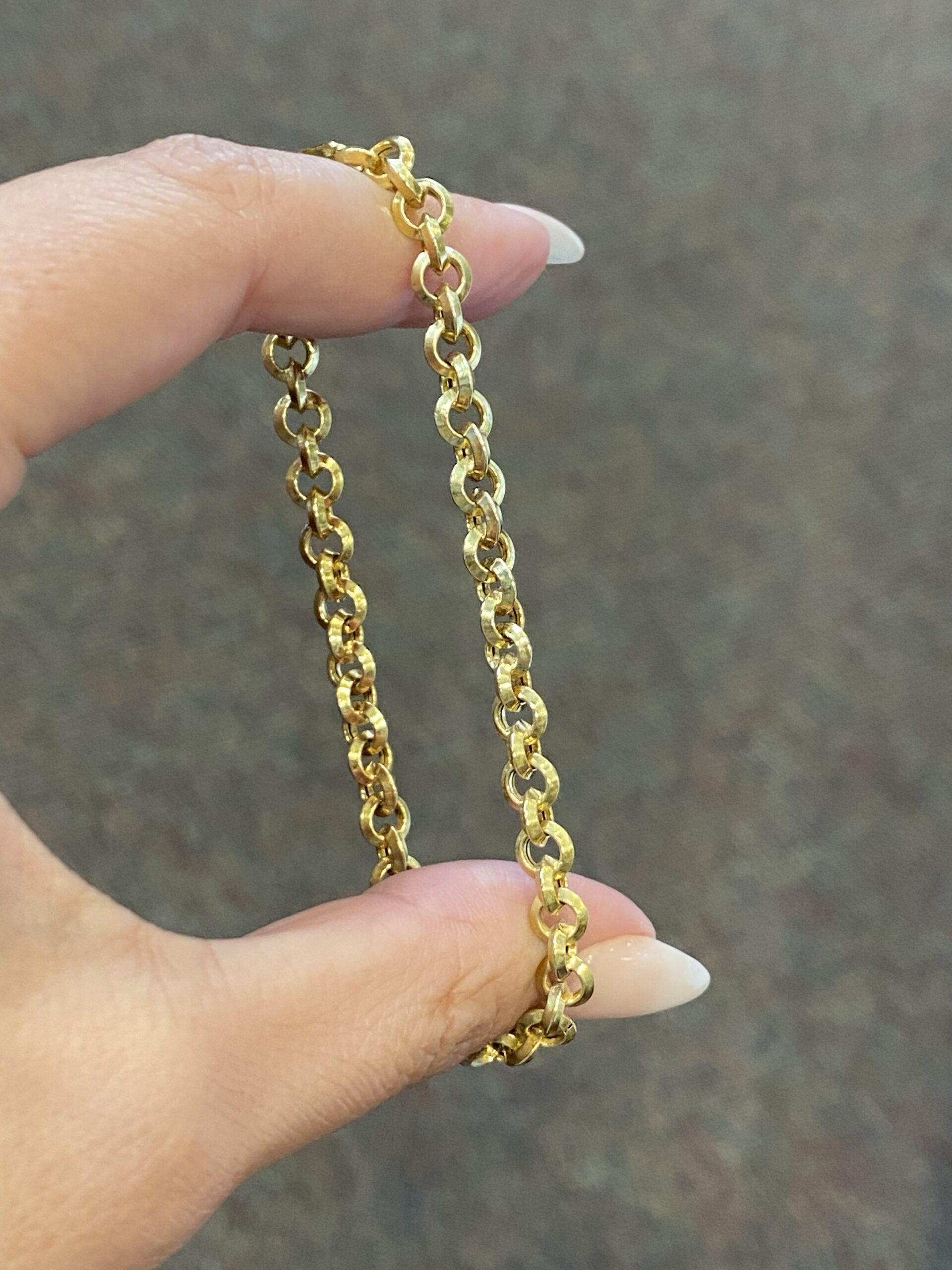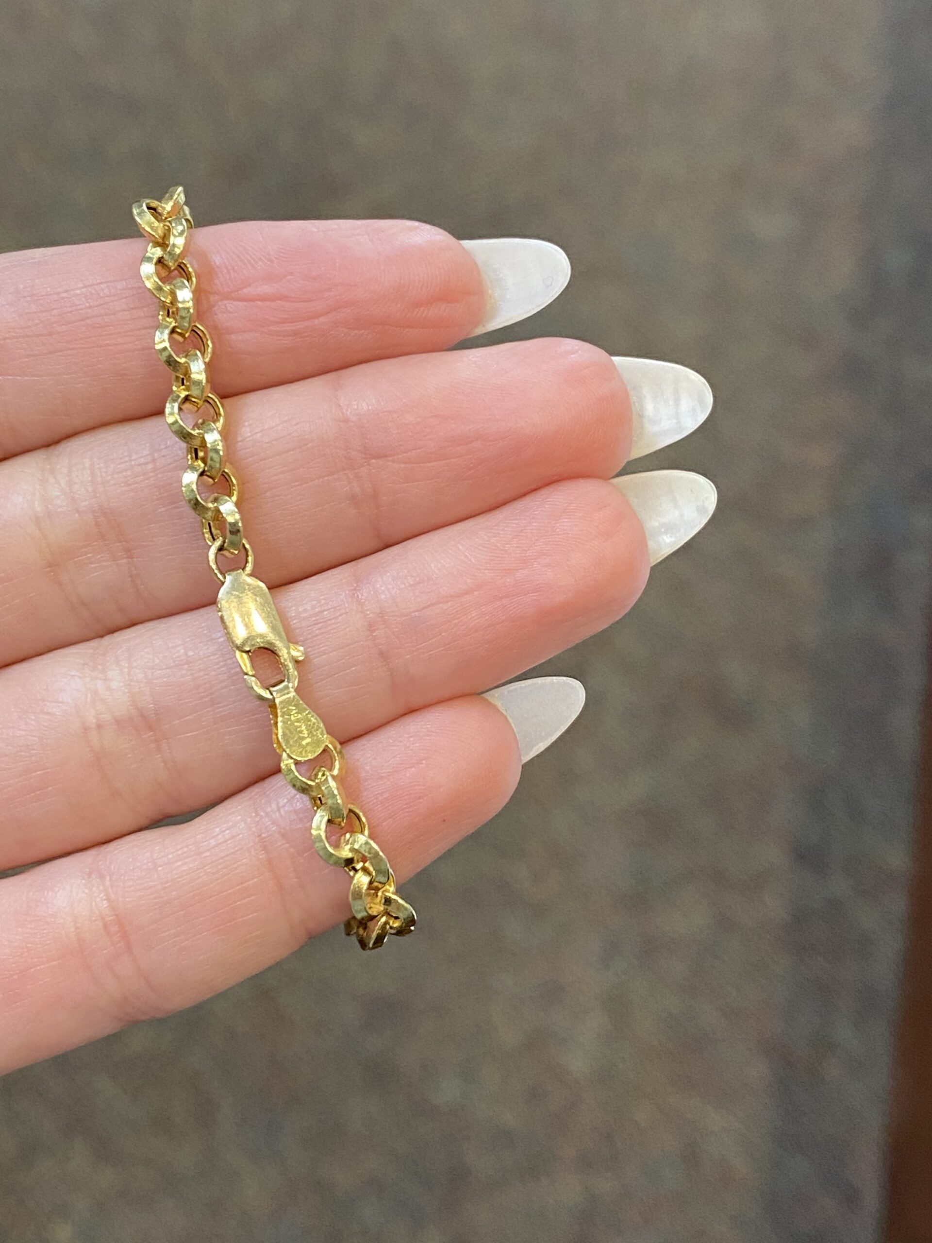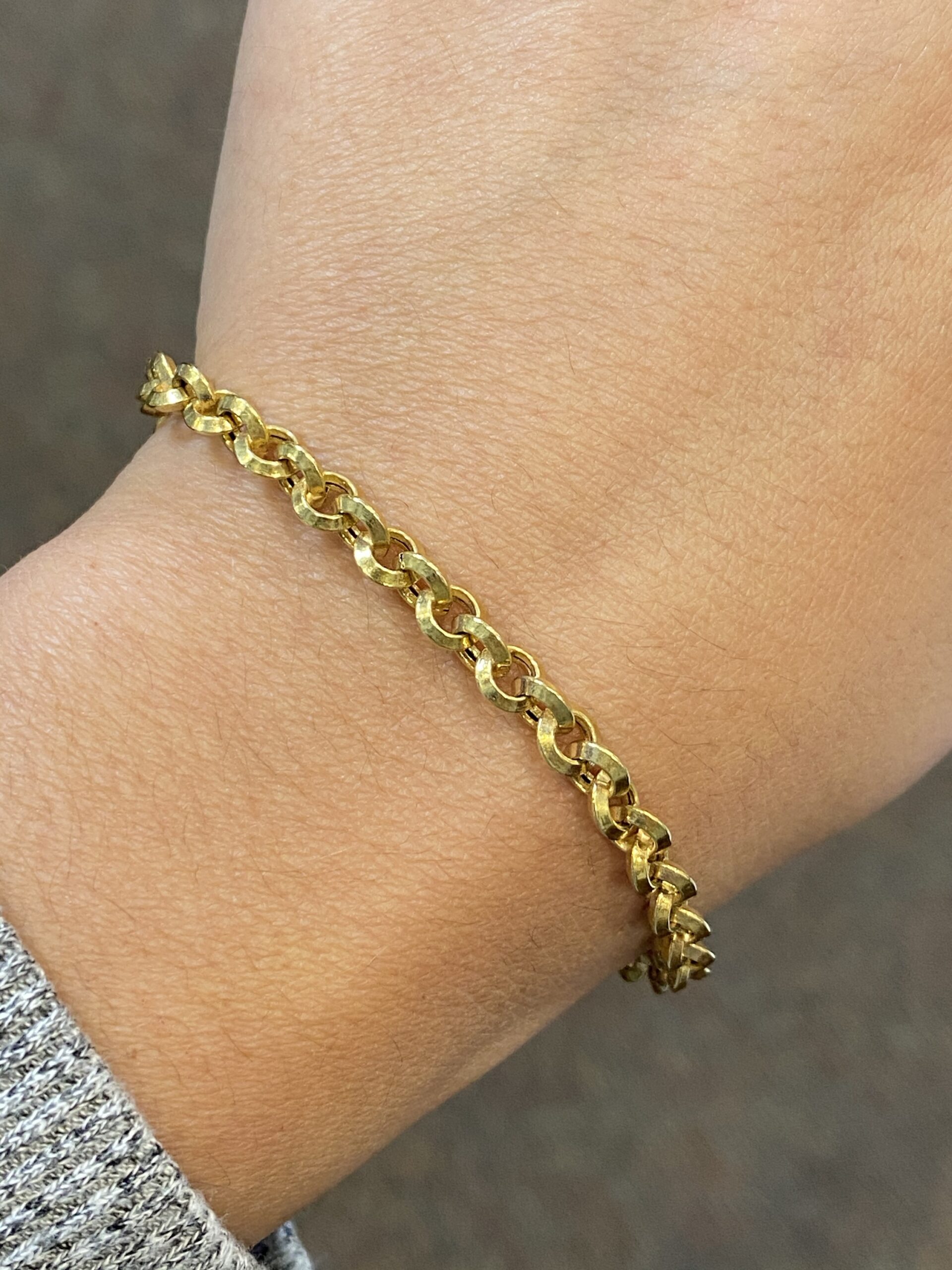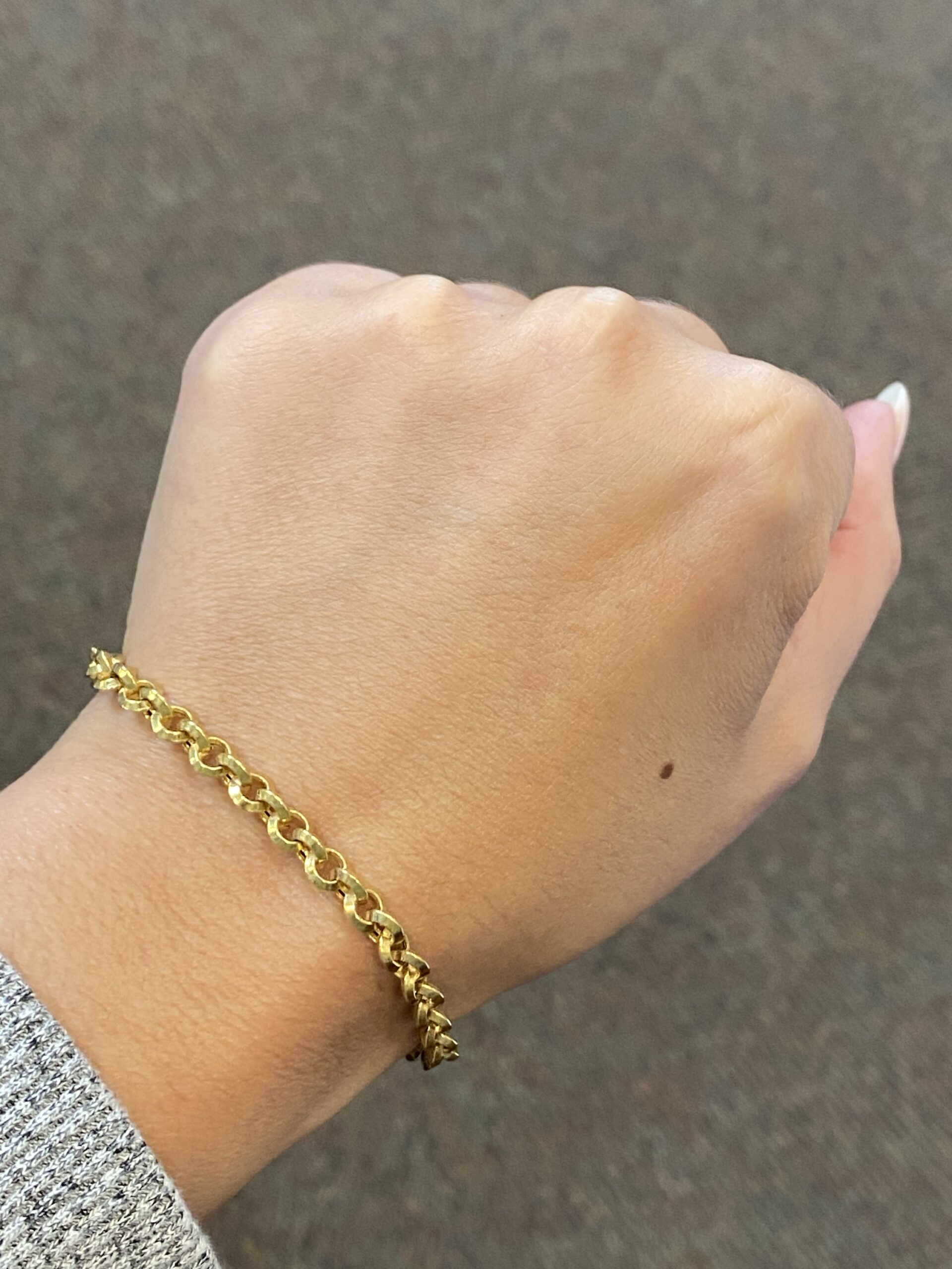 14k yellow gold open circle link bracelet with lobster claw clasp. This bracelet measures 8” in length, 5.5 mm in width, and it has an entire weight of 5.5 grams.