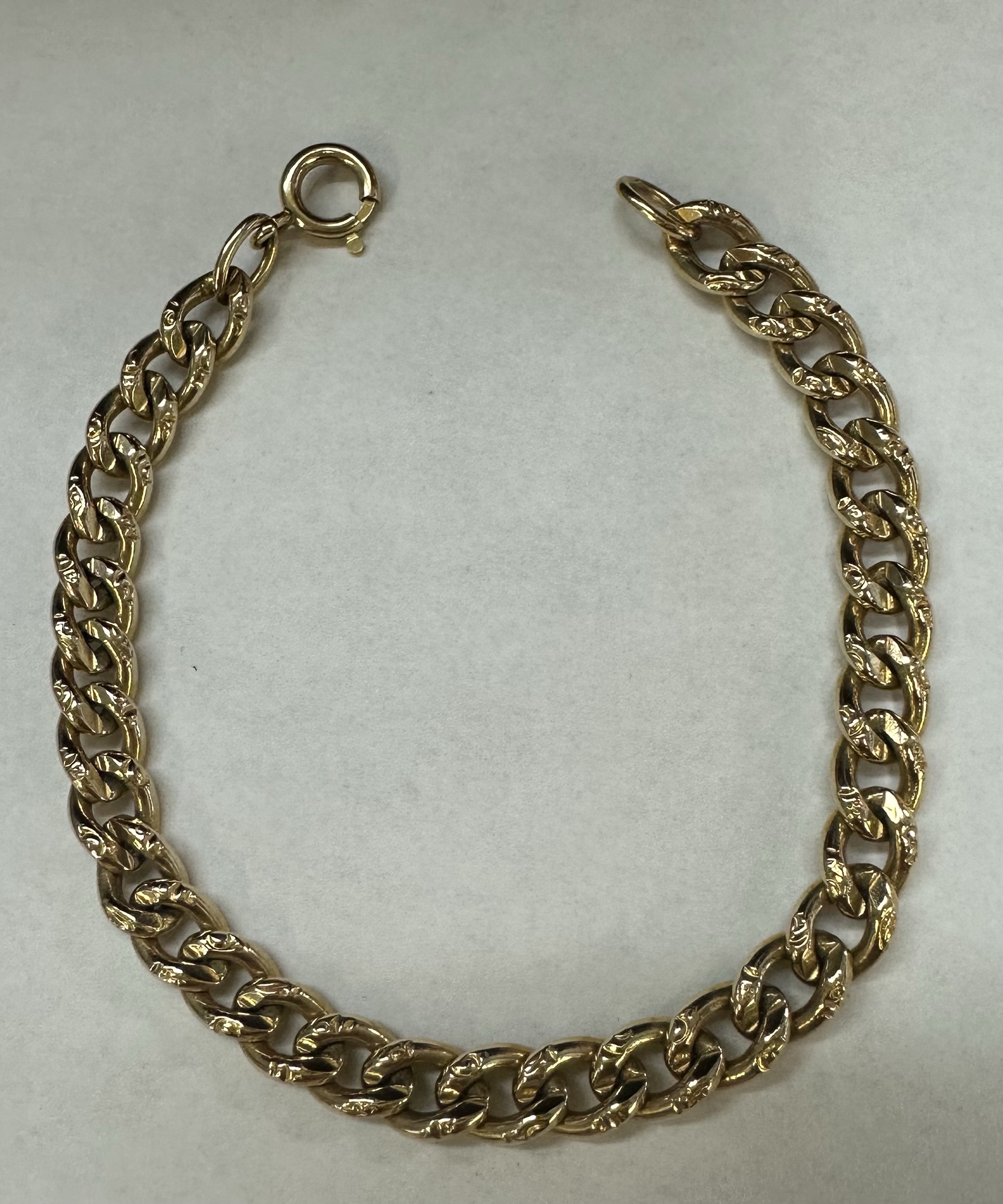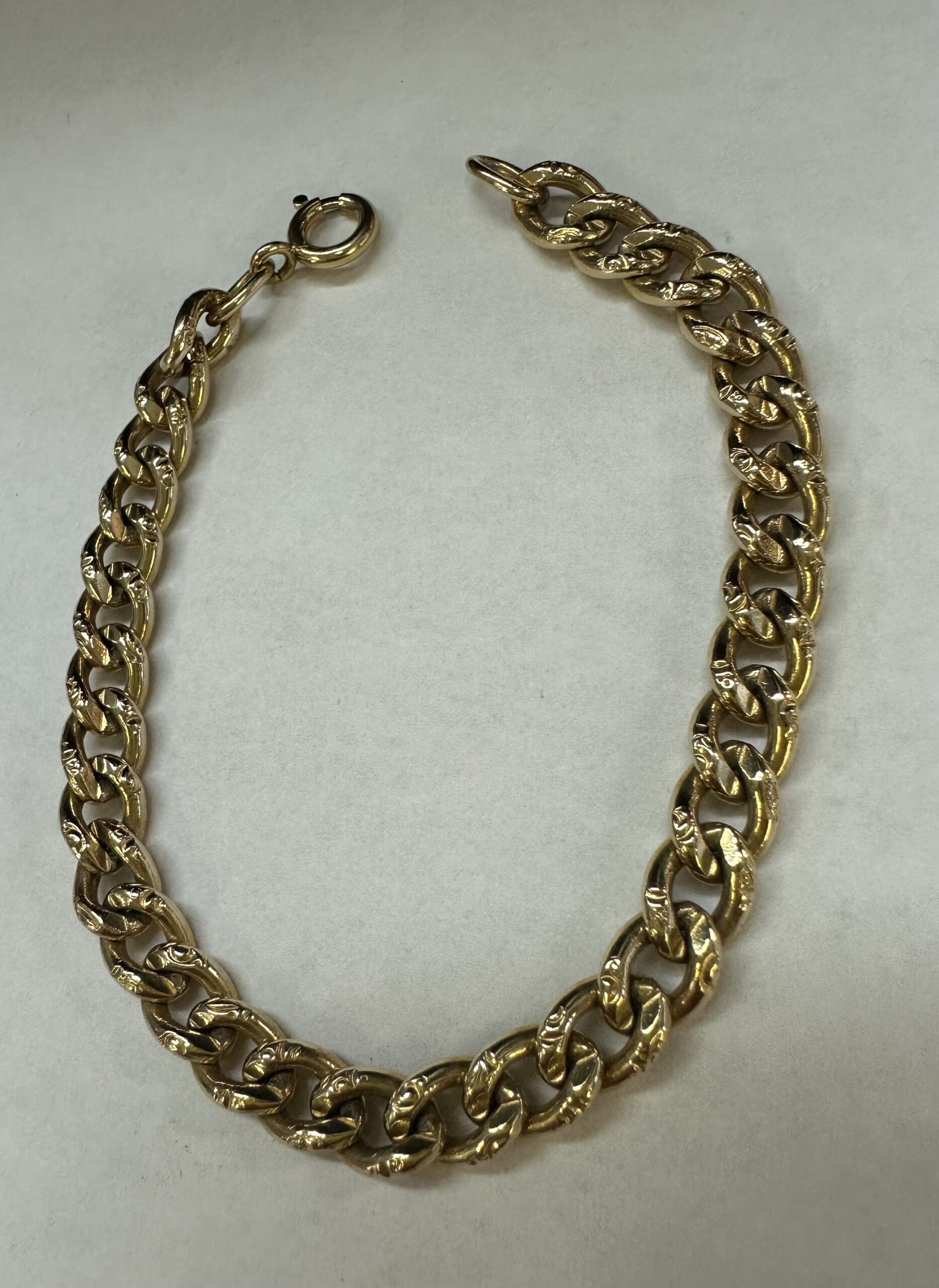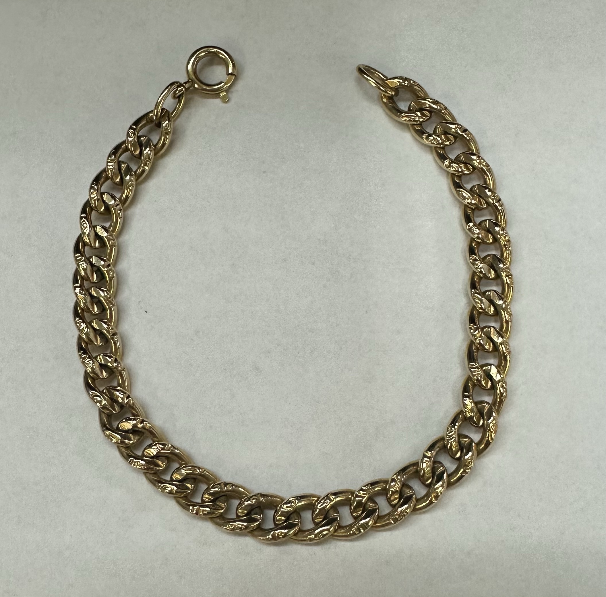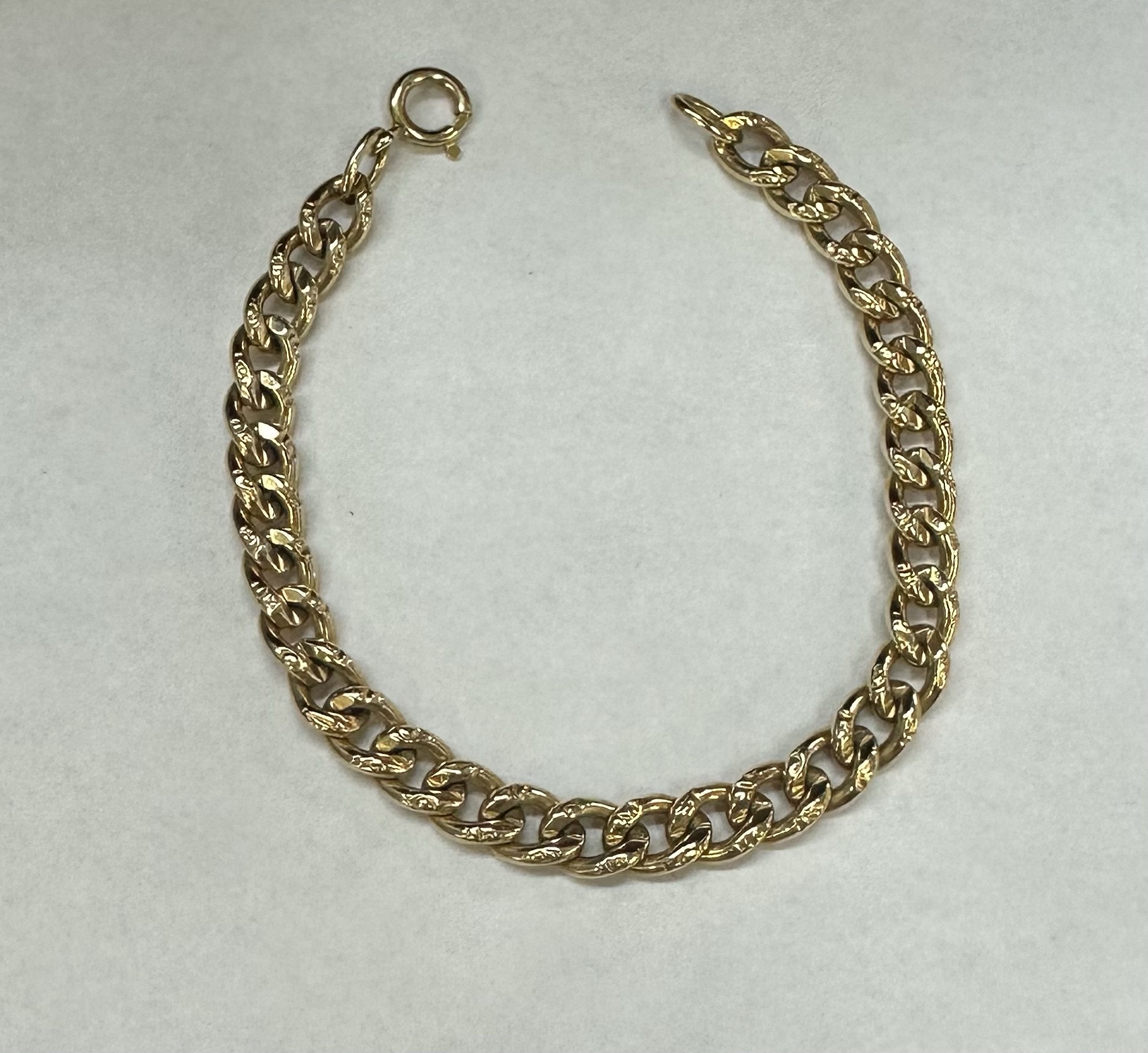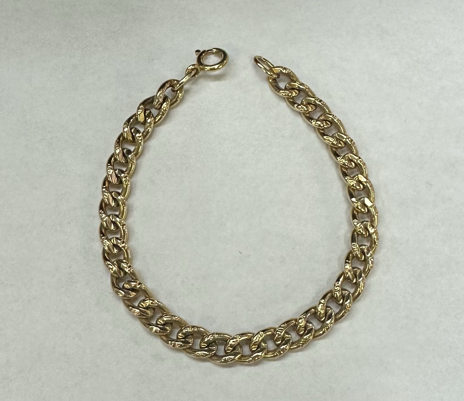 14k yellow gold 7 1/4” open oval link bracelet with textured accents with spring ring clasp, 6 mm wide, 20 grams.
