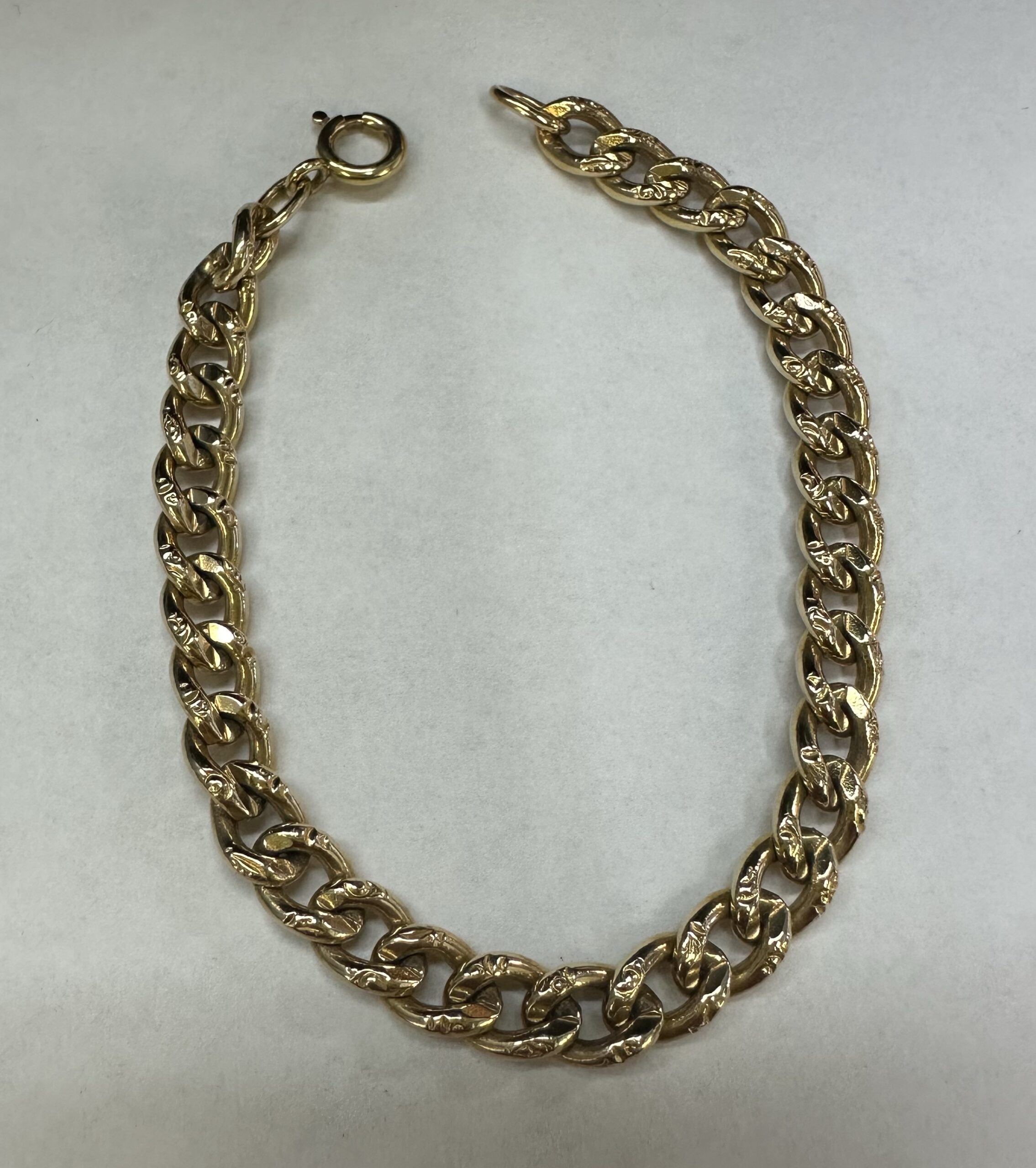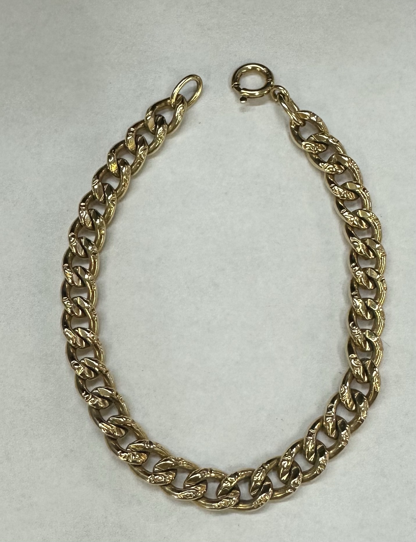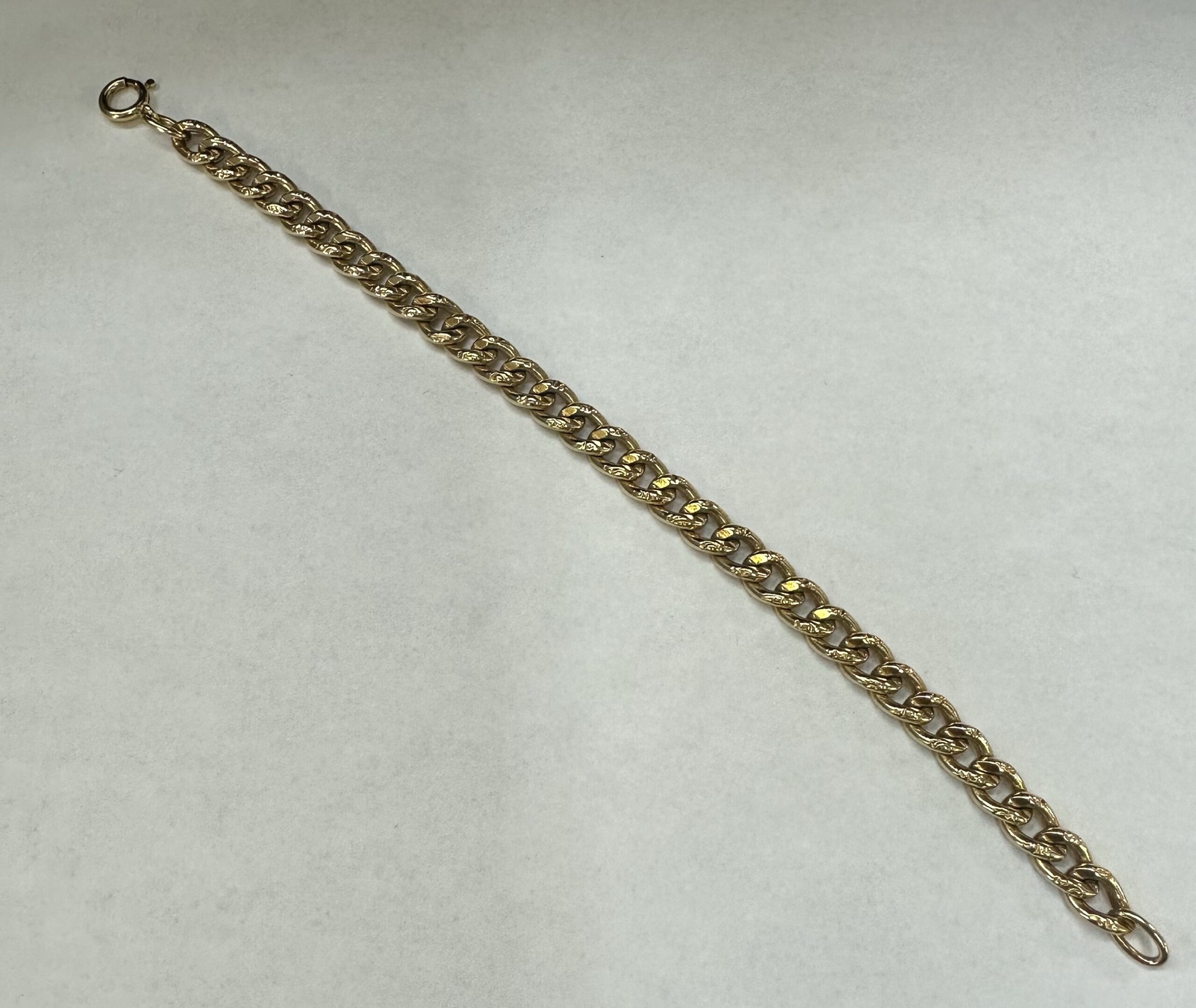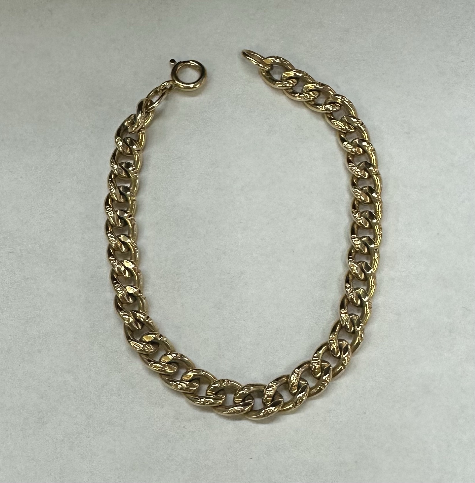 14k yellow gold 7 1/4” open oval link bracelet with textured accents with spring ring clasp, 6 mm wide, 20 grams.