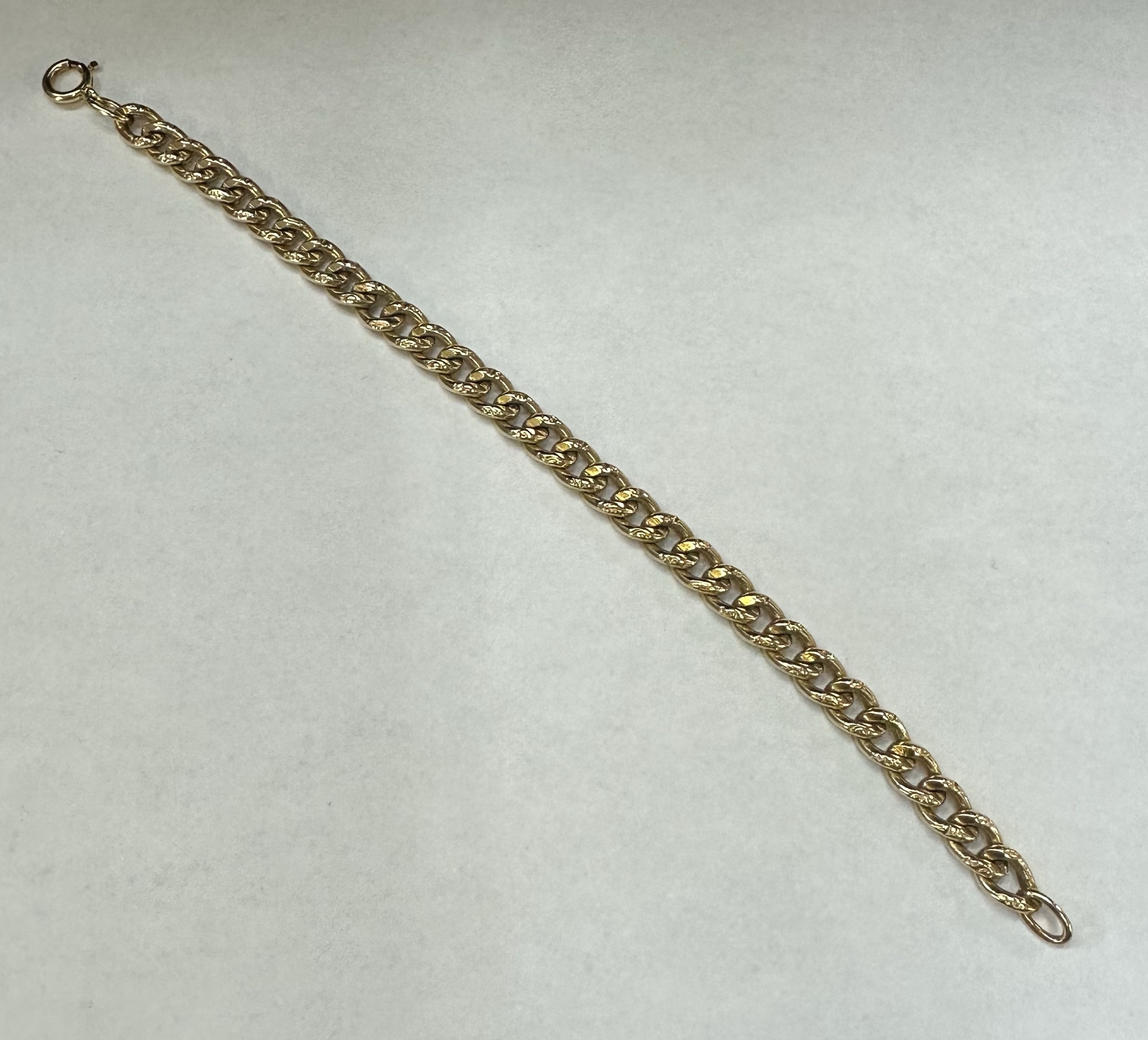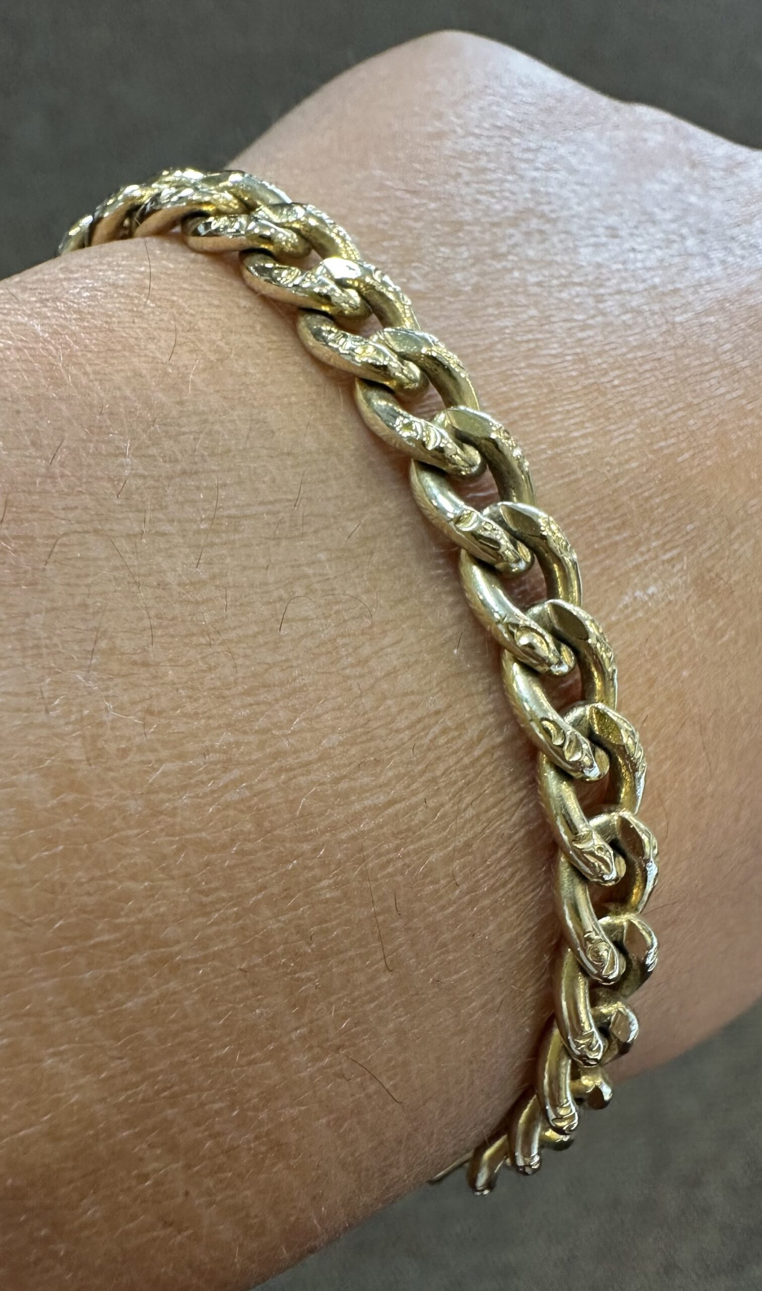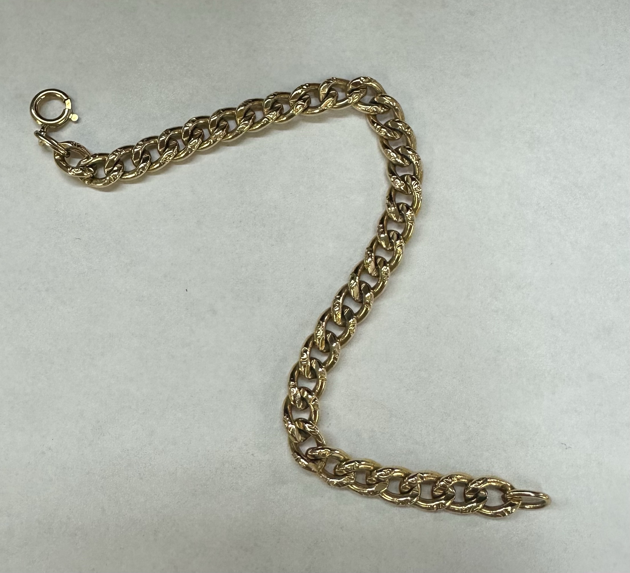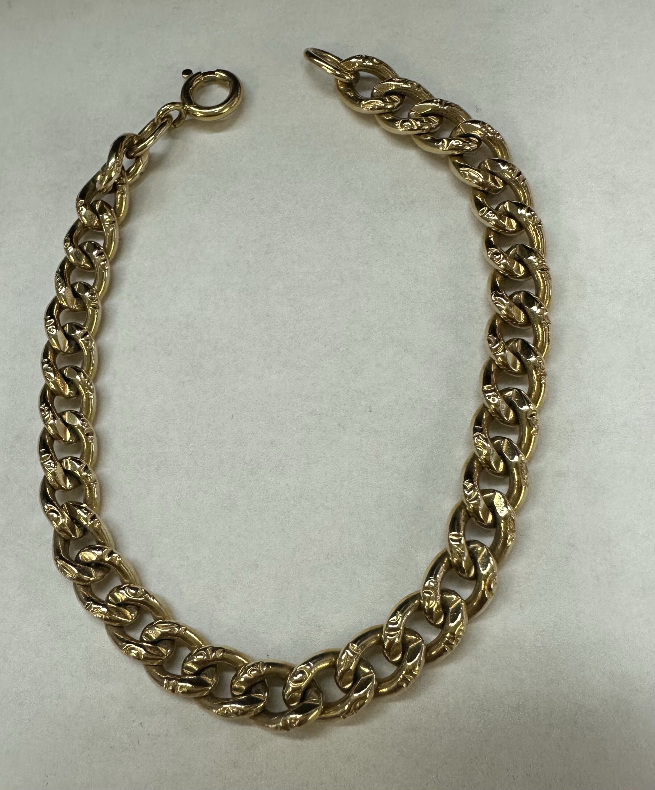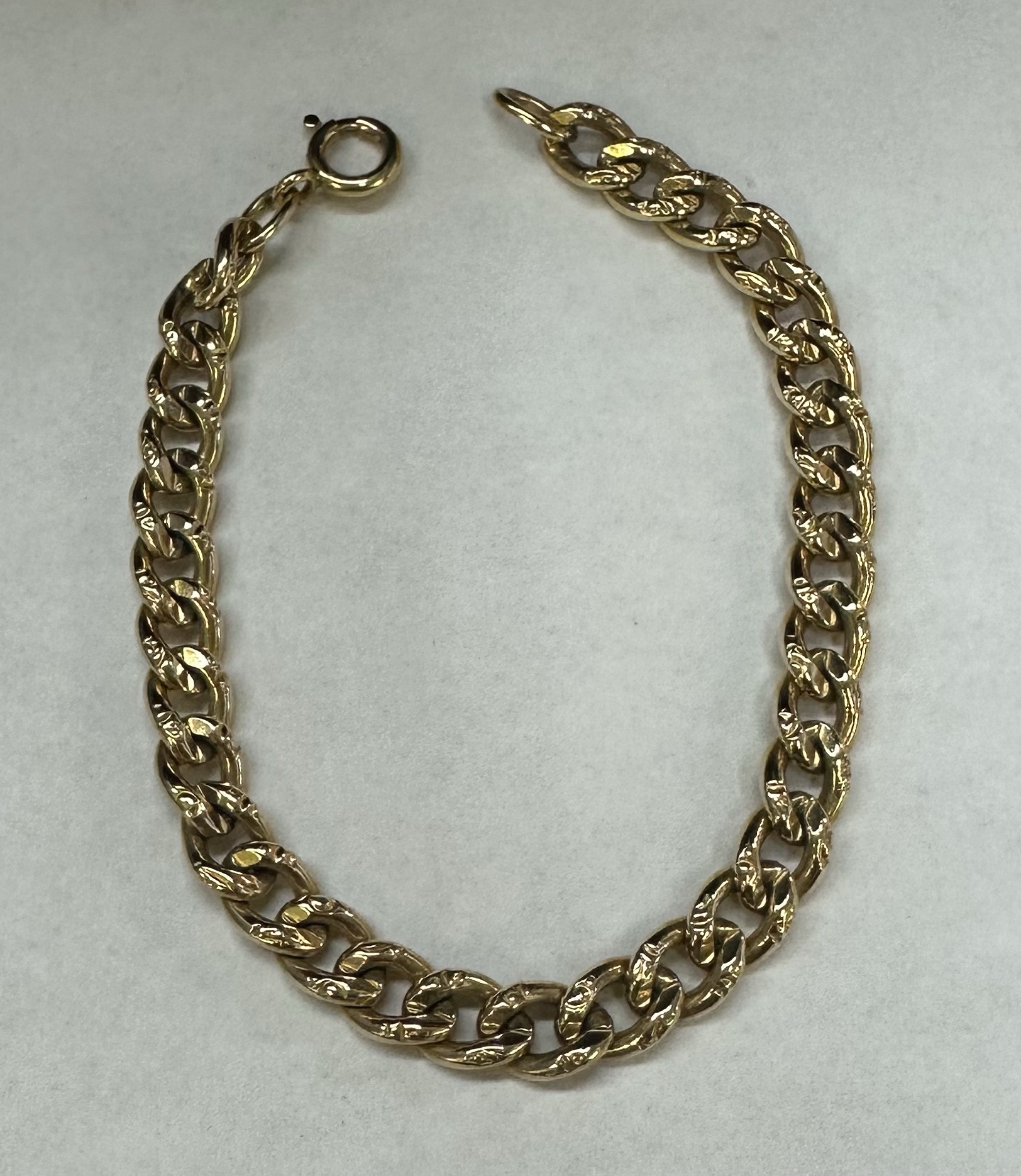 14k yellow gold 7 1/4” open oval link bracelet with textured accents with spring ring clasp, 6 mm wide, 20 grams.