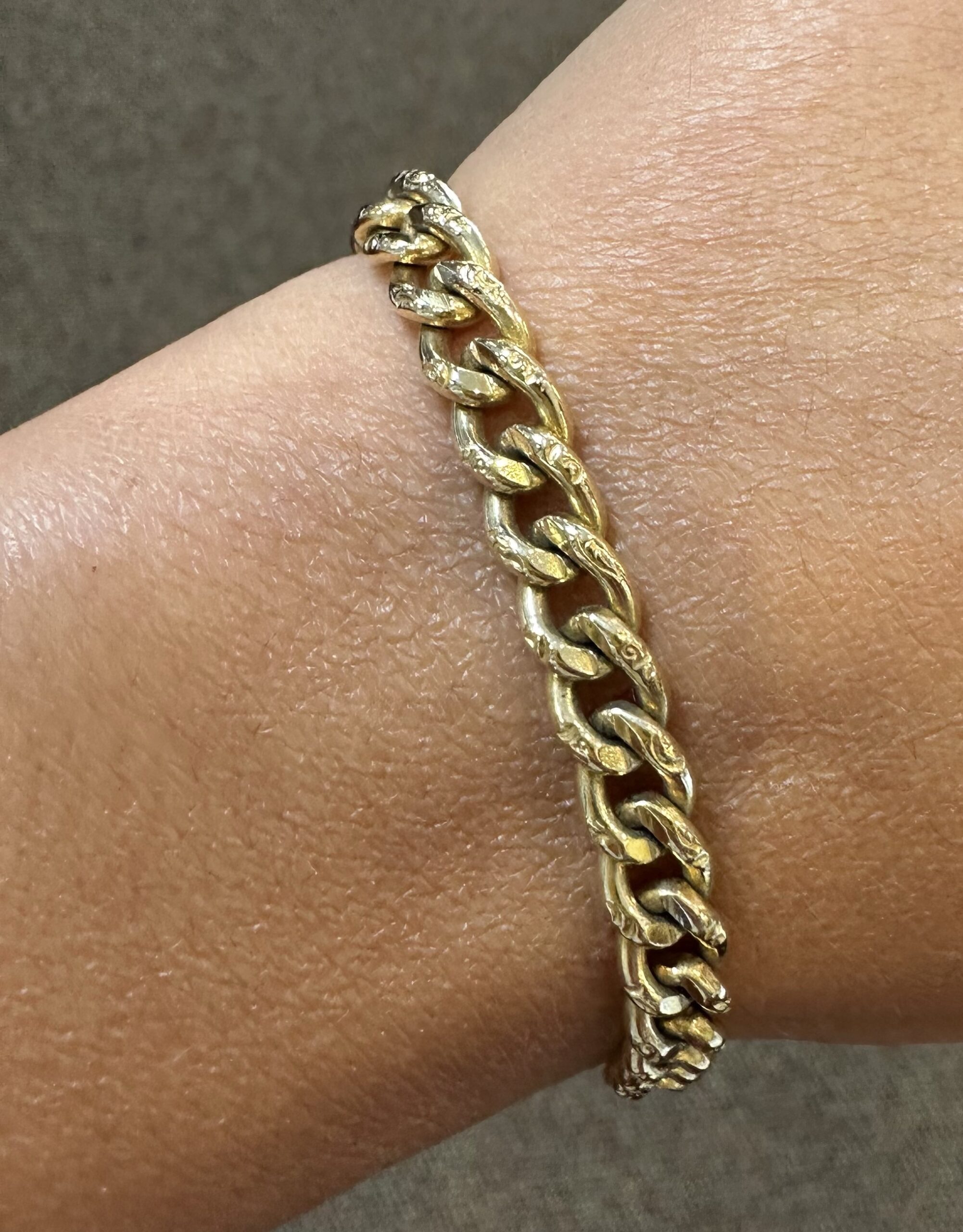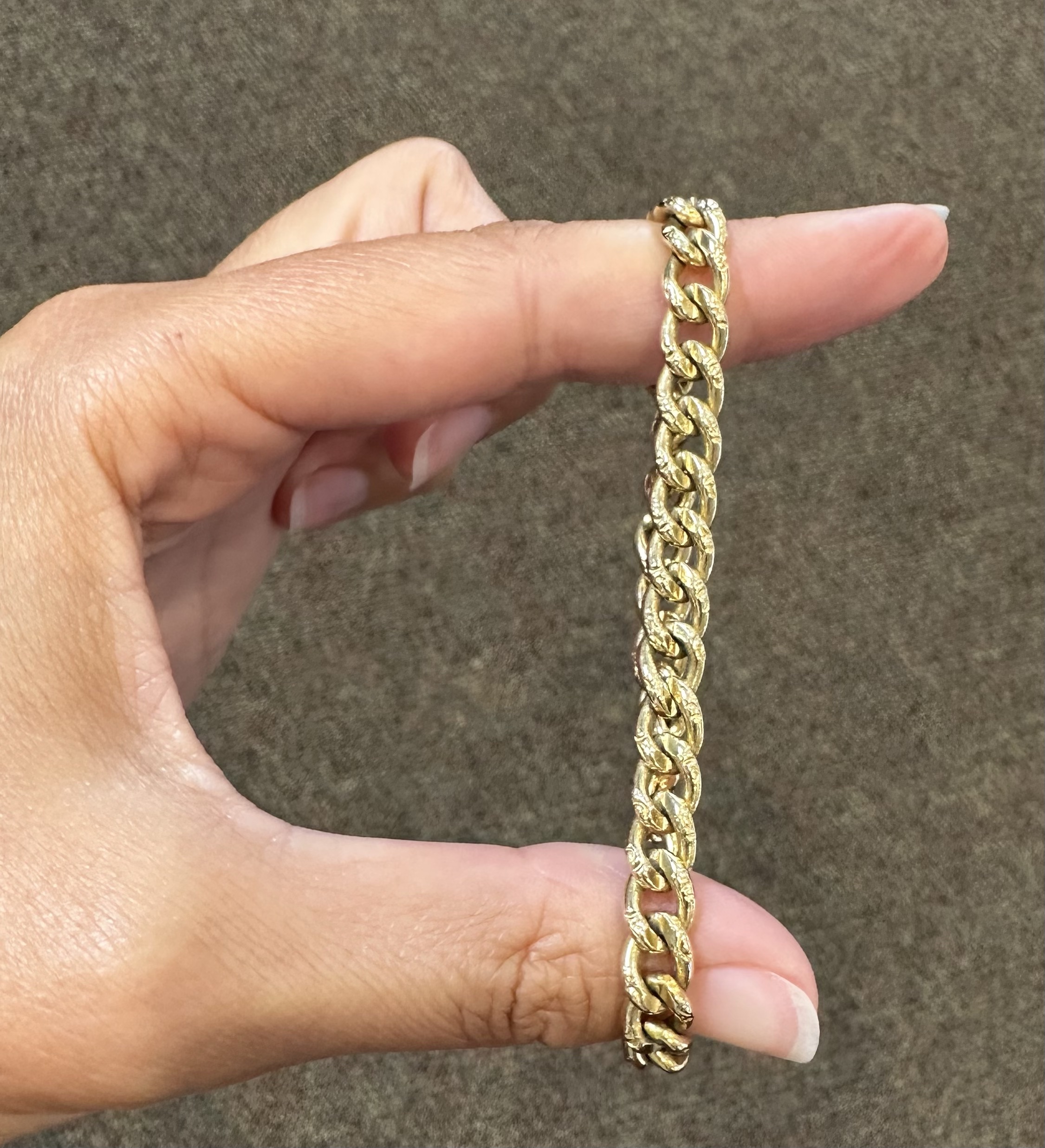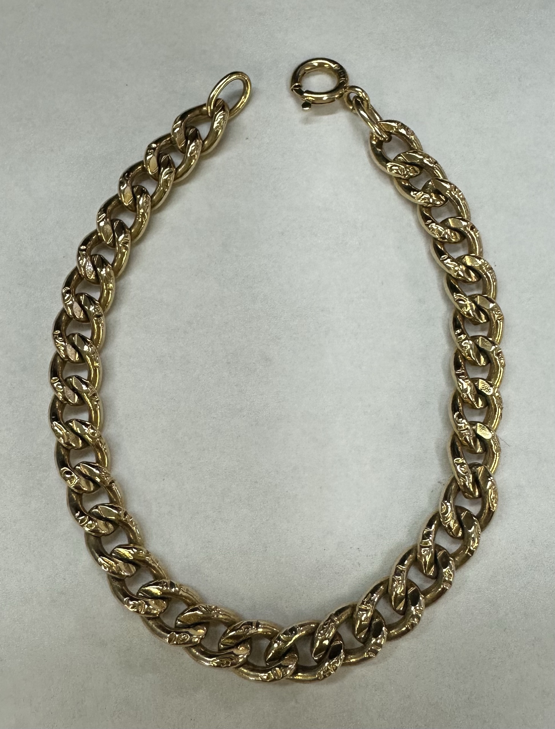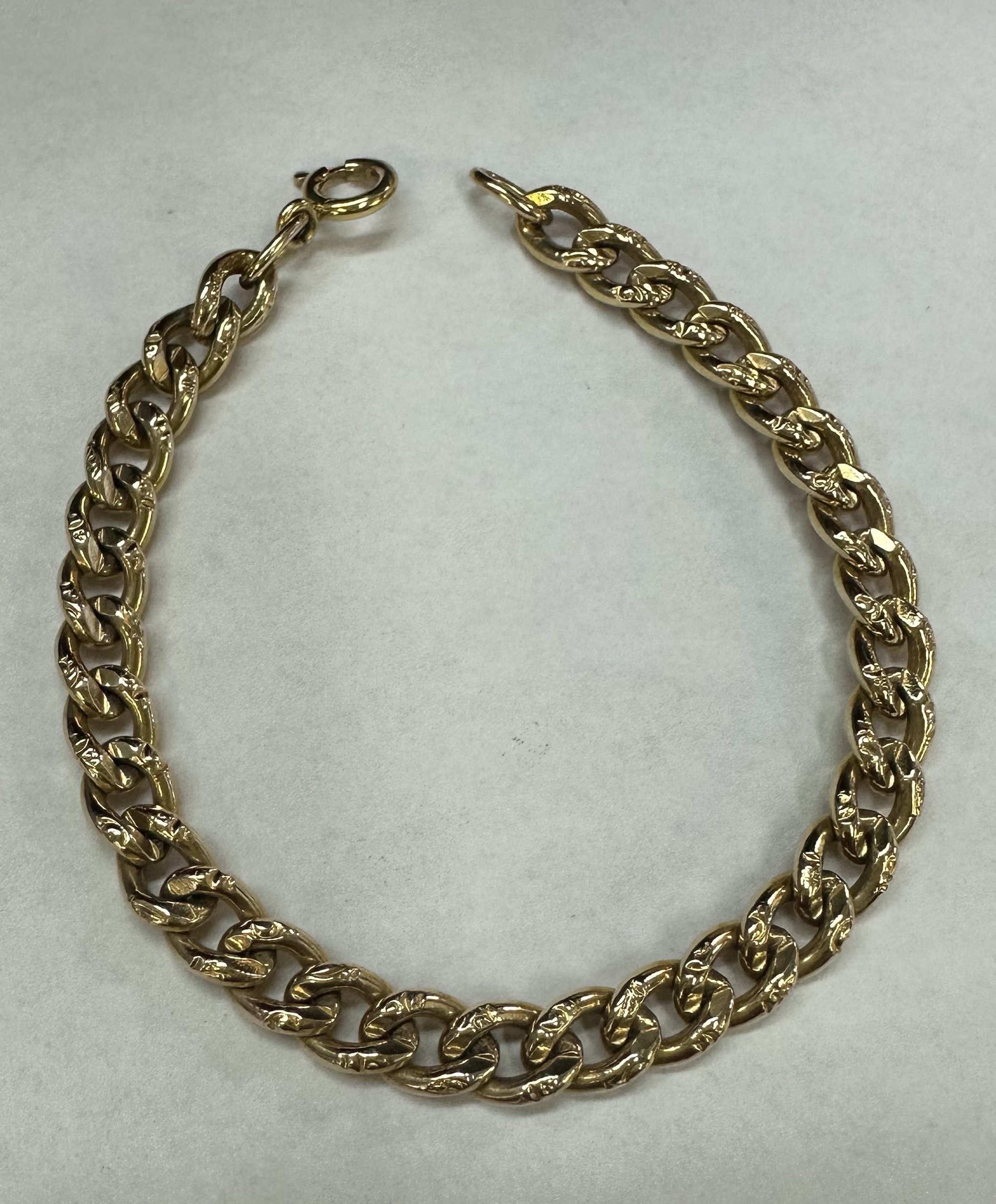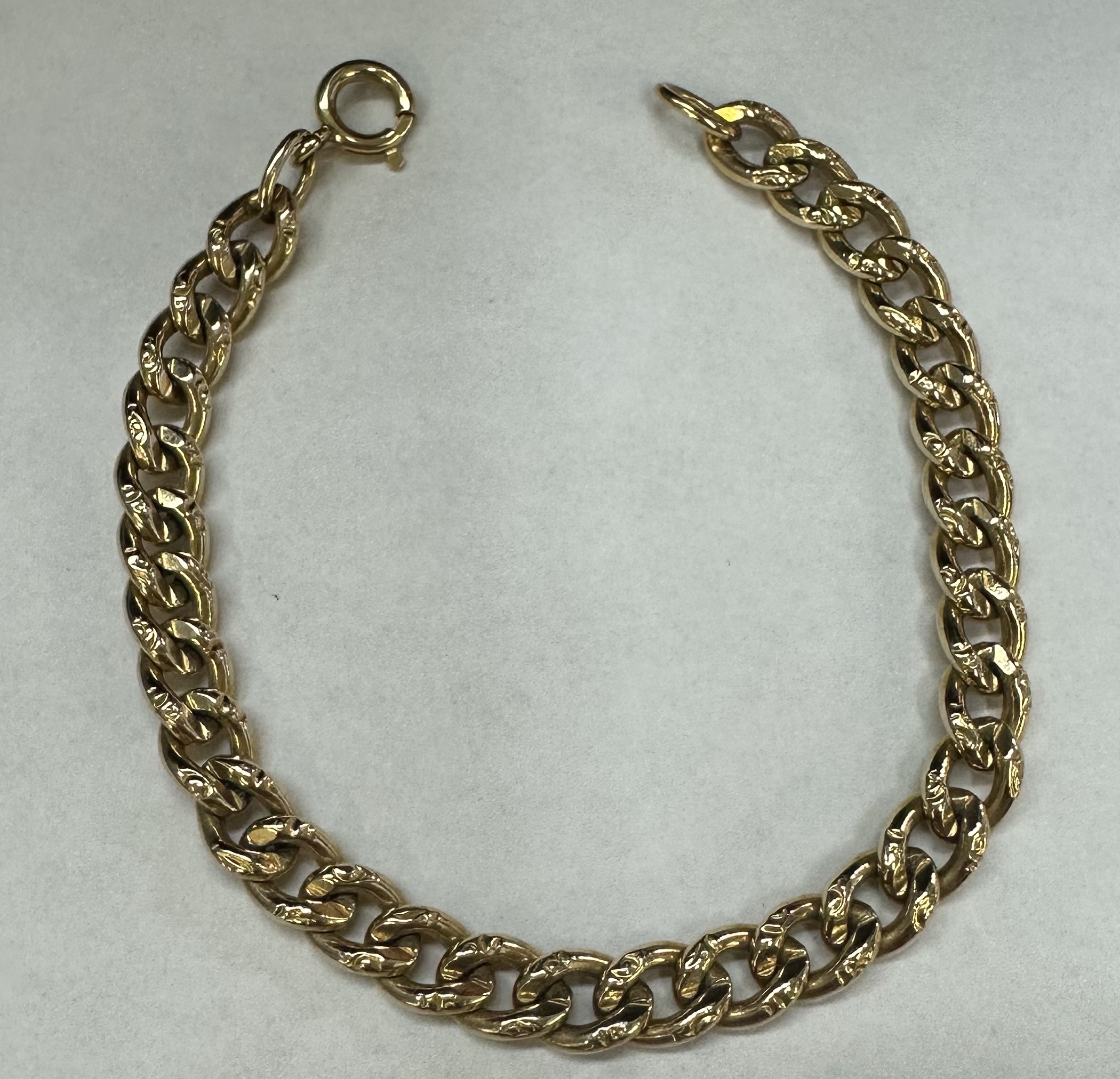 14k yellow gold 7 1/4” open oval link bracelet with textured accents with spring ring clasp, 6 mm wide, 20 grams.