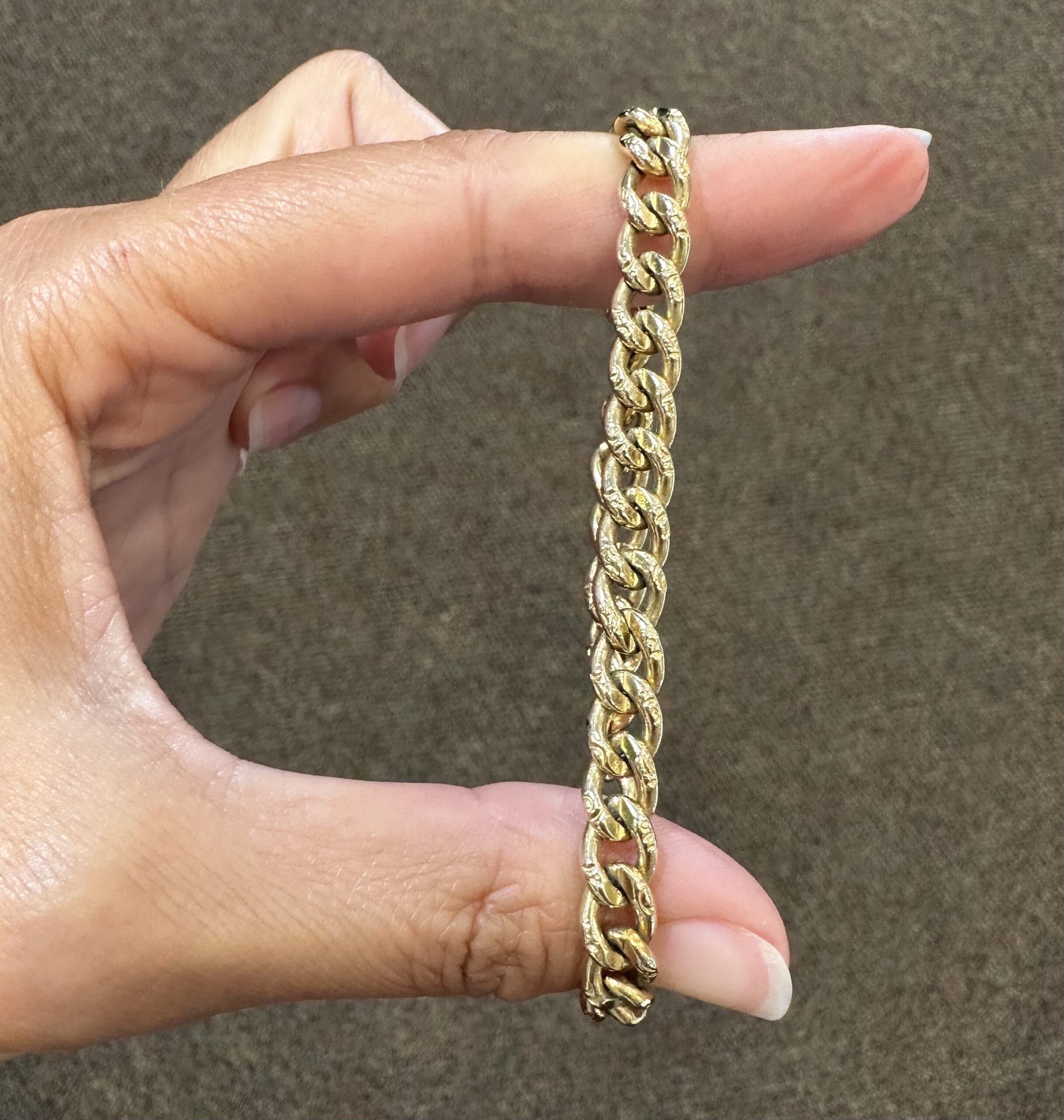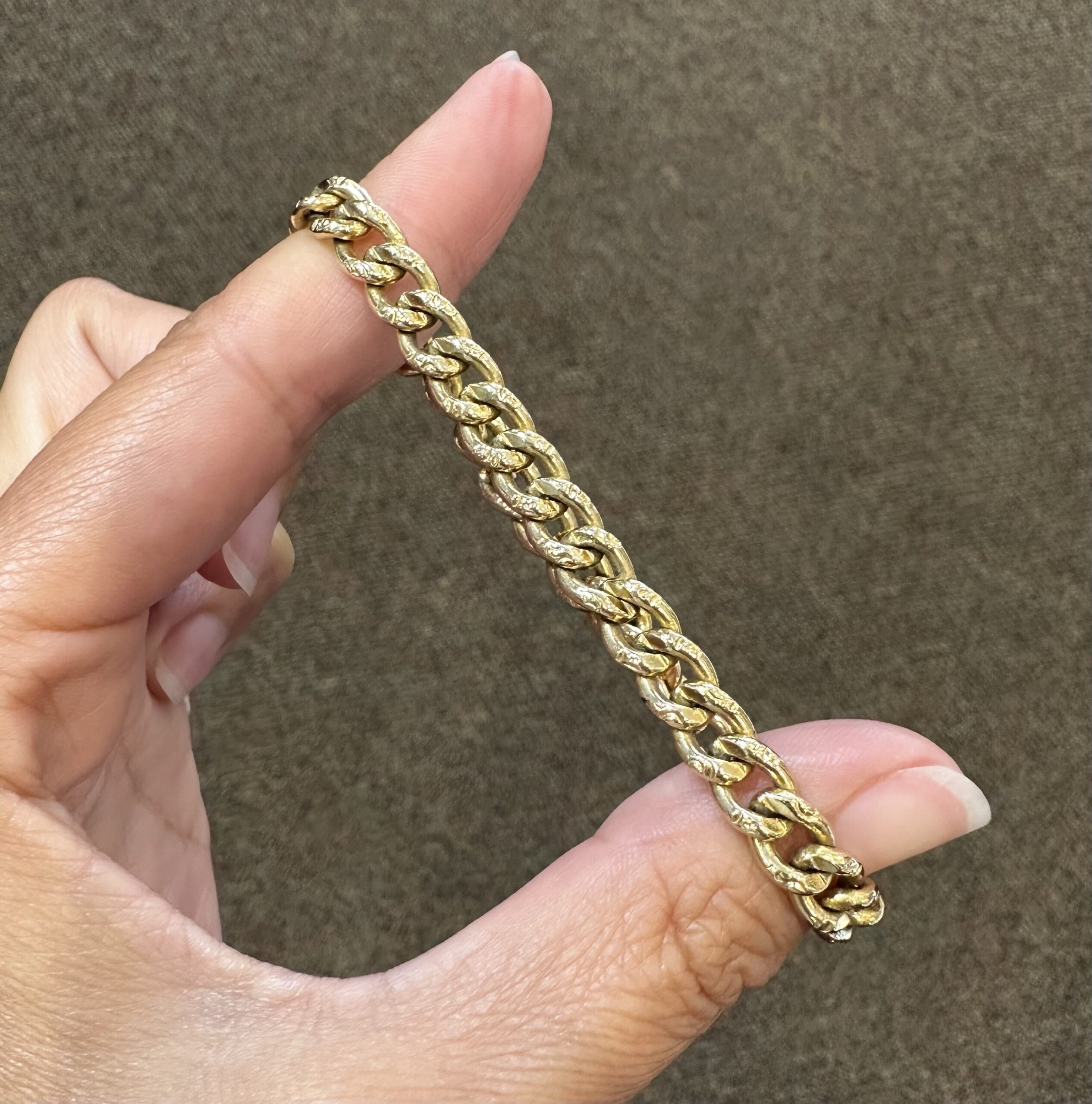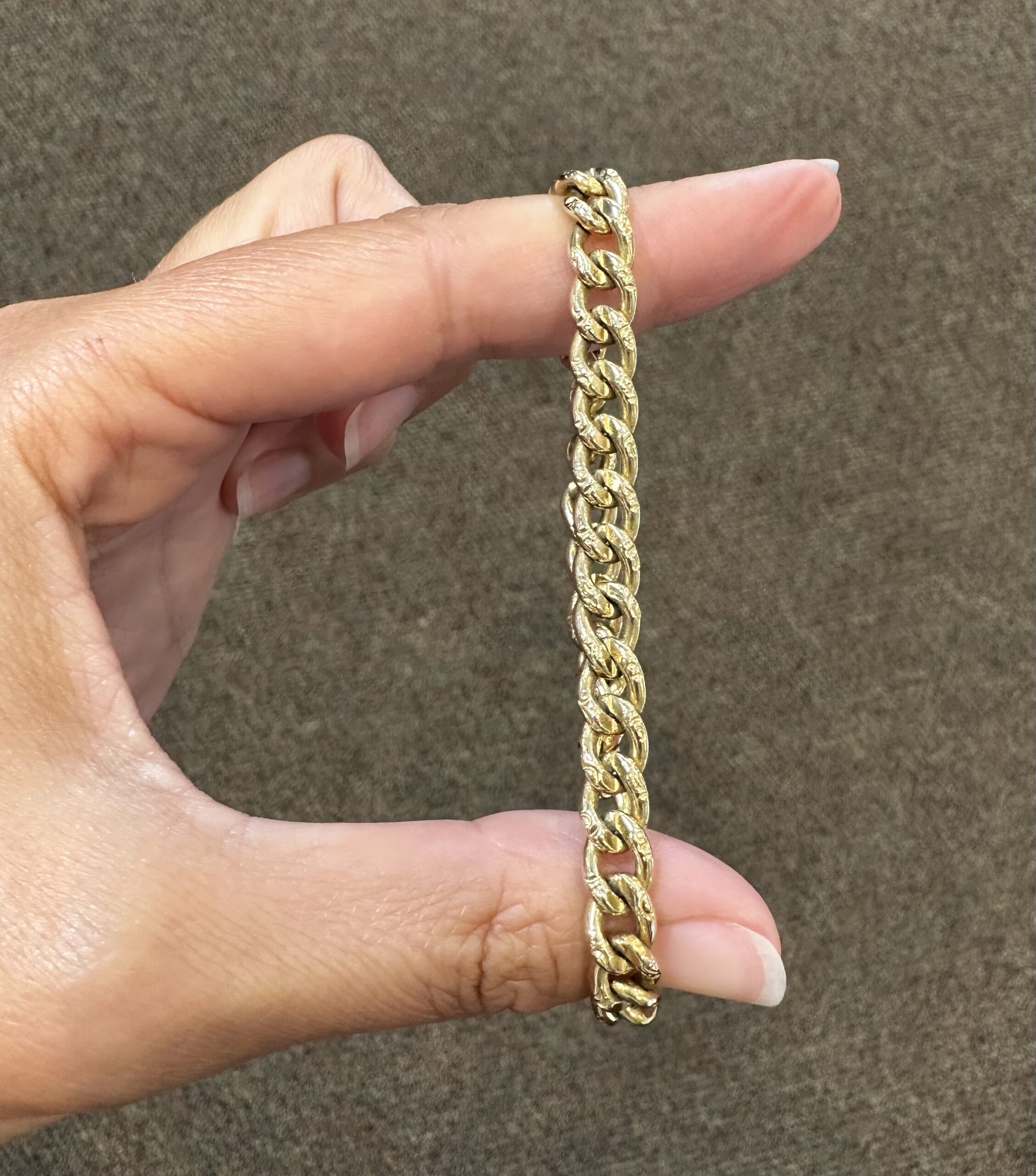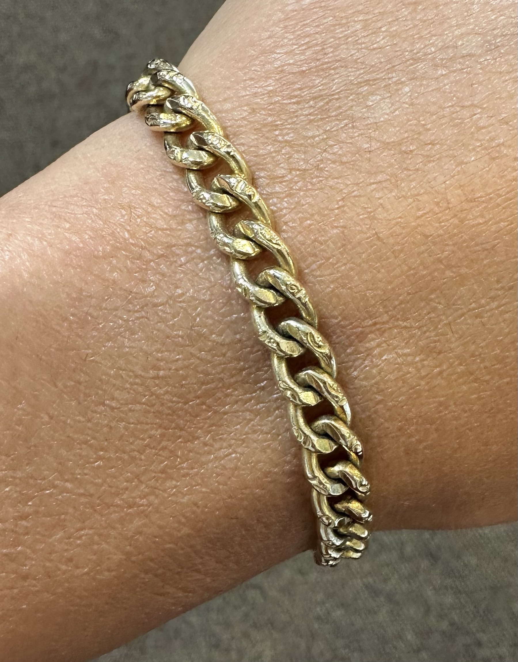 14k yellow gold 7 1/4” open oval link bracelet with textured accents with spring ring clasp, 6 mm wide, 20 grams.
