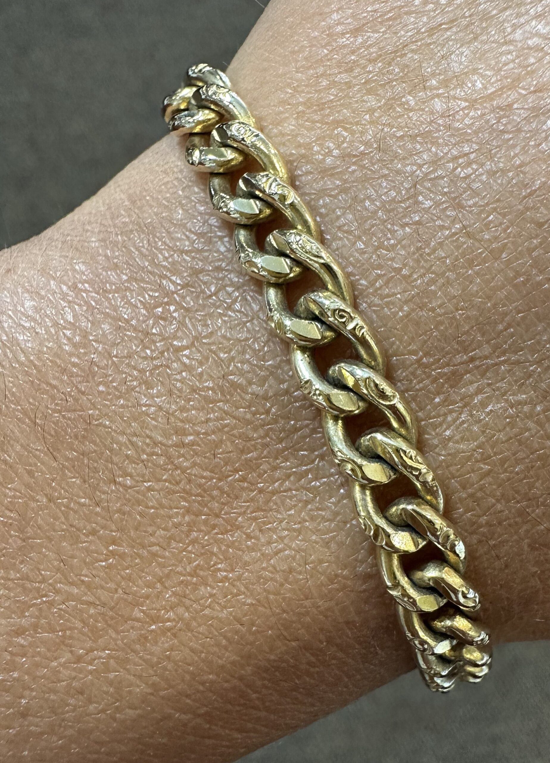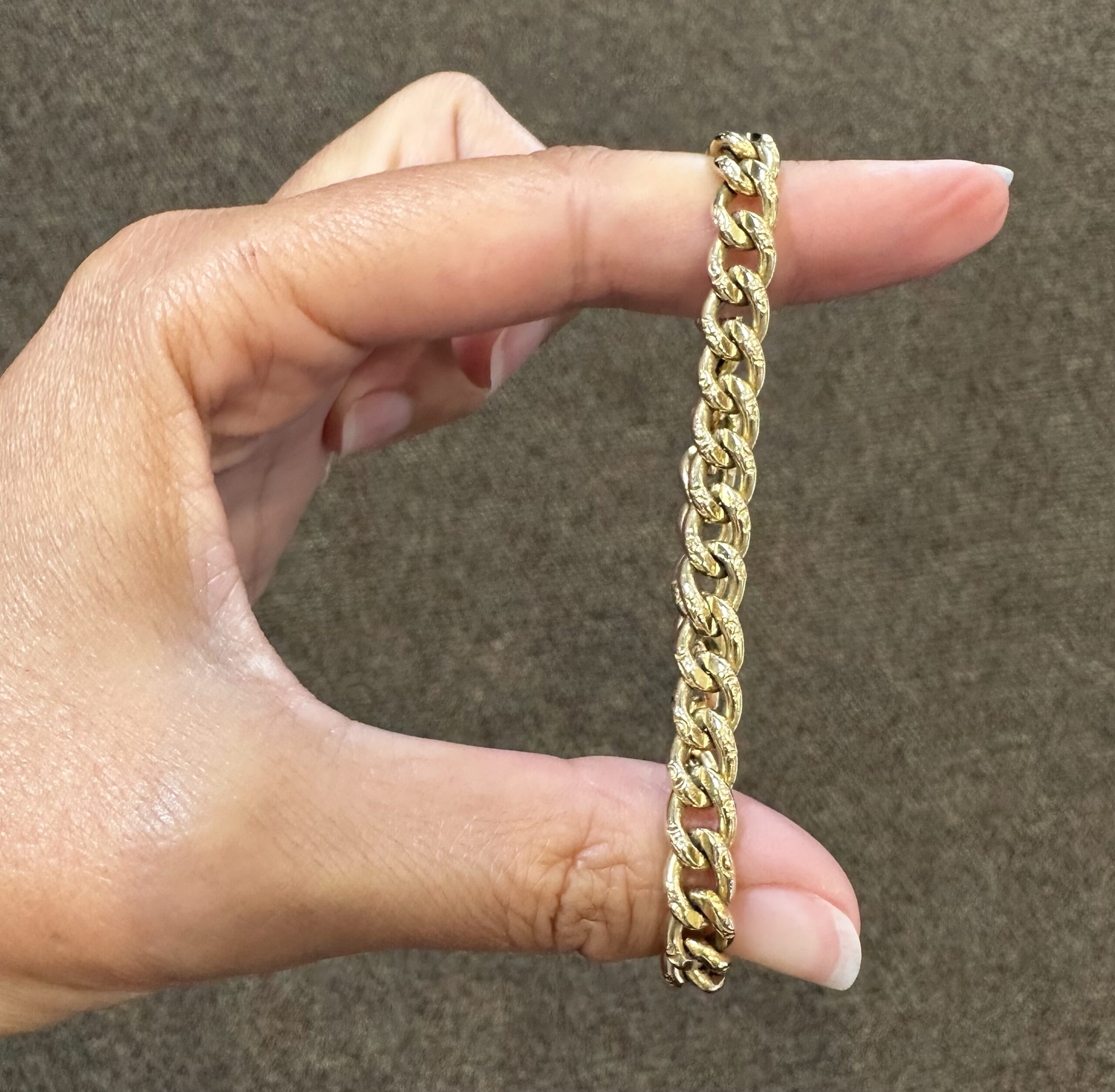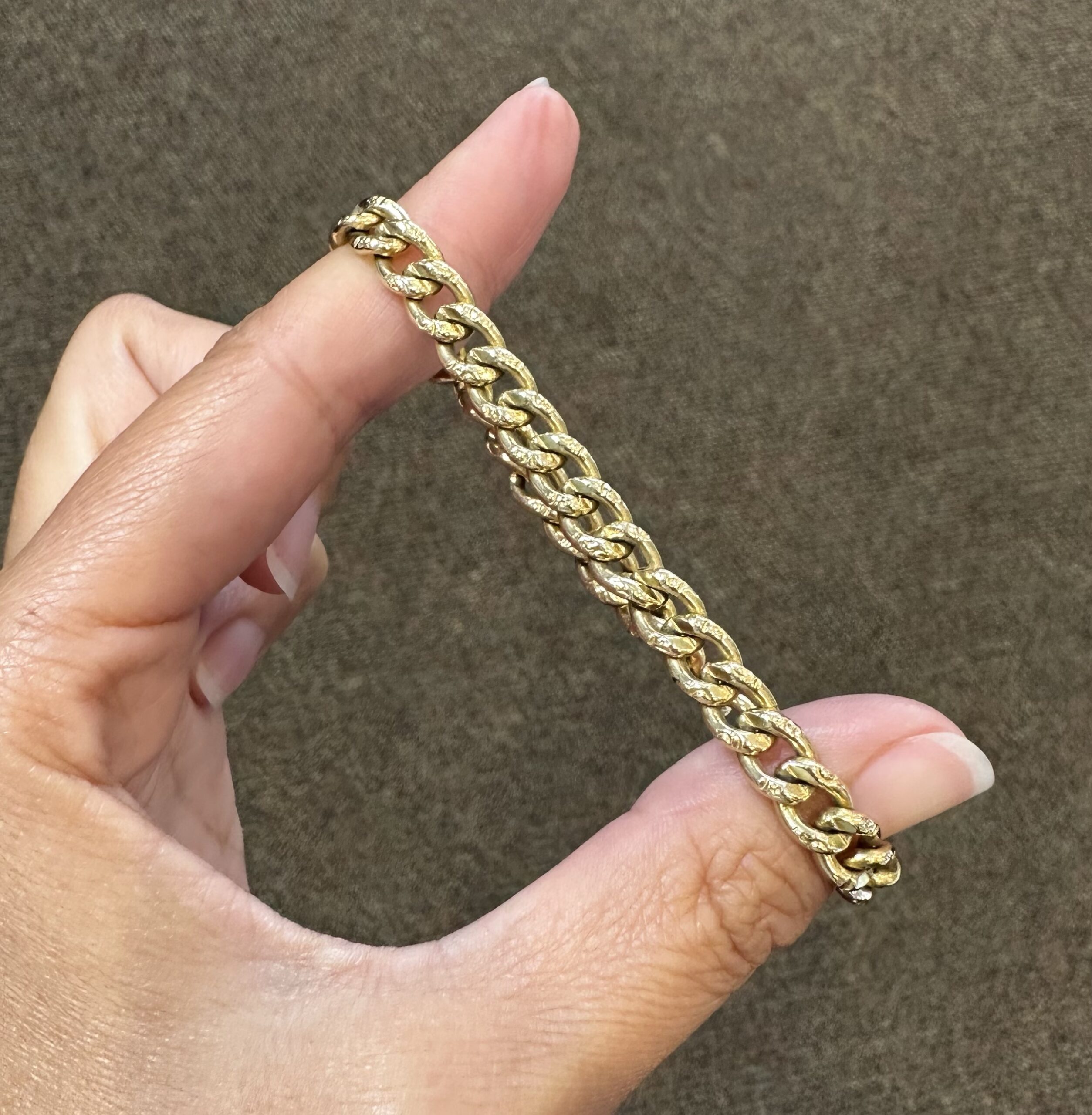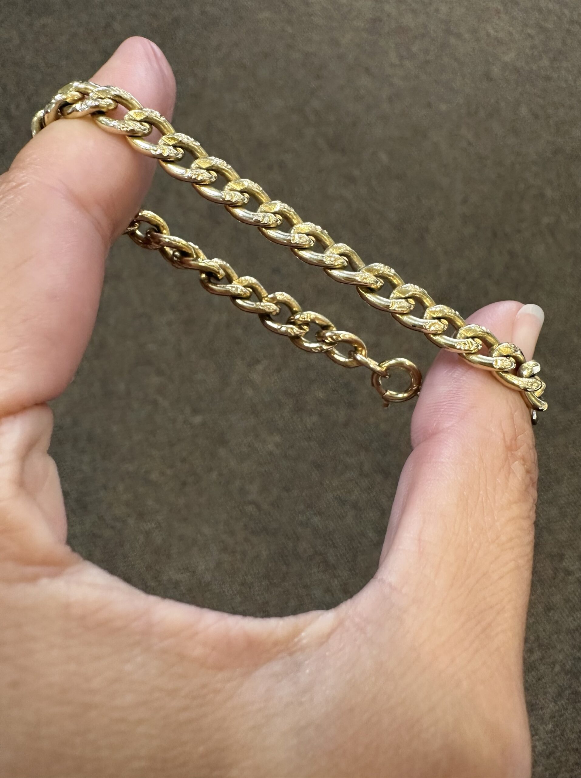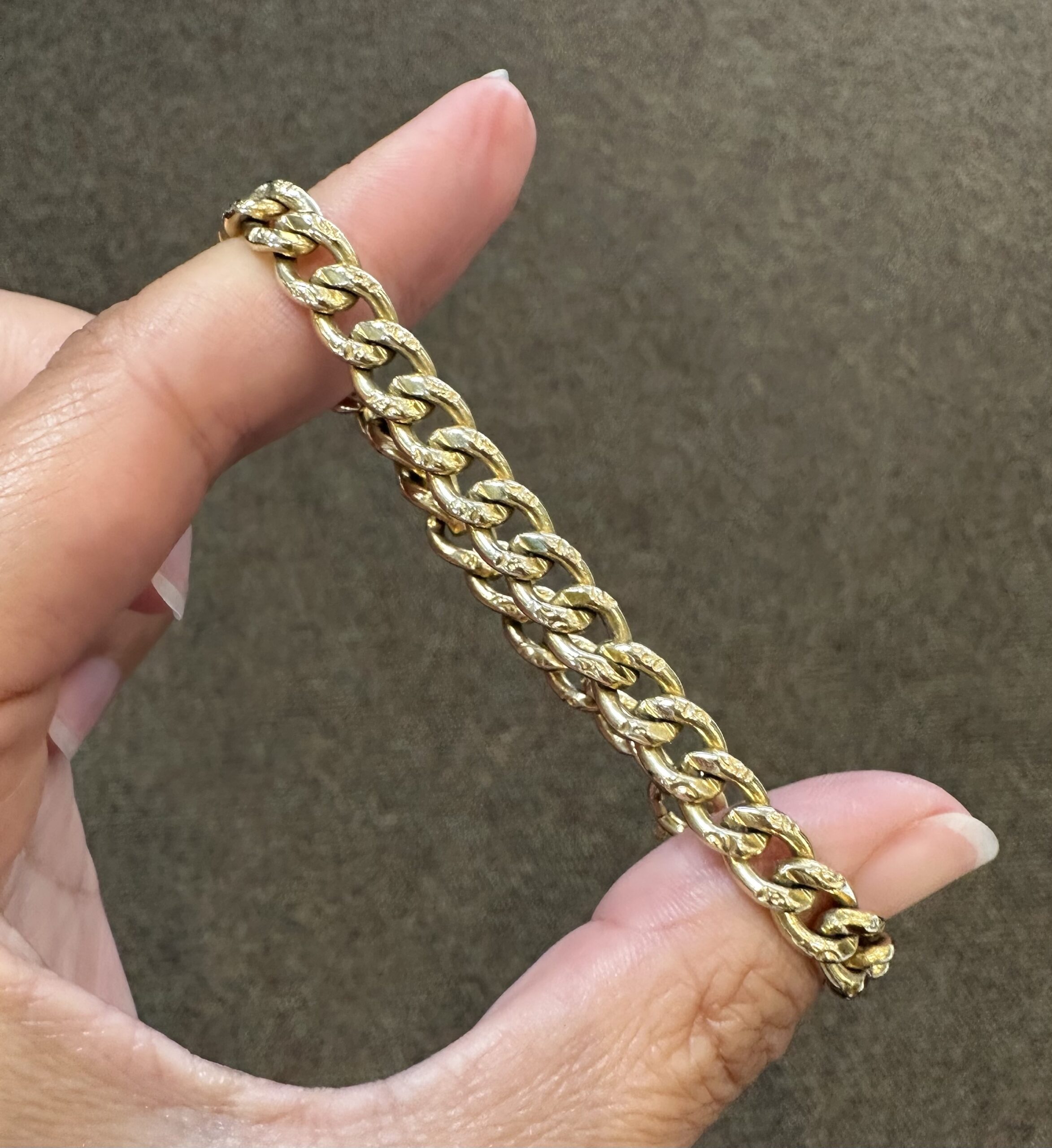 14k yellow gold 7 1/4” open oval link bracelet with textured accents with spring ring clasp, 6 mm wide, 20 grams.