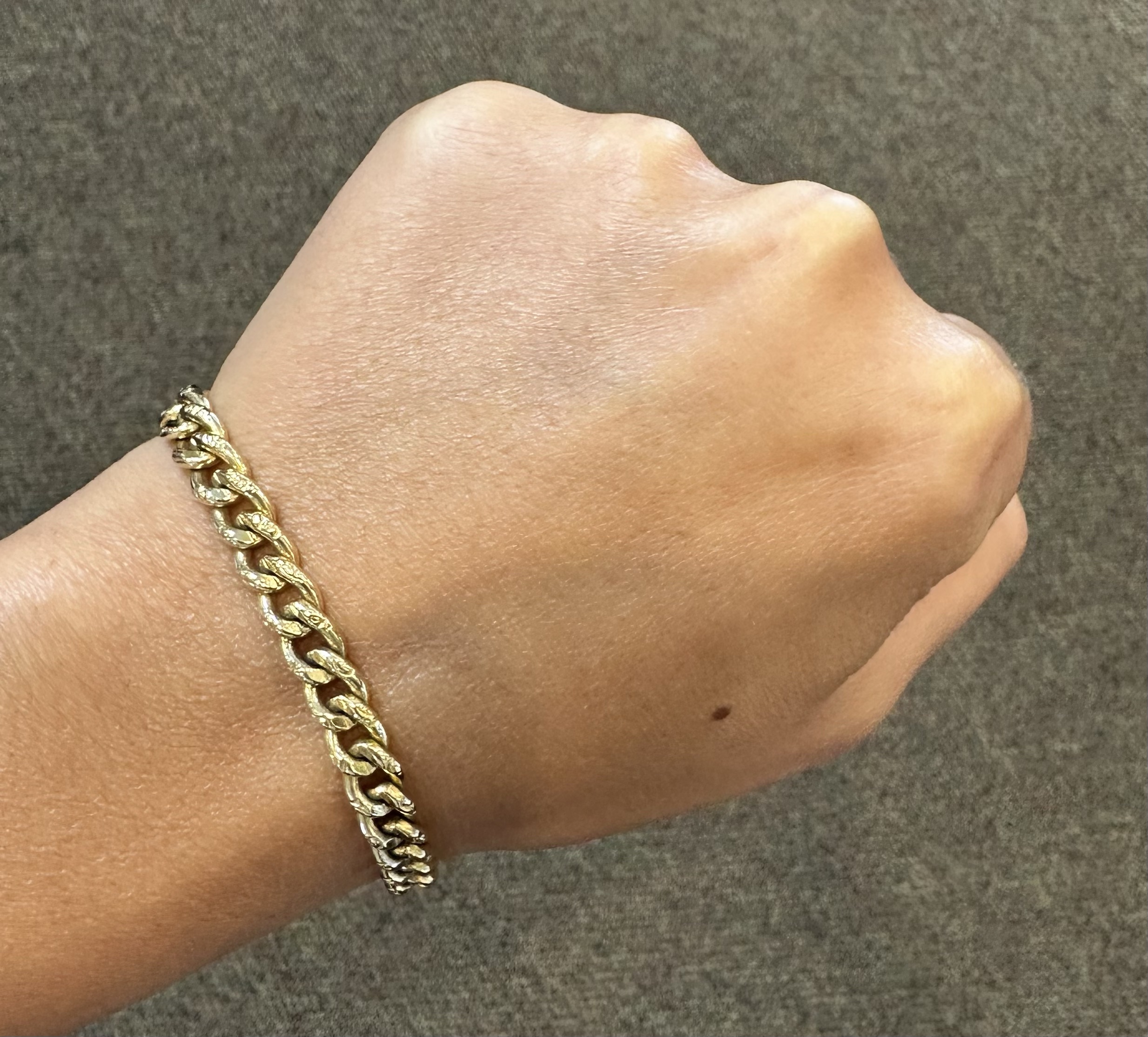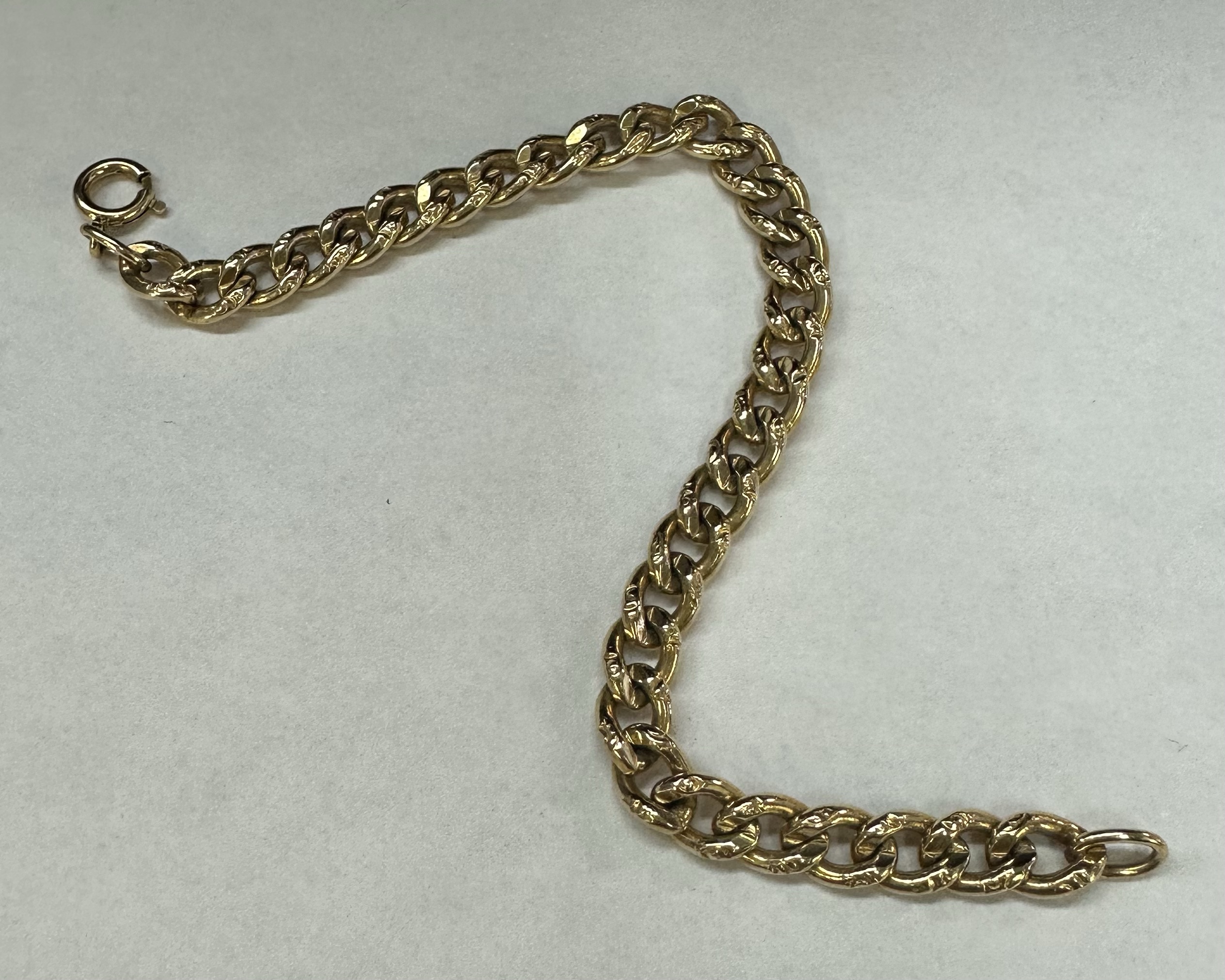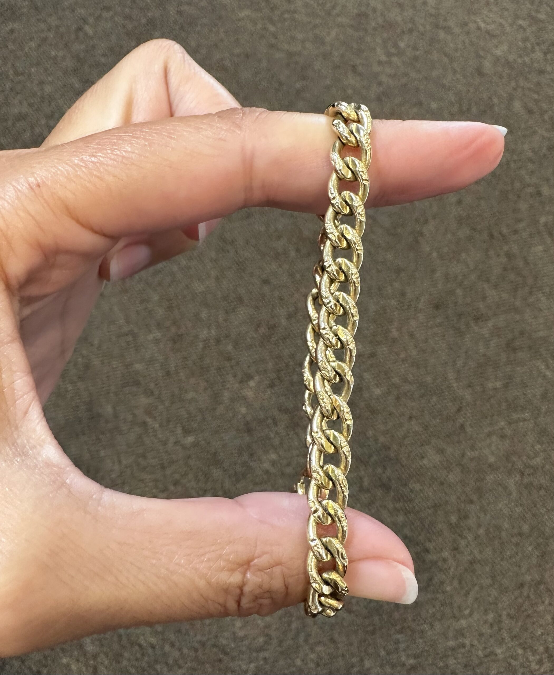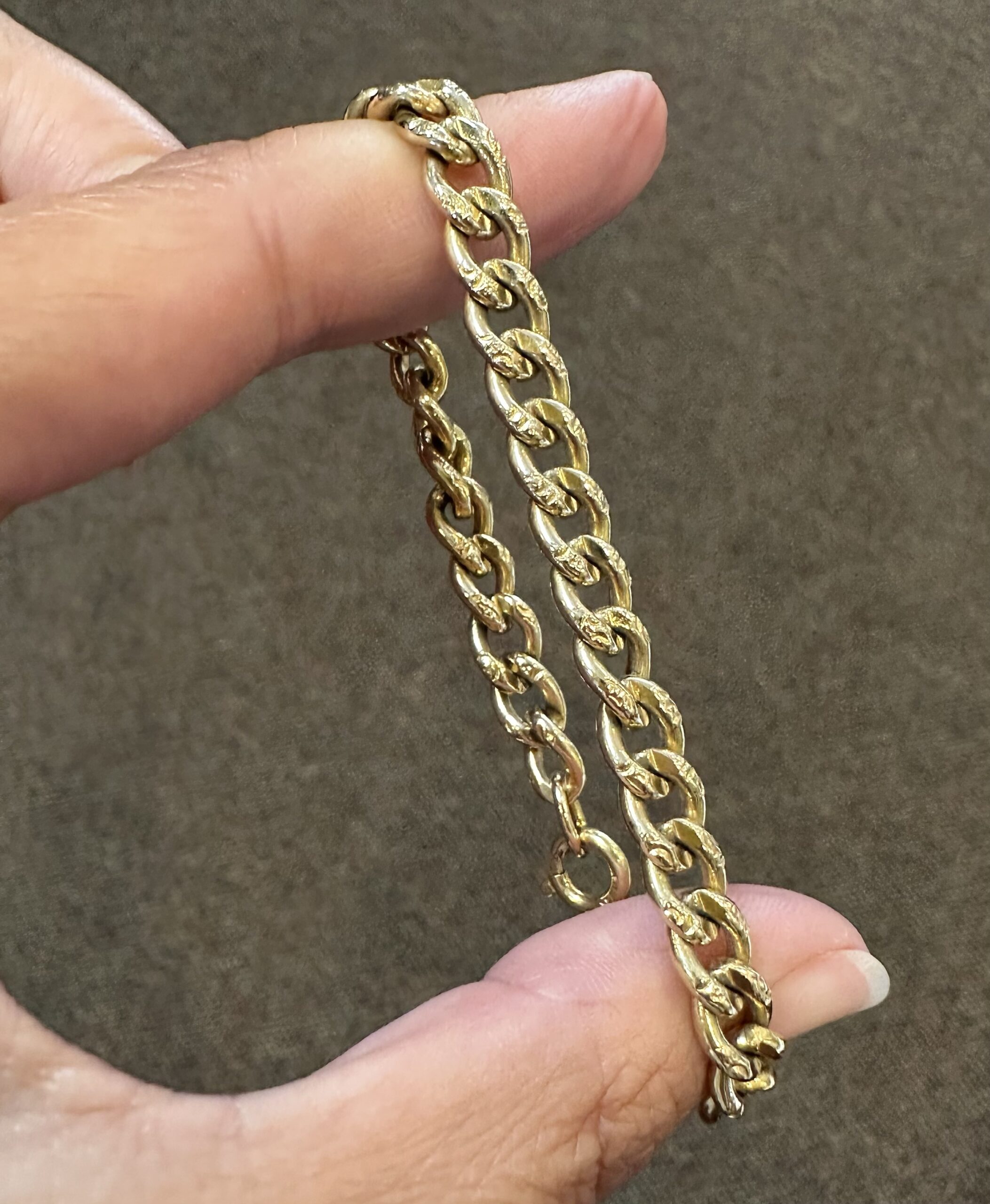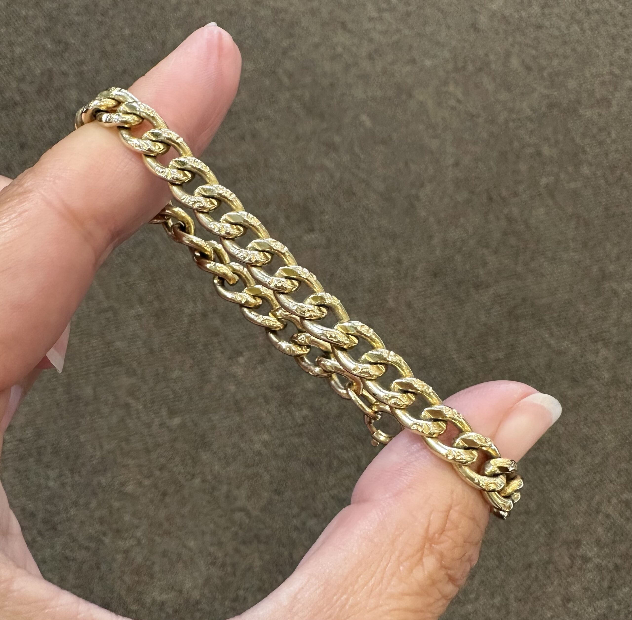 14k yellow gold 7 1/4” open oval link bracelet with textured accents with spring ring clasp, 6 mm wide, 20 grams.