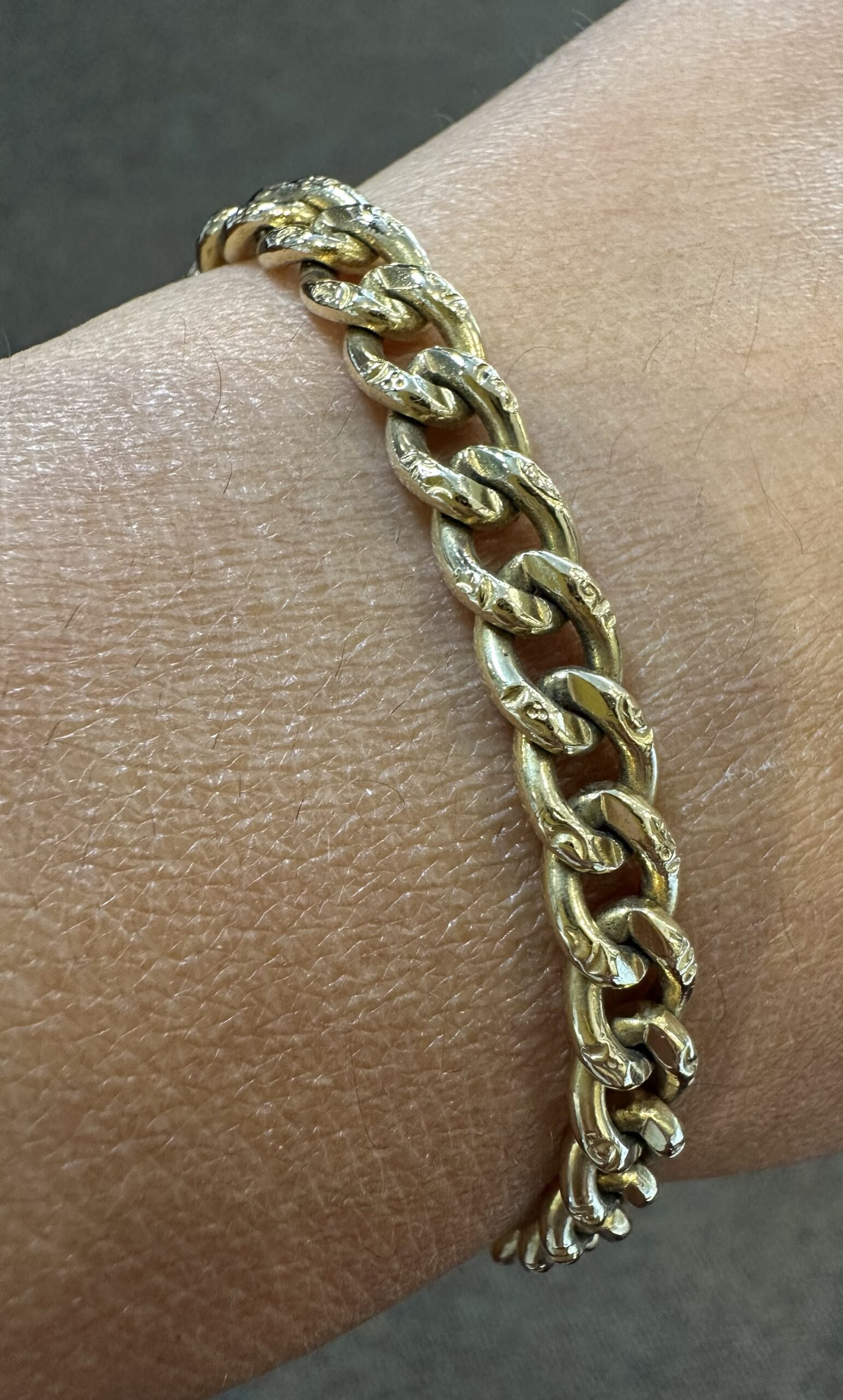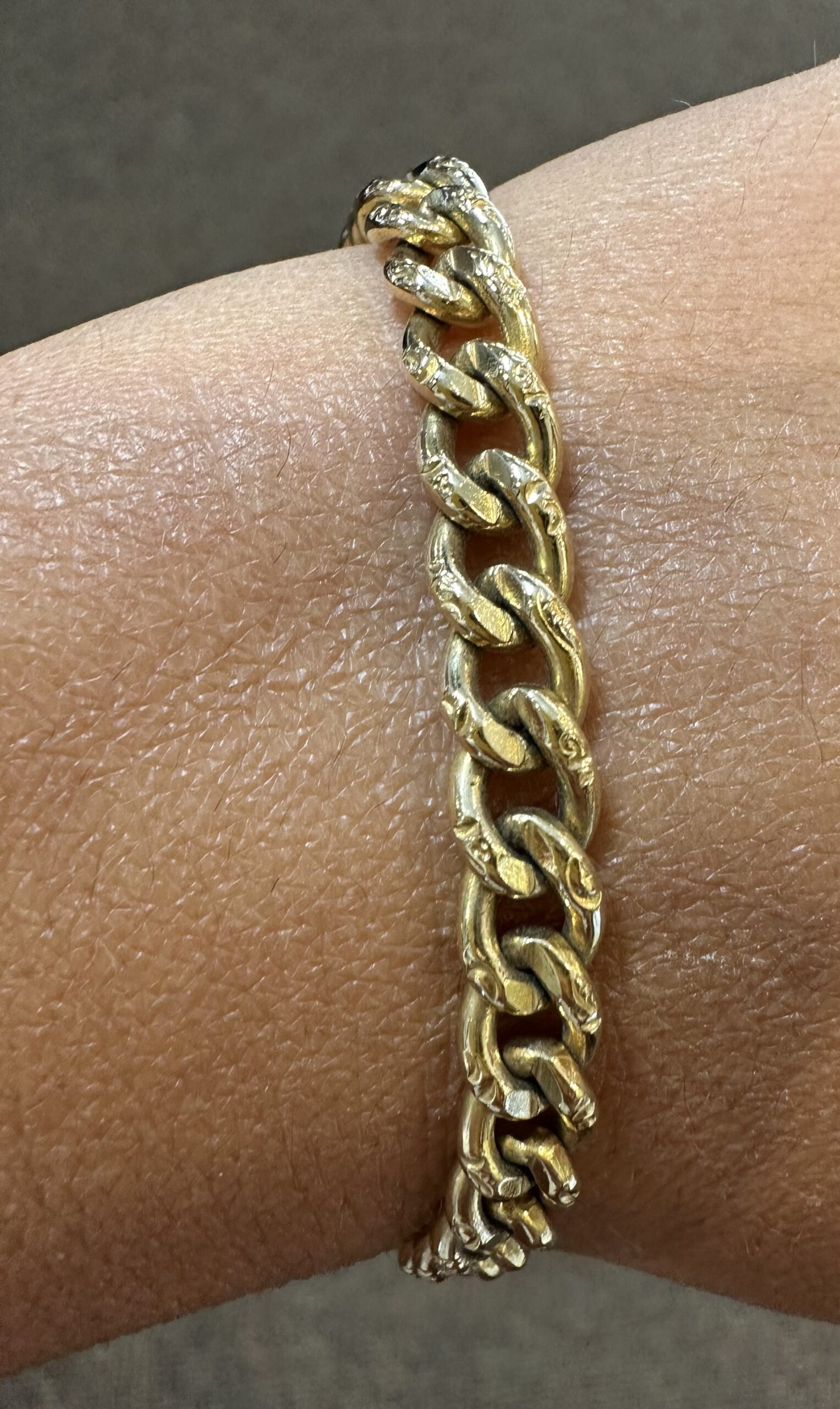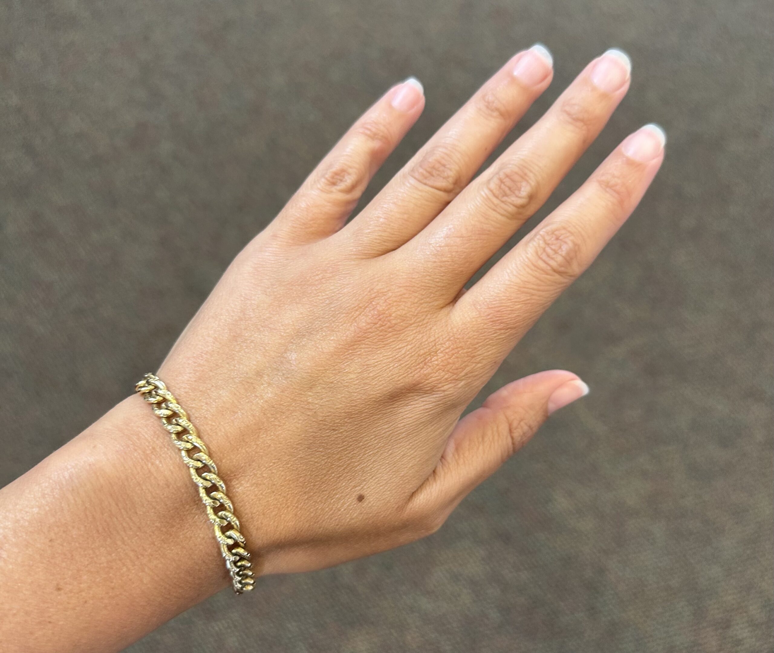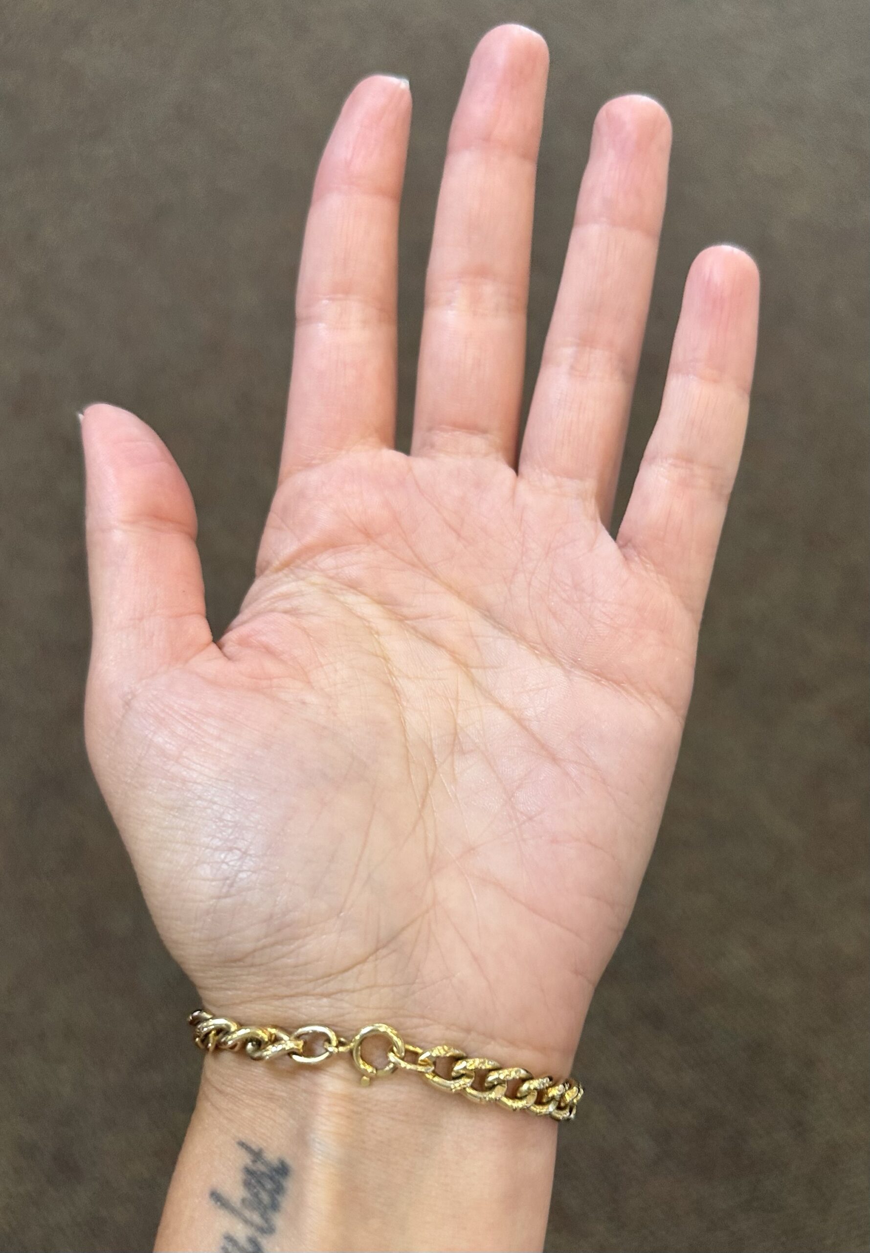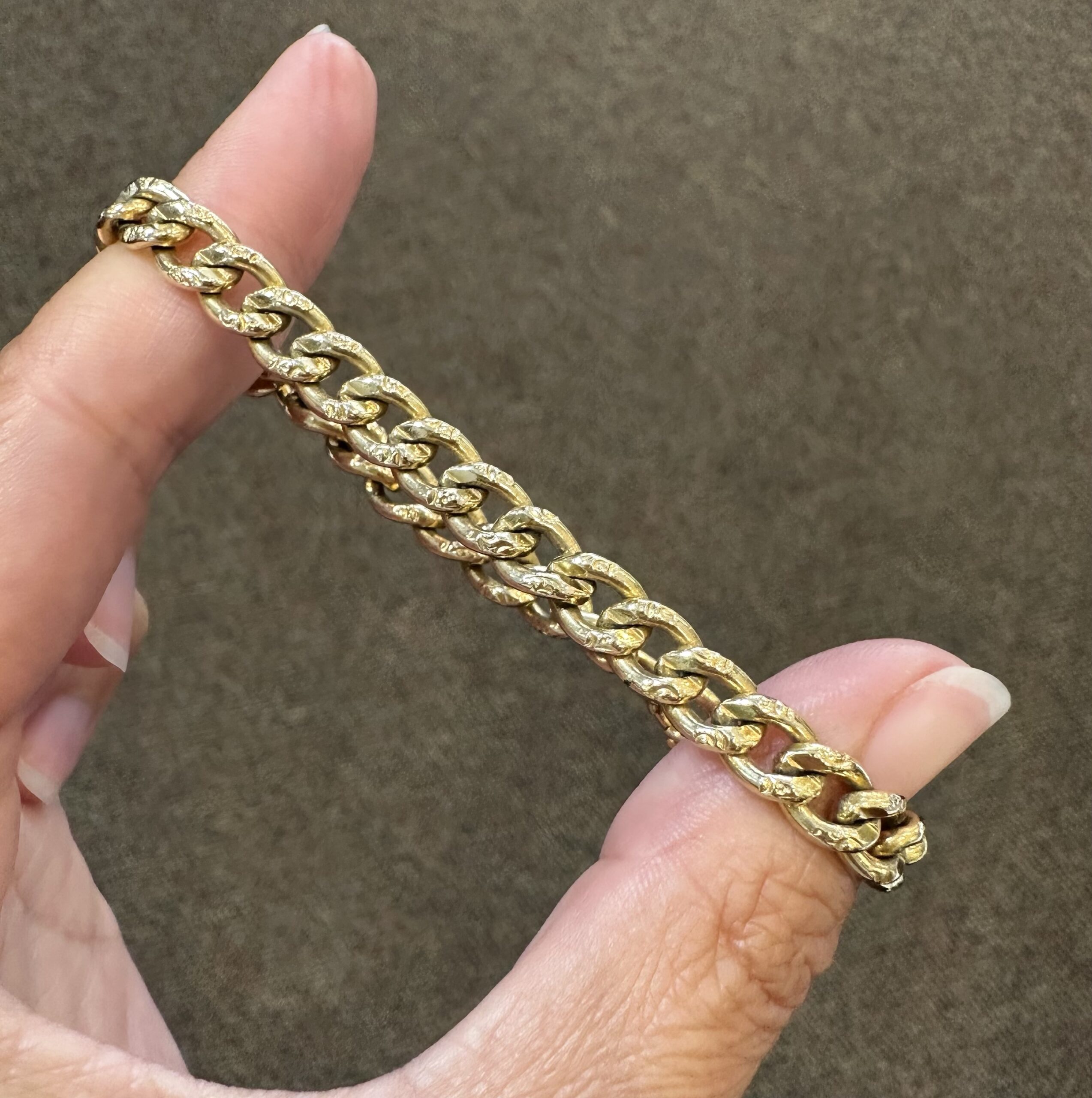 14k yellow gold 7 1/4” open oval link bracelet with textured accents with spring ring clasp, 6 mm wide, 20 grams.