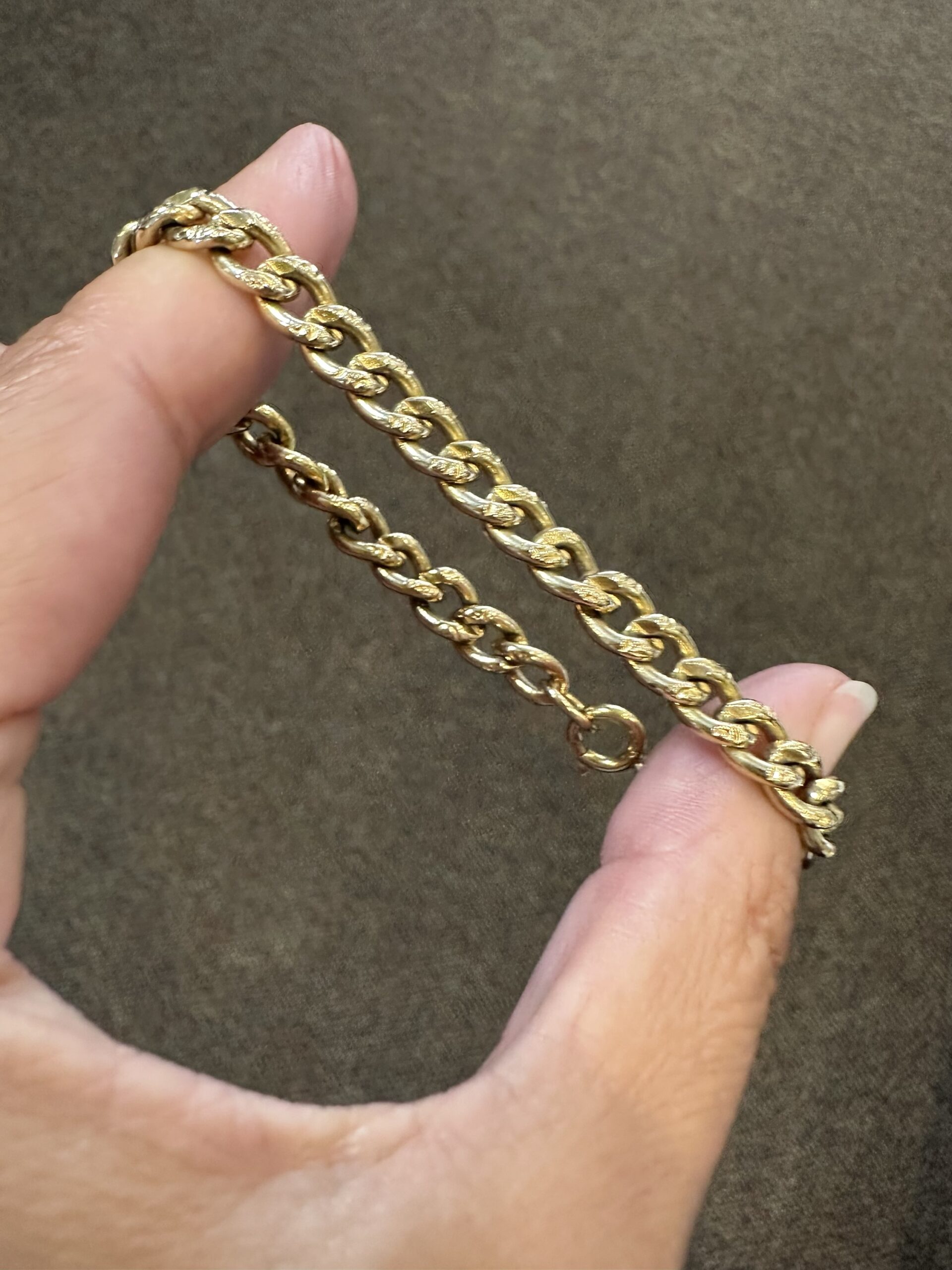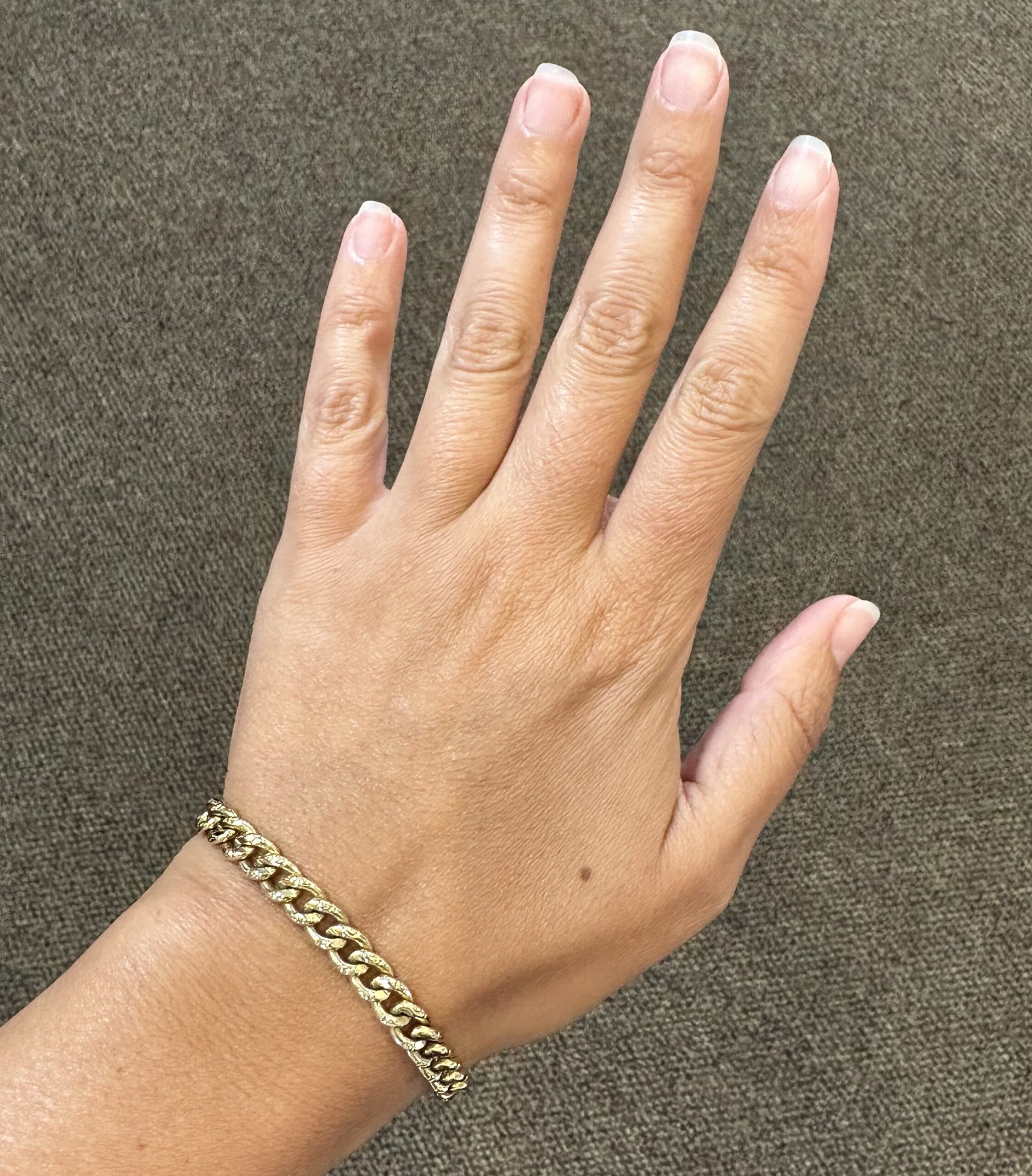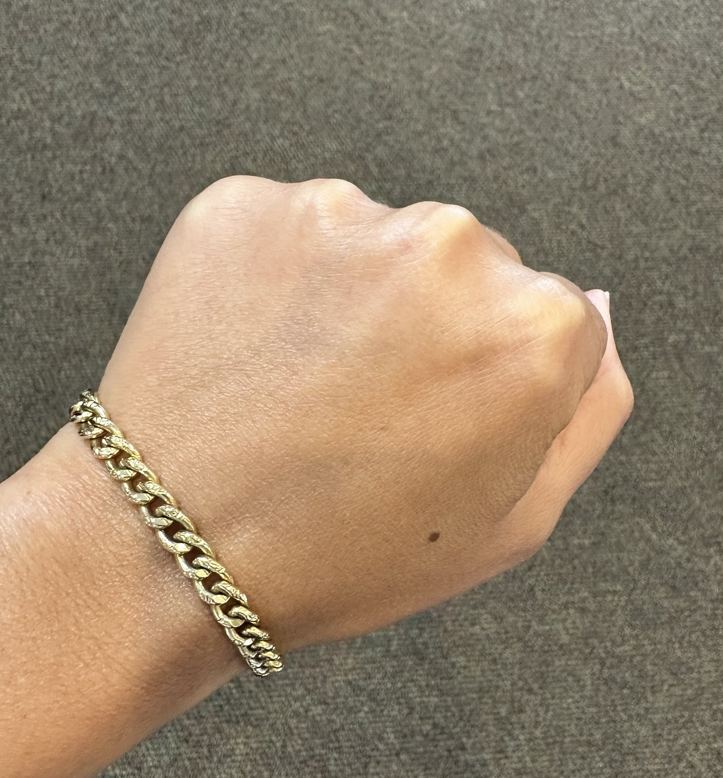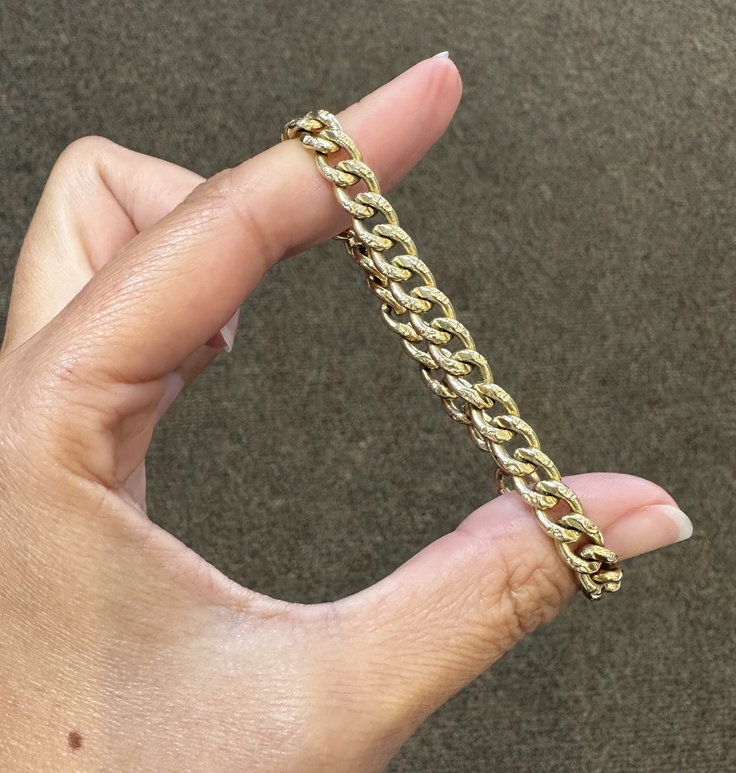 14k yellow gold 7 1/4” open oval link bracelet with textured accents with spring ring clasp, 6 mm wide, 20 grams.