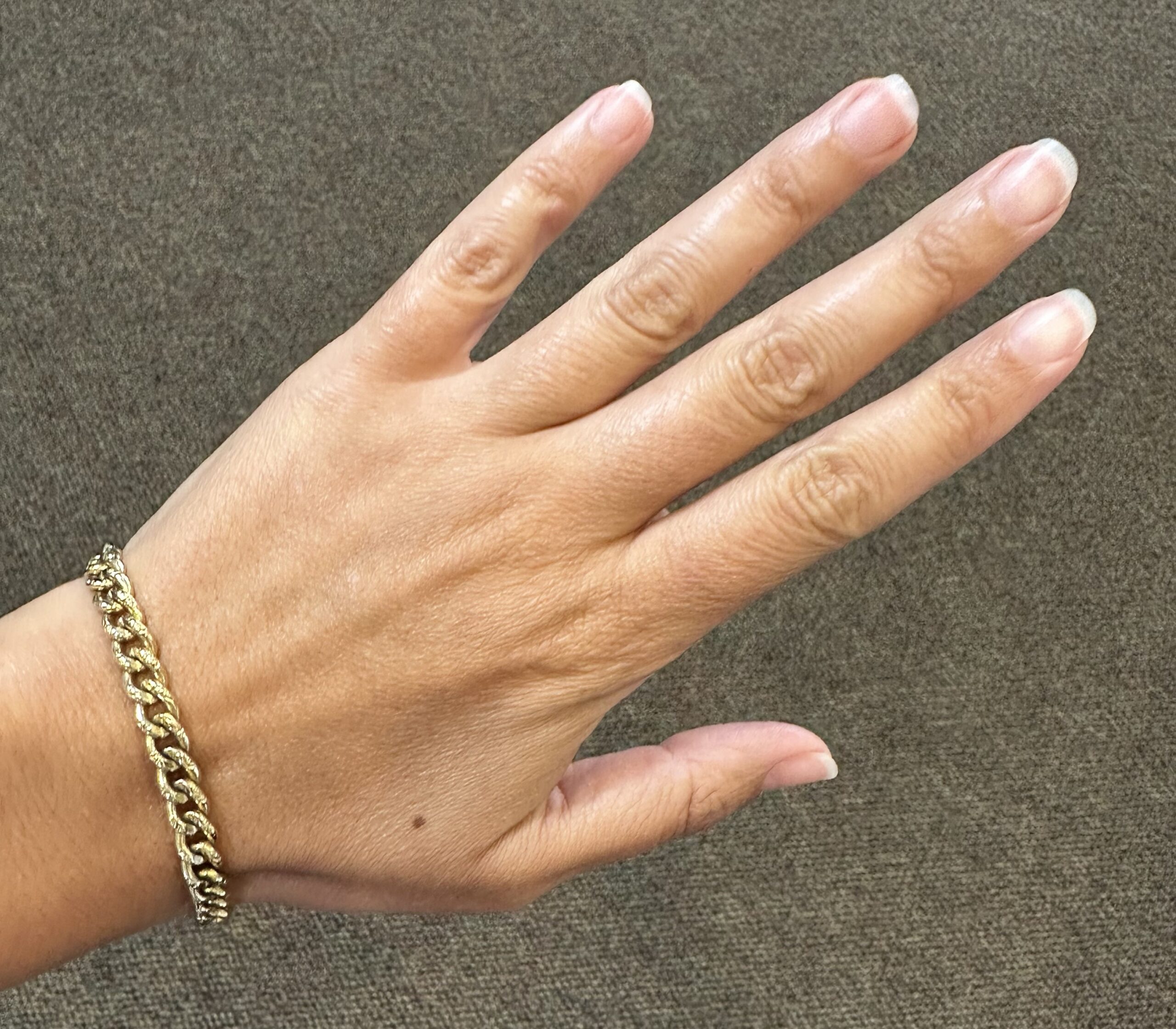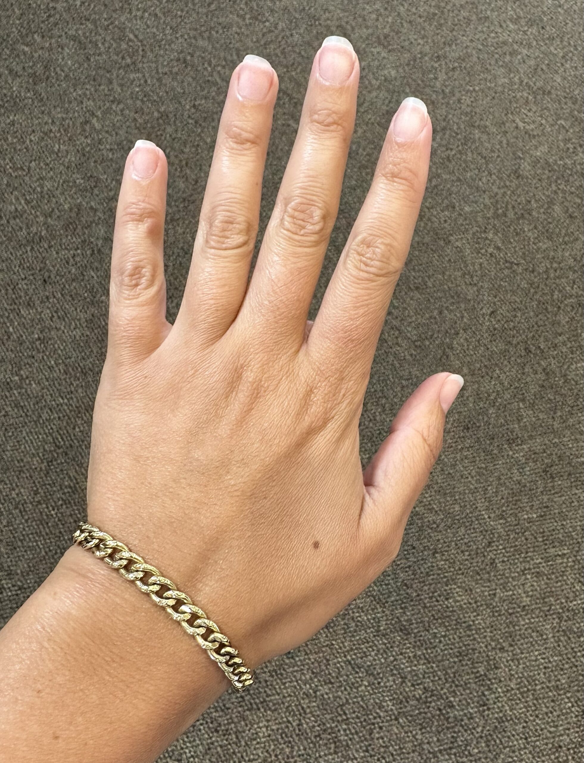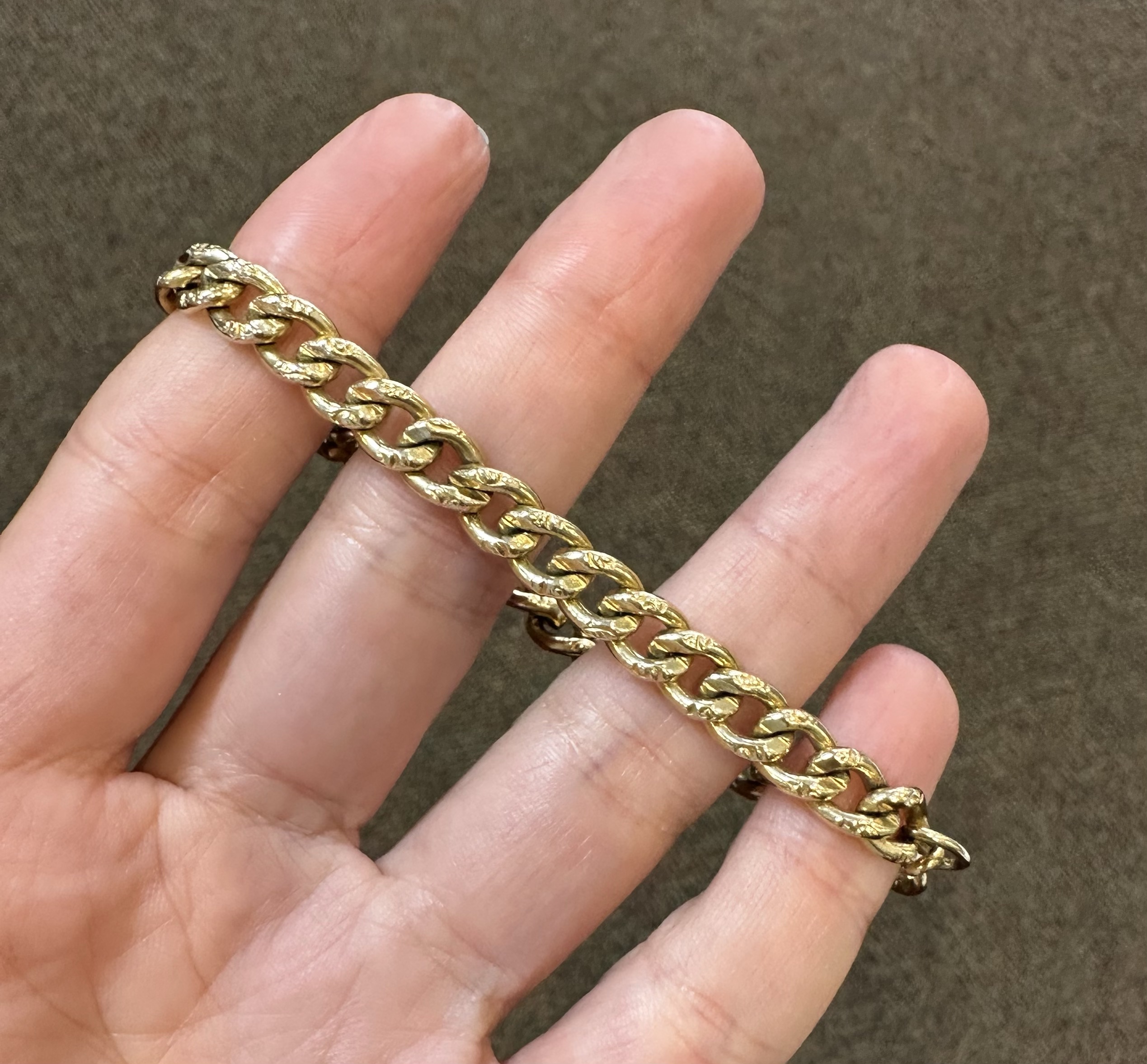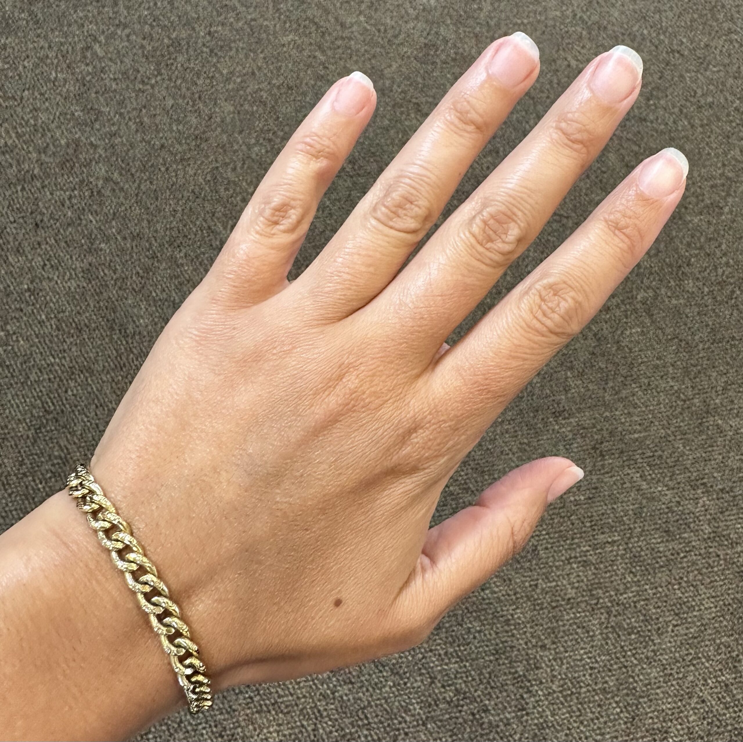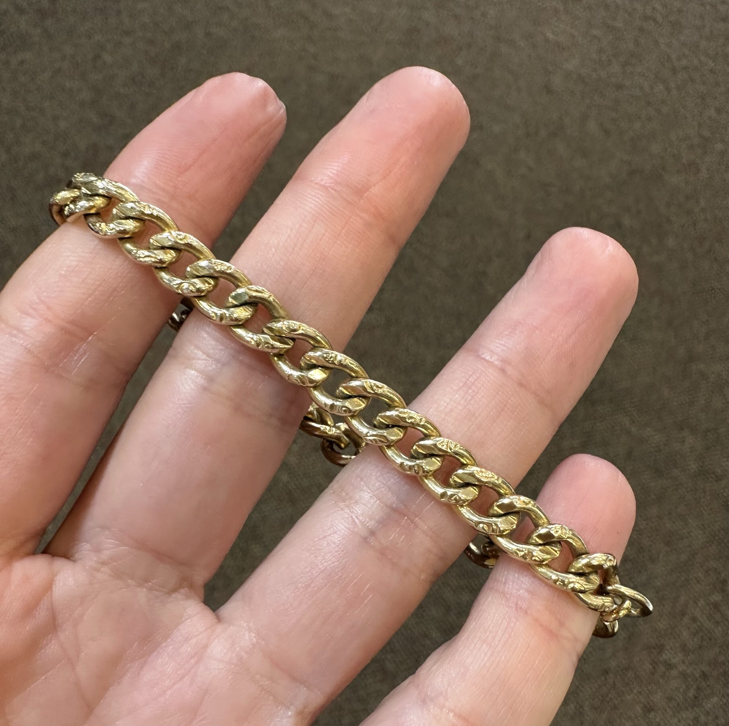 14k yellow gold 7 1/4” open oval link bracelet with textured accents with spring ring clasp, 6 mm wide, 20 grams.