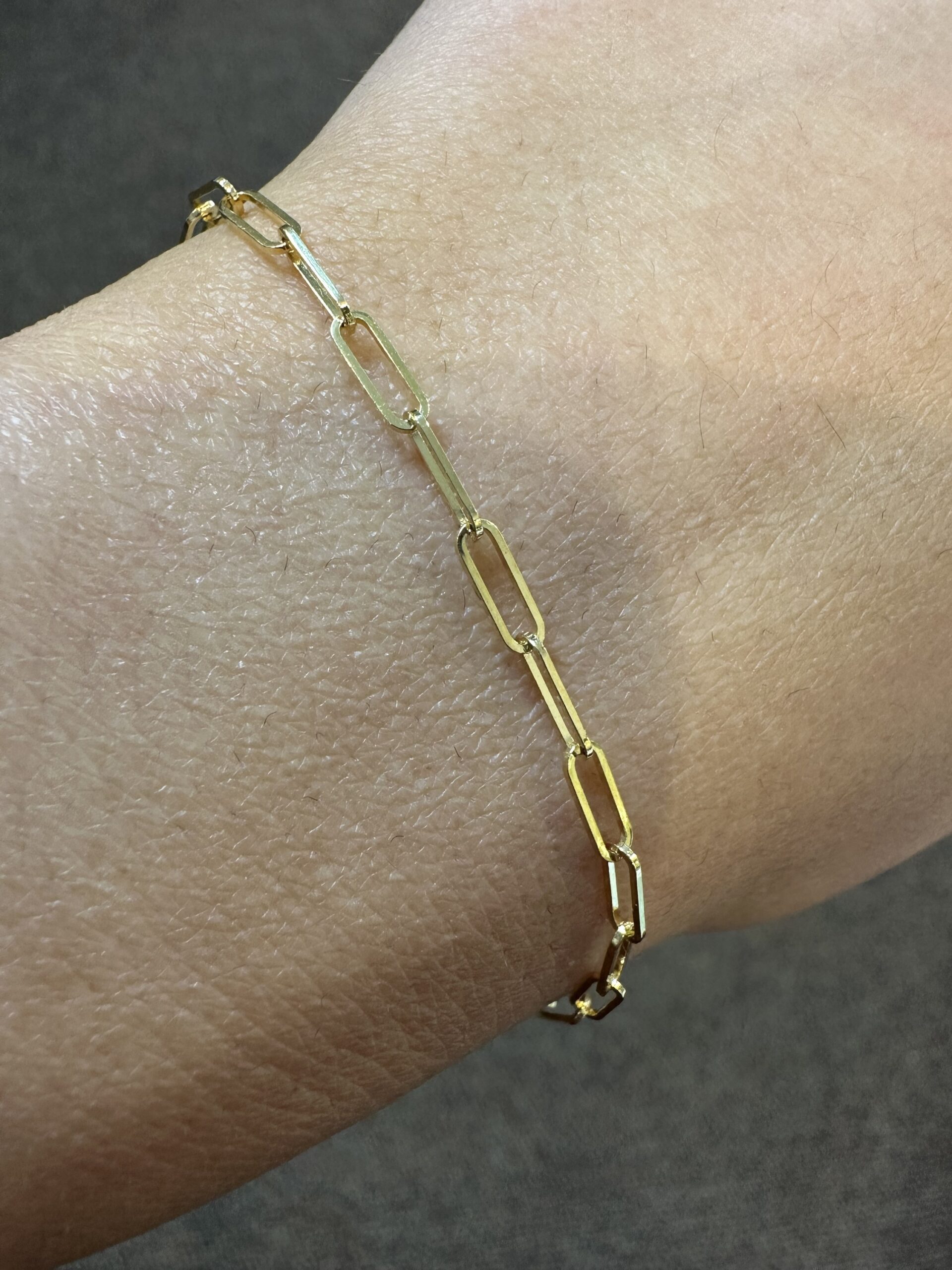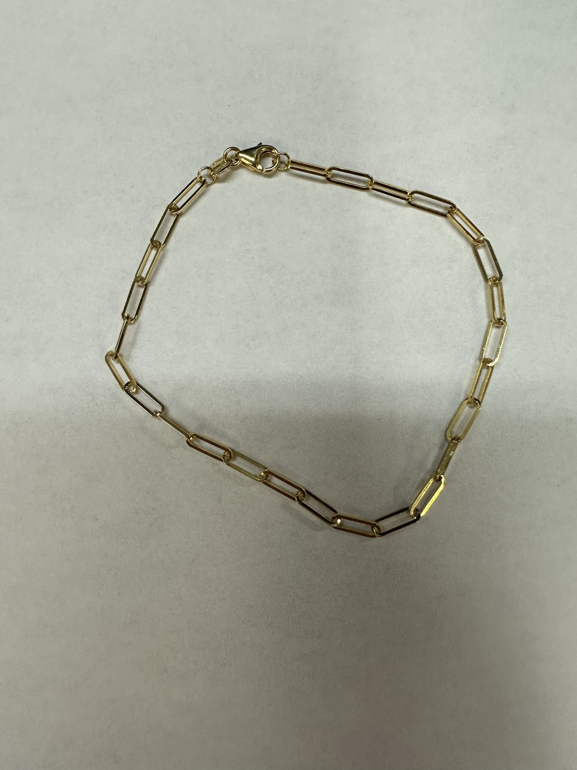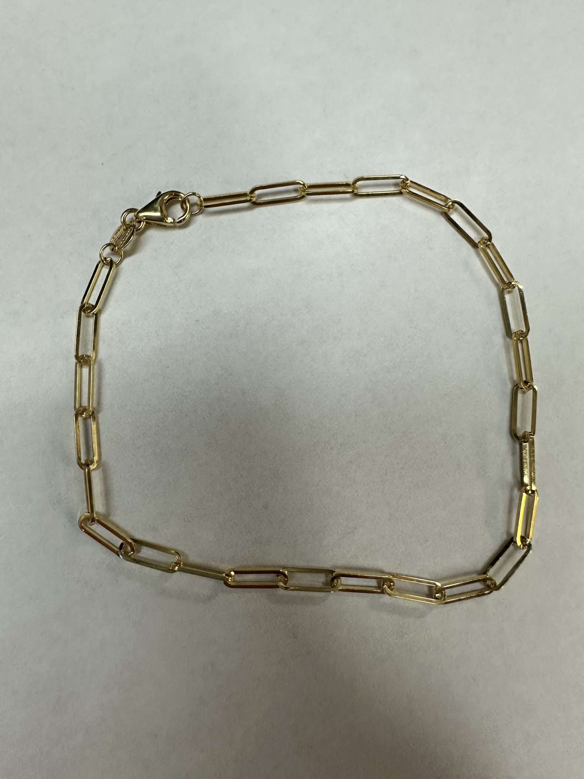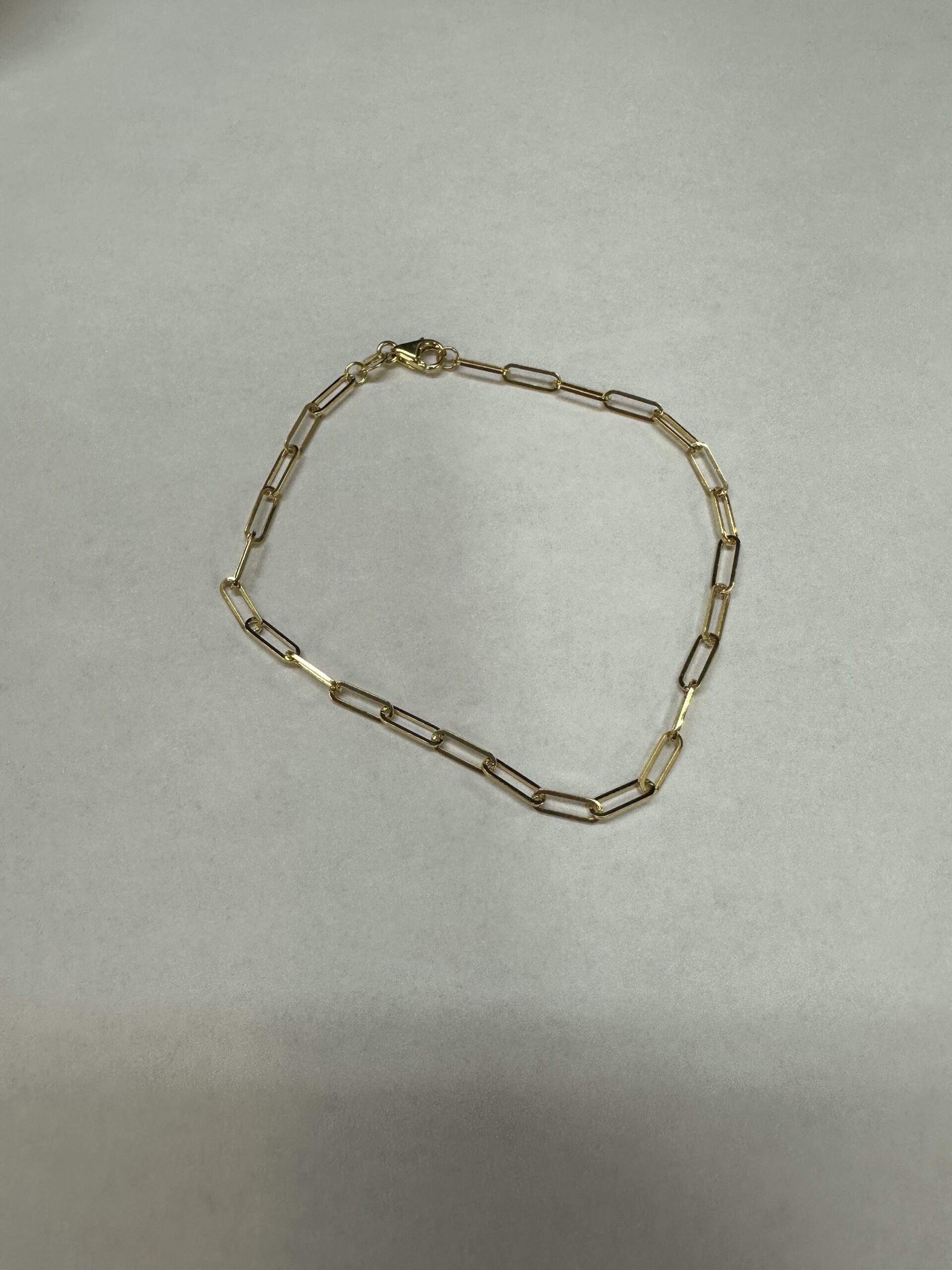 14k yellow gold 2.5 mm 7” paper clip link bracelet. This bracelet has an entire weight of 1.76 grams.