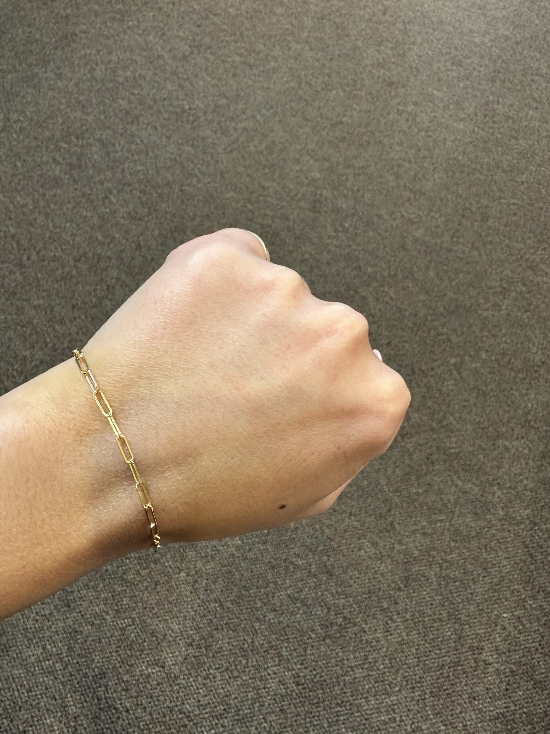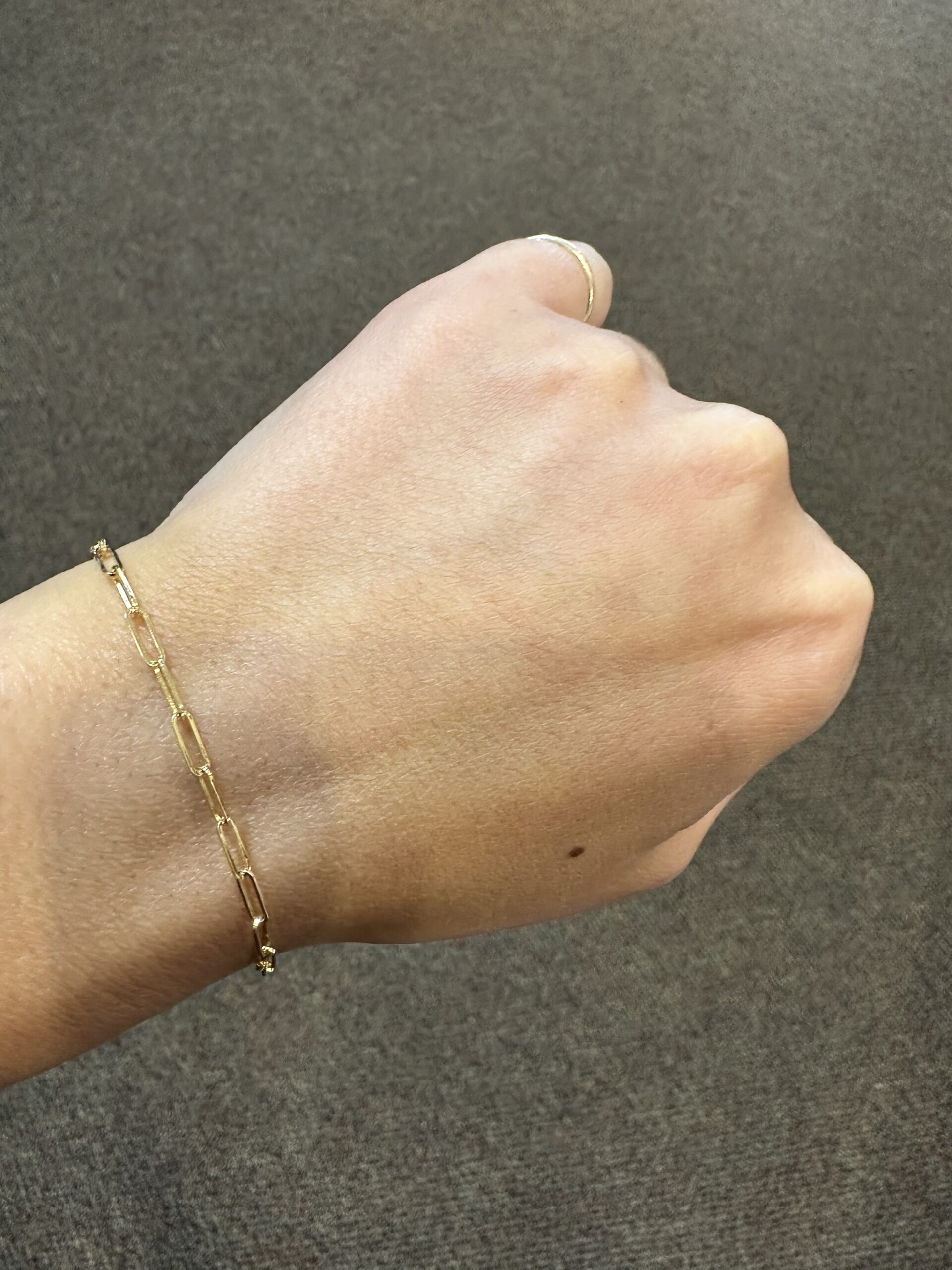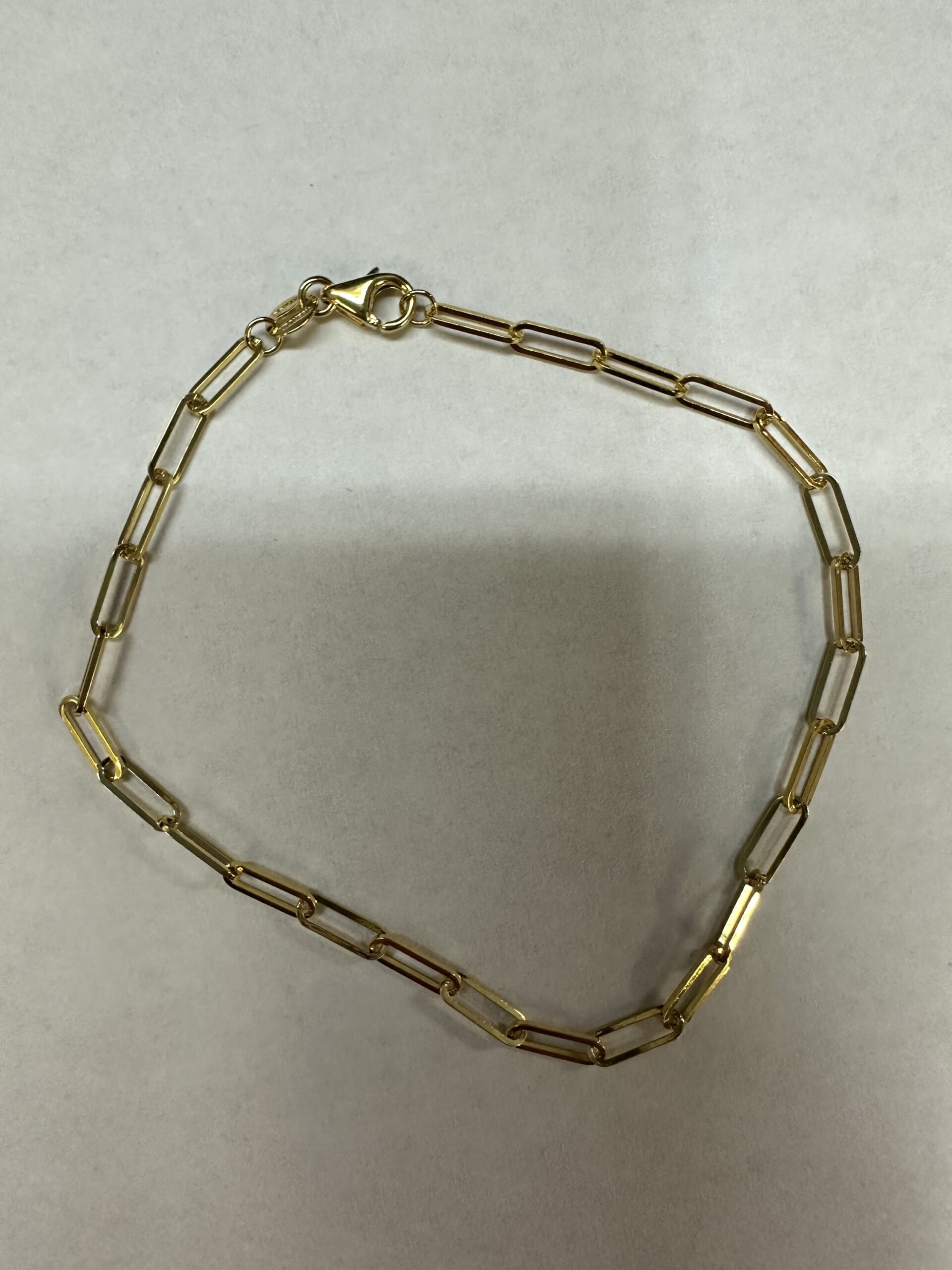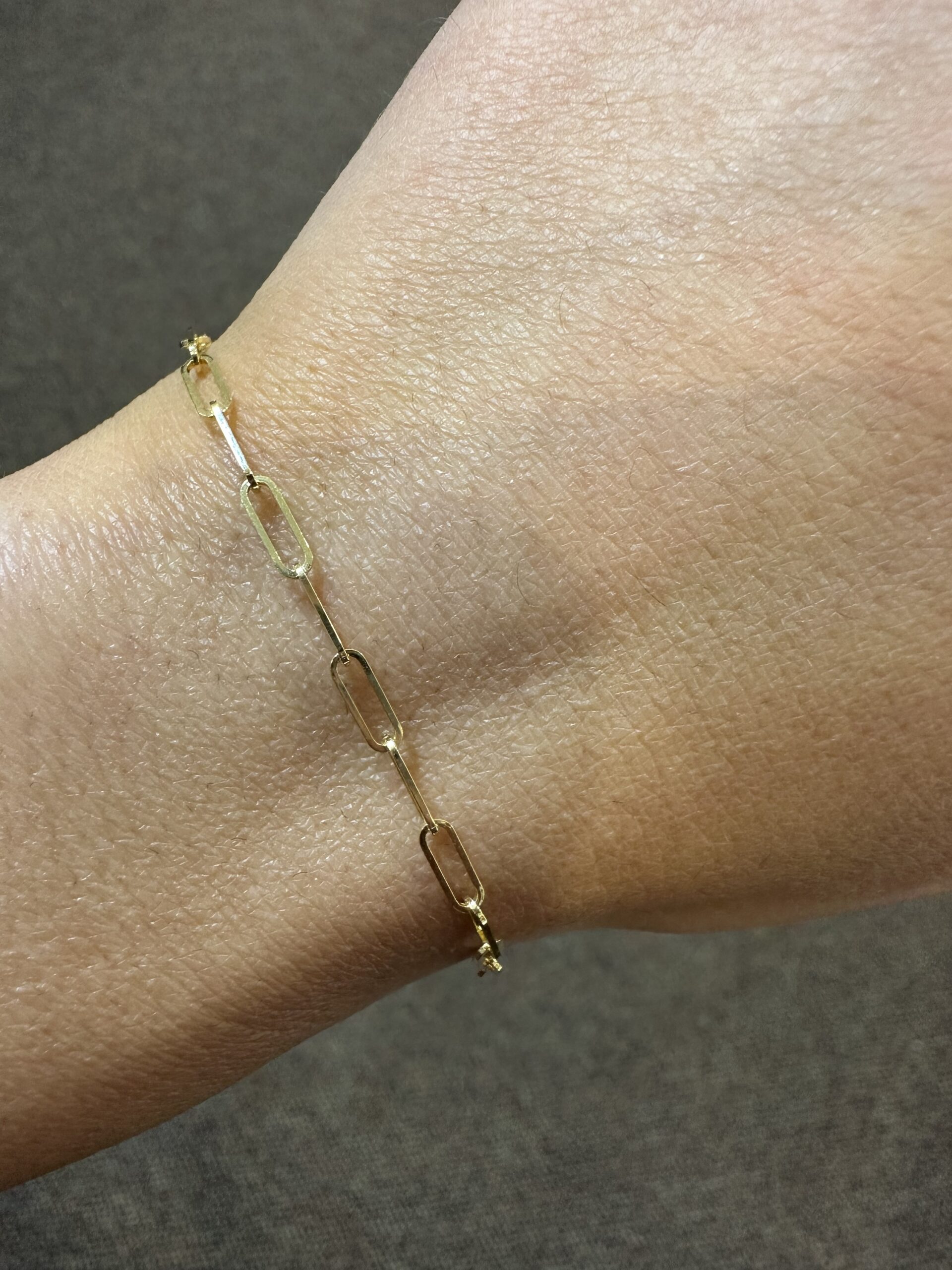 14k yellow gold 2.5 mm 7” paper clip link bracelet. This bracelet has an entire weight of 1.76 grams.