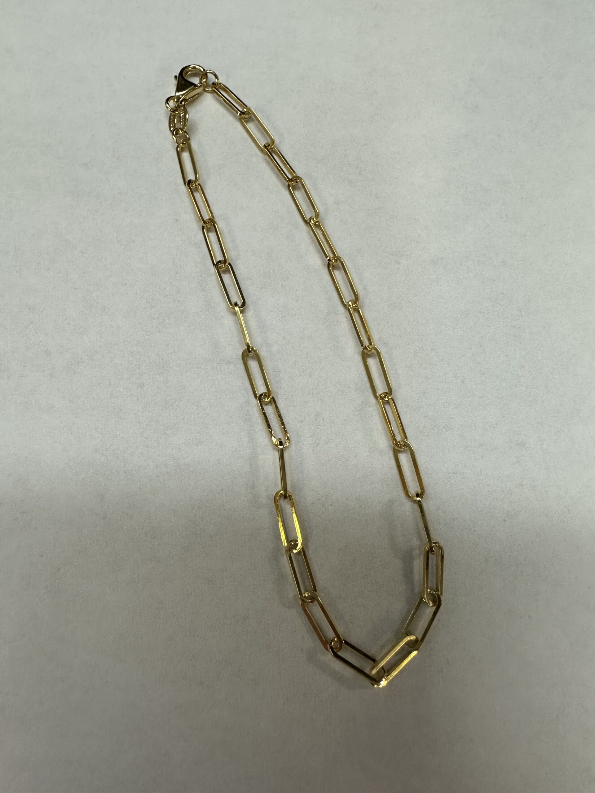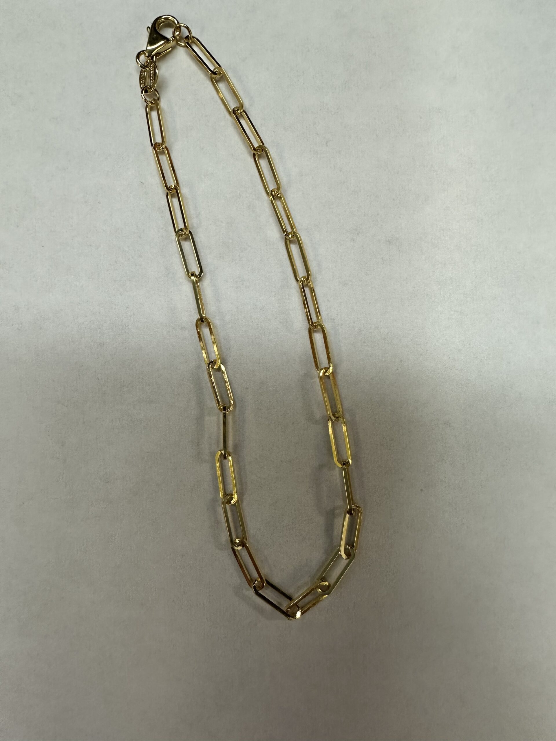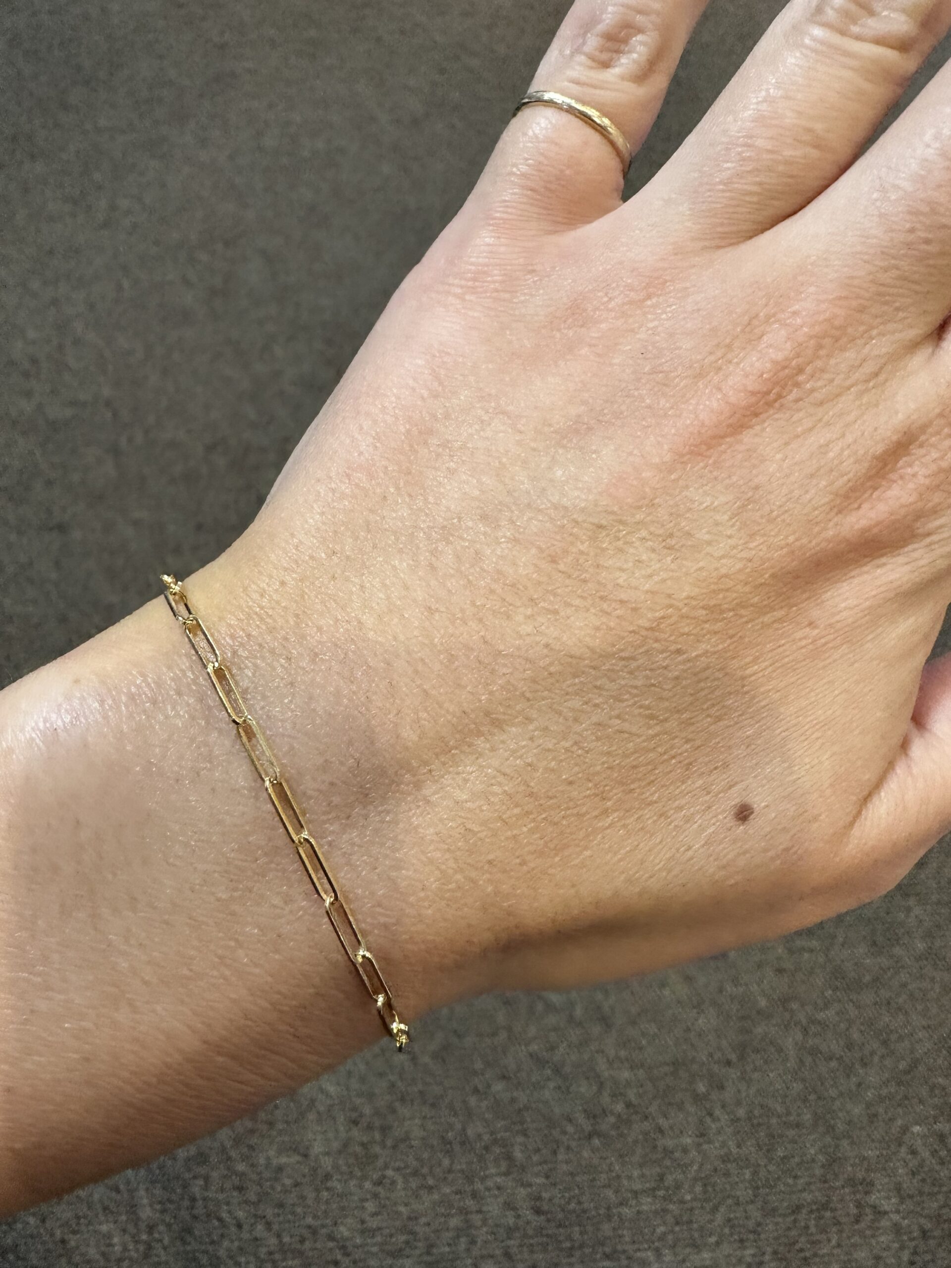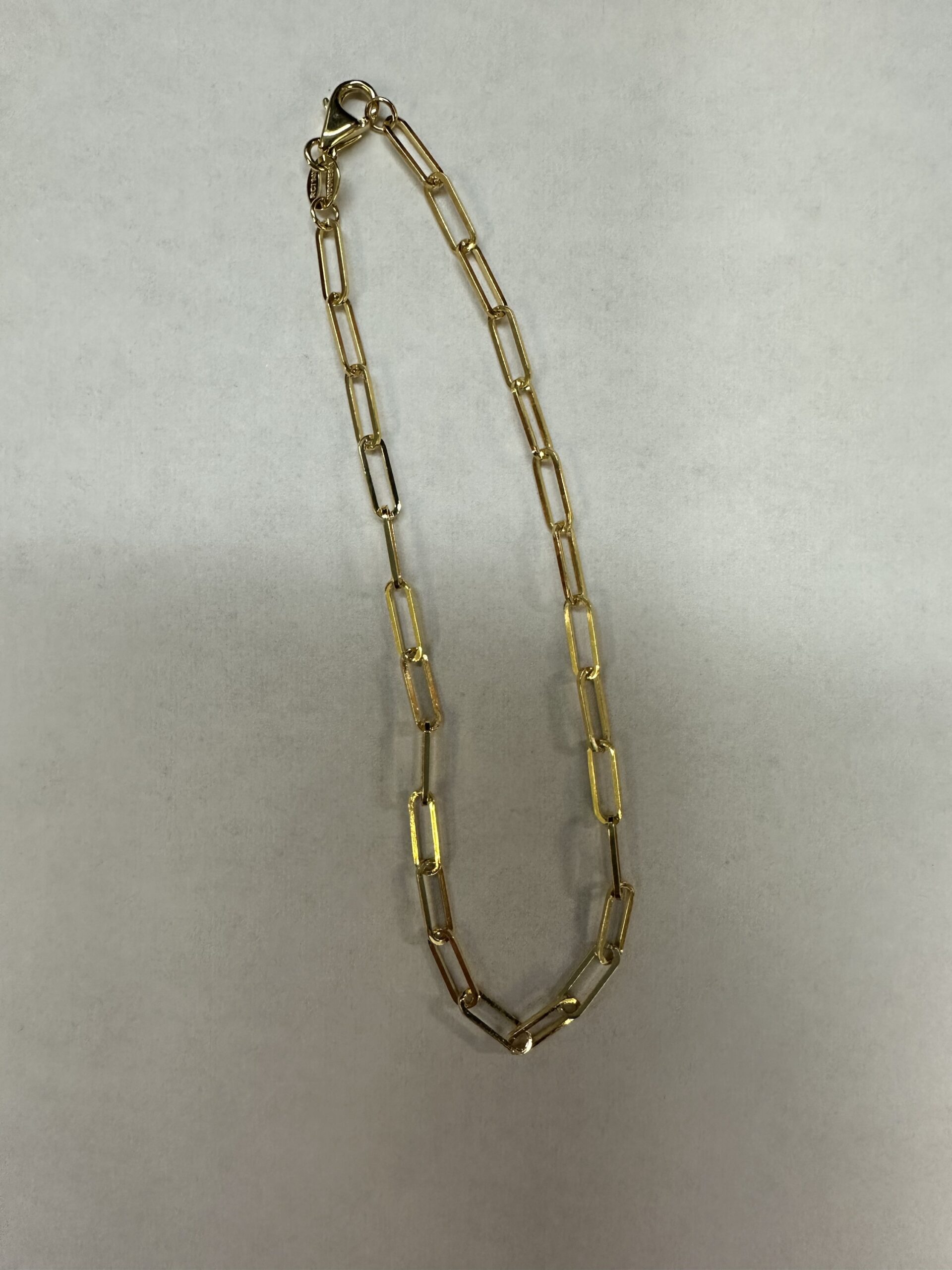 14k yellow gold 2.5 mm 7” paper clip link bracelet. This bracelet has an entire weight of 1.76 grams.