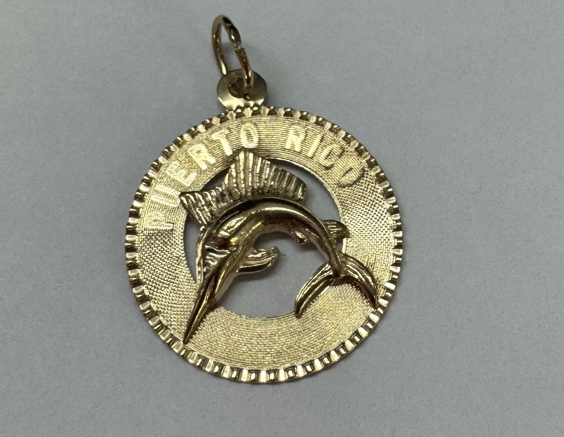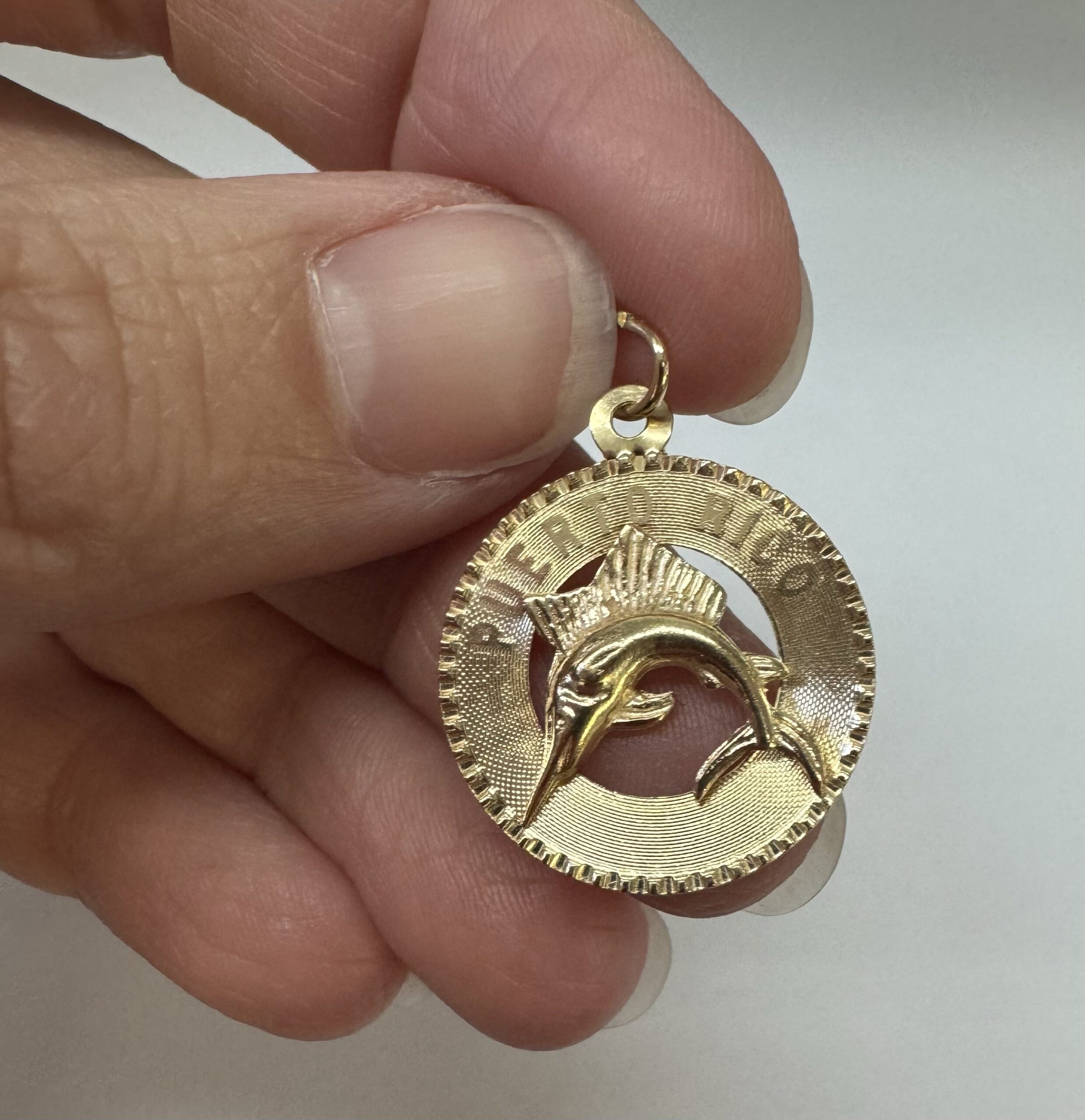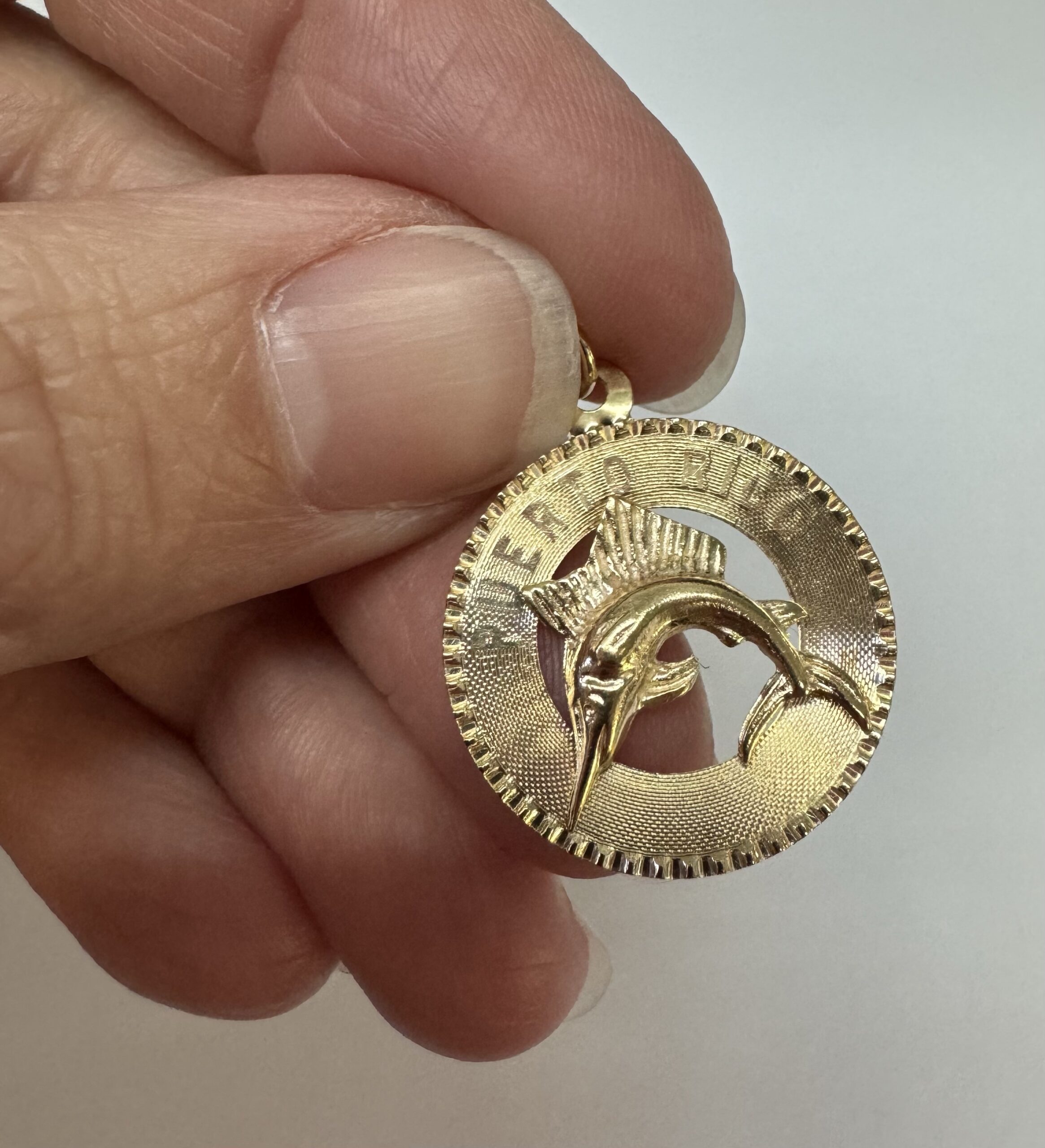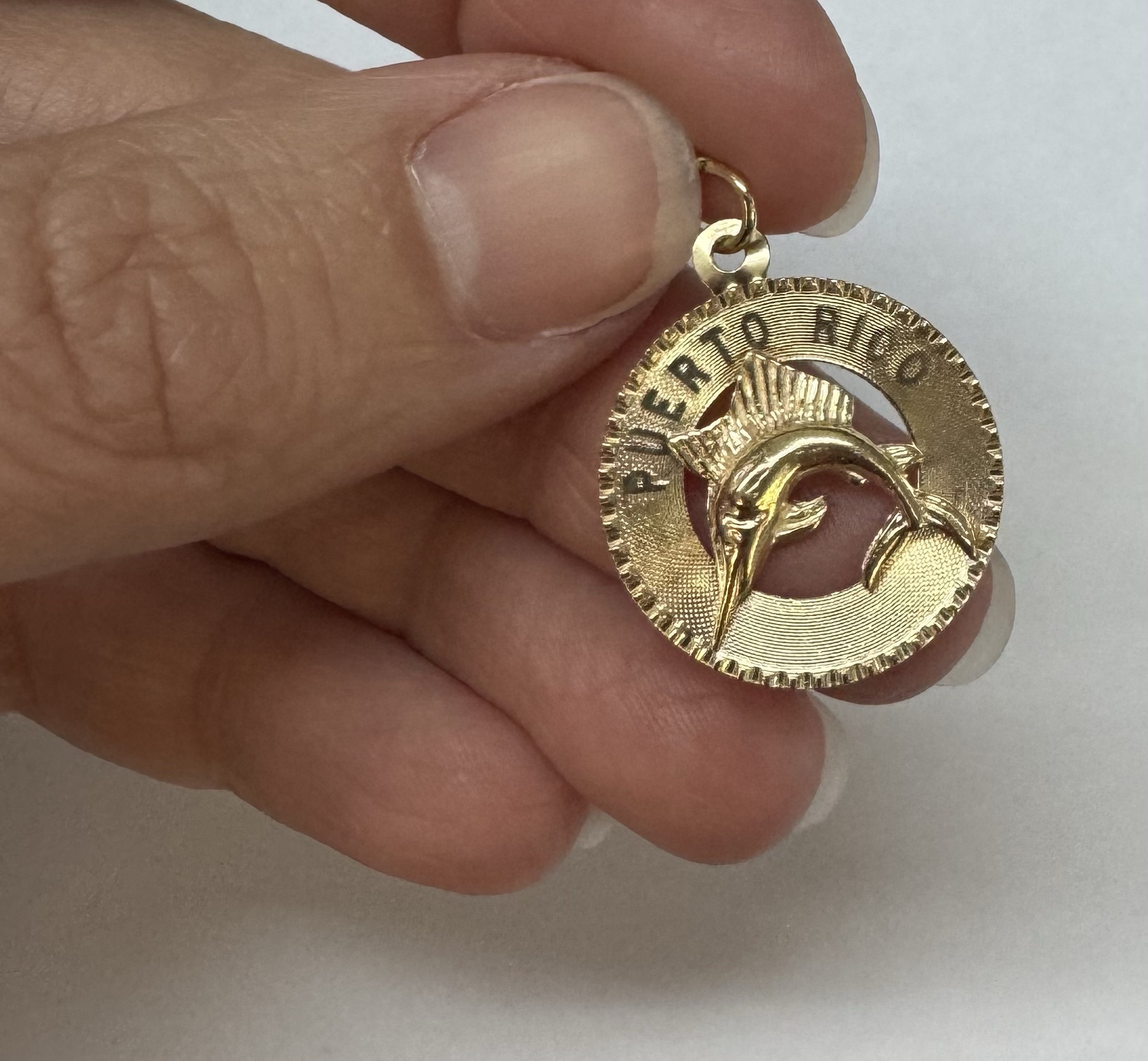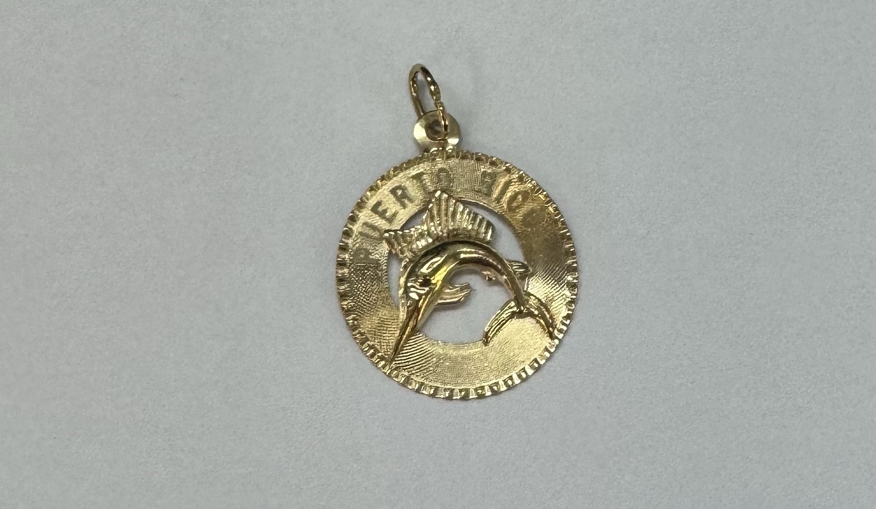 Vintage 14k yellow gold flat disc pendant/charm engraved “Puerto Rico” charm with a Marlin. This charm is engraved “1965” on the back. This piece has an entire weight of 1.29 grams.