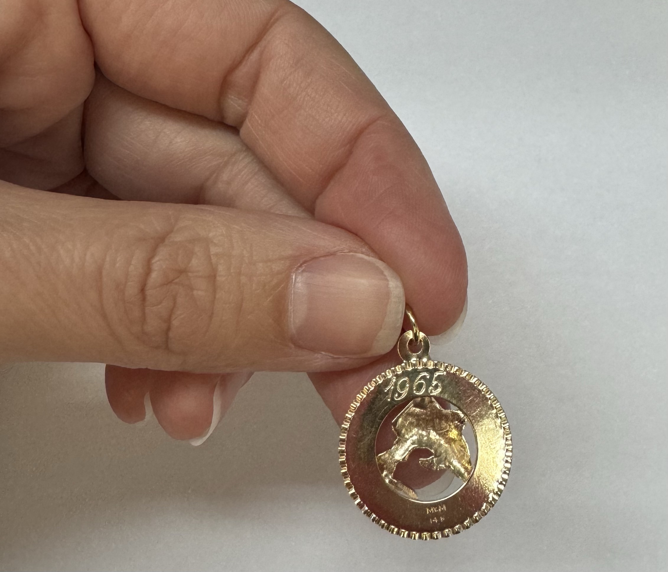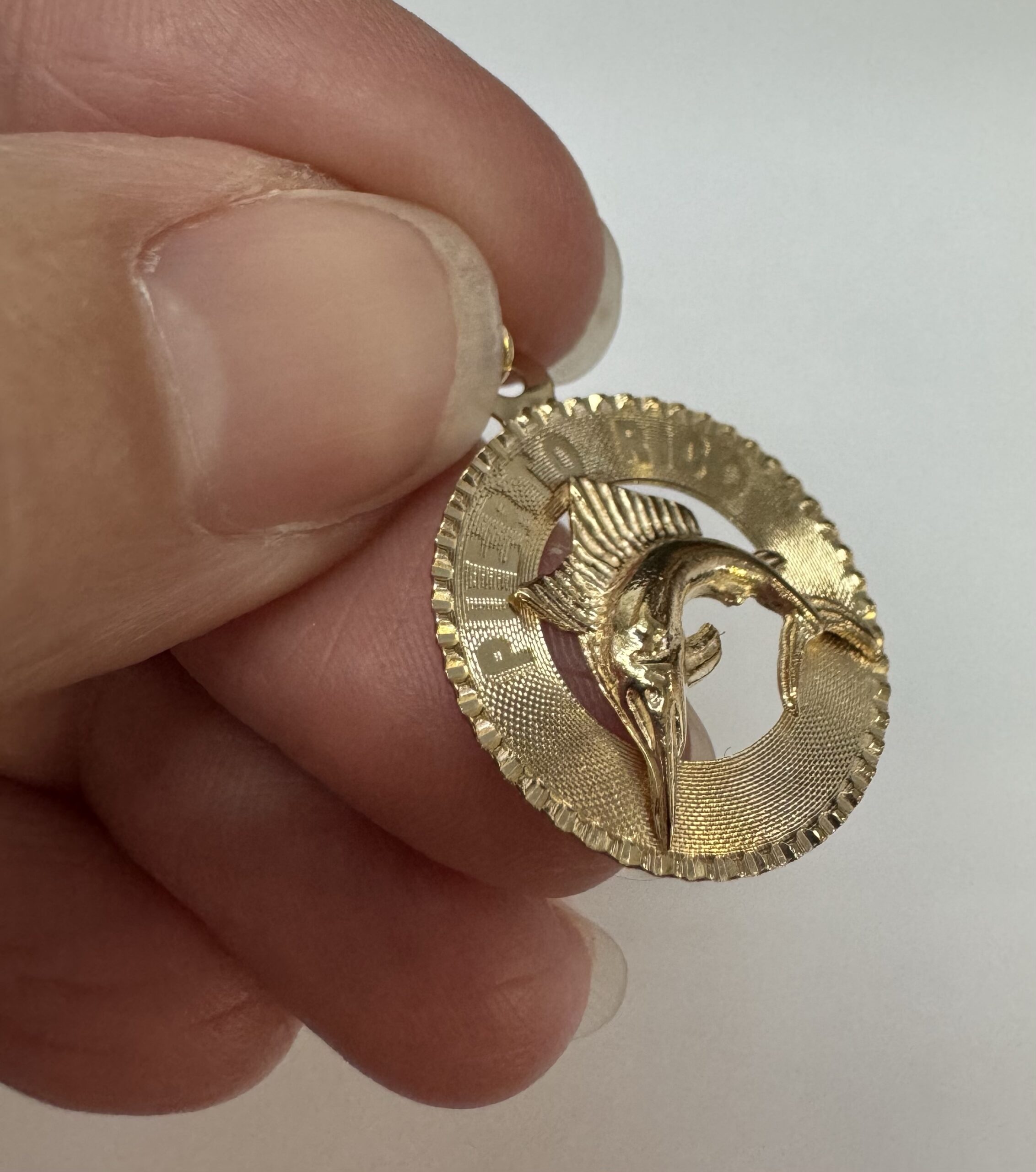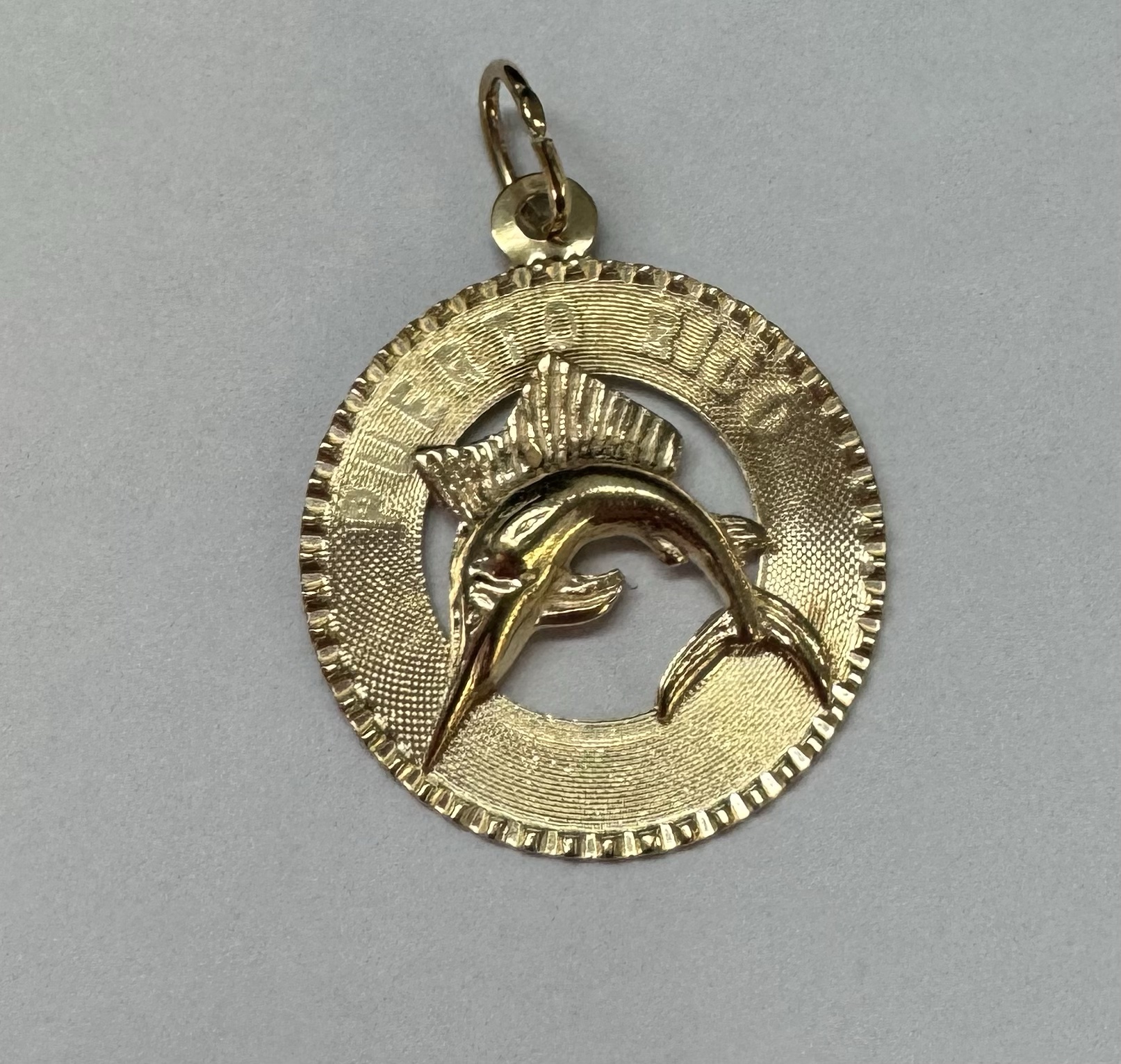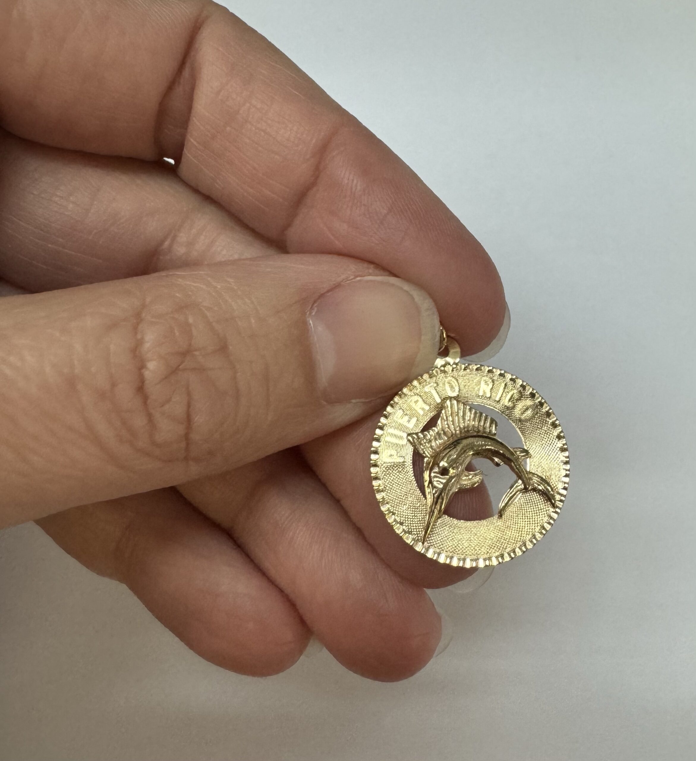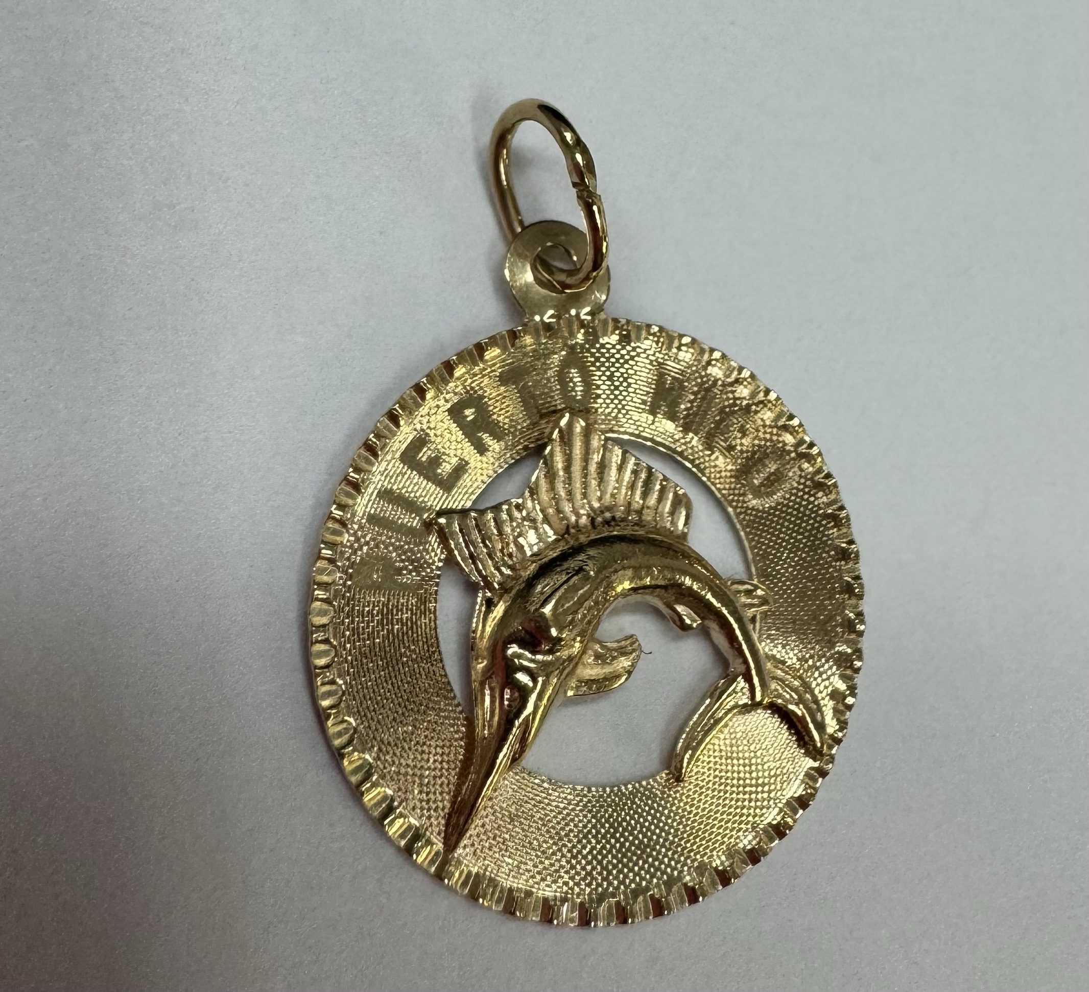Vintage 14k yellow gold flat disc pendant/charm engraved “Puerto Rico” charm with a Marlin. This charm is engraved “1965” on the back. This piece has an entire weight of 1.29 grams.