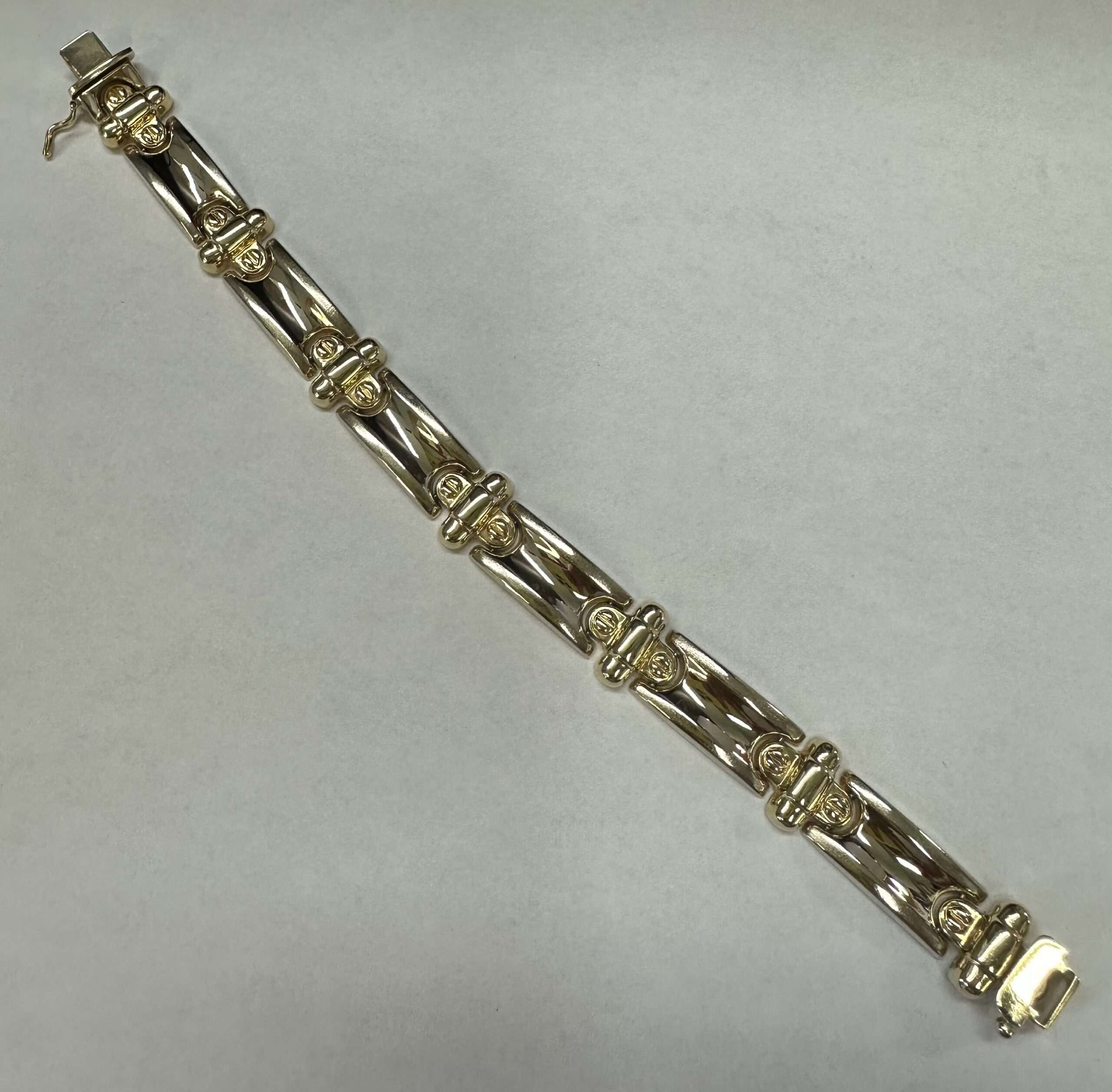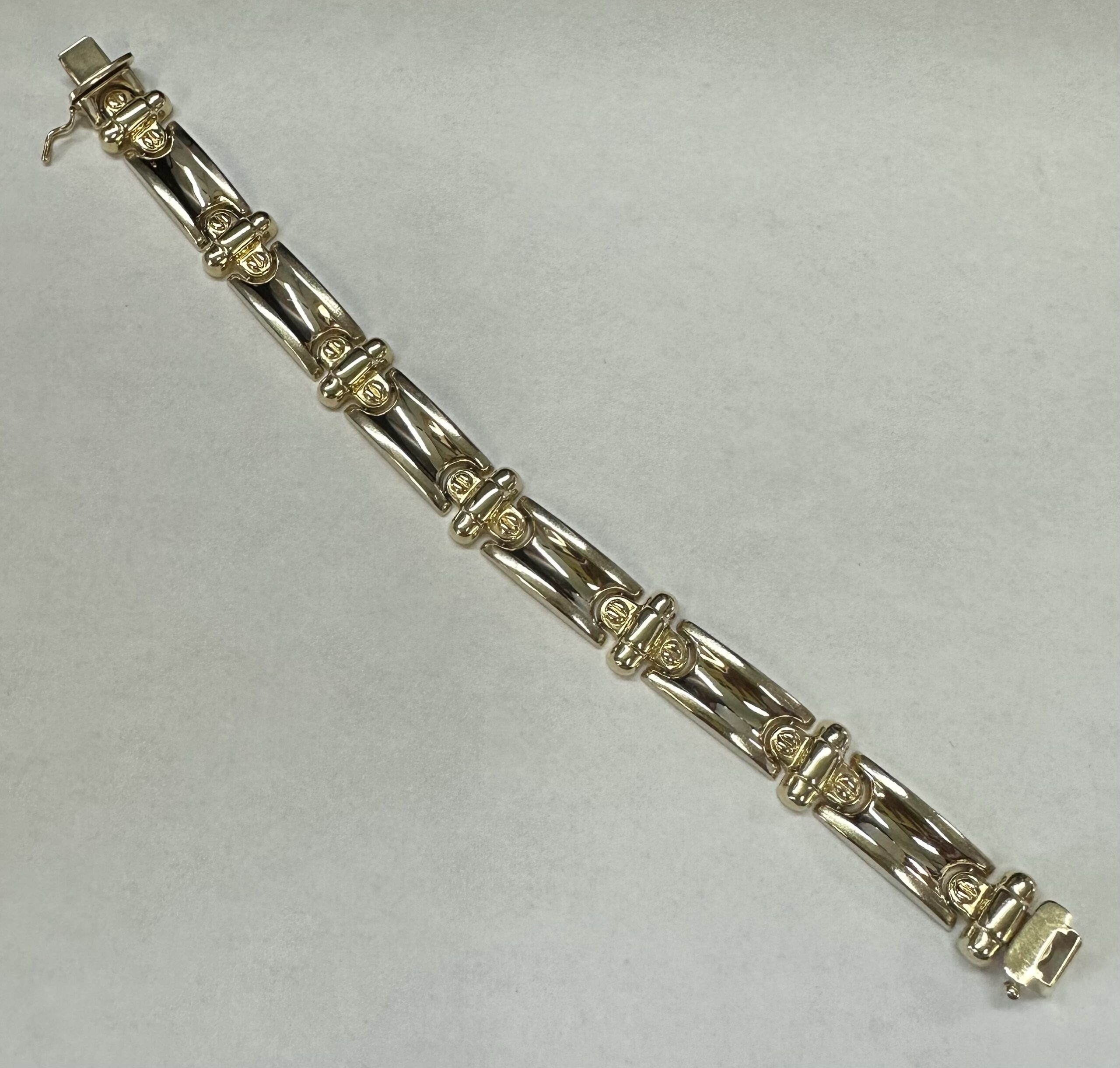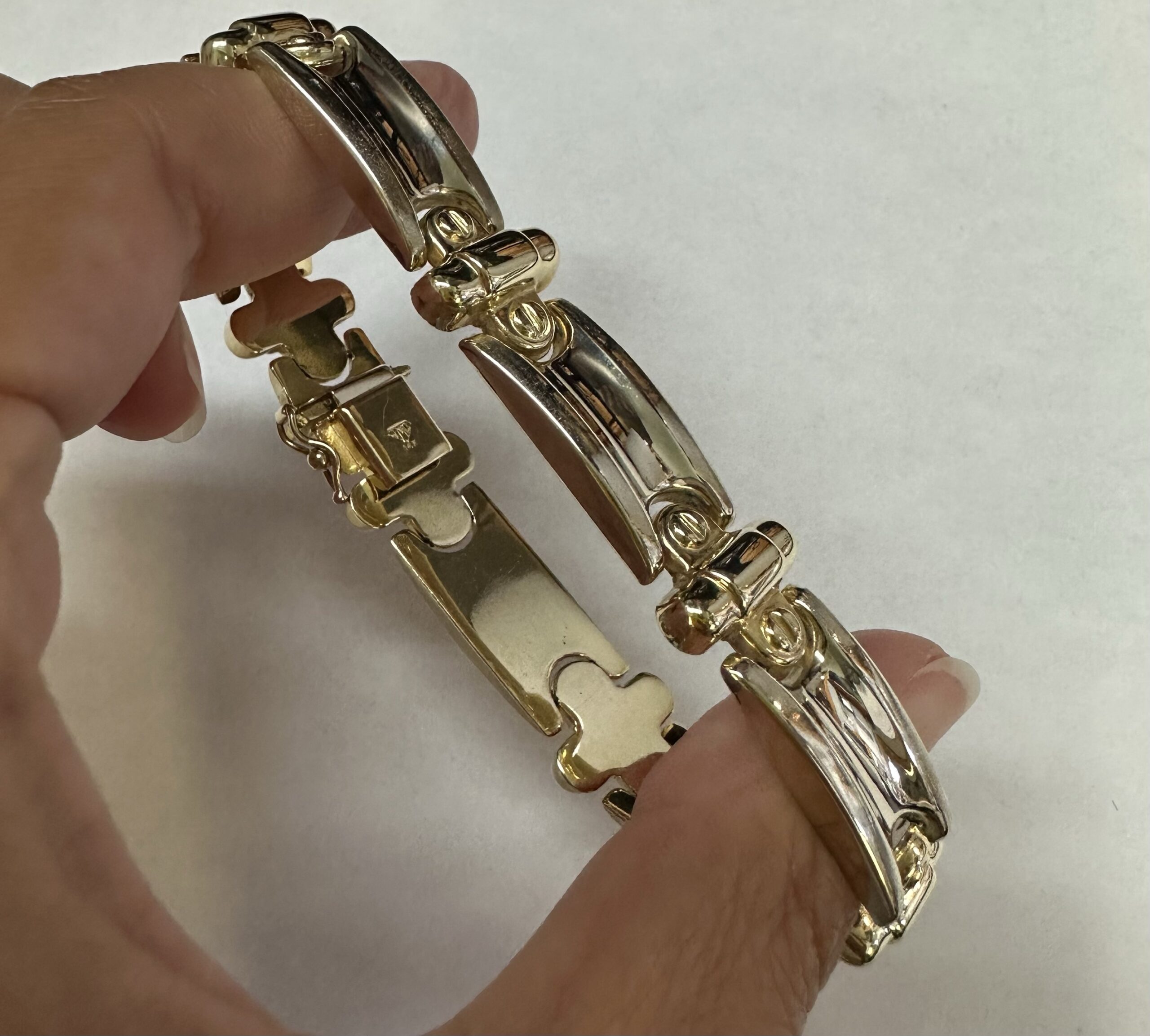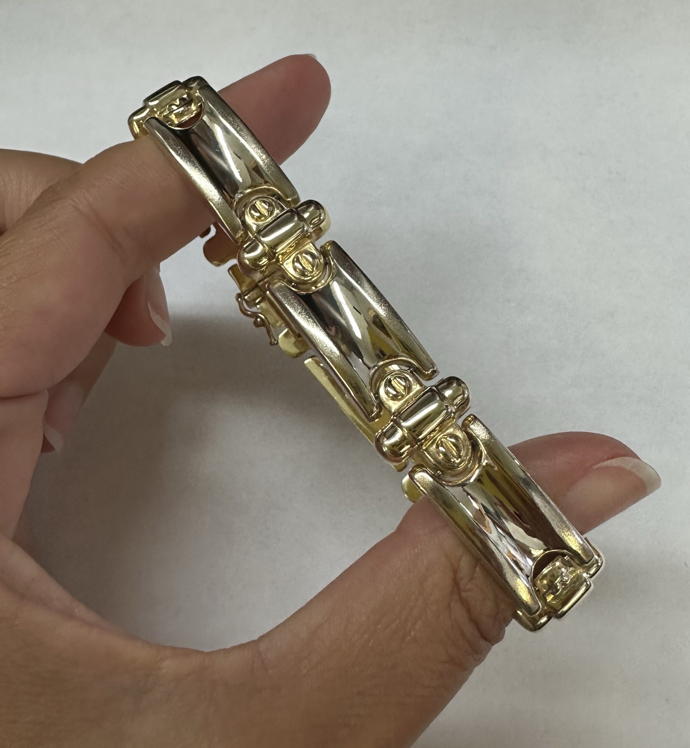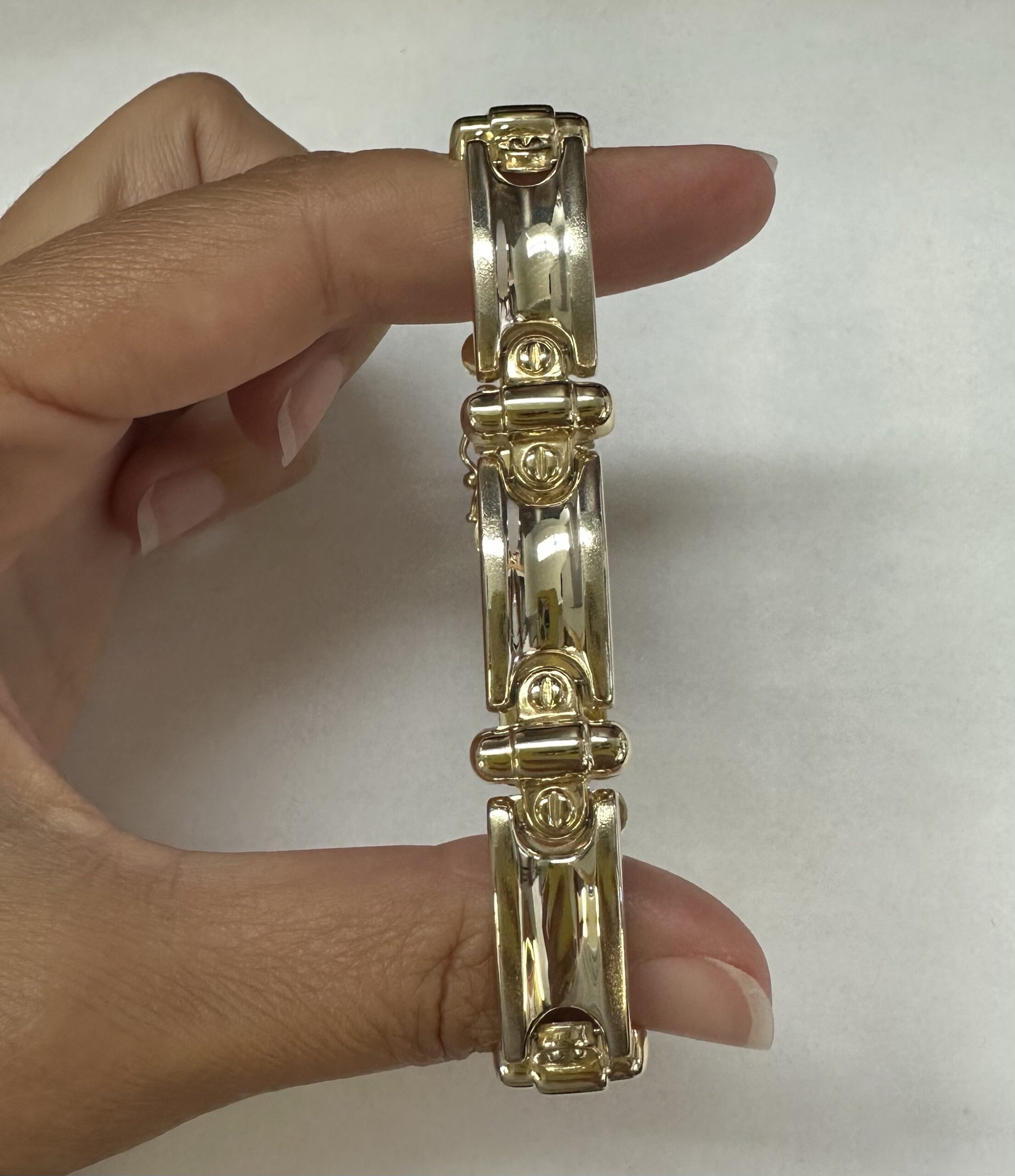 14k yellow gold rectangular link and rivet style bracelet. This bracelet measures 13 mm in width, 7 1/2” in length, and it has an entire weight of 20.5 grams.