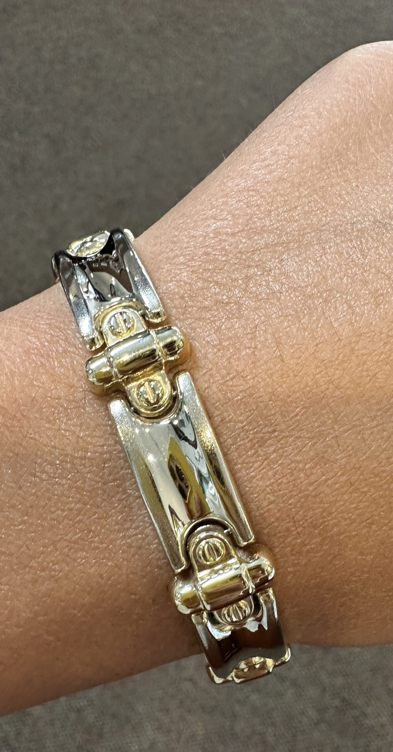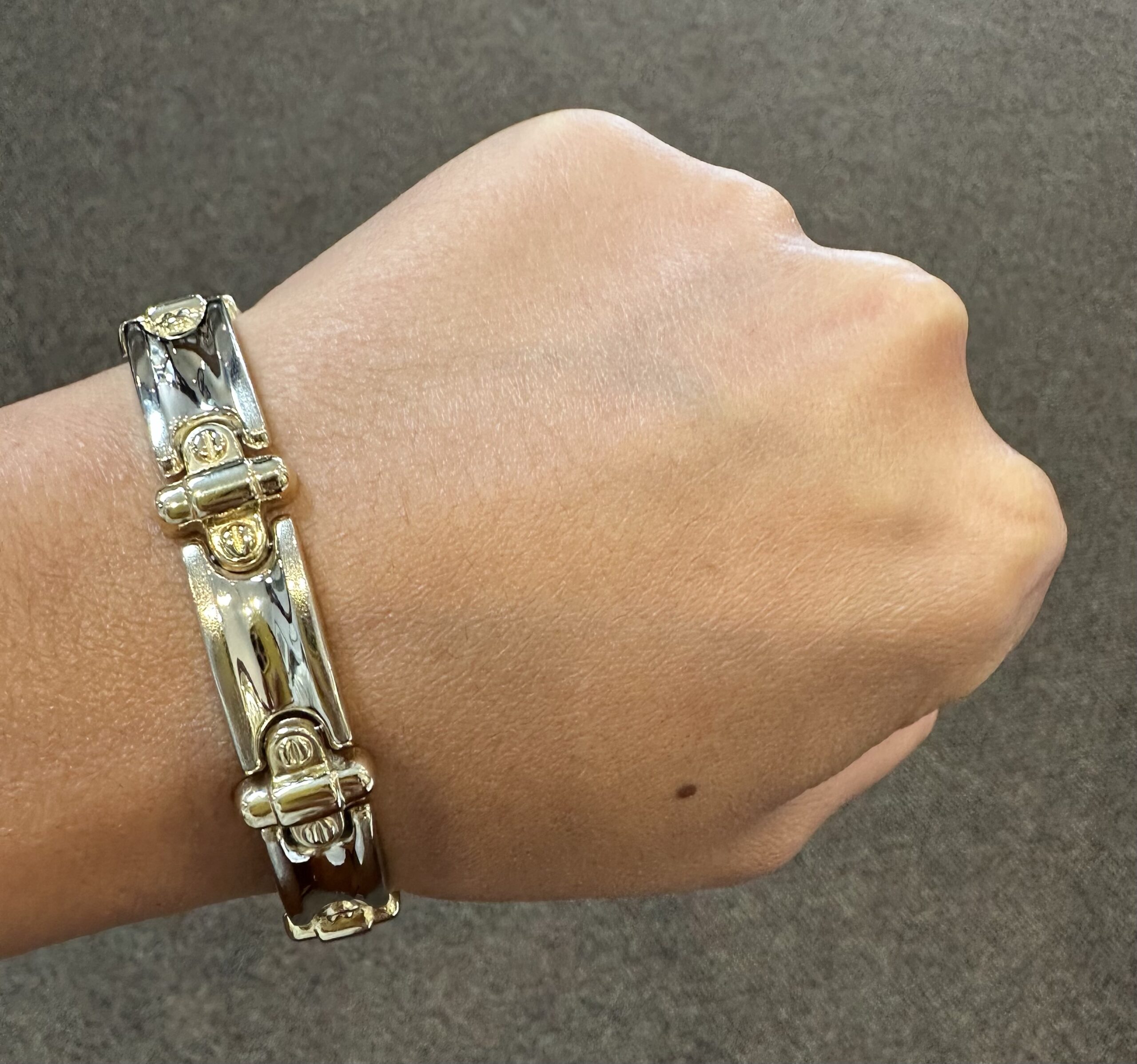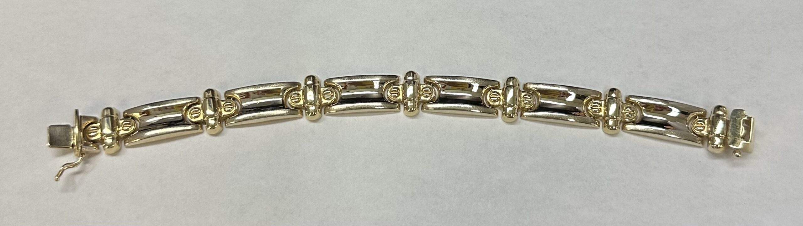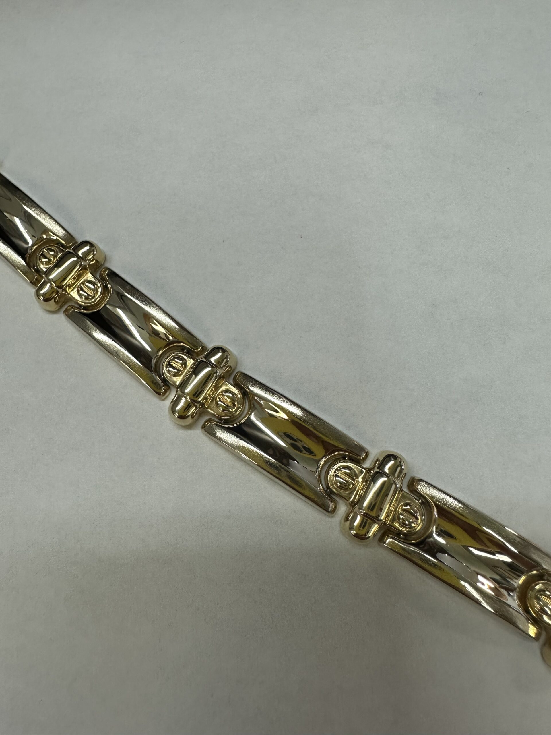 14k yellow gold rectangular link and rivet style bracelet. This bracelet measures 13 mm in width, 7 1/2” in length, and it has an entire weight of 20.5 grams.