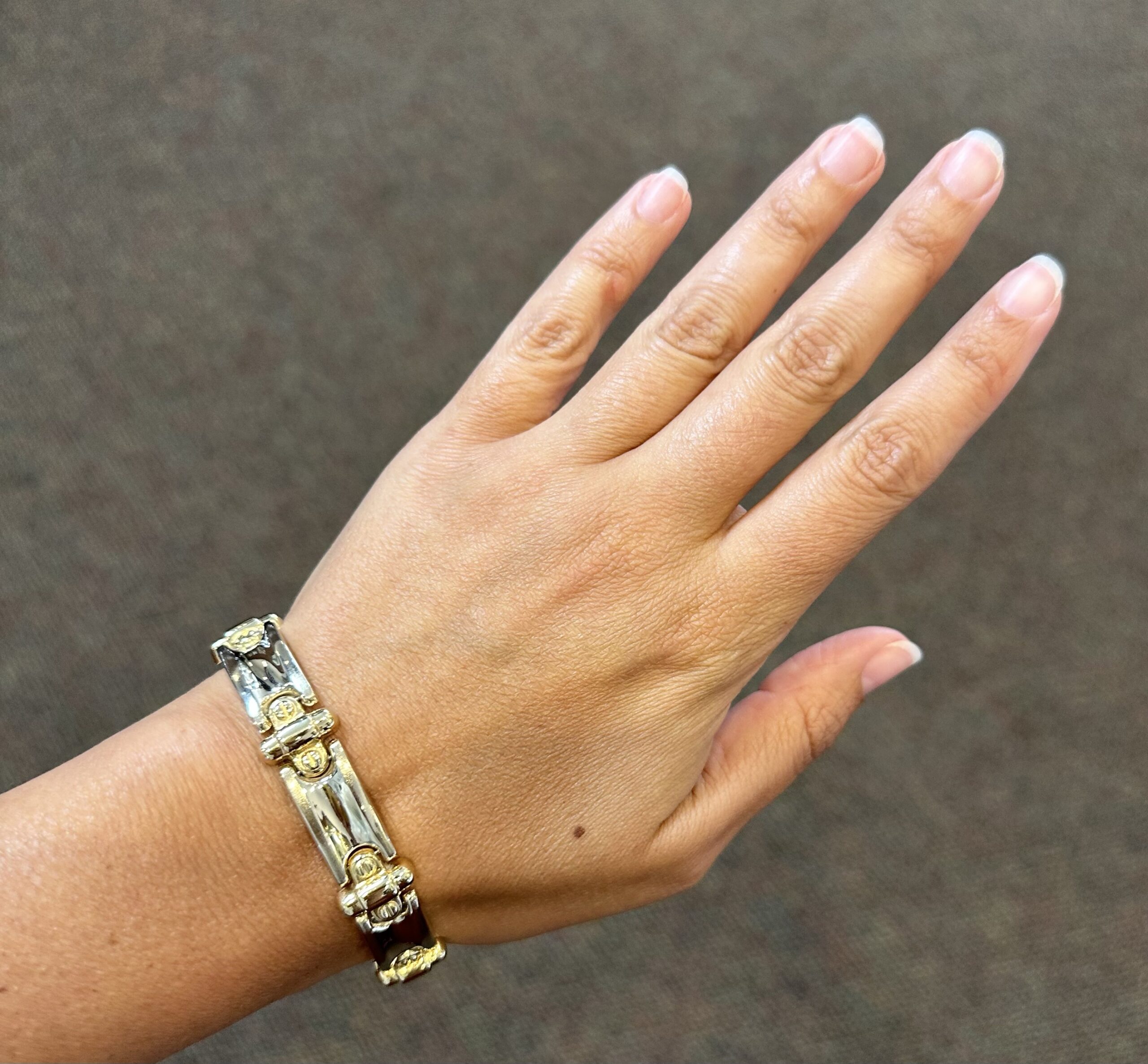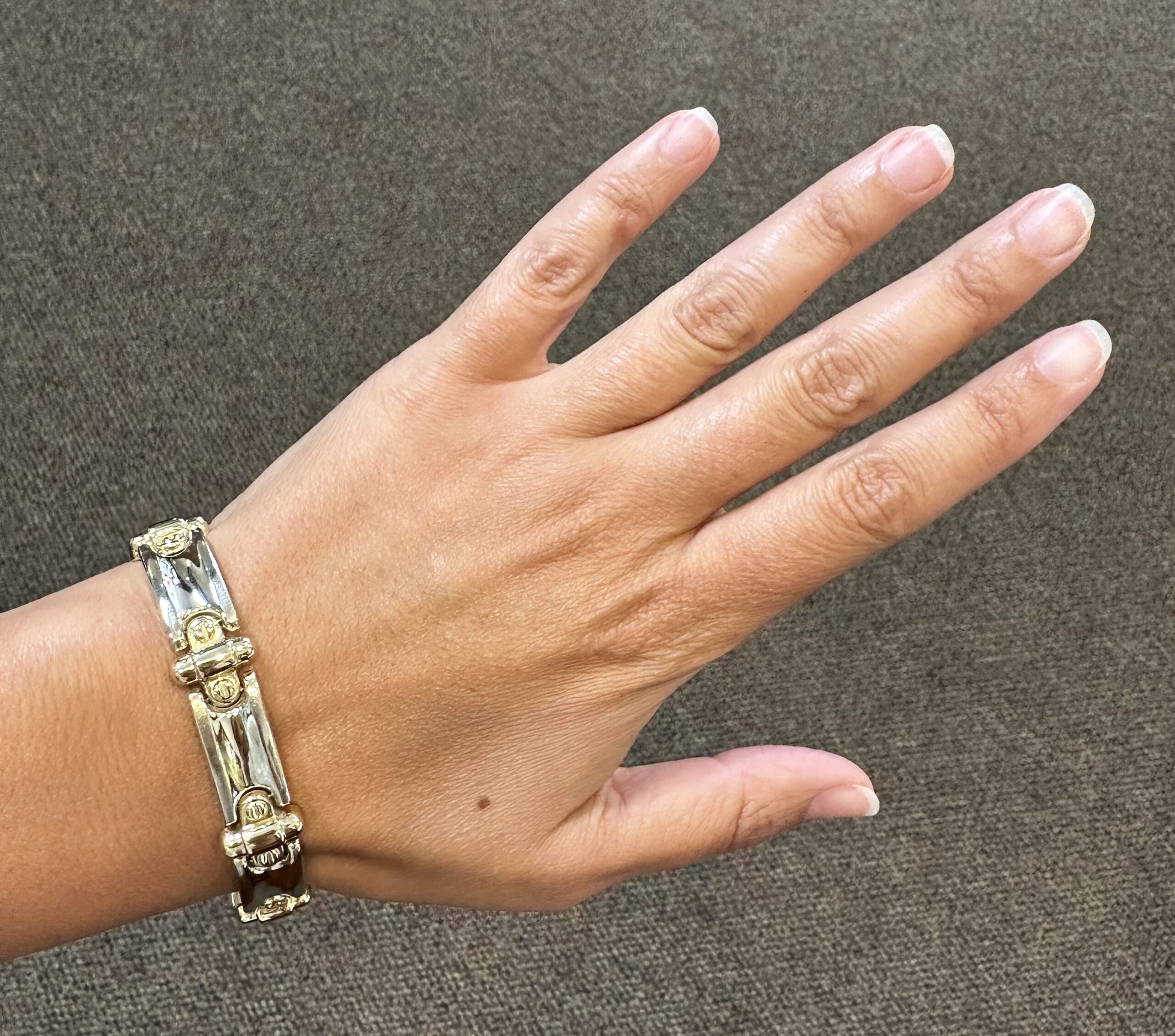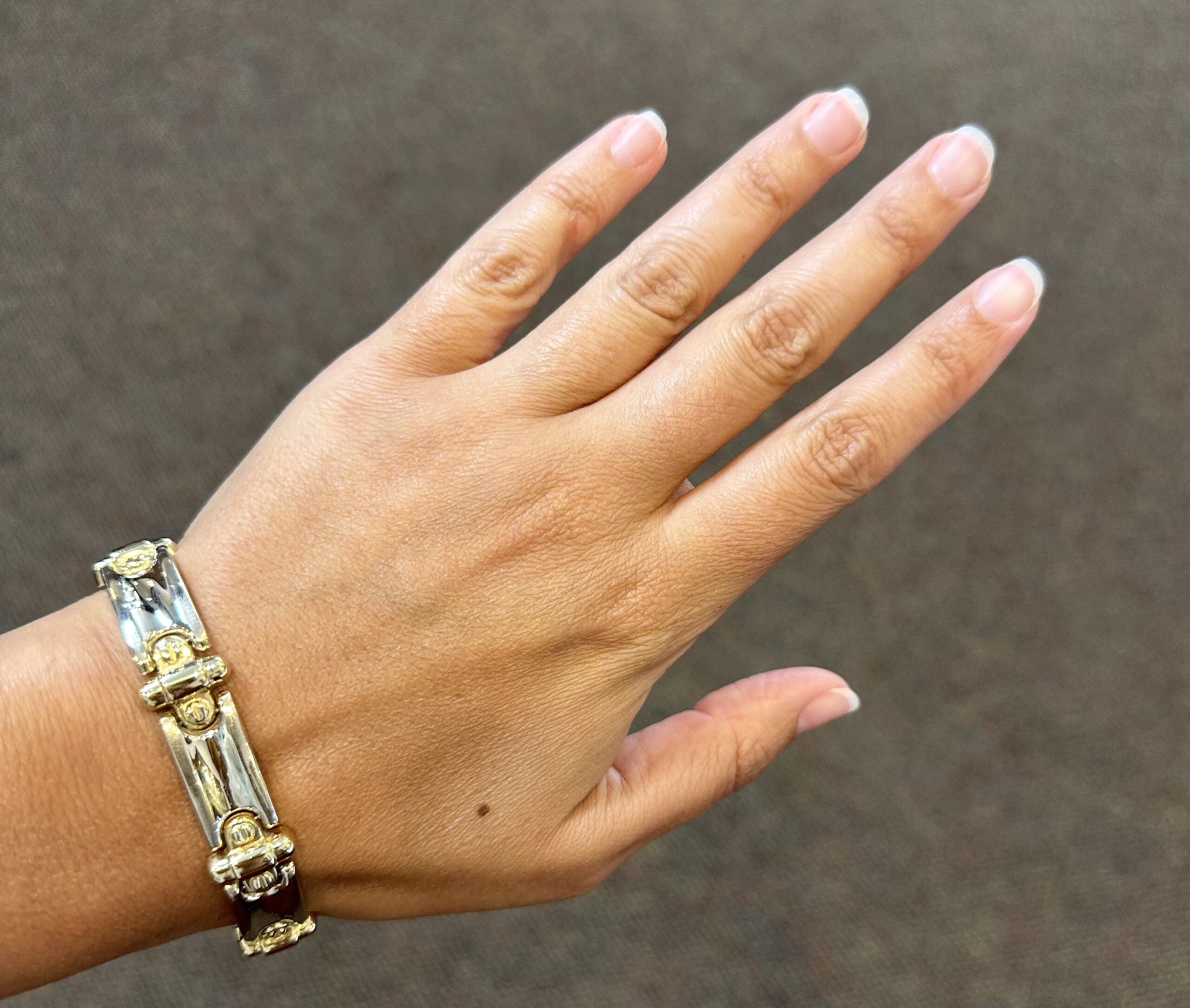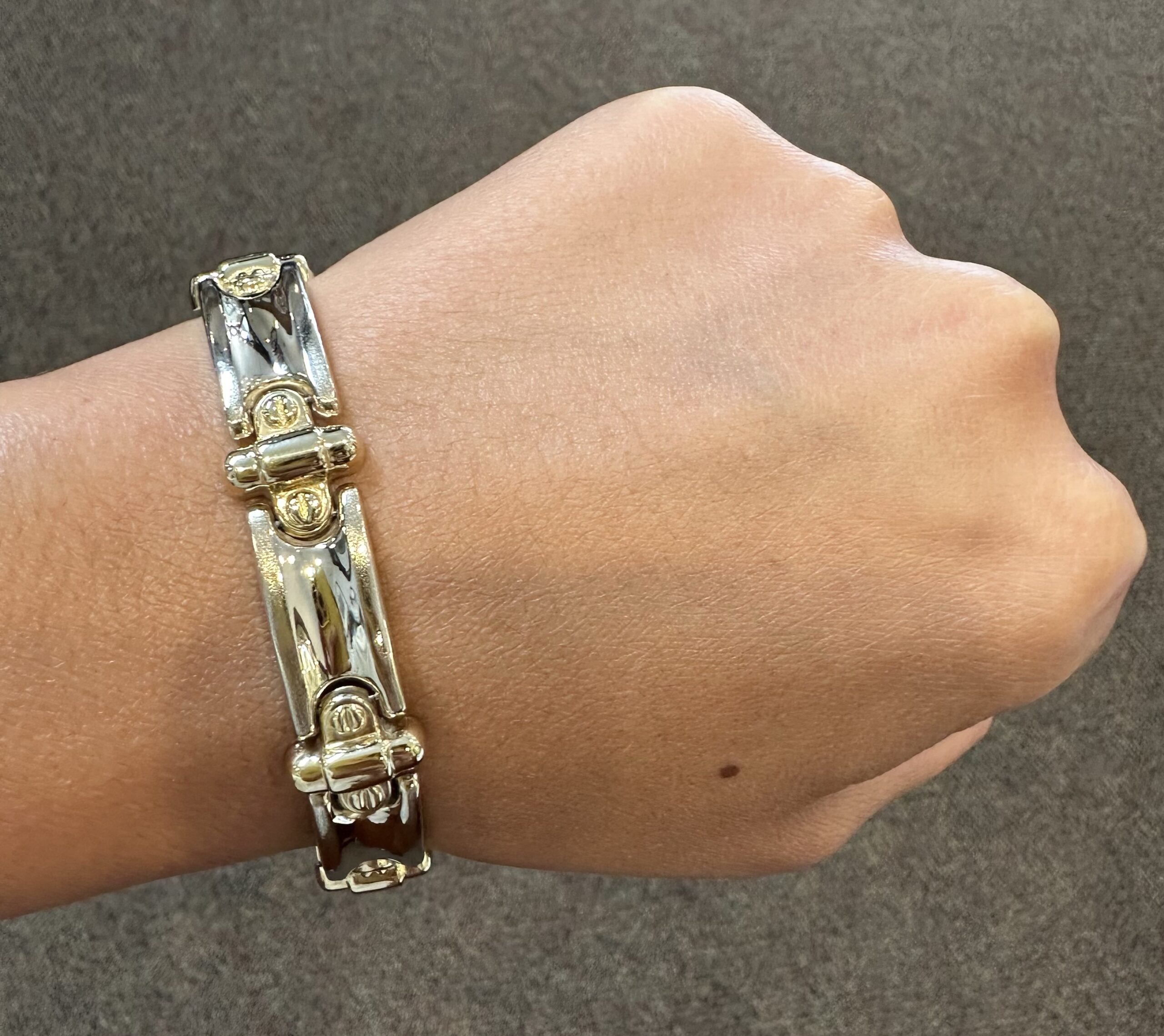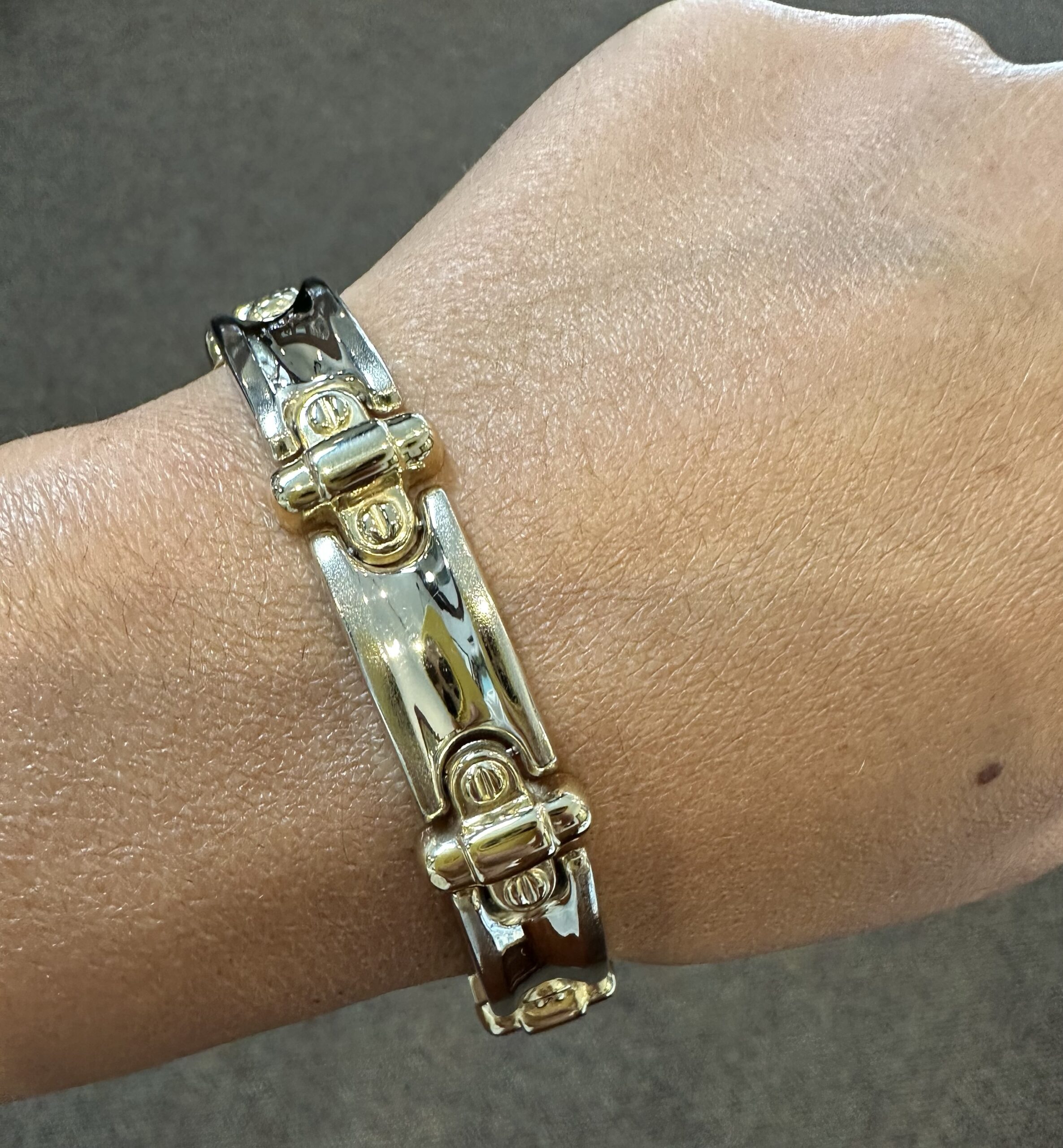 14k yellow gold rectangular link and rivet style bracelet. This bracelet measures 13 mm in width, 7 1/2” in length, and it has an entire weight of 20.5 grams.