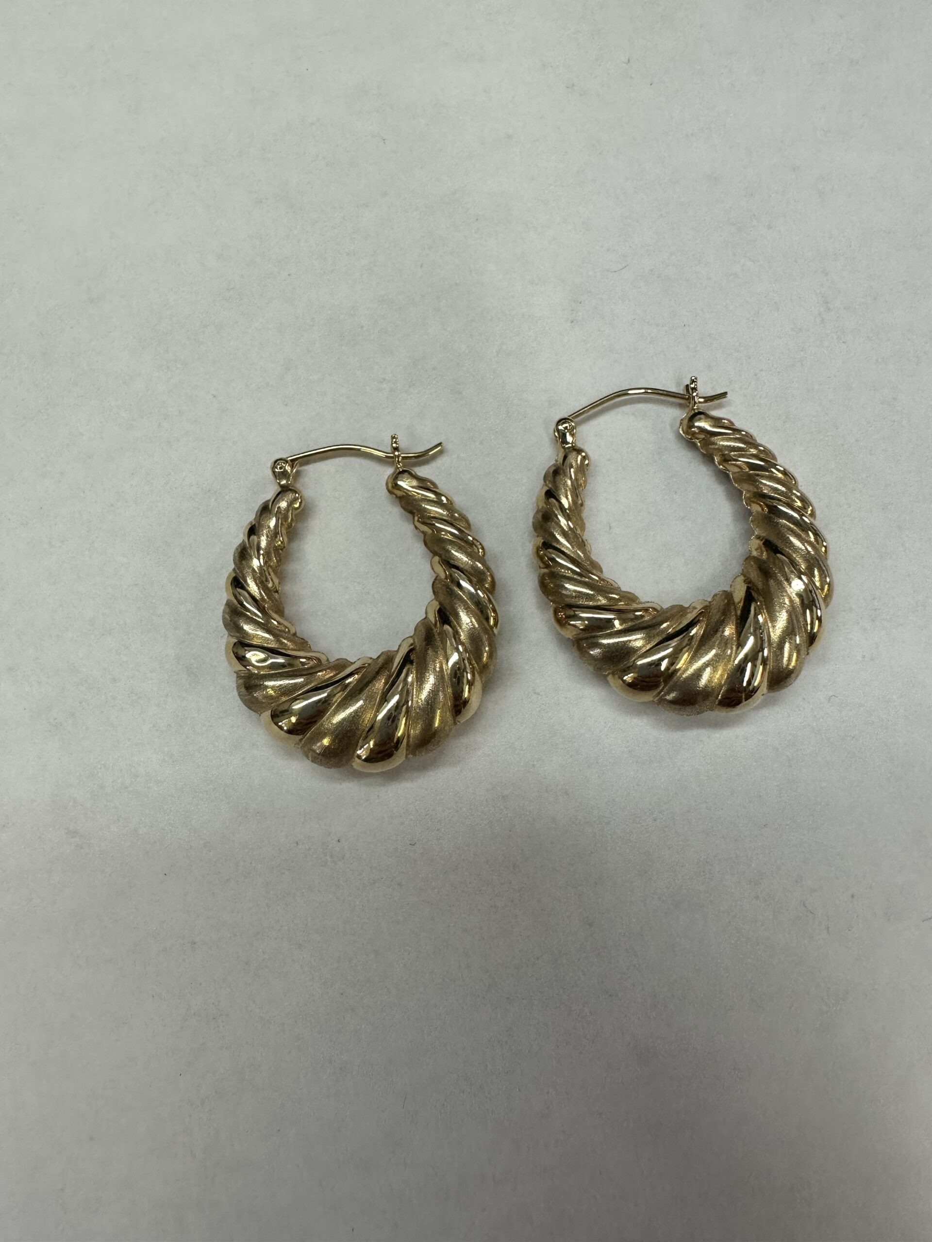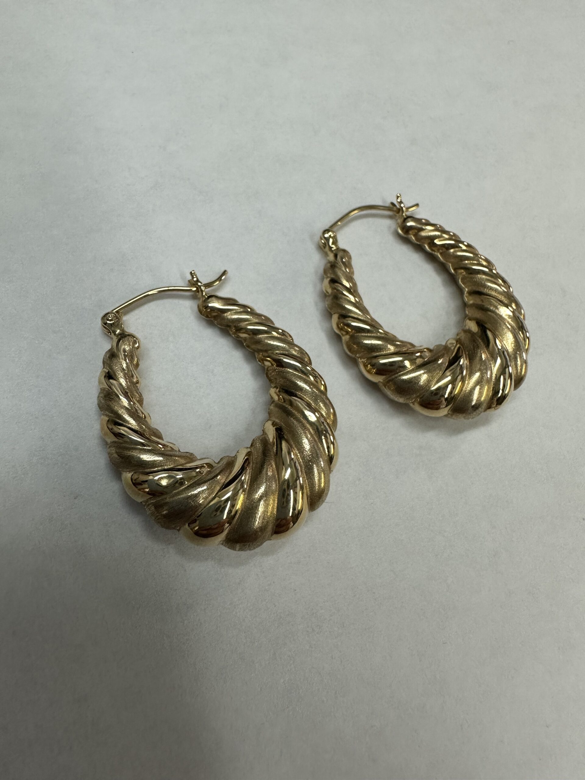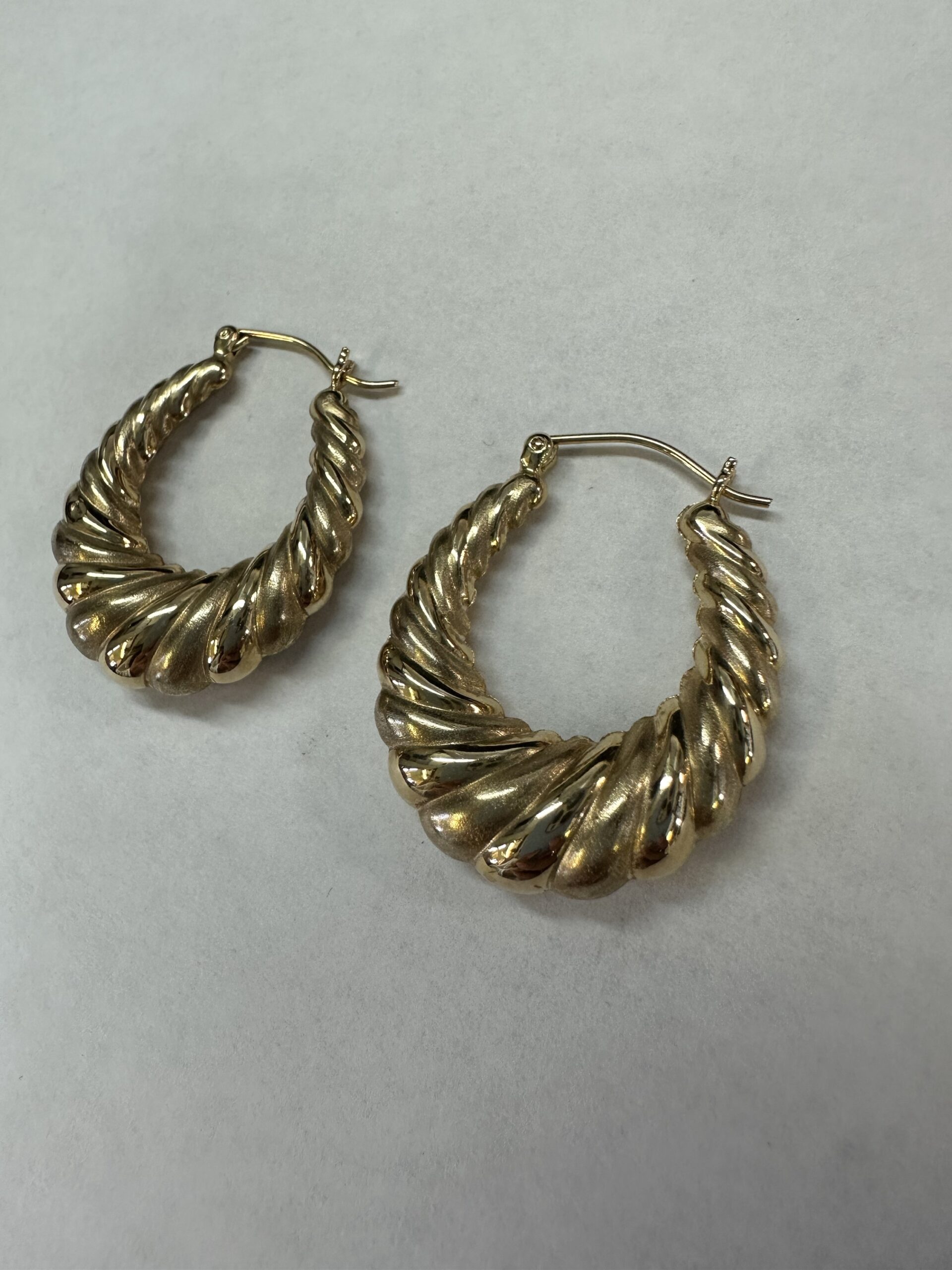14k yellow gold oval shaped Shrimp style hoop earrings. These earrings have an entire weight of 4.4 grams. These earrings measure 6 x 22.5 mm at the widest section.