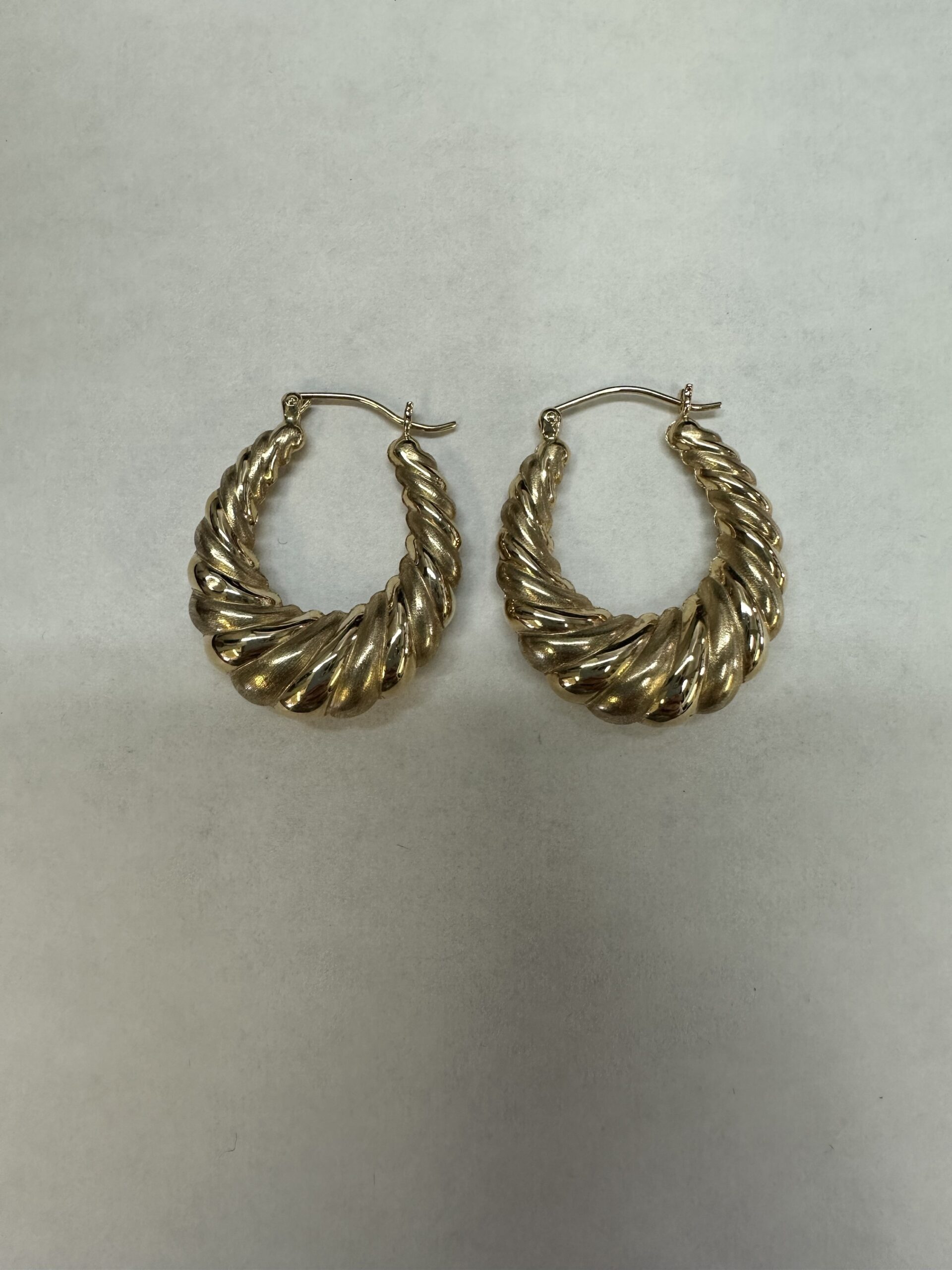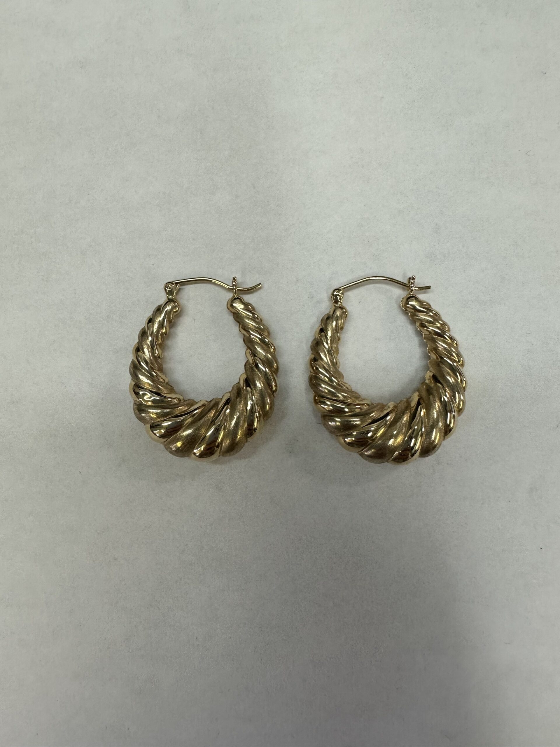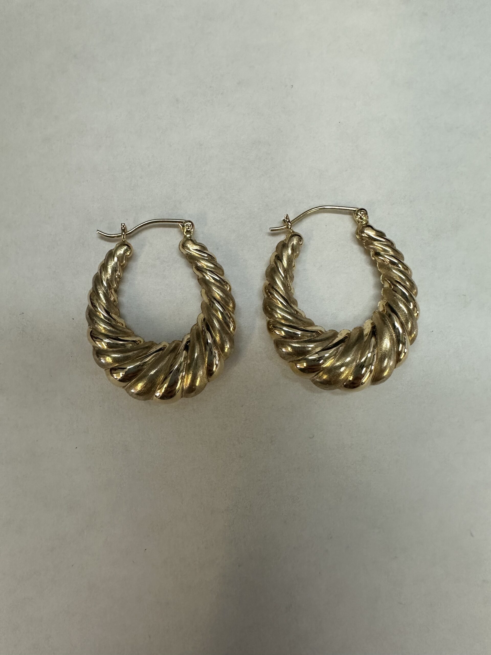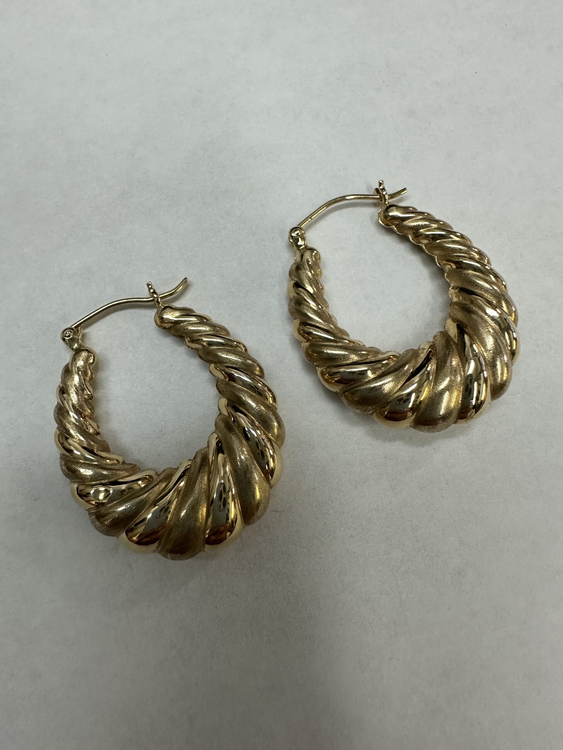 14k yellow gold oval shaped Shrimp style hoop earrings. These earrings have an entire weight of 4.4 grams. These earrings measure 6 x 22.5 mm at the widest section.