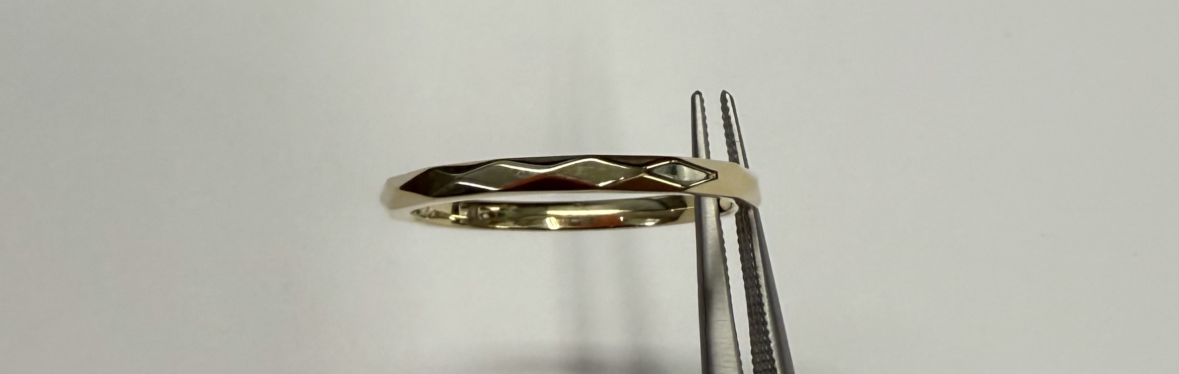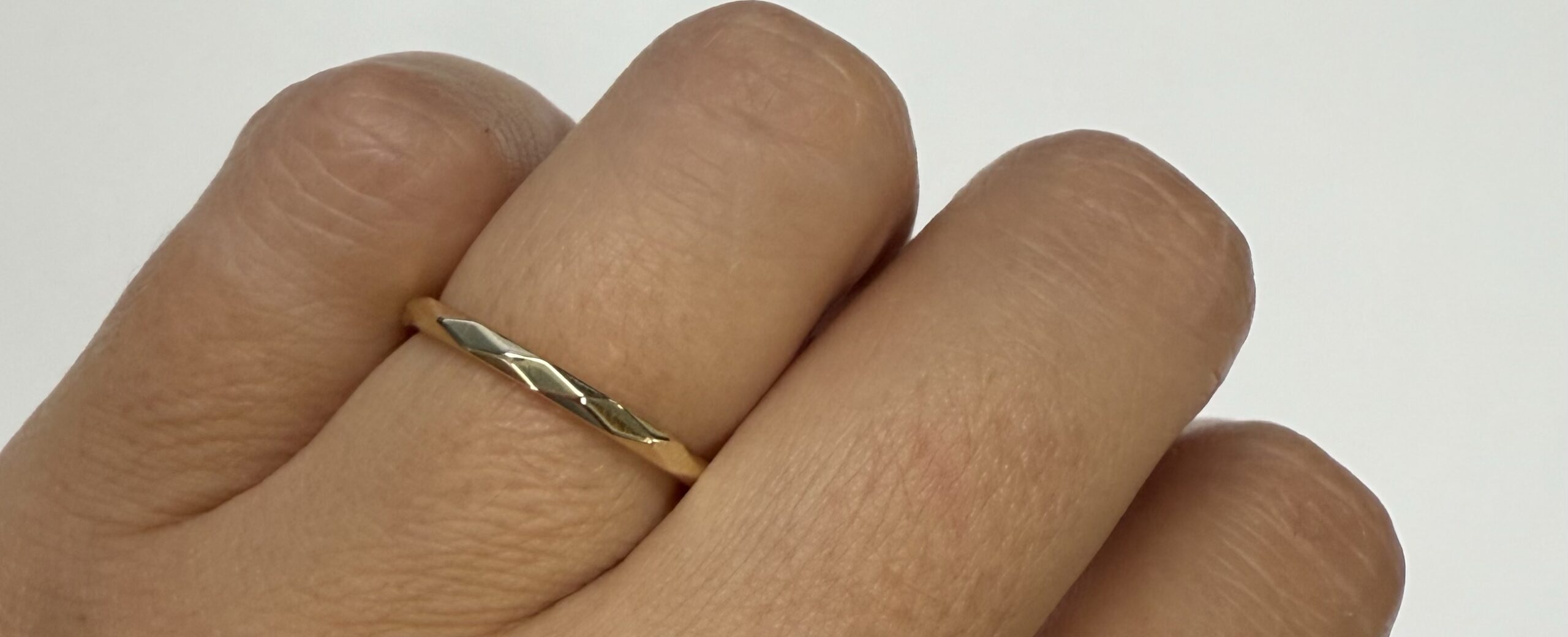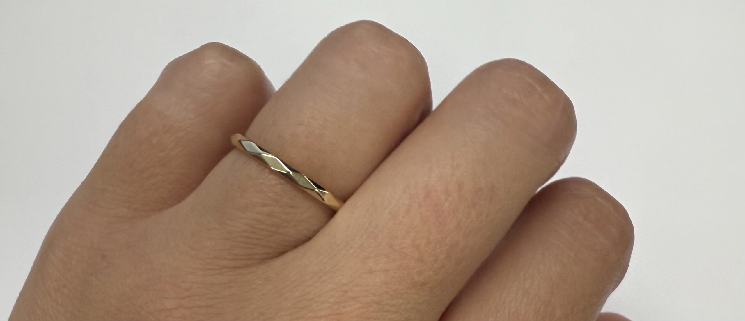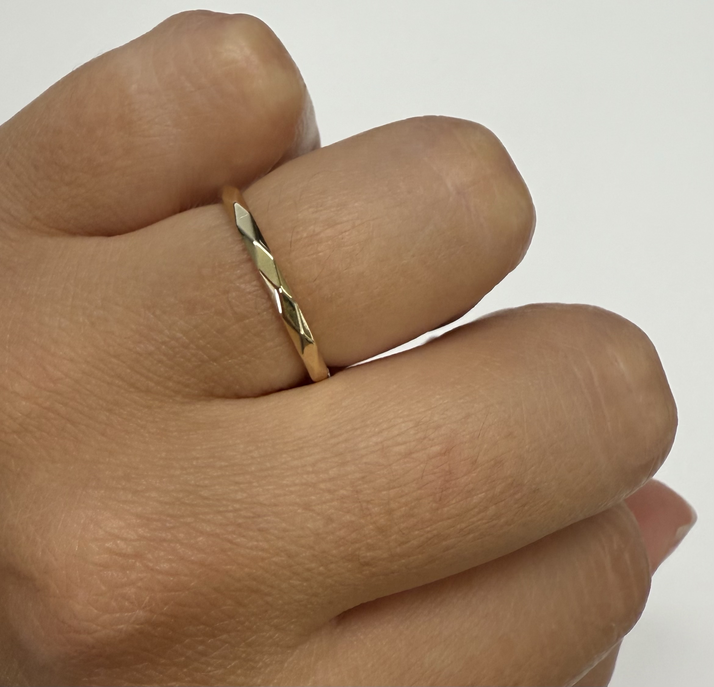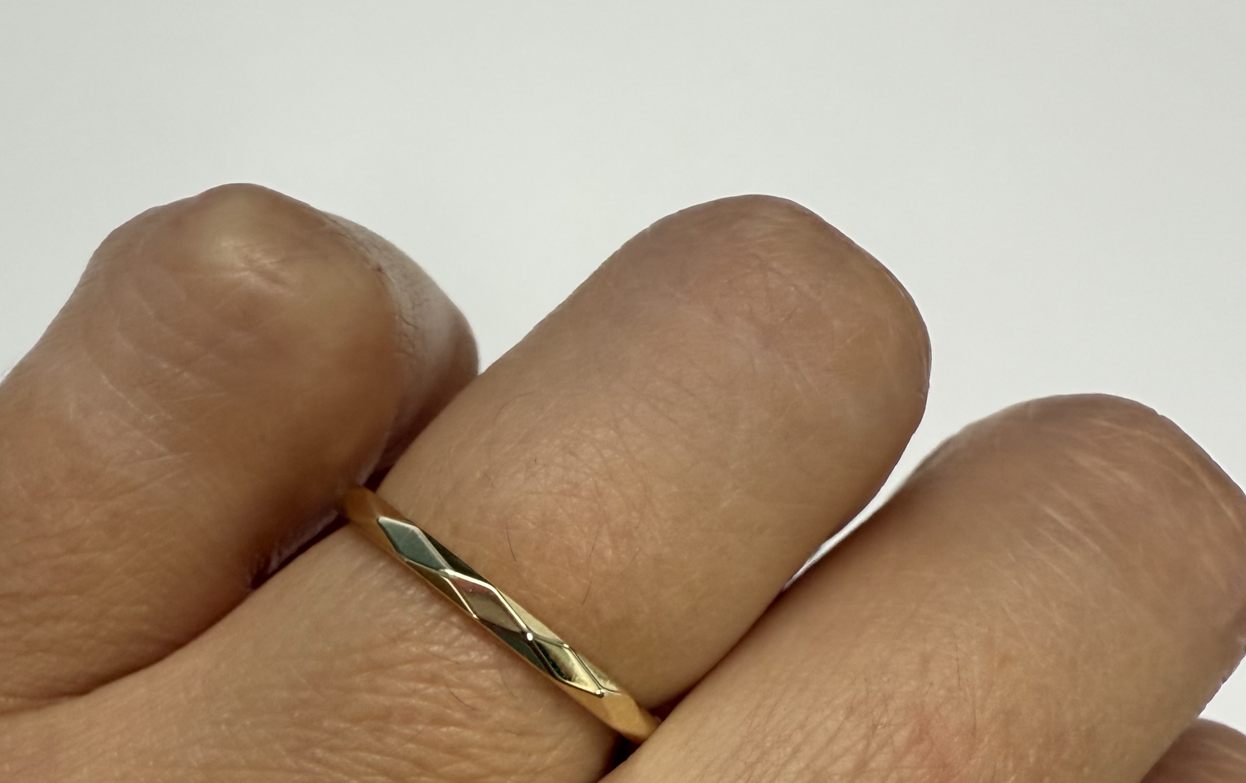 14k yellow gold 1.83 mm textured band. This band is a finger size 6 1/2, but it can be reasonably sized. Please make note of the finger size desired in the comments section at checkout. This band has an entire weight of 1.8 grams.