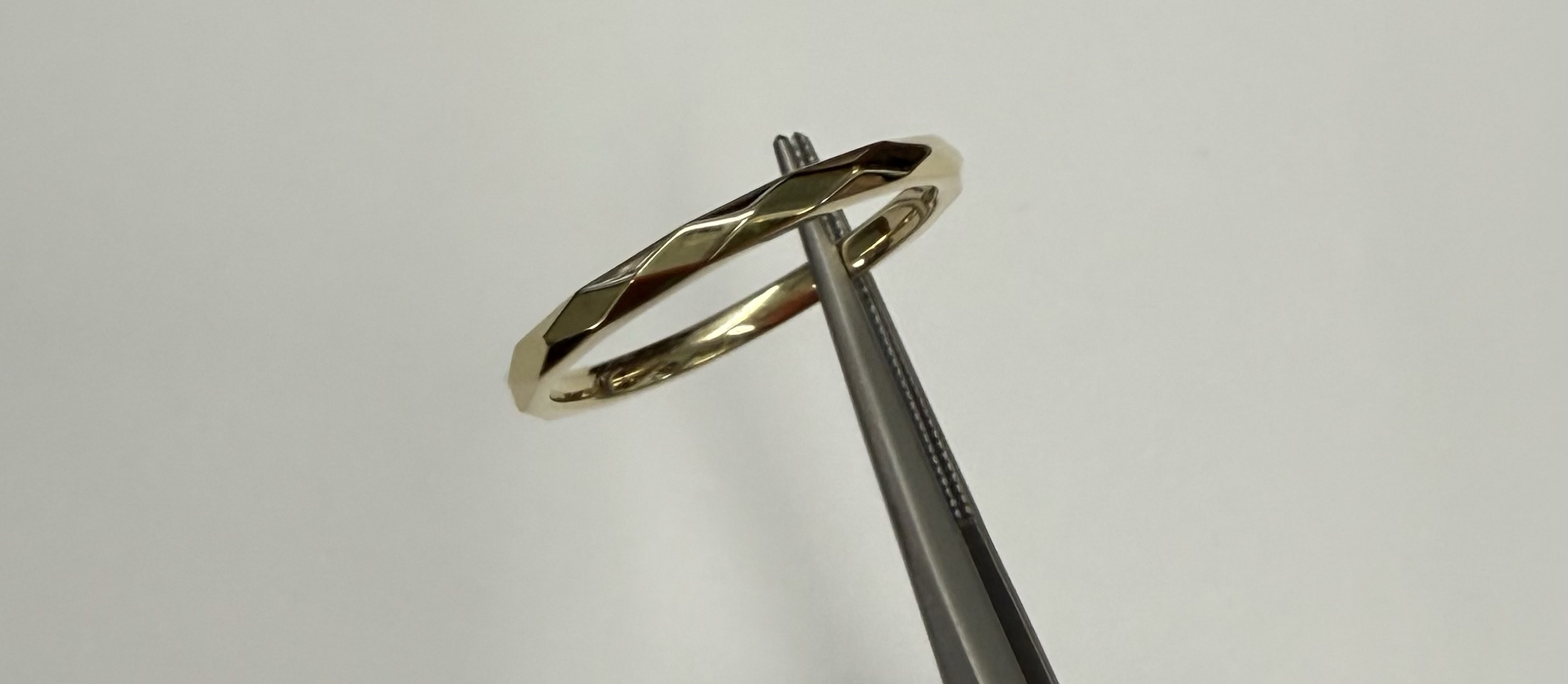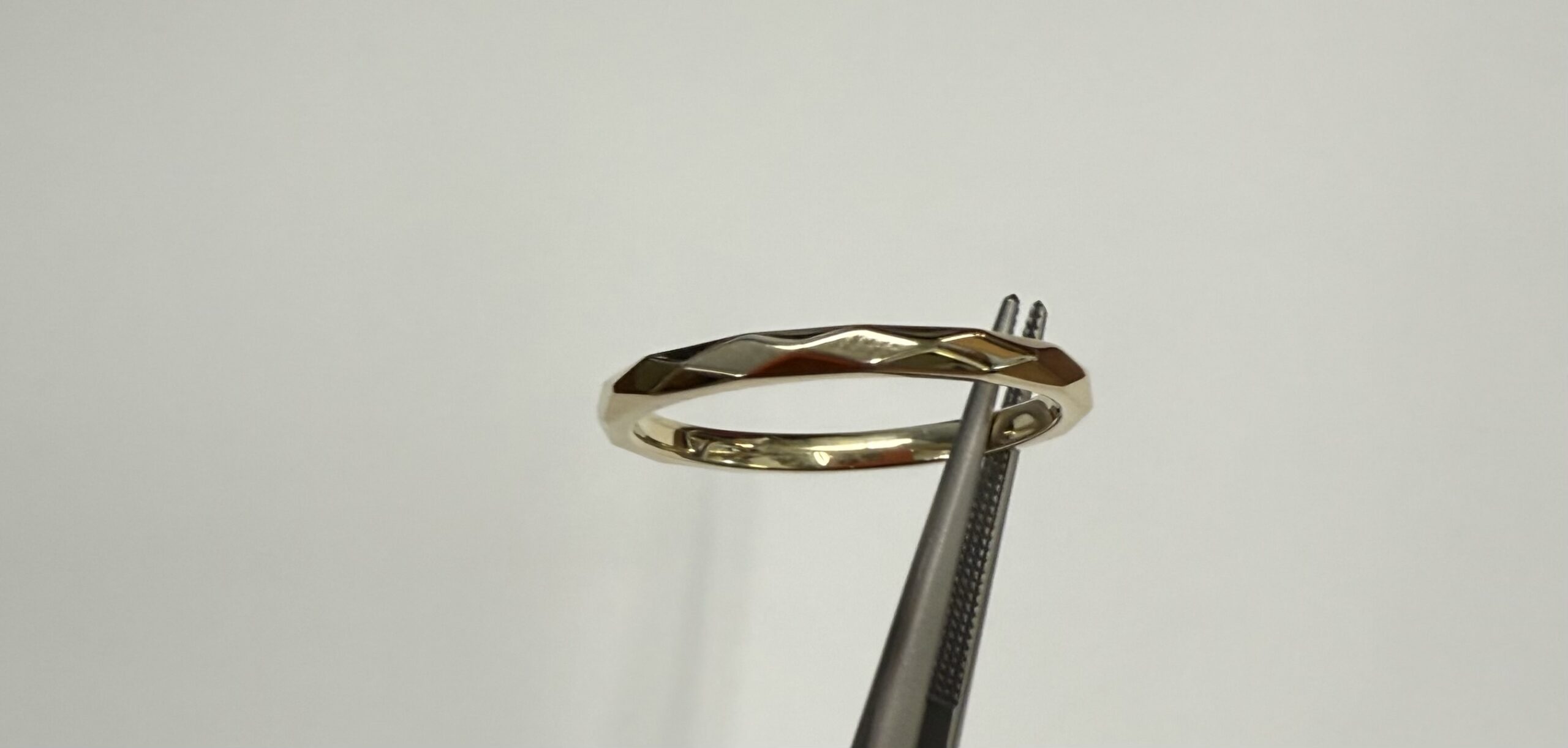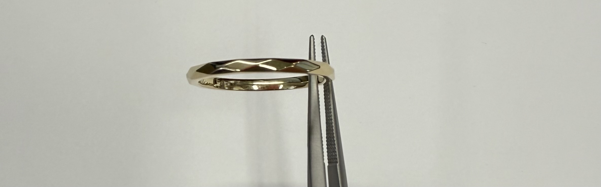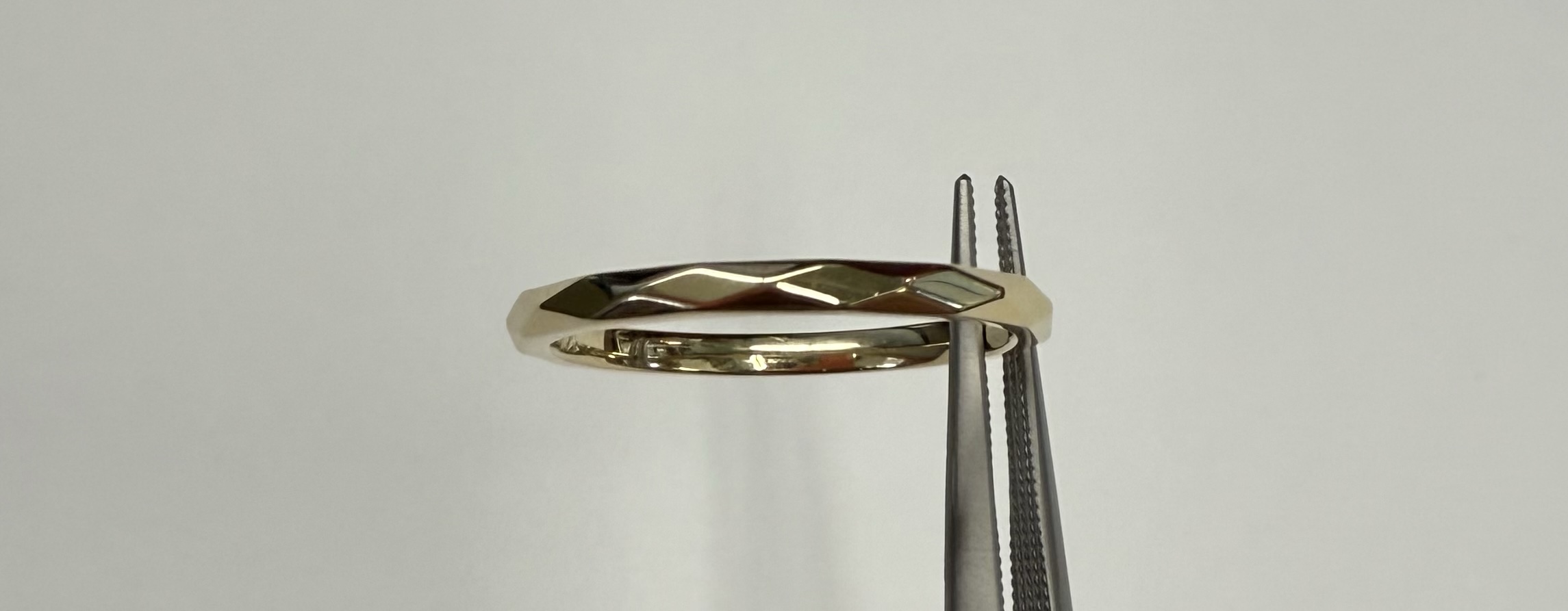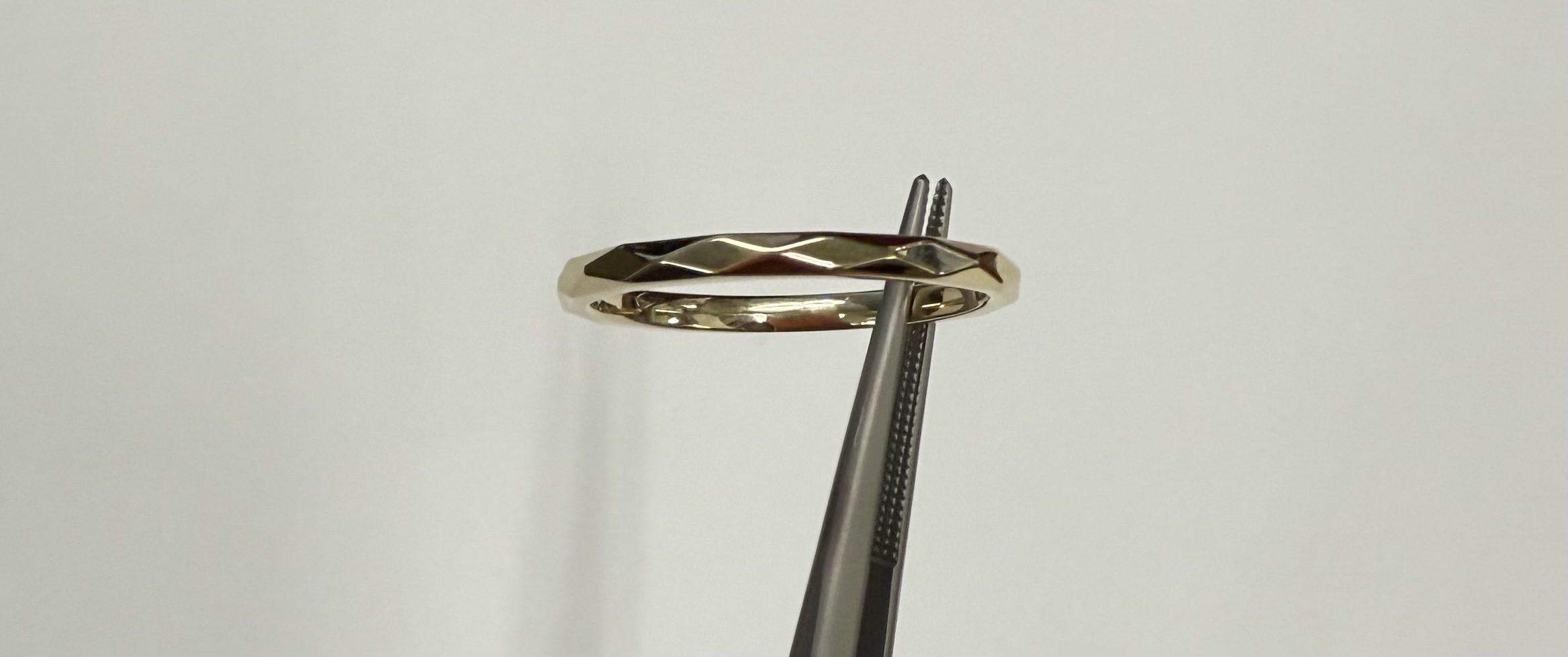 14k yellow gold 1.83 mm textured band. This band is a finger size 6 1/2, but it can be reasonably sized. Please make note of the finger size desired in the comments section at checkout. This band has an entire weight of 1.8 grams.