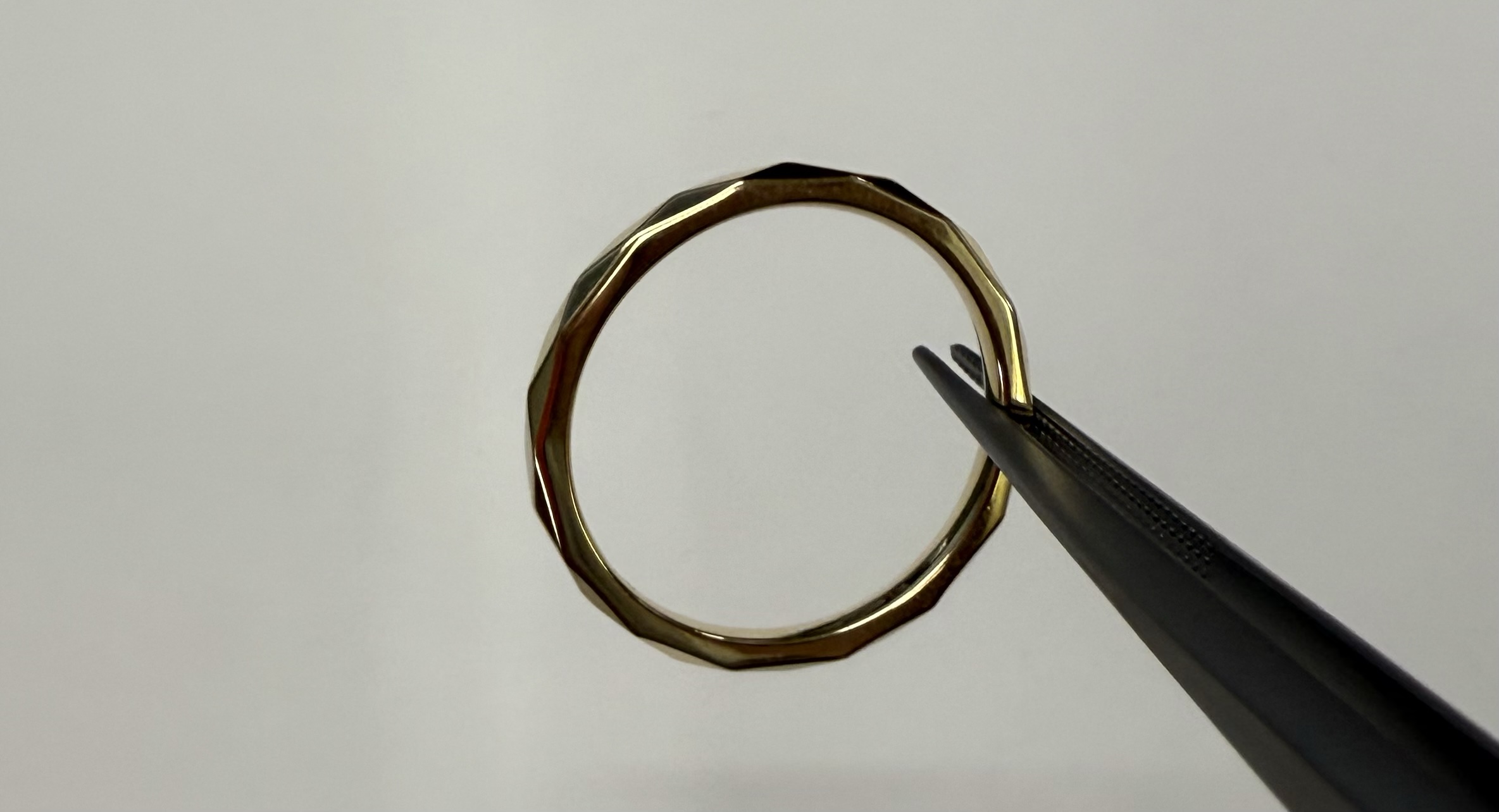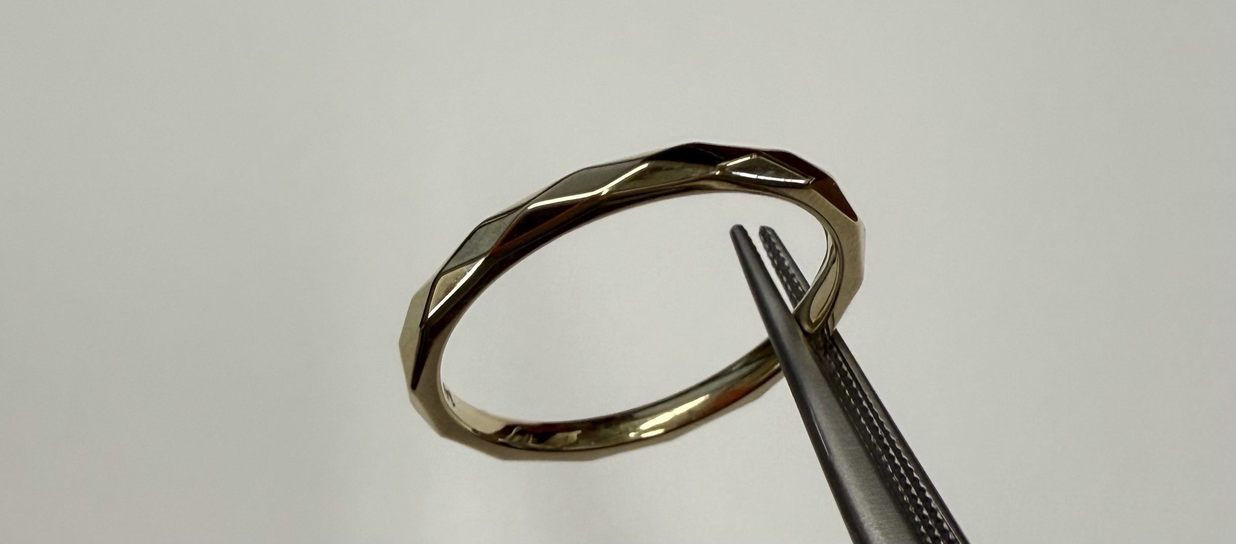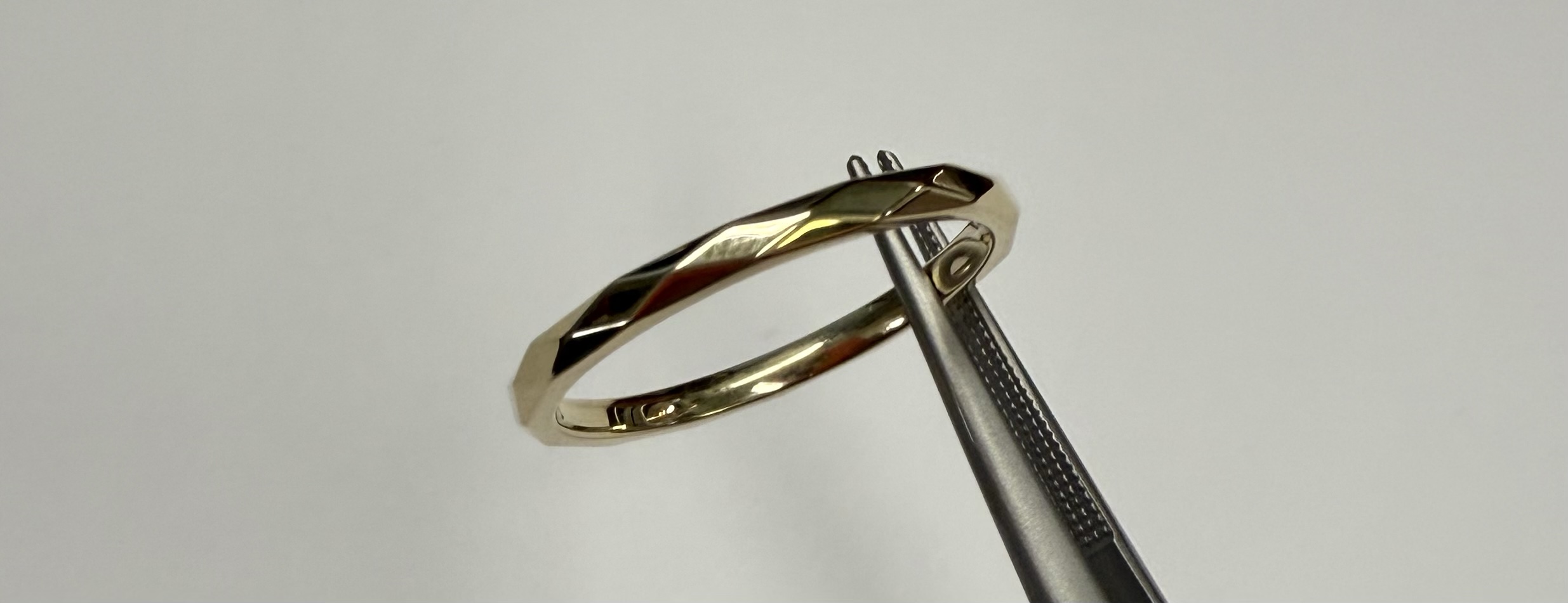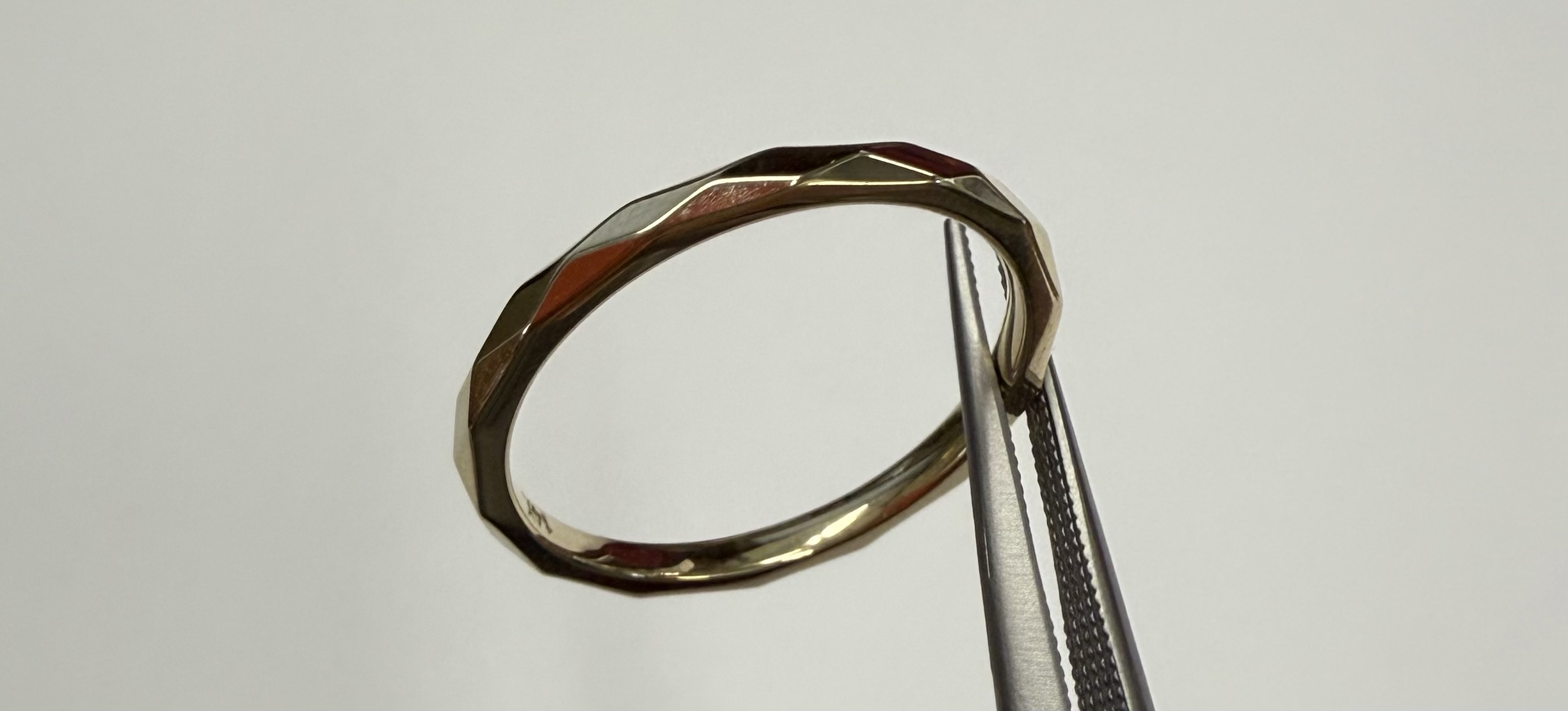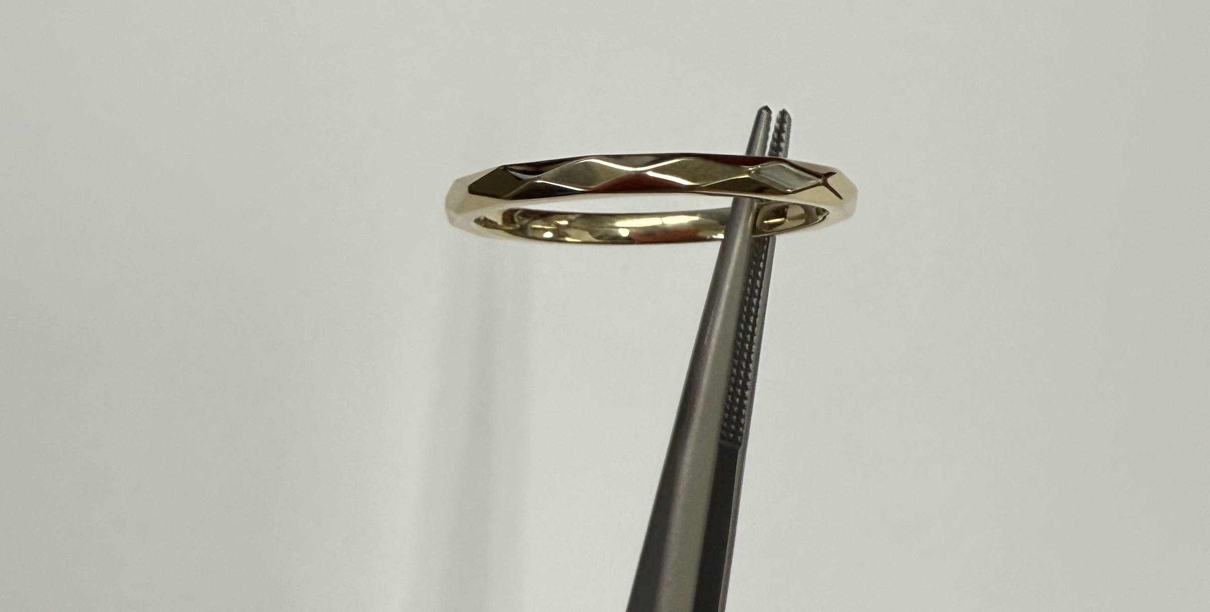 14k yellow gold 1.83 mm textured band. This band is a finger size 6 1/2, but it can be reasonably sized. Please make note of the finger size desired in the comments section at checkout. This band has an entire weight of 1.8 grams.