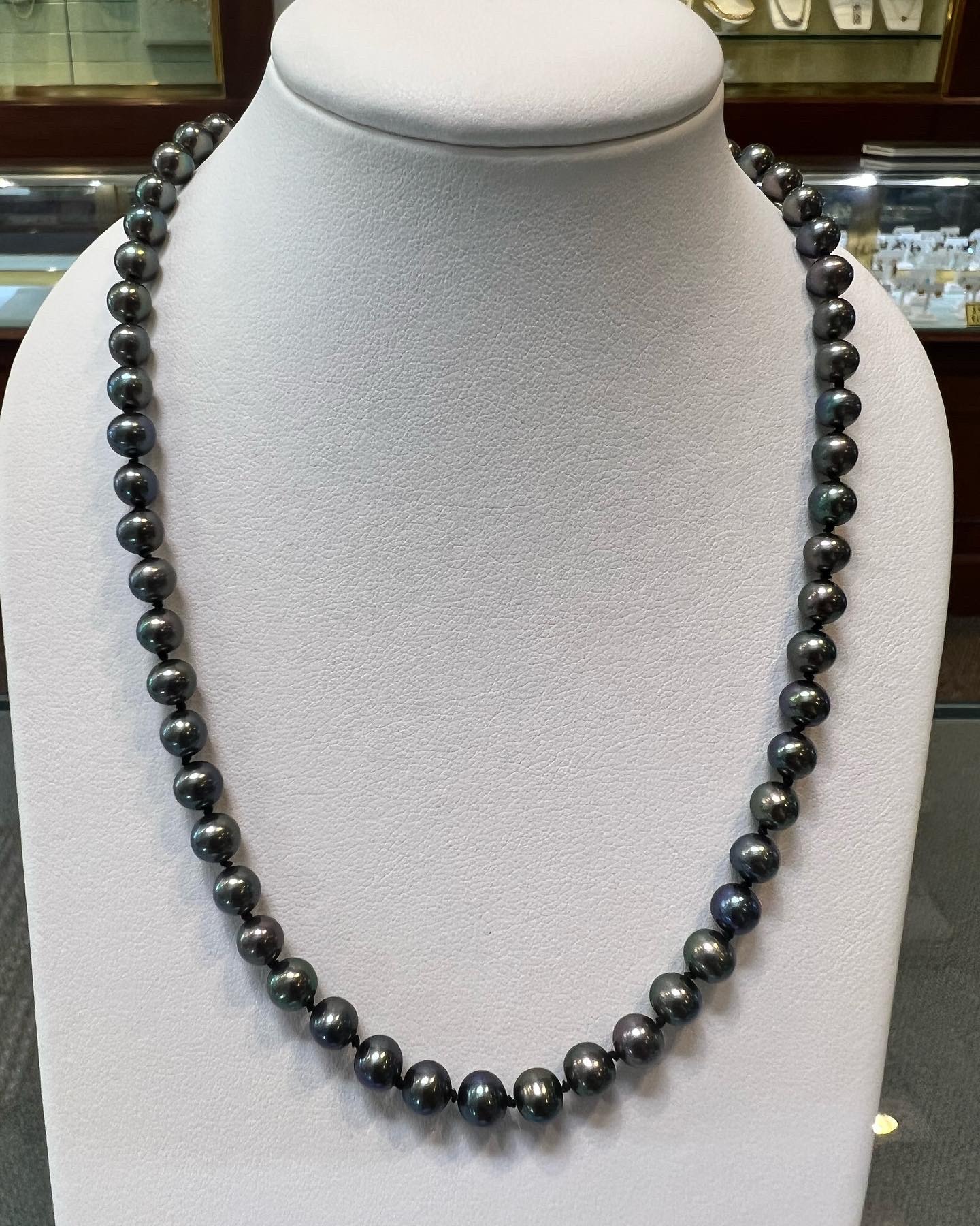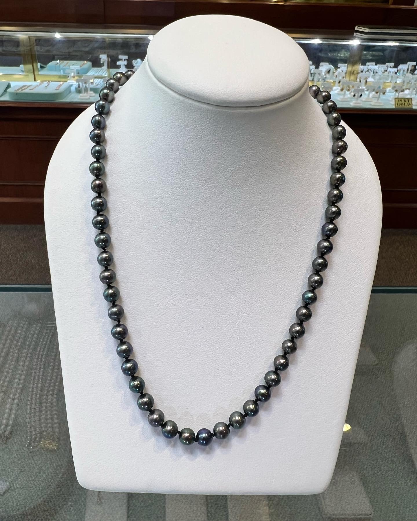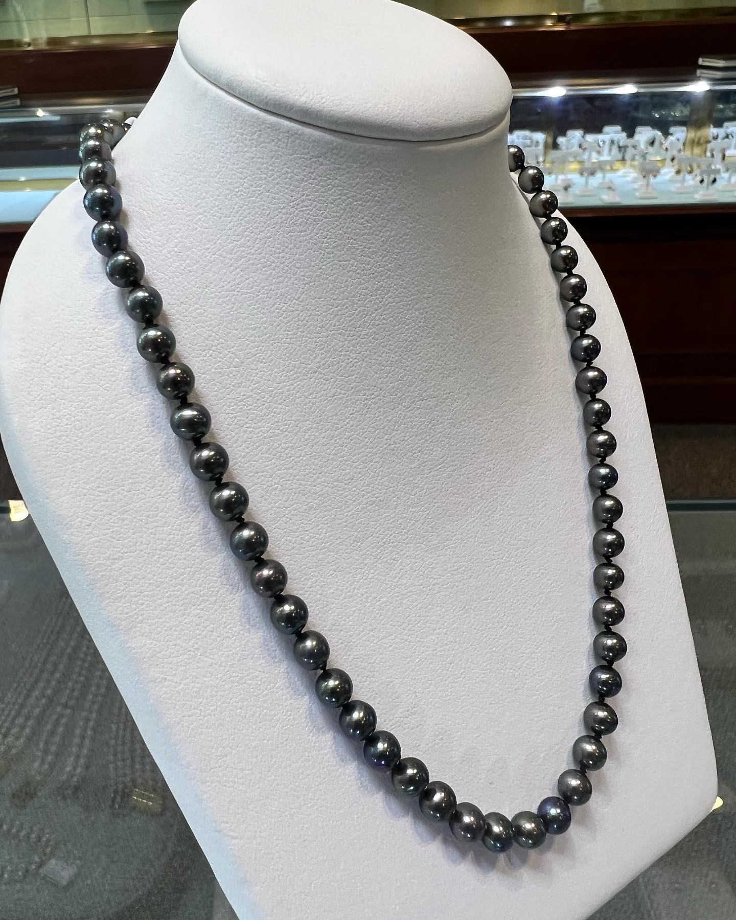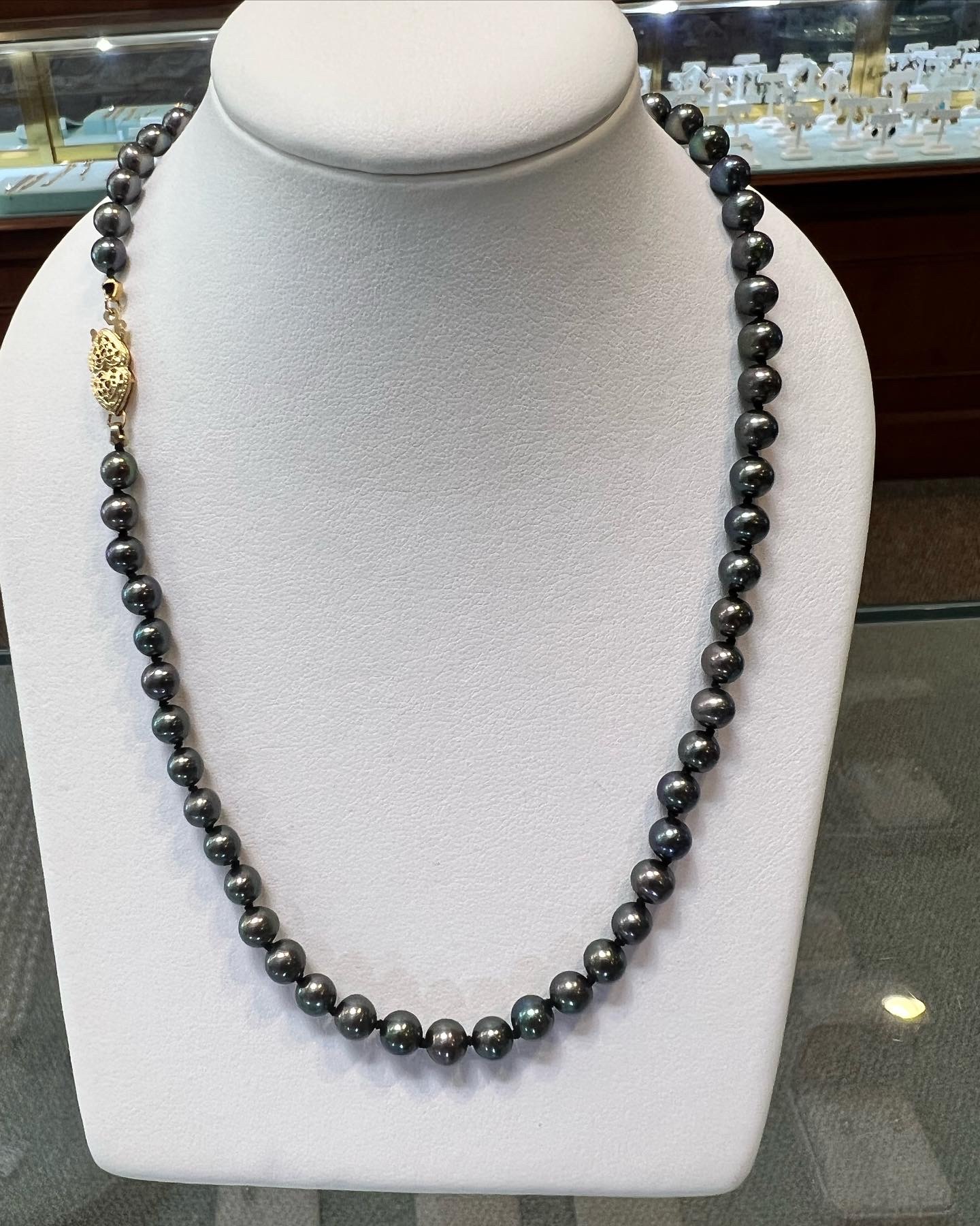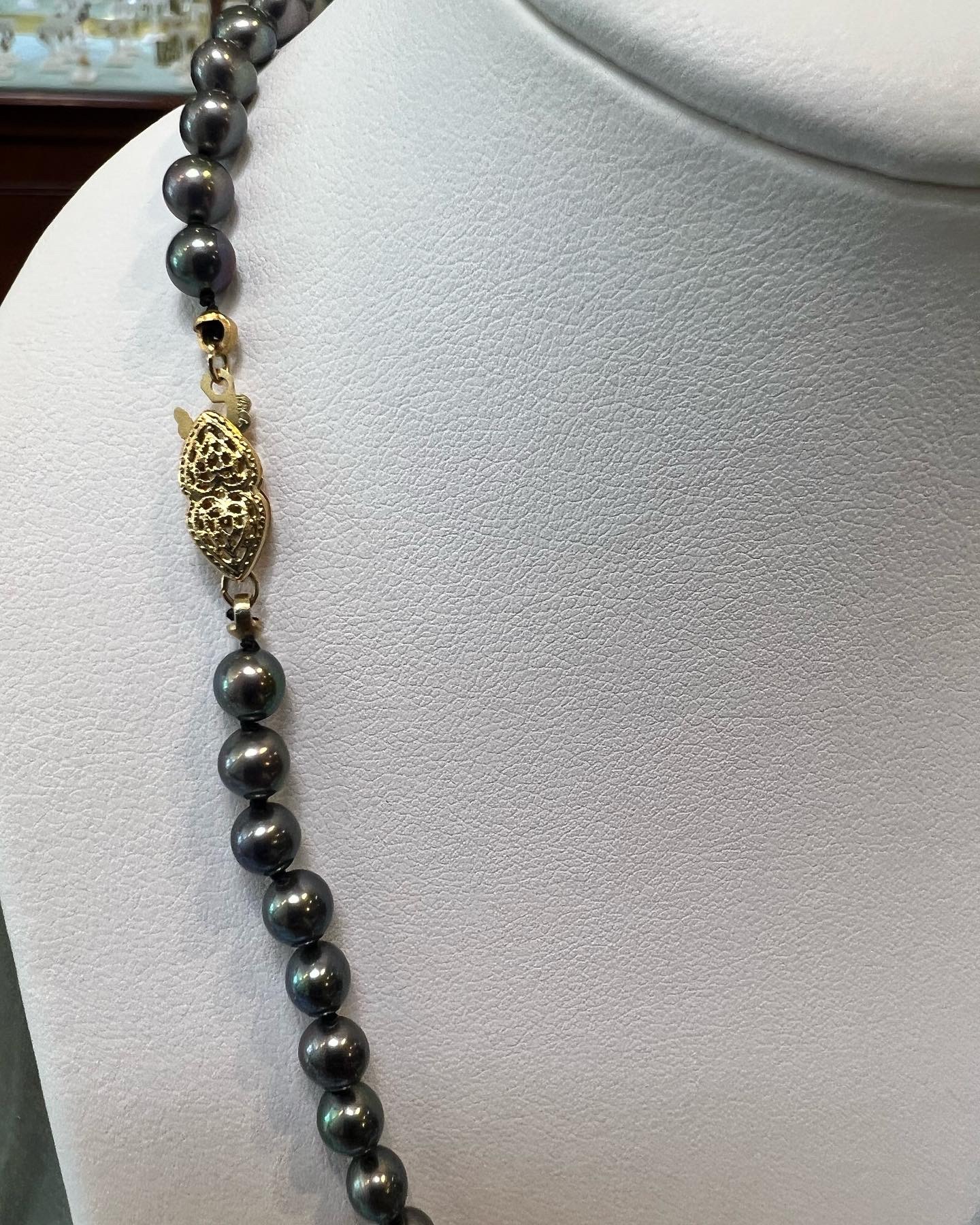 An 18″ knotted strand of 5 mm black cultured pearls, terminated by the sweetest 14k yellow gold double heart filigree clasp. This strand has an entire weight of 16.5 grams. Only one strand like that available!