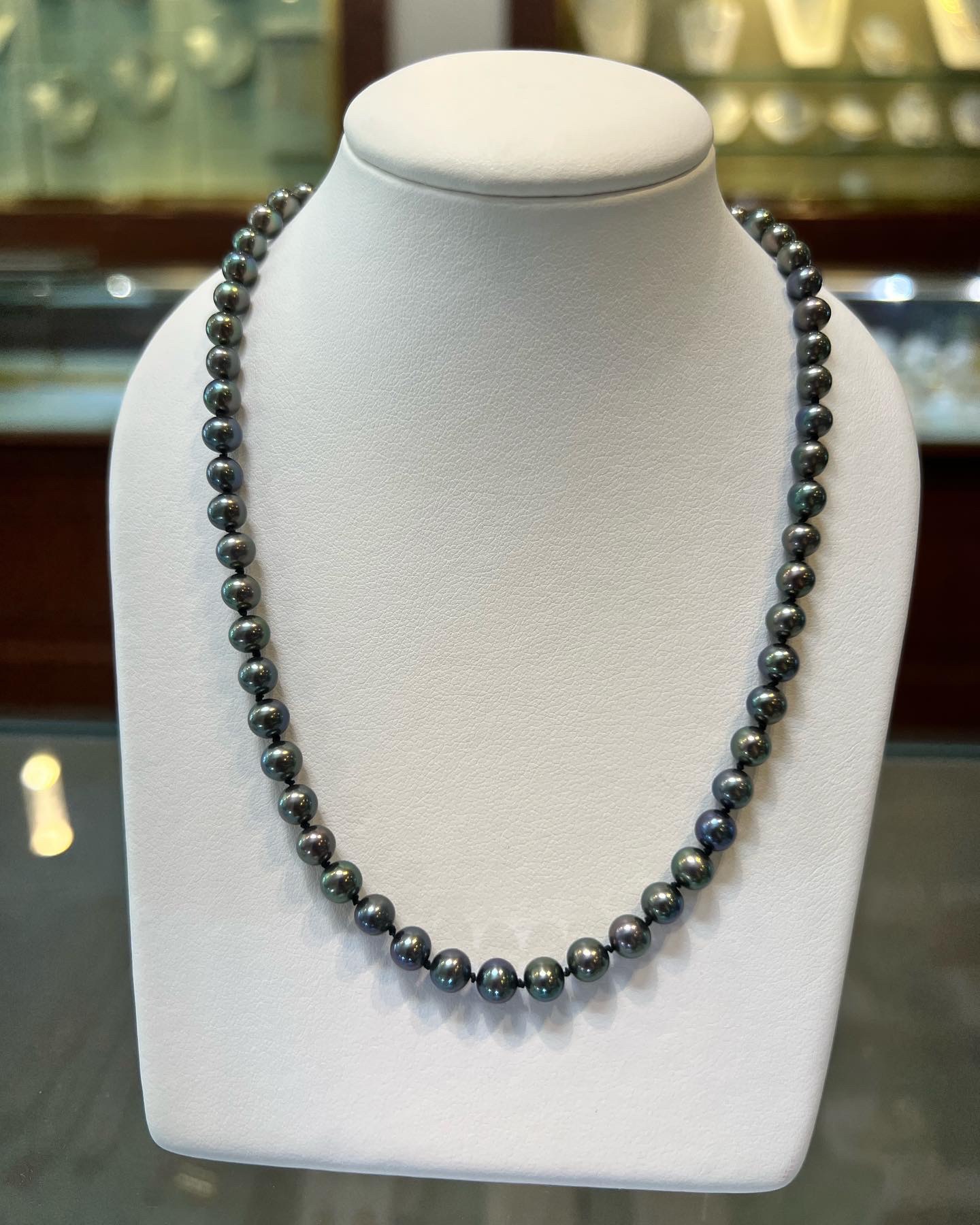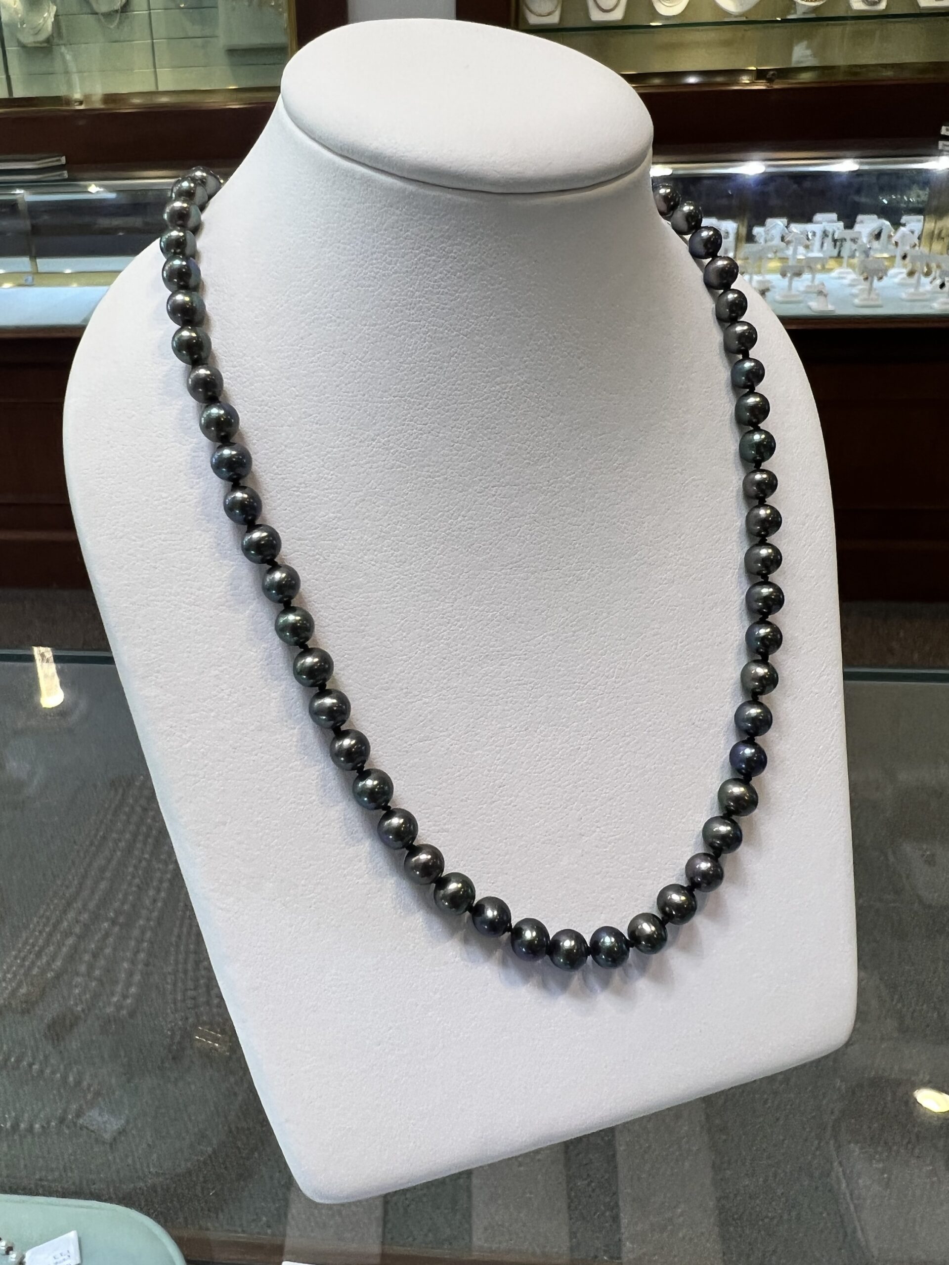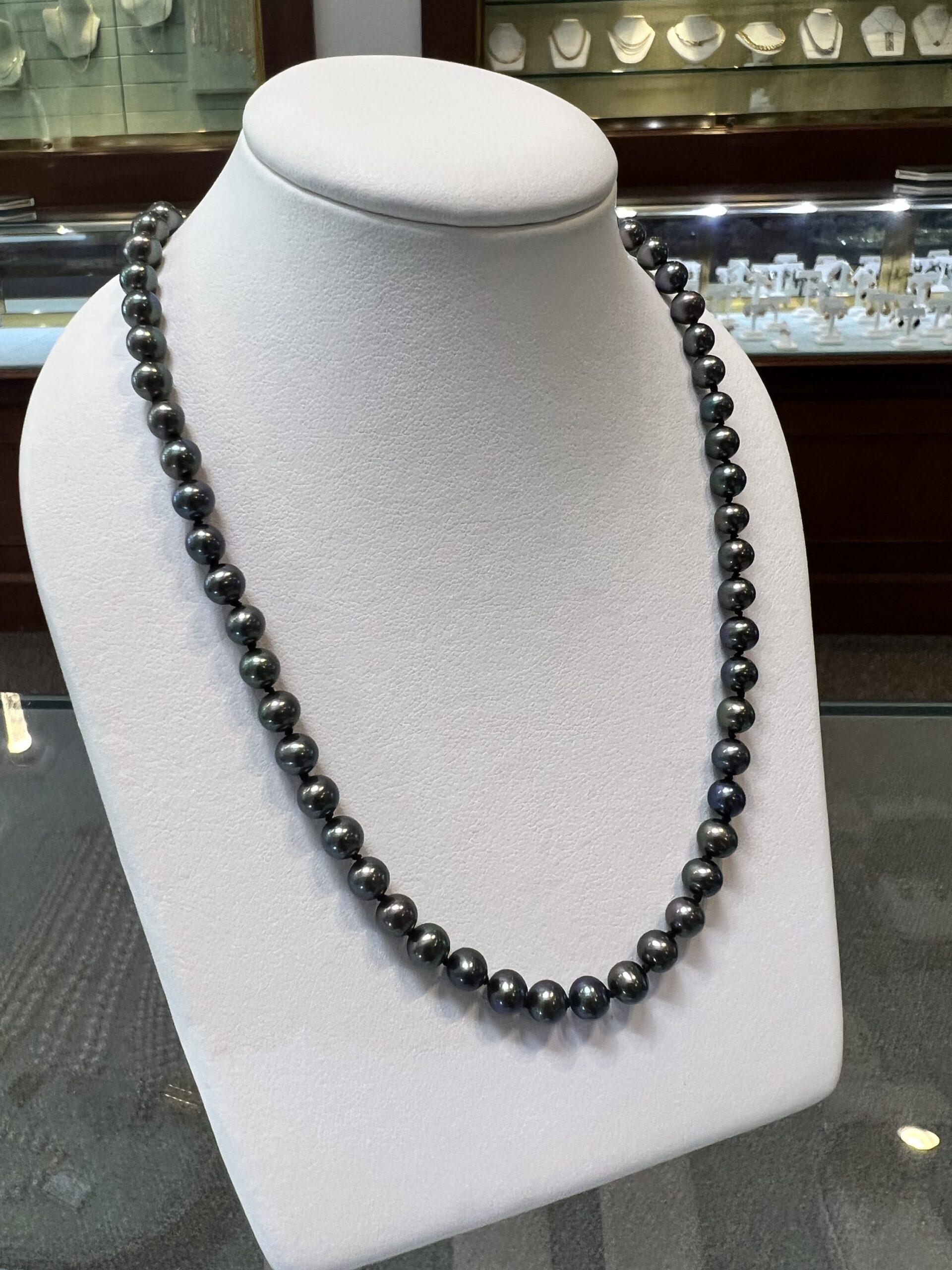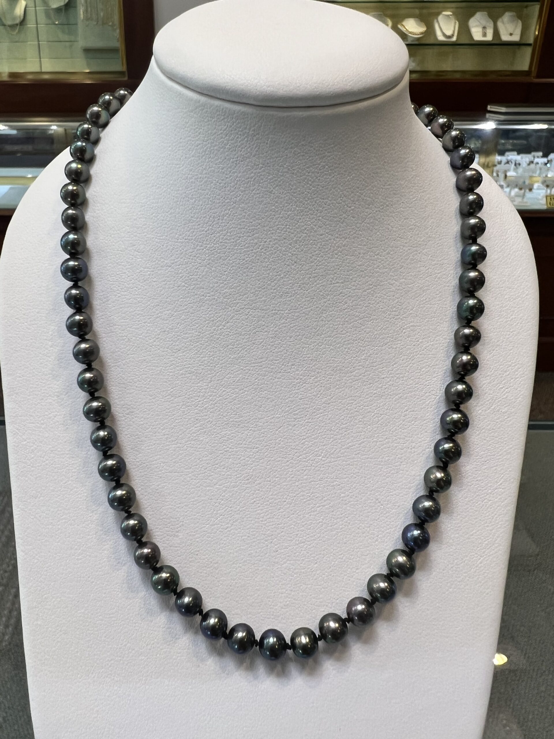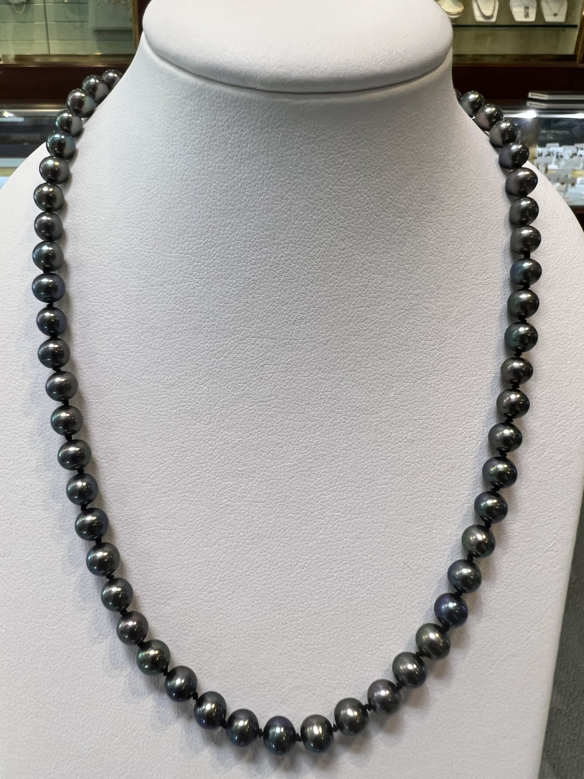 An 18″ knotted strand of 5 mm black cultured pearls, terminated by the sweetest 14k yellow gold double heart filigree clasp. This strand has an entire weight of 16.5 grams. Only one strand like that available!