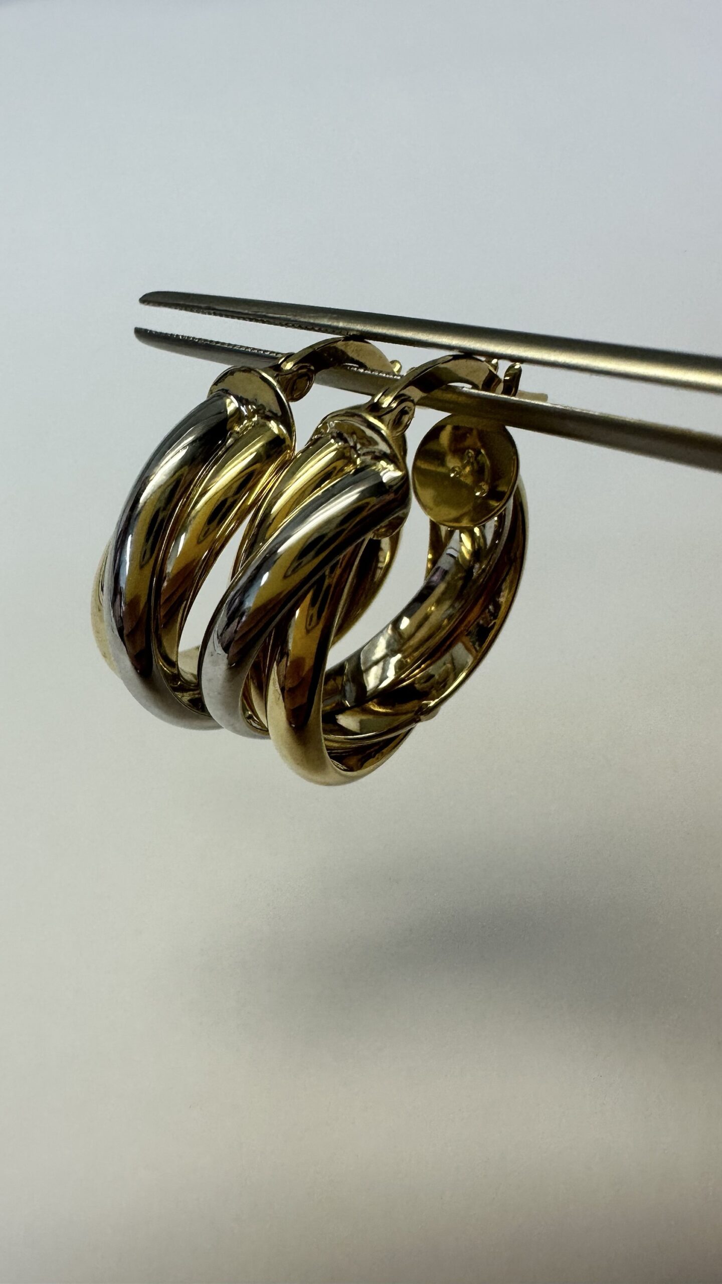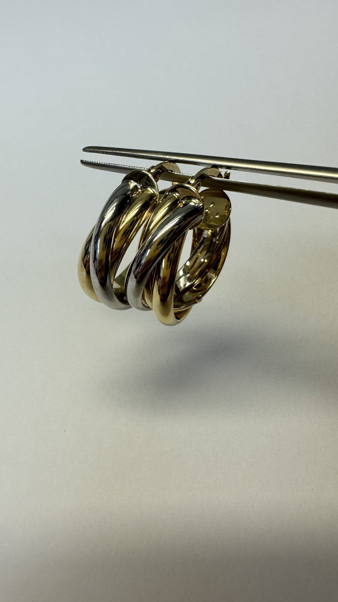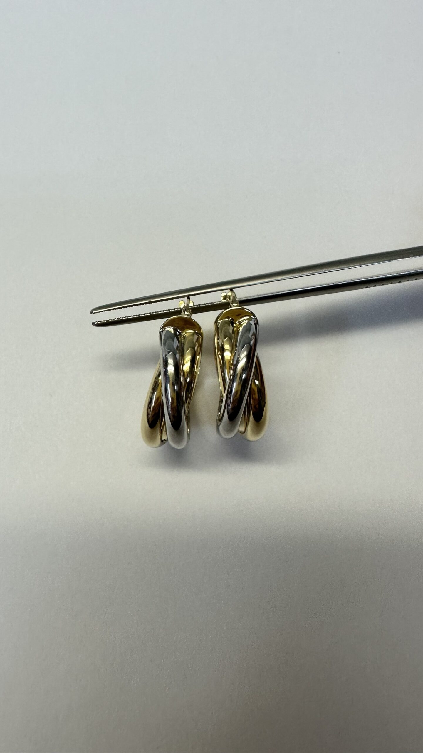 One-of-a-kind 18k tri-color gold cross-over hoop earrings directly imported from Italy. These earrings measure 21.5 x 6.5 mm in size and they have an entire weight of 3.68 grams.
