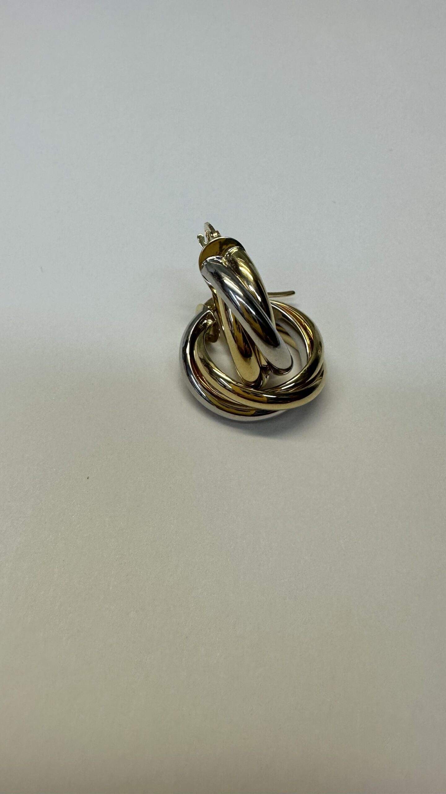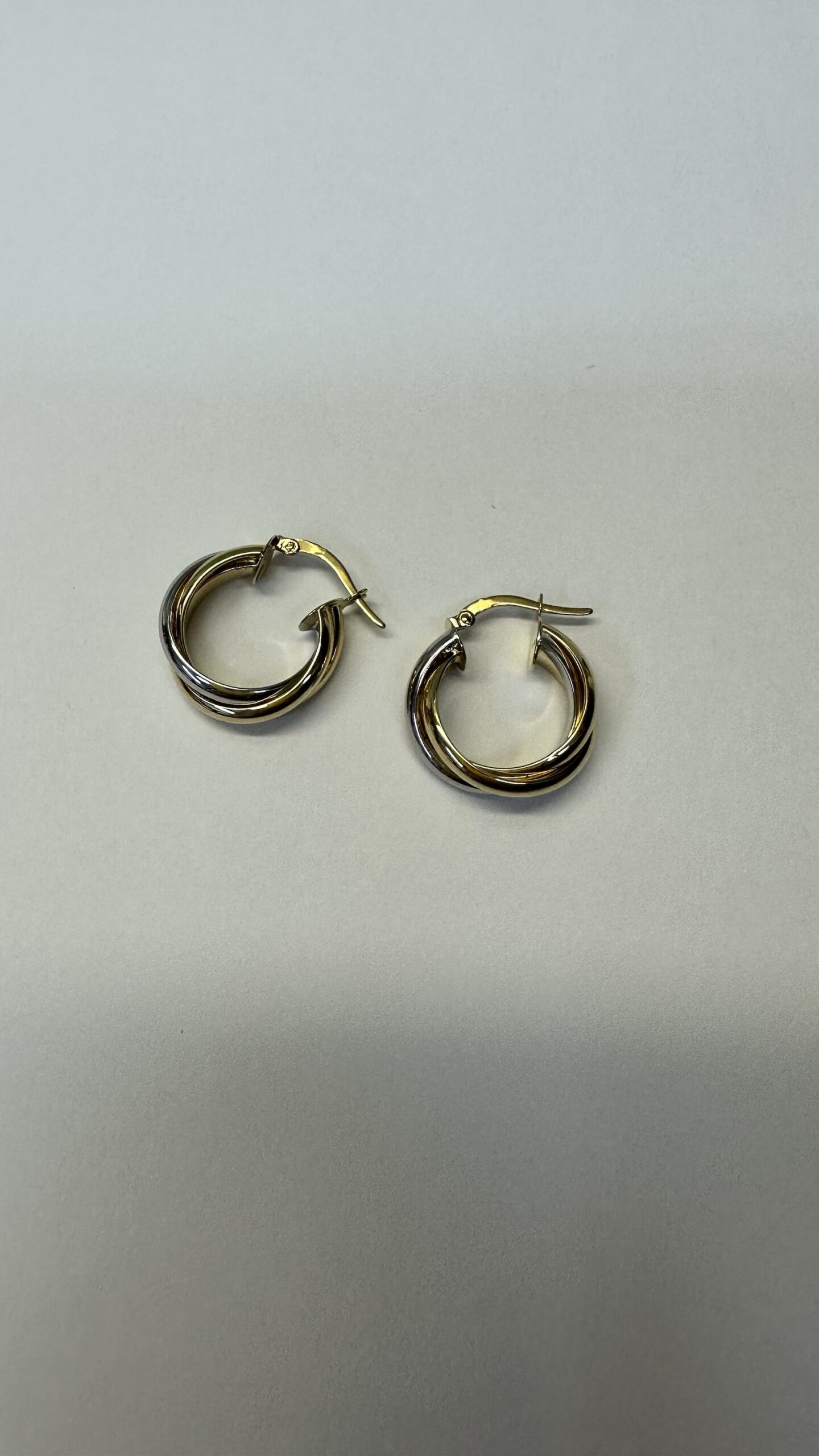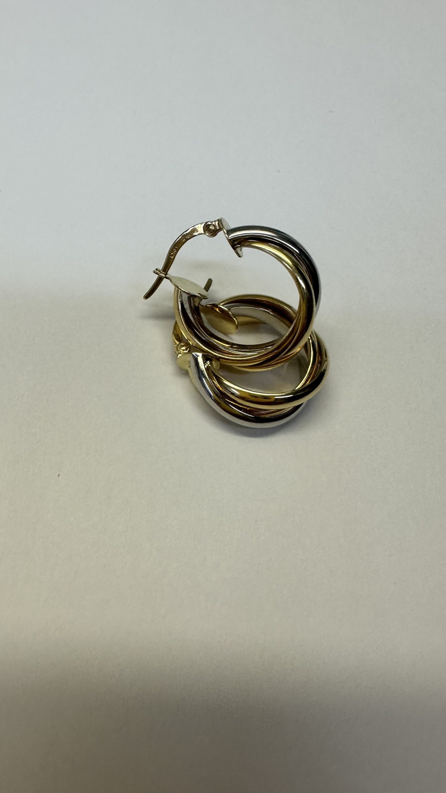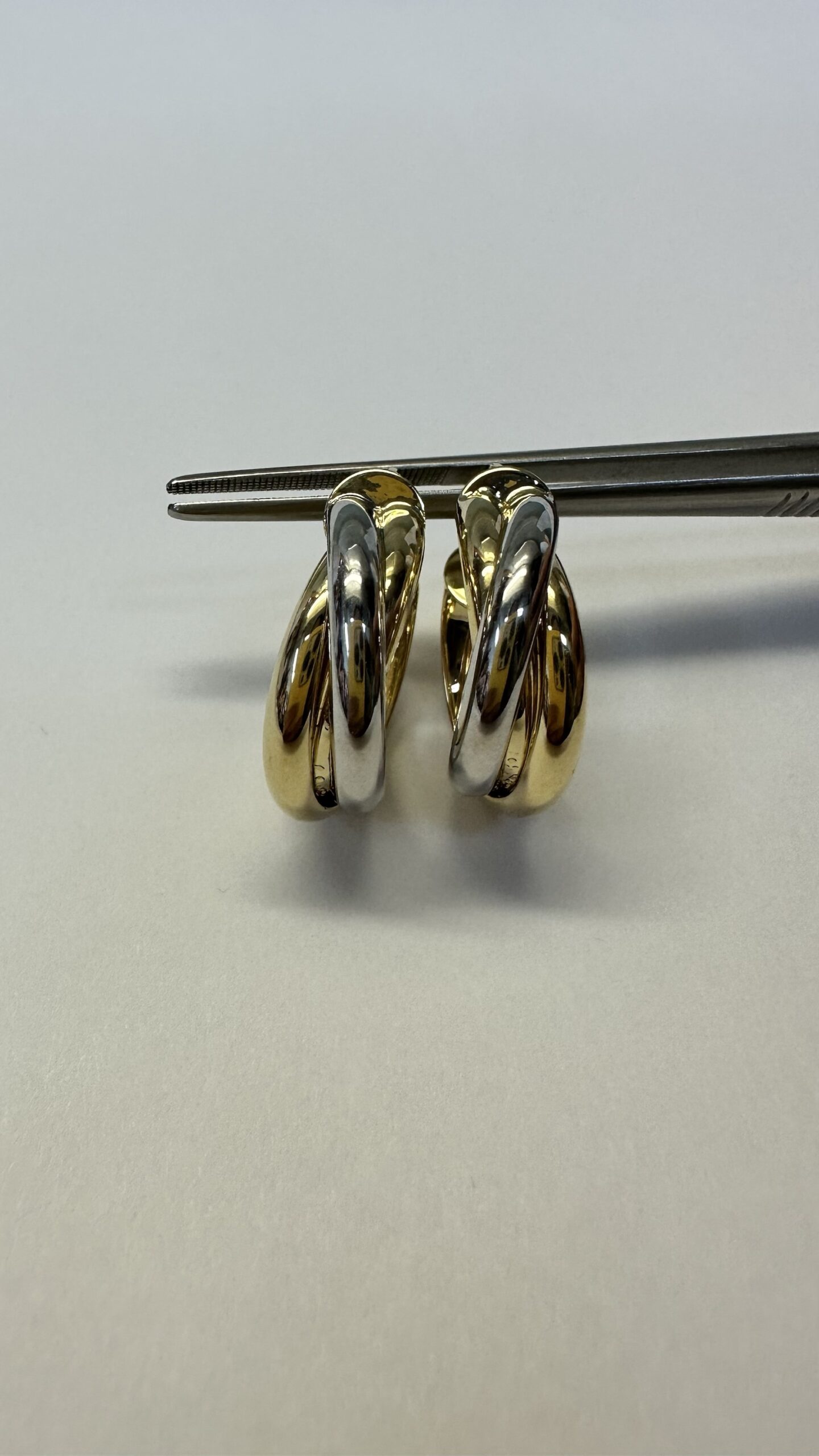 One-of-a-kind 18k tri-color gold cross-over hoop earrings directly imported from Italy. These earrings measure 21.5 x 6.5 mm in size and they have an entire weight of 3.68 grams.