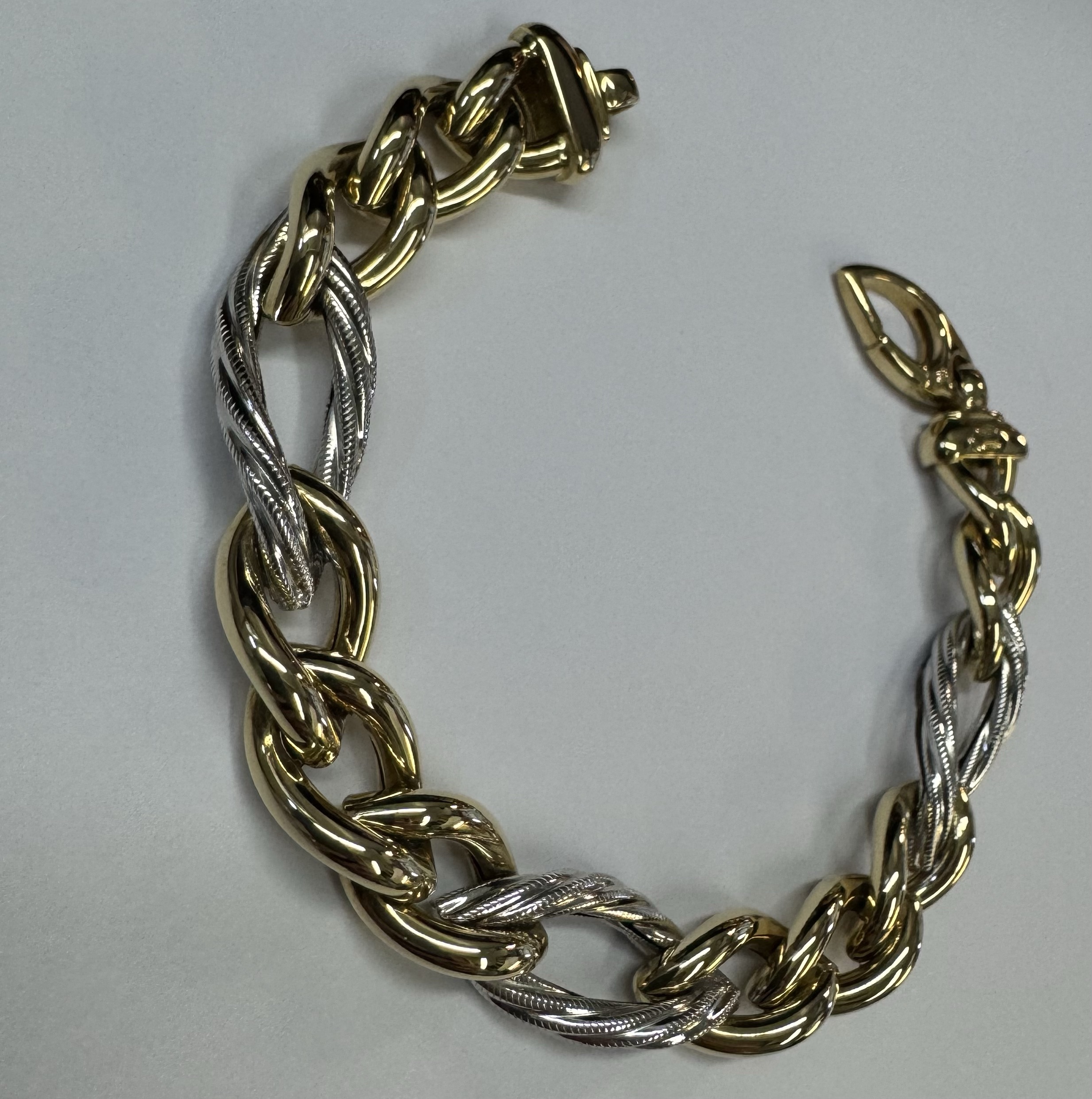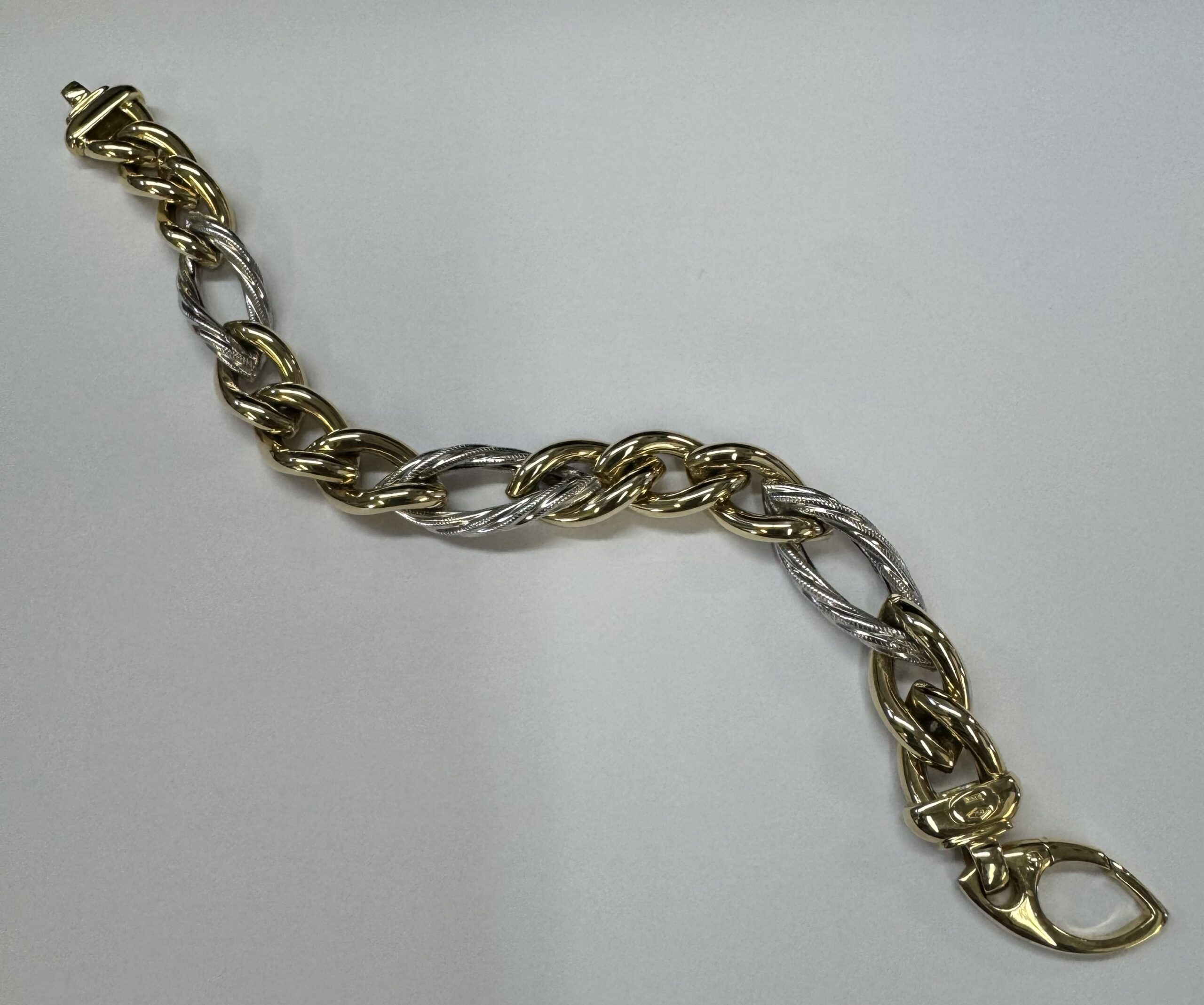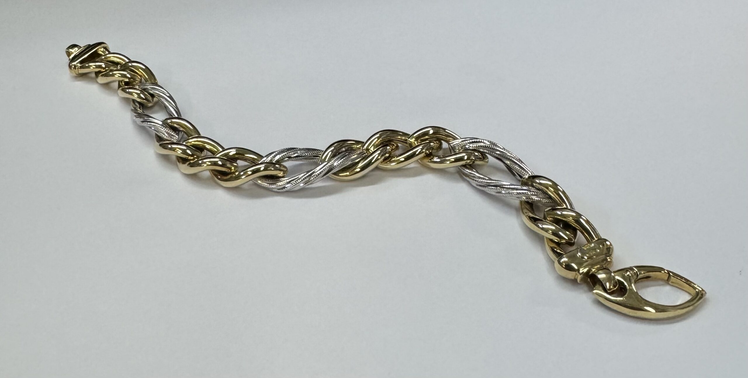 The perfect accessory to any outfit! An 18k 2tone open link bracelet, 7.5″, 18.1 grams, directly imported from Italy, normally $2,795, on sale for $1,795!!! Only one of these beauties available!