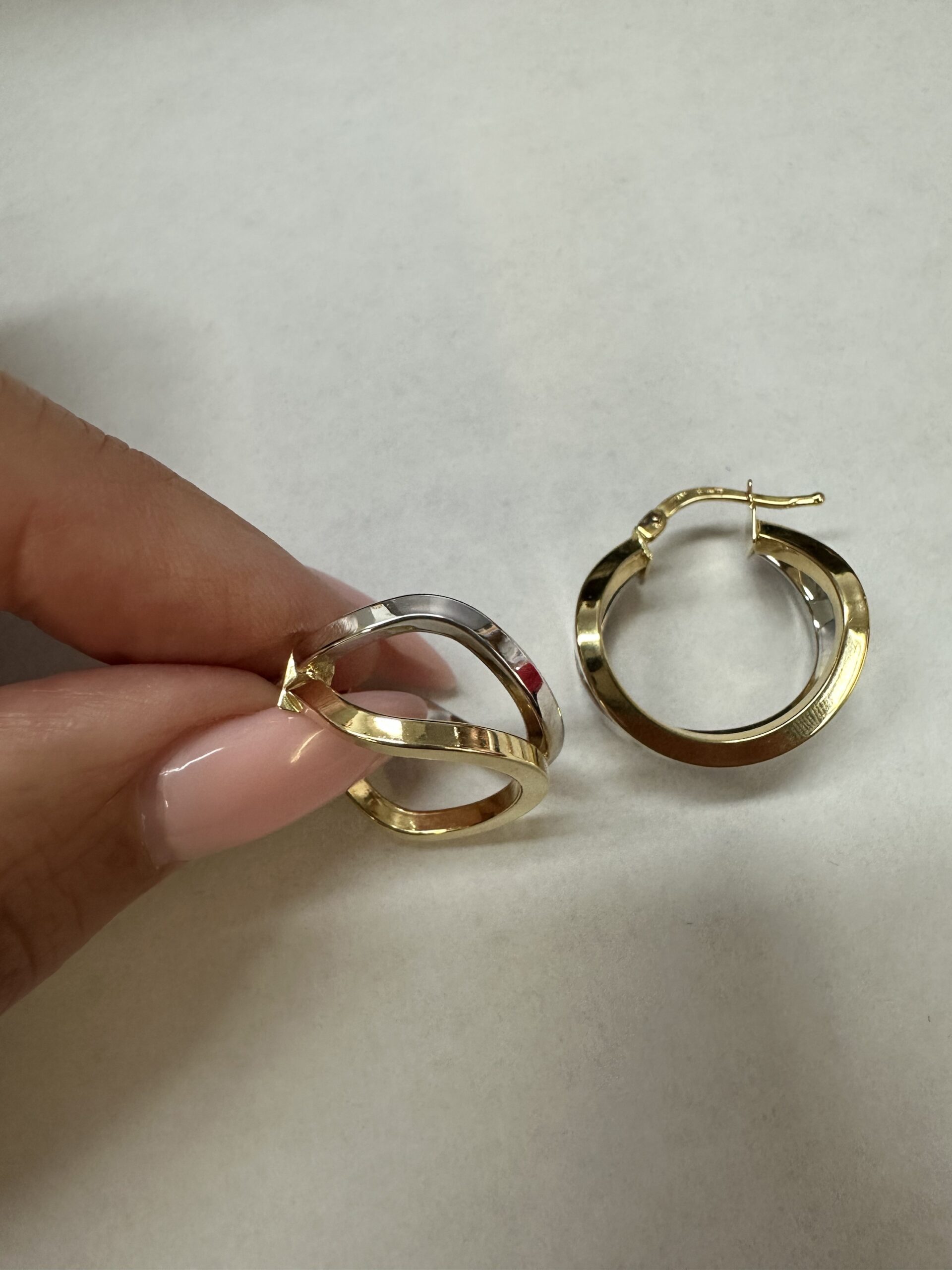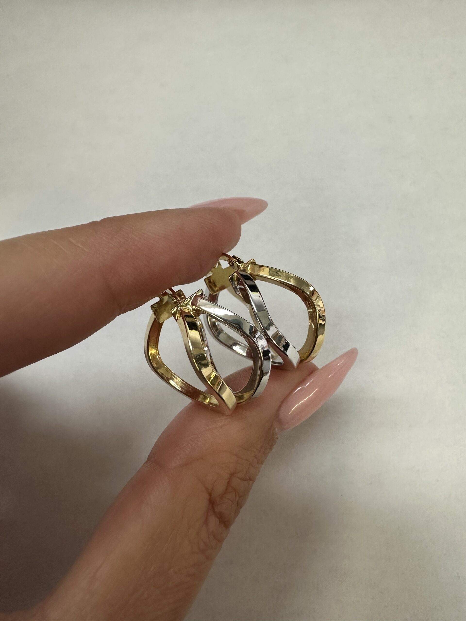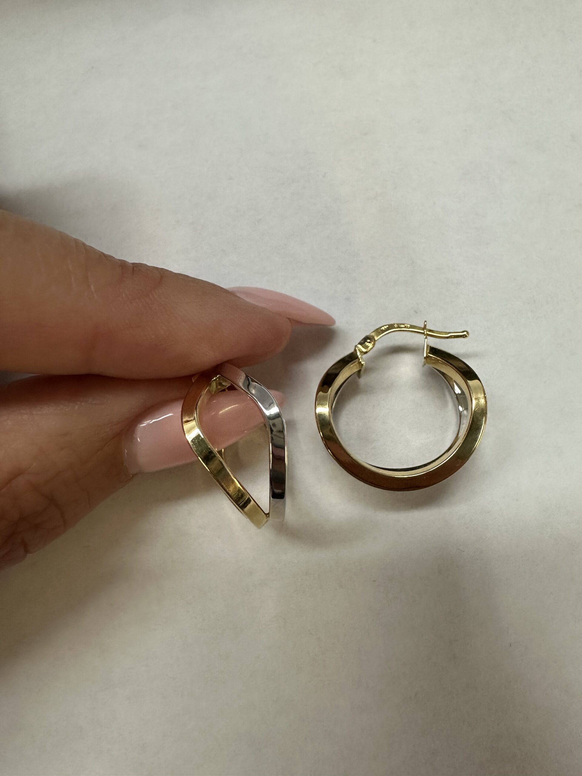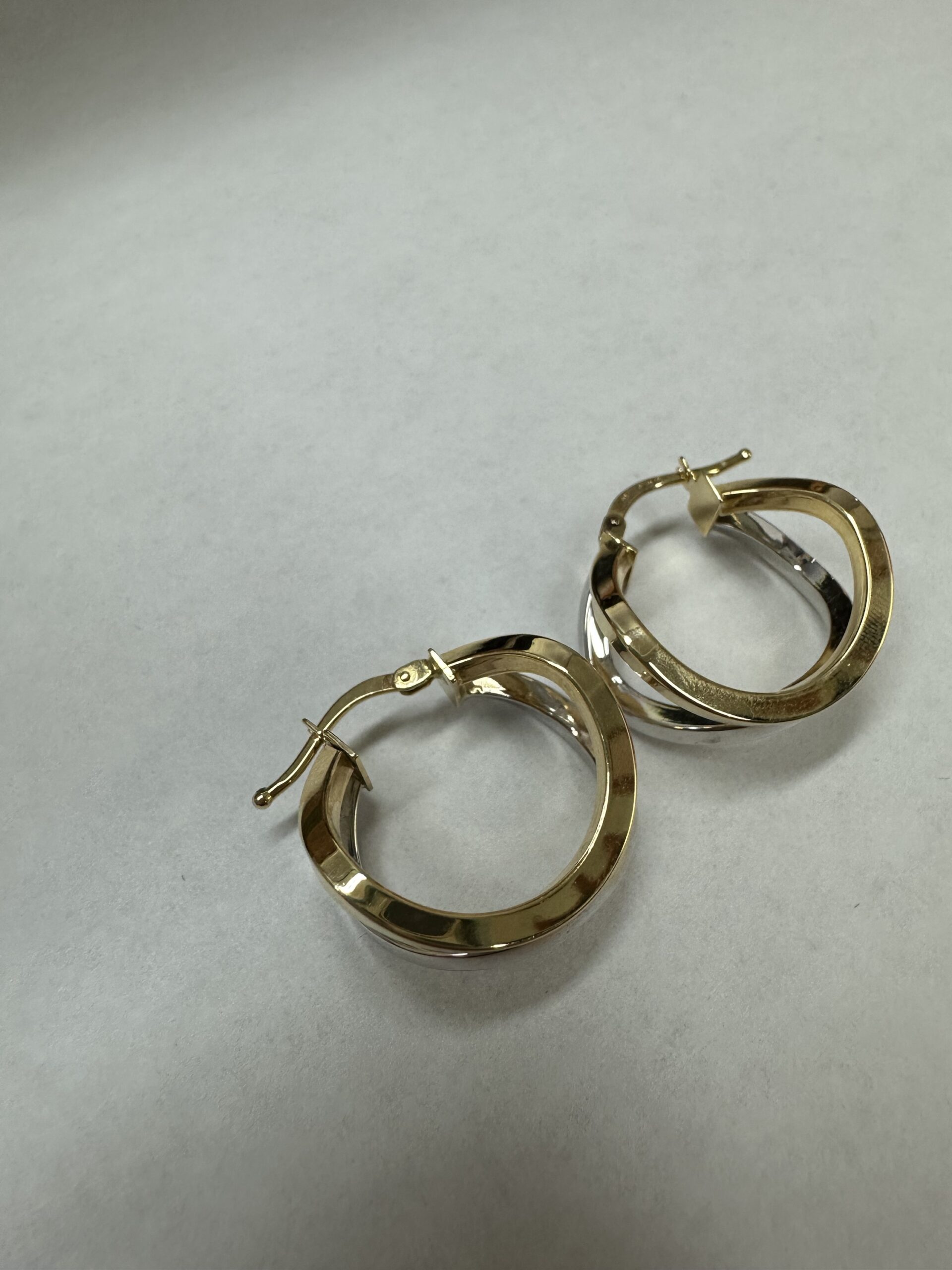 One-of-a-kind 18k 2tone gold wavy round hoop earrings directly imported from Italy. These earrings measure approximately 10 x 19.5 mm in size, and they have an entire weight of 3.7 grams.