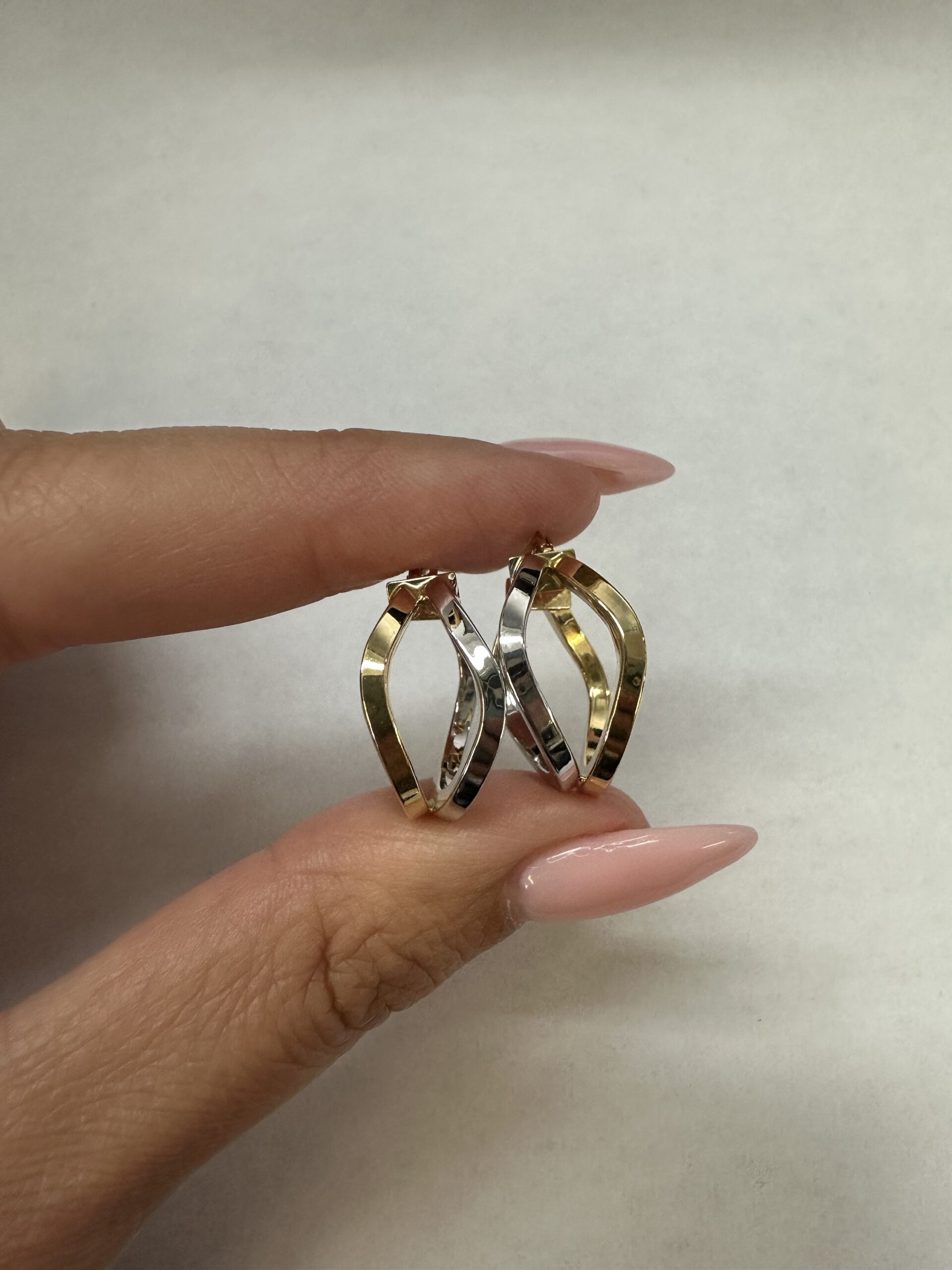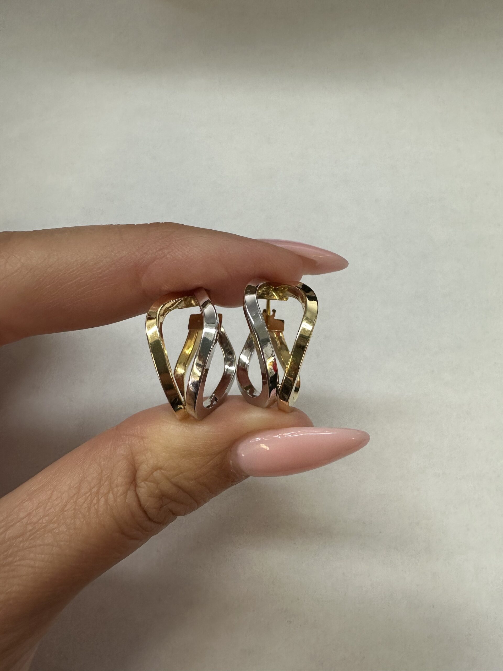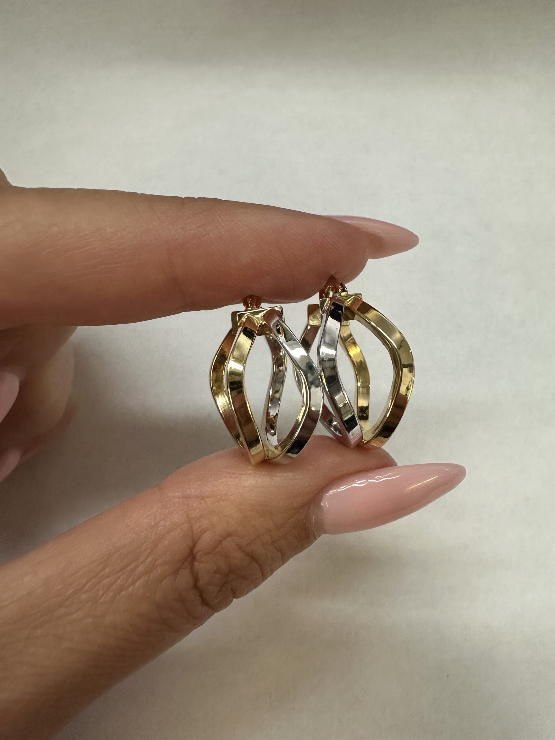 One-of-a-kind 18k 2tone gold wavy round hoop earrings directly imported from Italy. These earrings measure approximately 10 x 19.5 mm in size, and they have an entire weight of 3.7 grams.