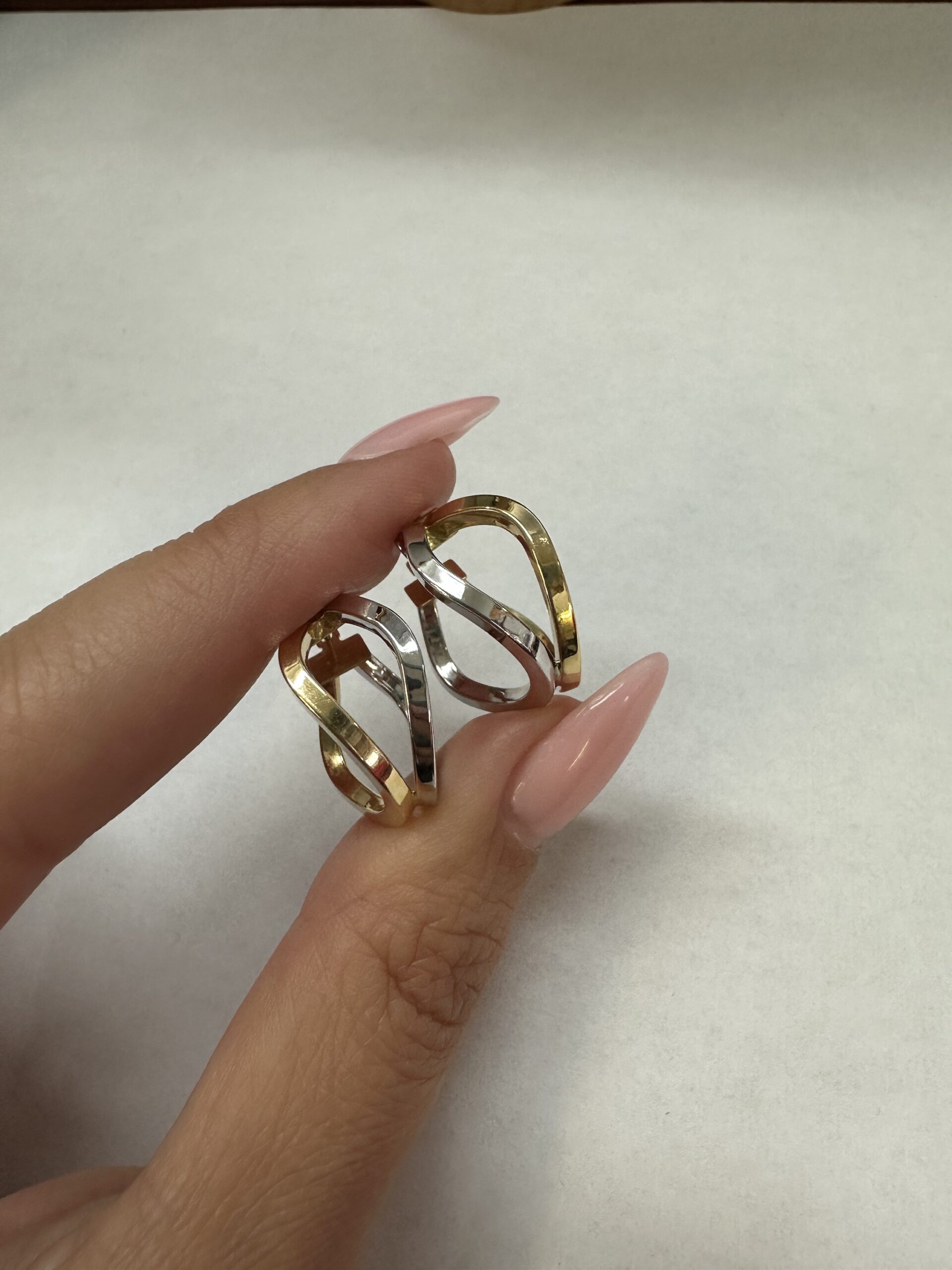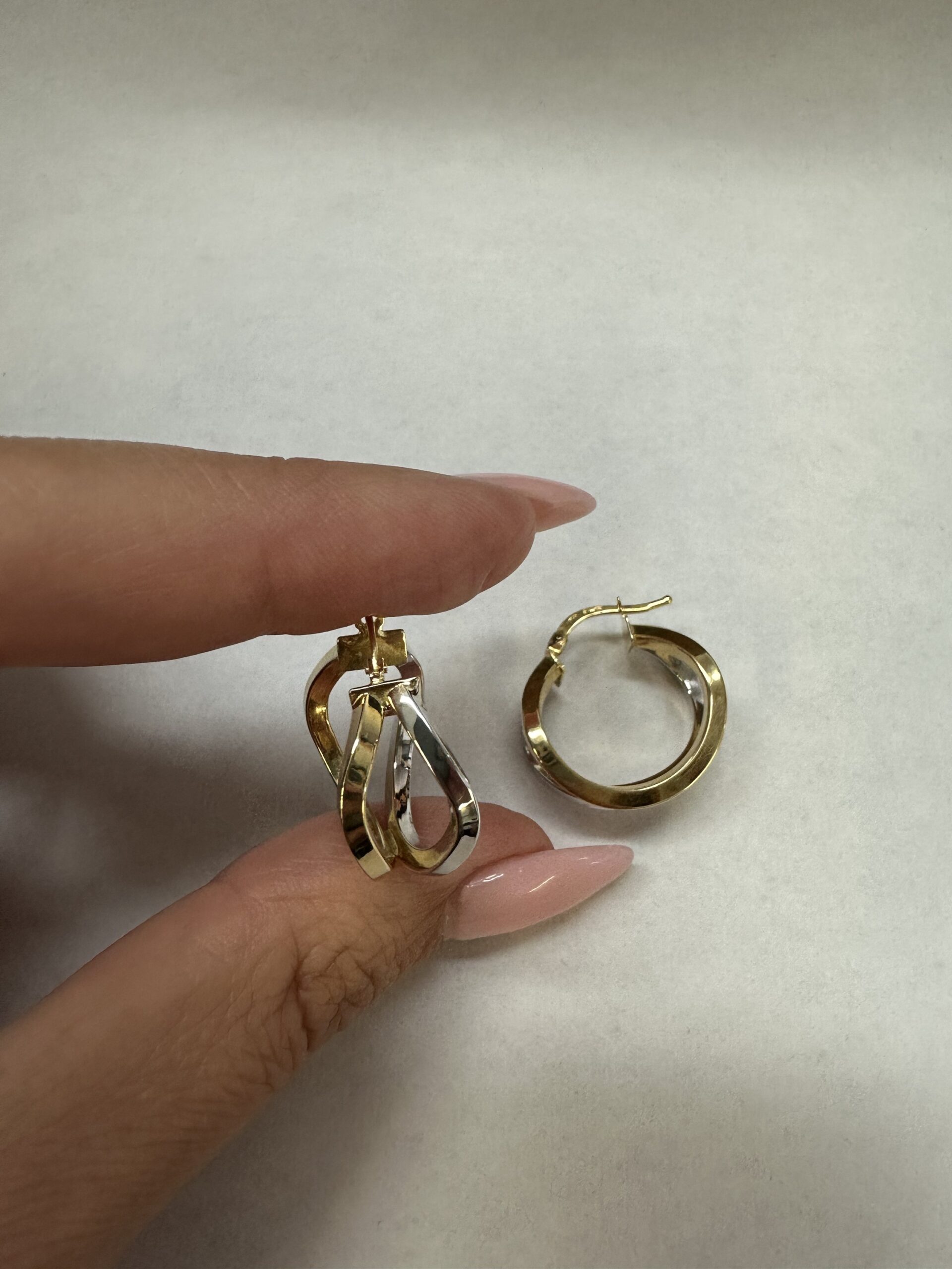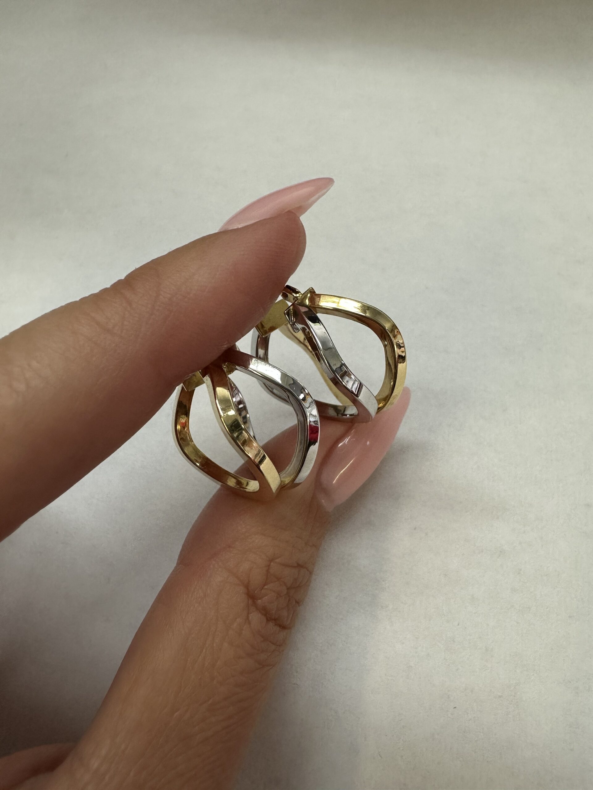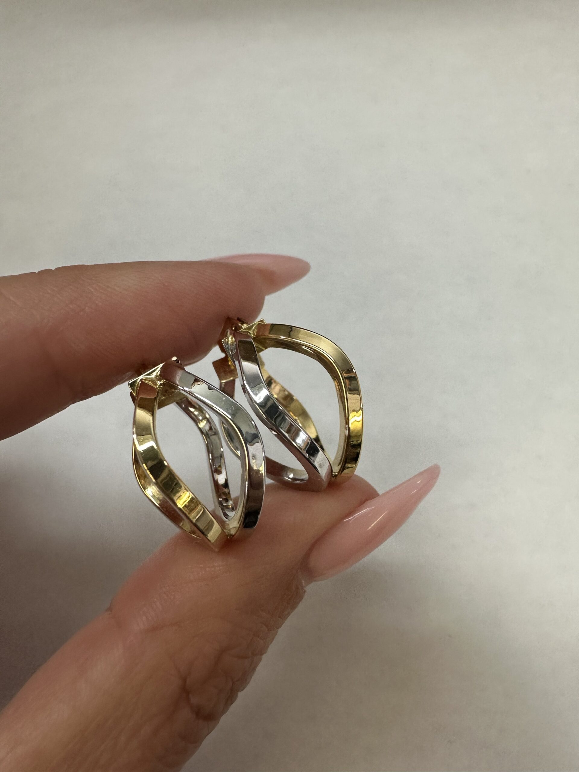 One-of-a-kind 18k 2tone gold wavy round hoop earrings directly imported from Italy. These earrings measure approximately 10 x 19.5 mm in size, and they have an entire weight of 3.7 grams.
