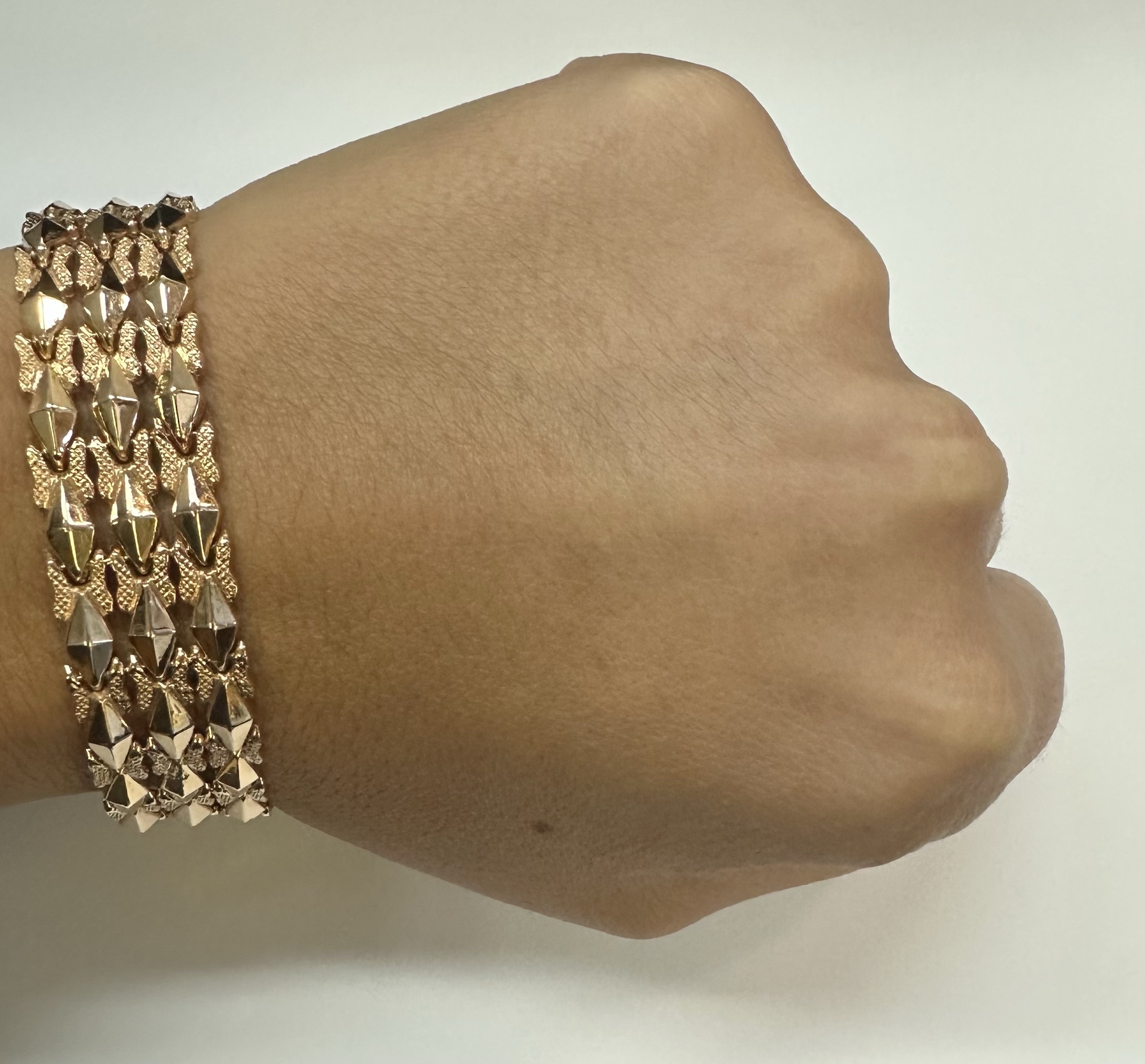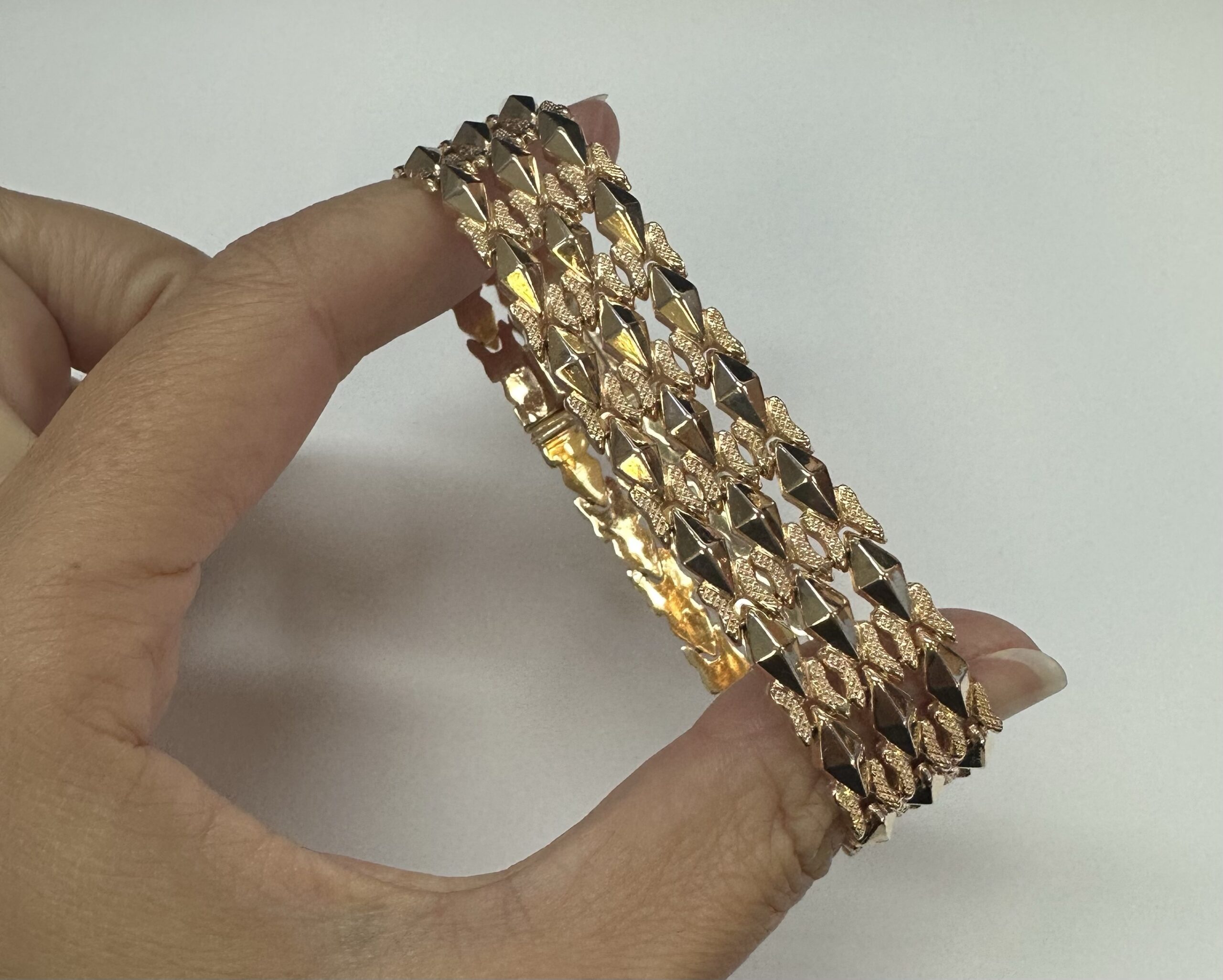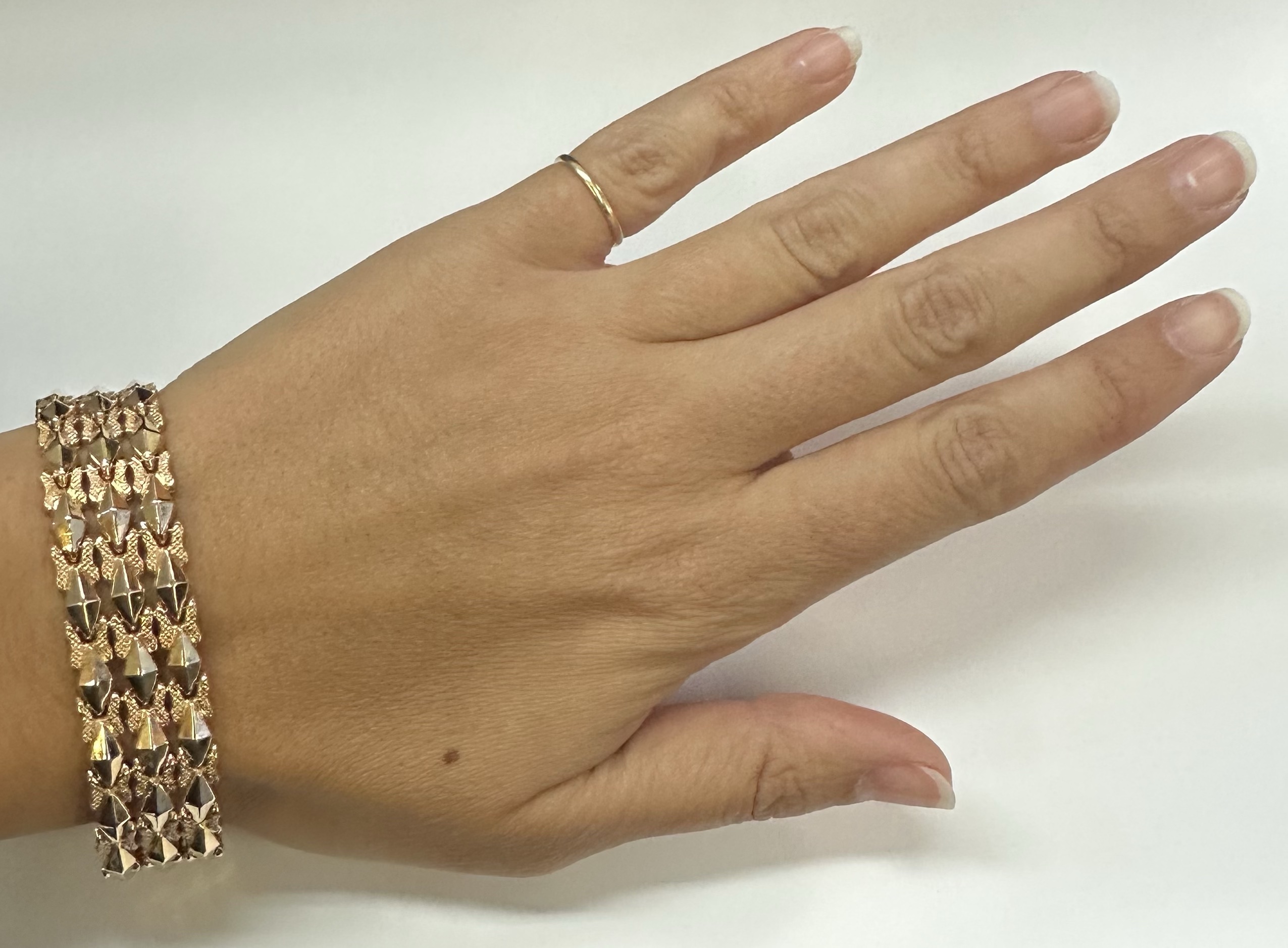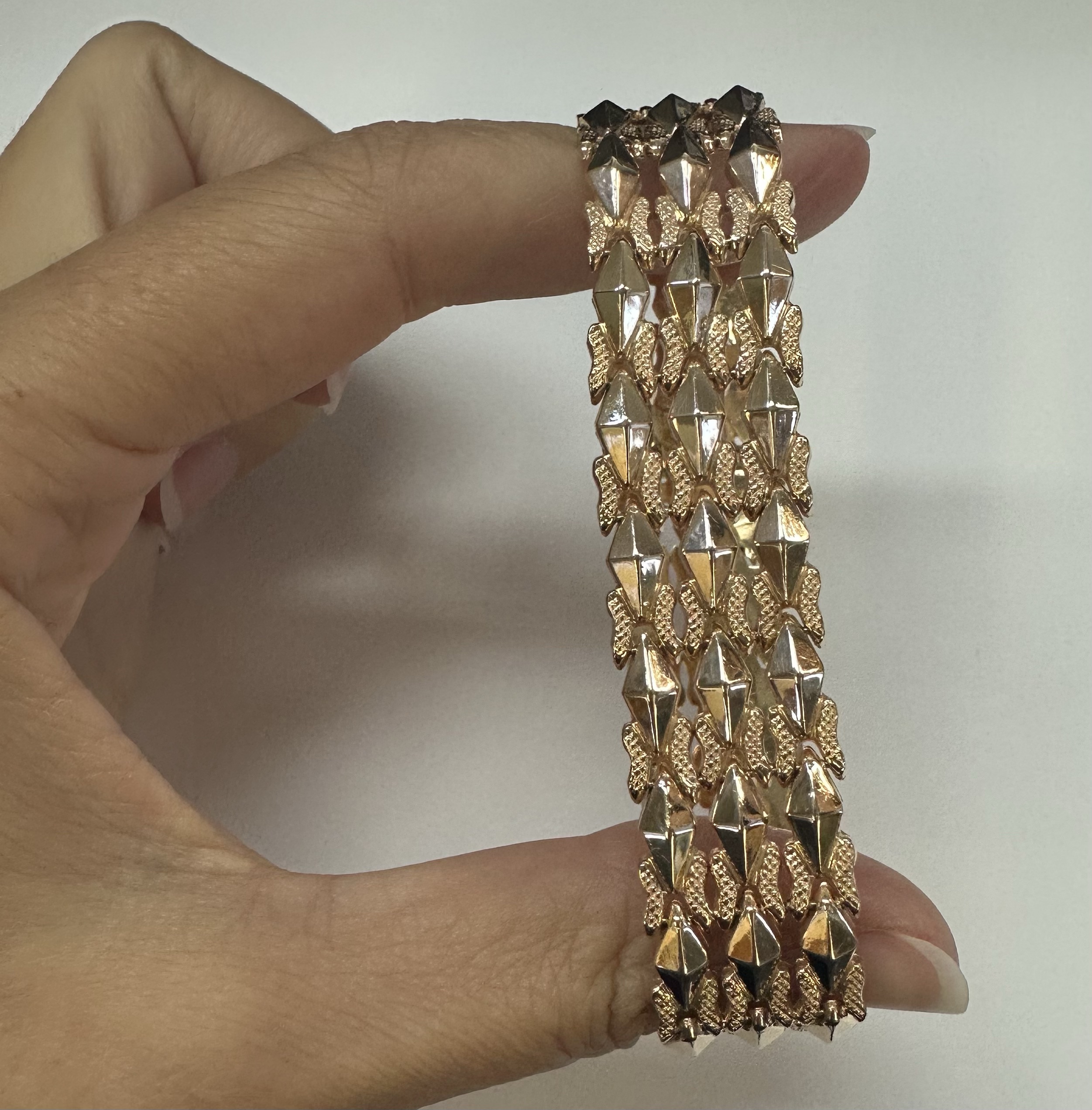 One-of-a-kind 18k rose gold three row diamond shaped link bracelet, 7 1/2”, 16 mm wide, 22.5 grams.