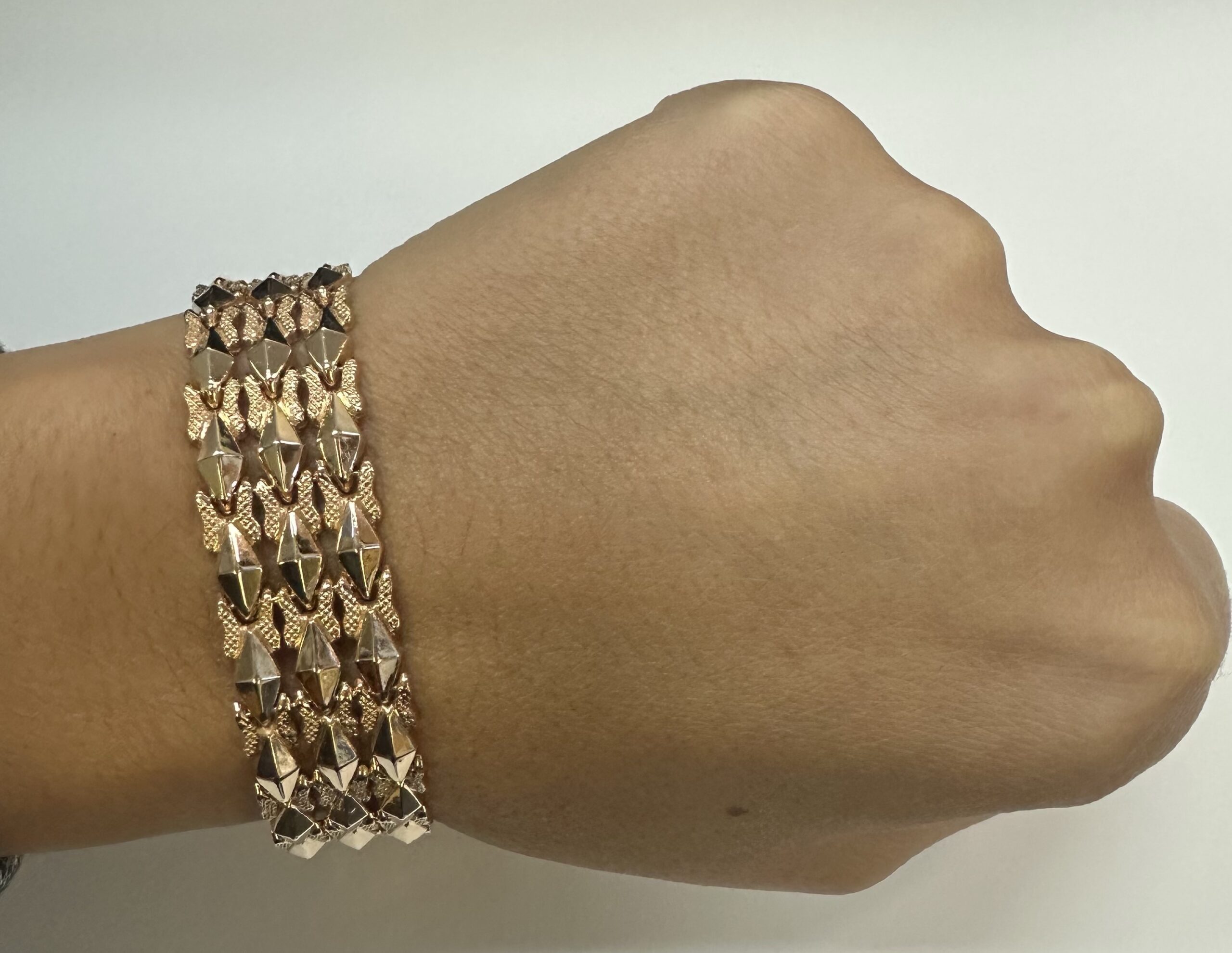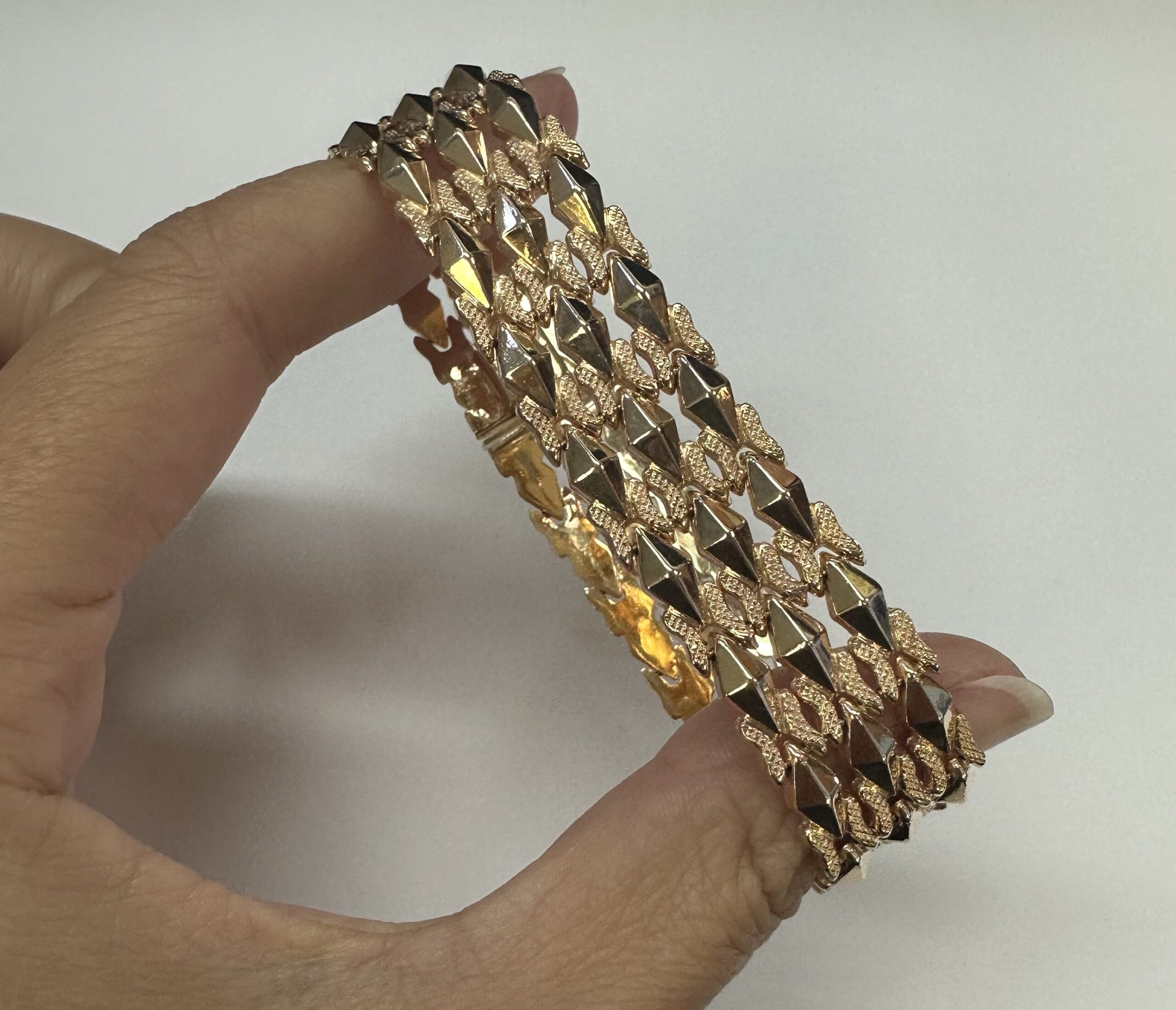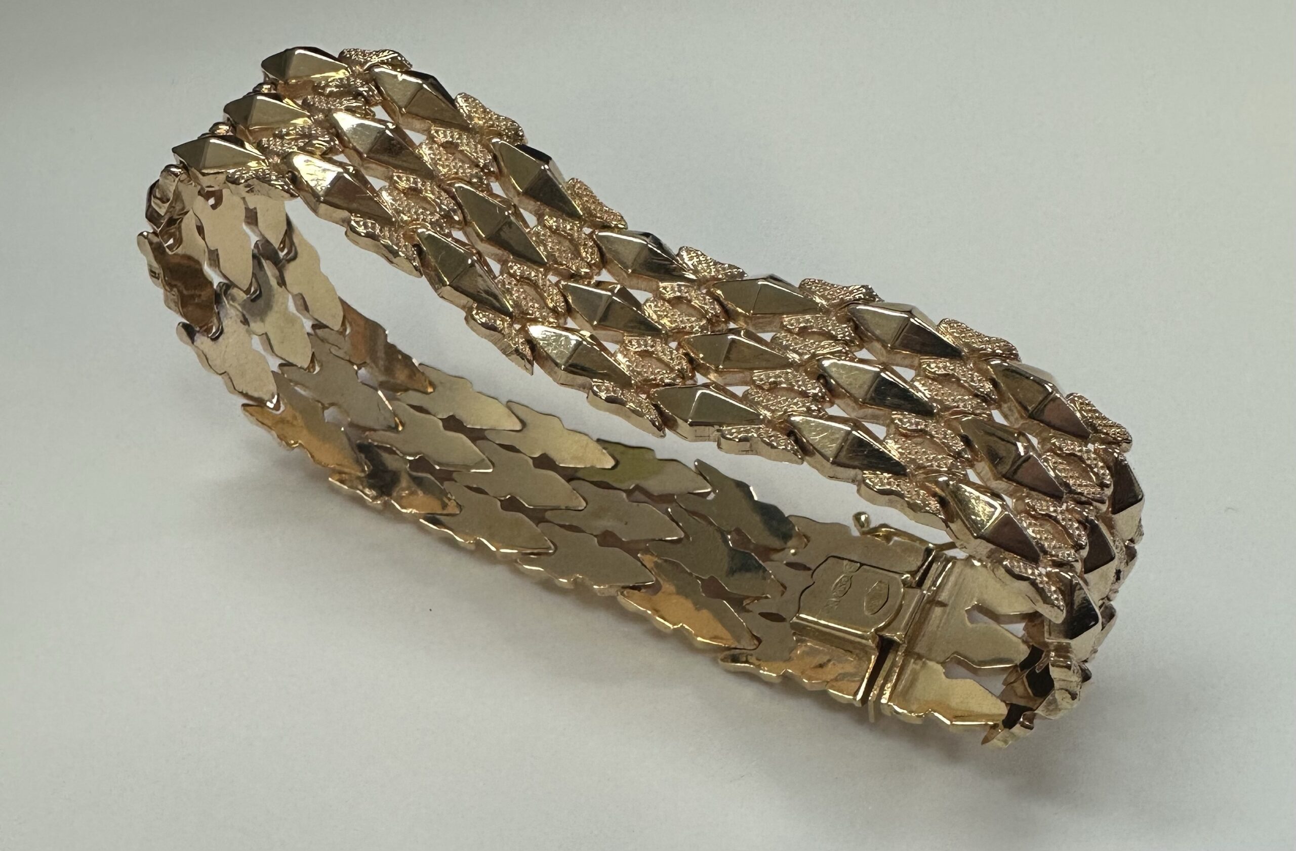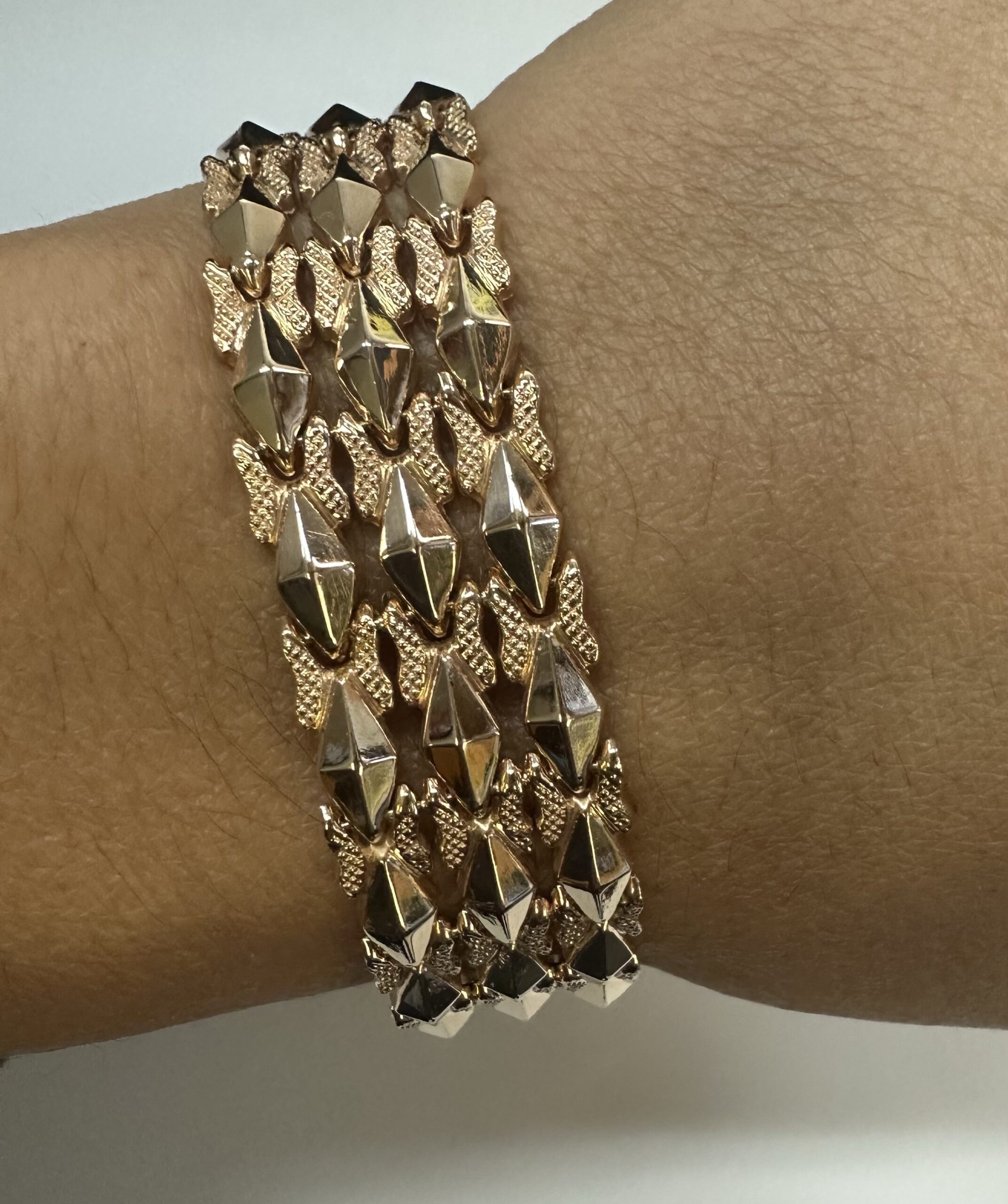 One-of-a-kind 18k rose gold three row diamond shaped link bracelet, 7 1/2”, 16 mm wide, 22.5 grams.