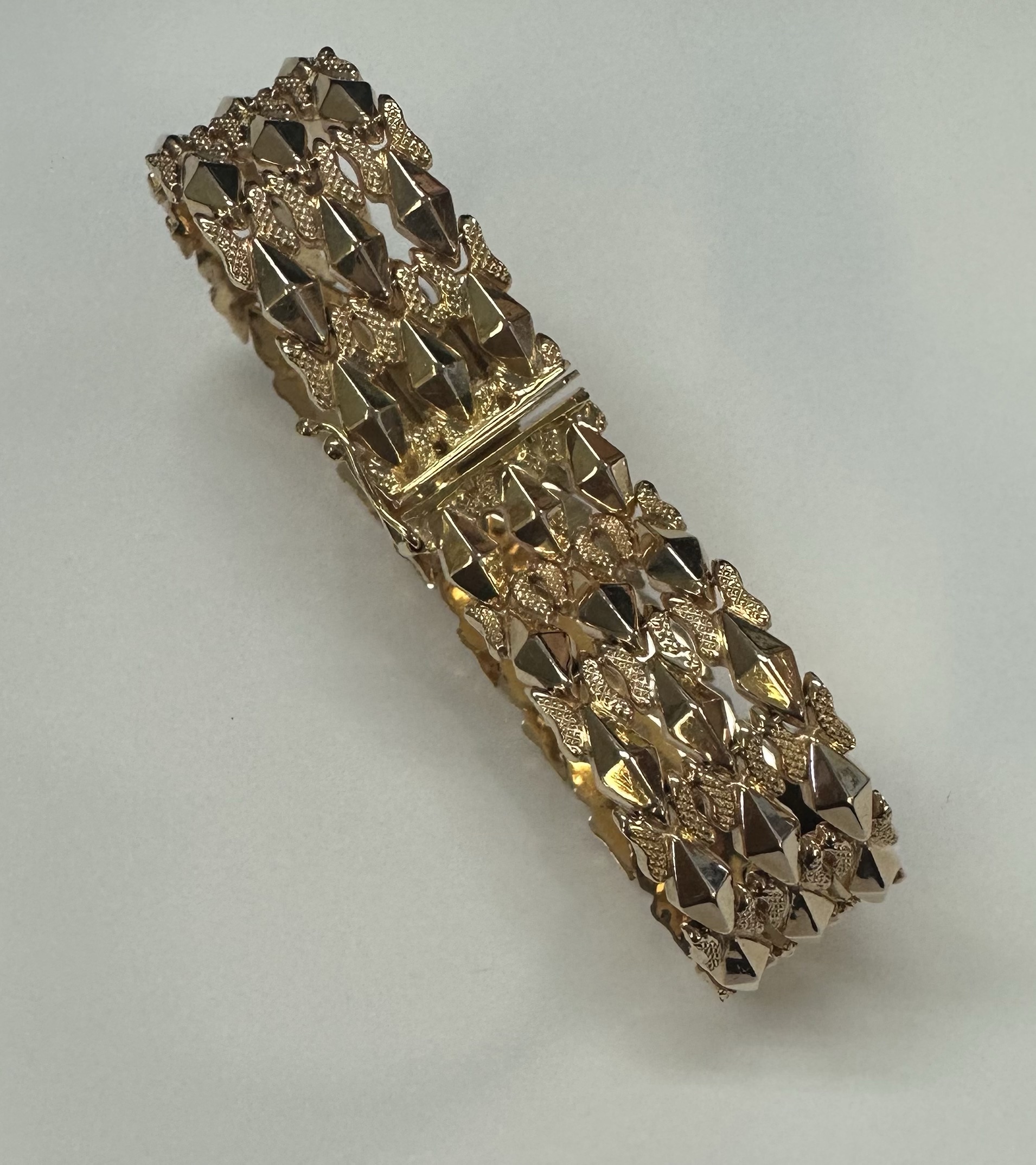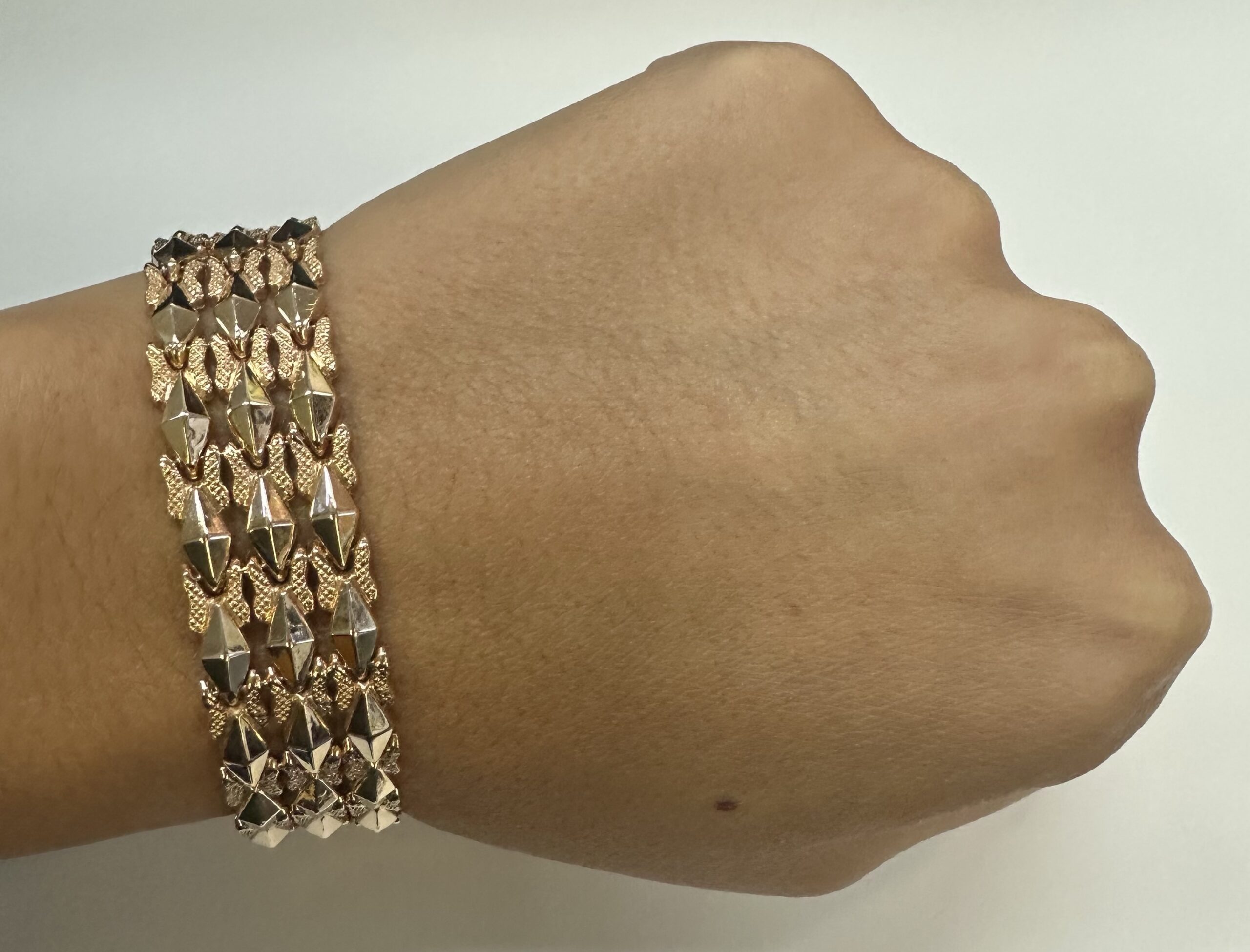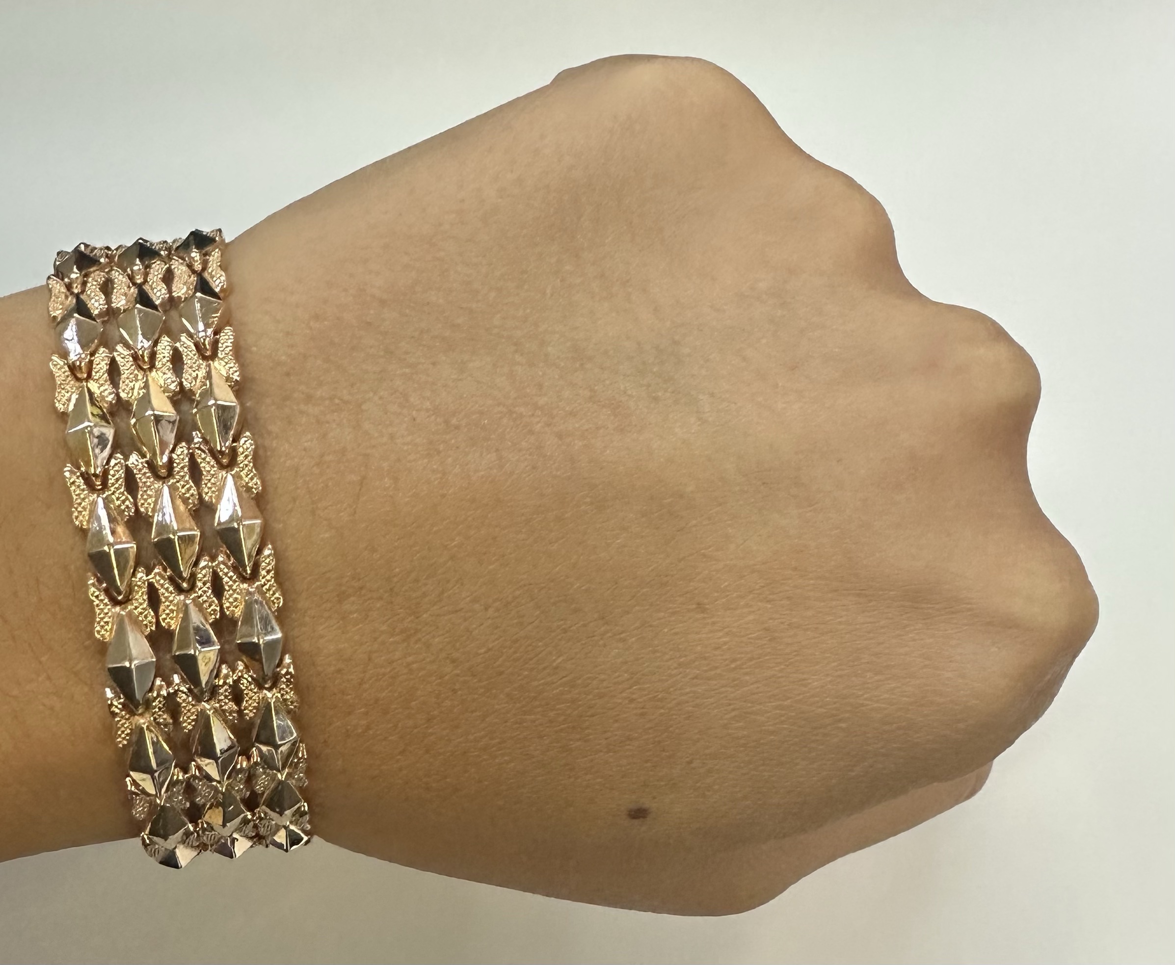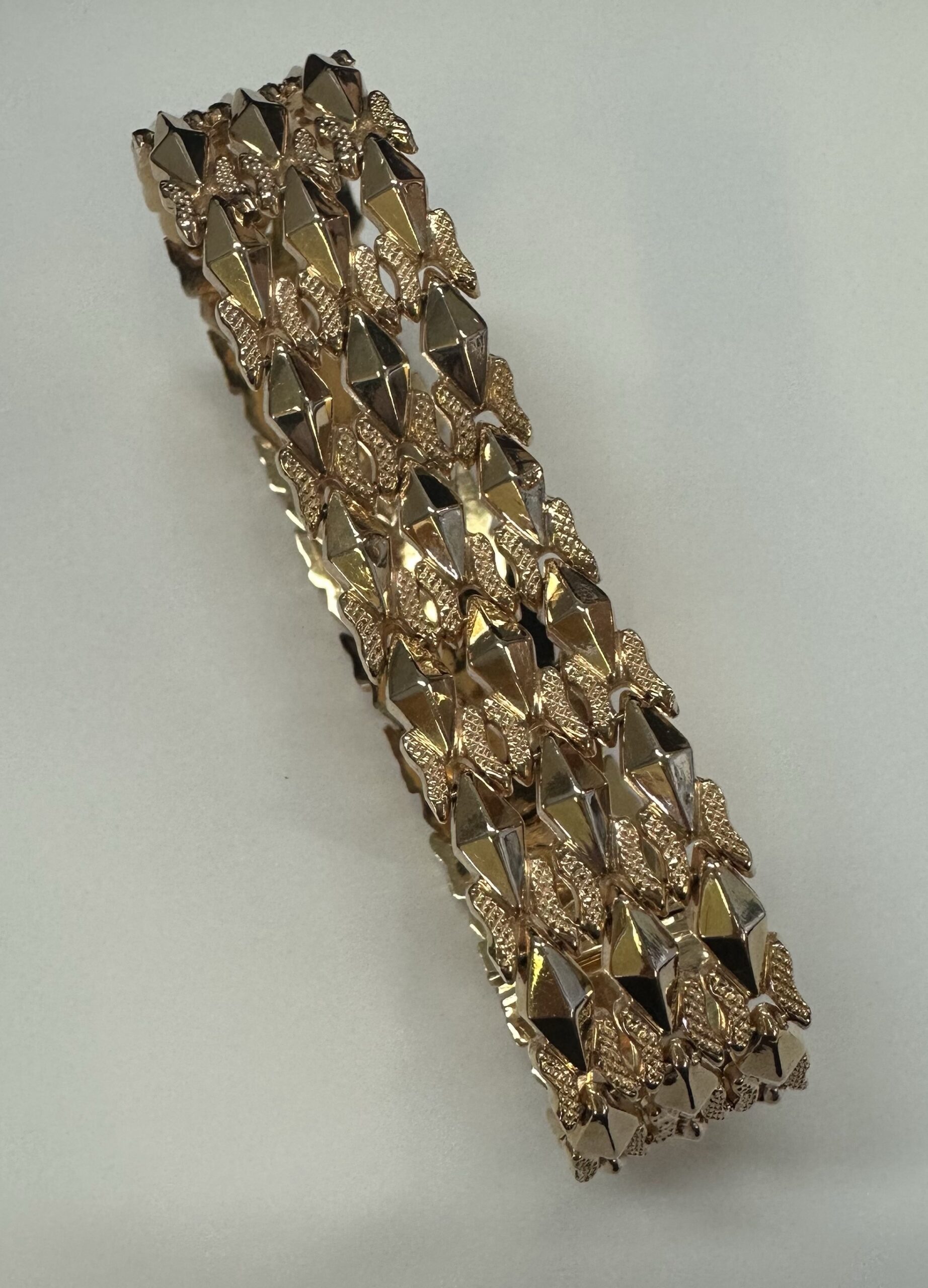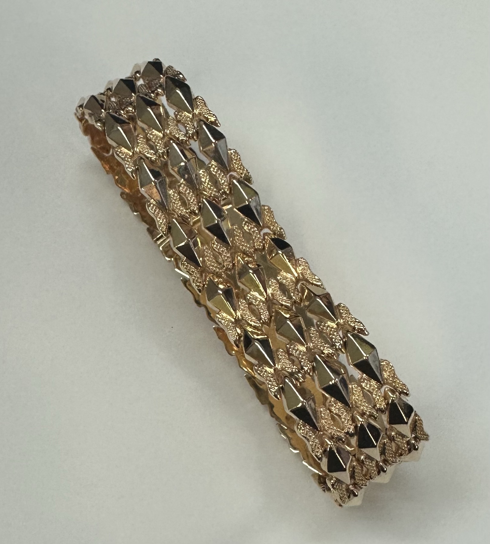 One-of-a-kind 18k rose gold three row diamond shaped link bracelet, 7 1/2”, 16 mm wide, 22.5 grams.