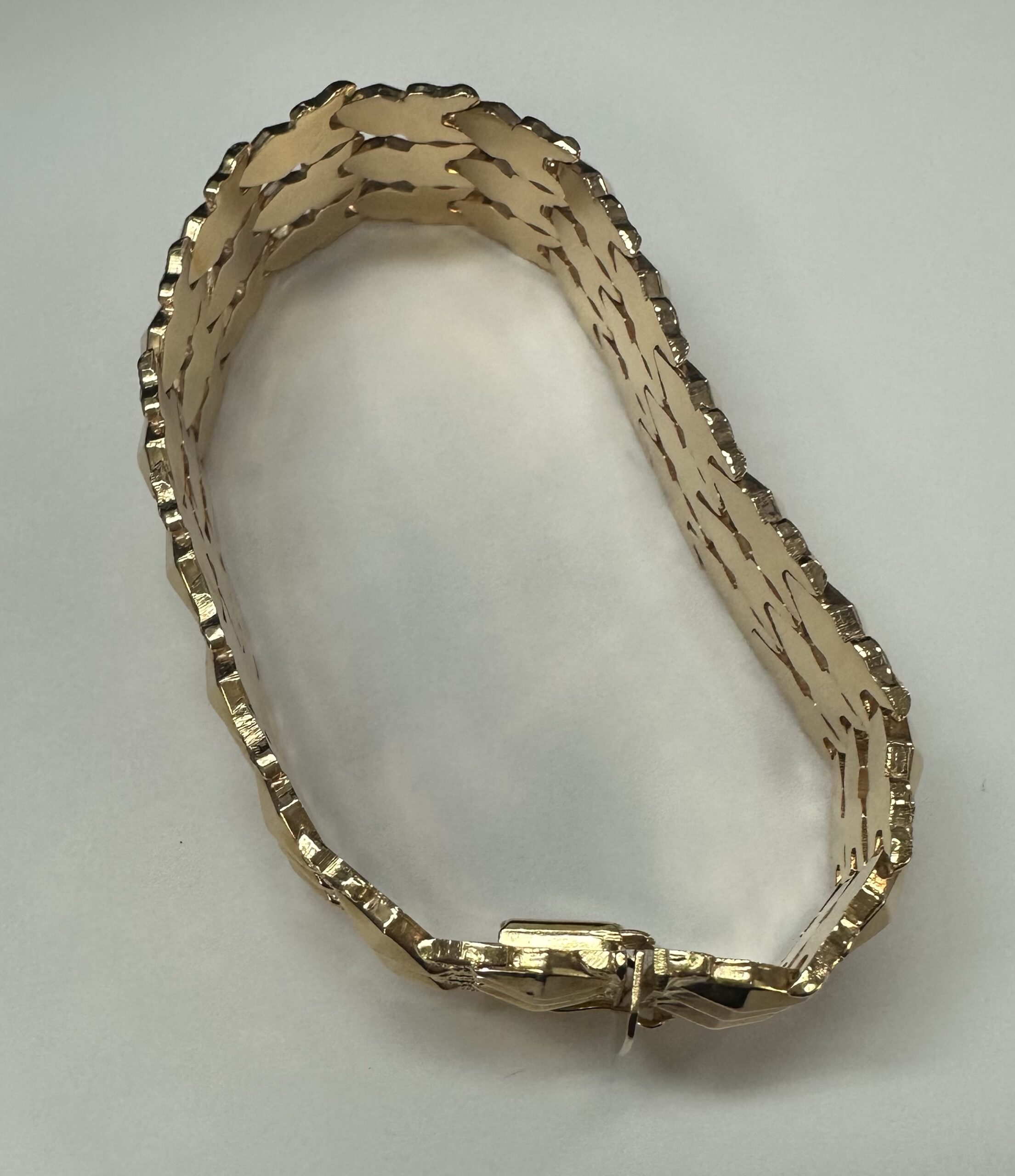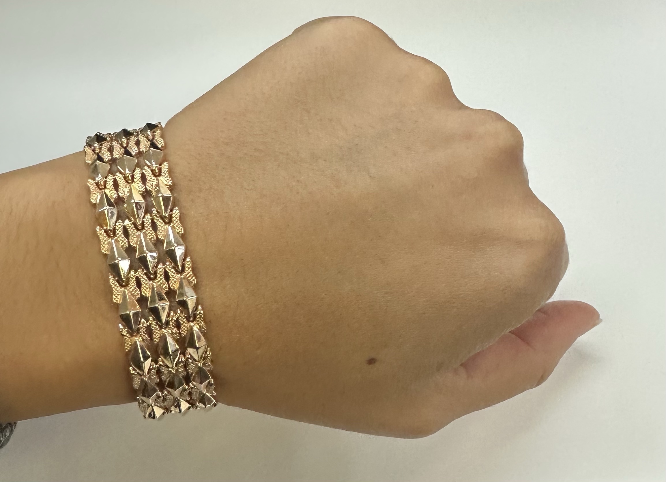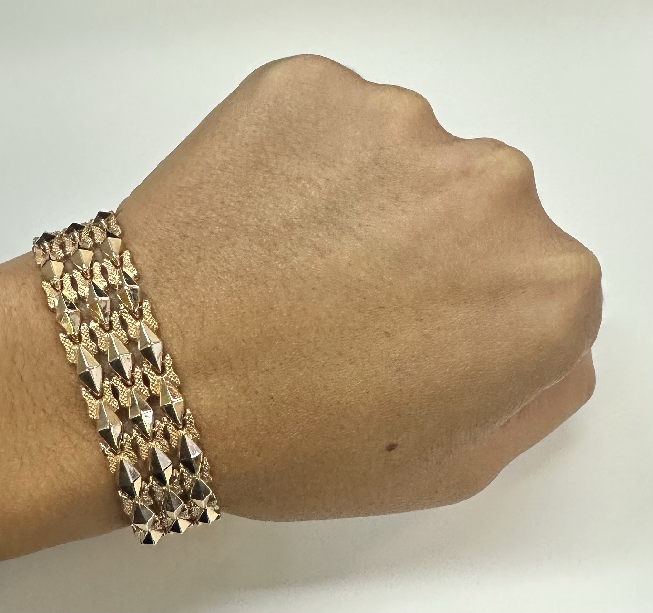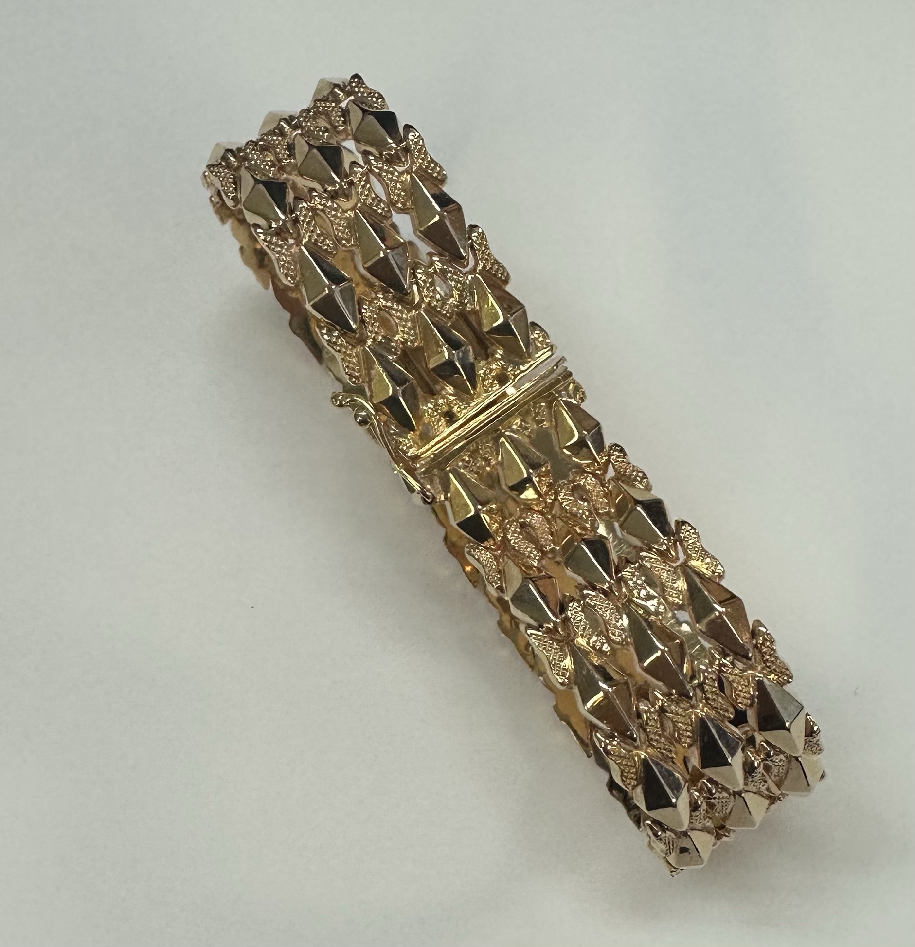 One-of-a-kind 18k rose gold three row diamond shaped link bracelet, 7 1/2”, 16 mm wide, 22.5 grams.