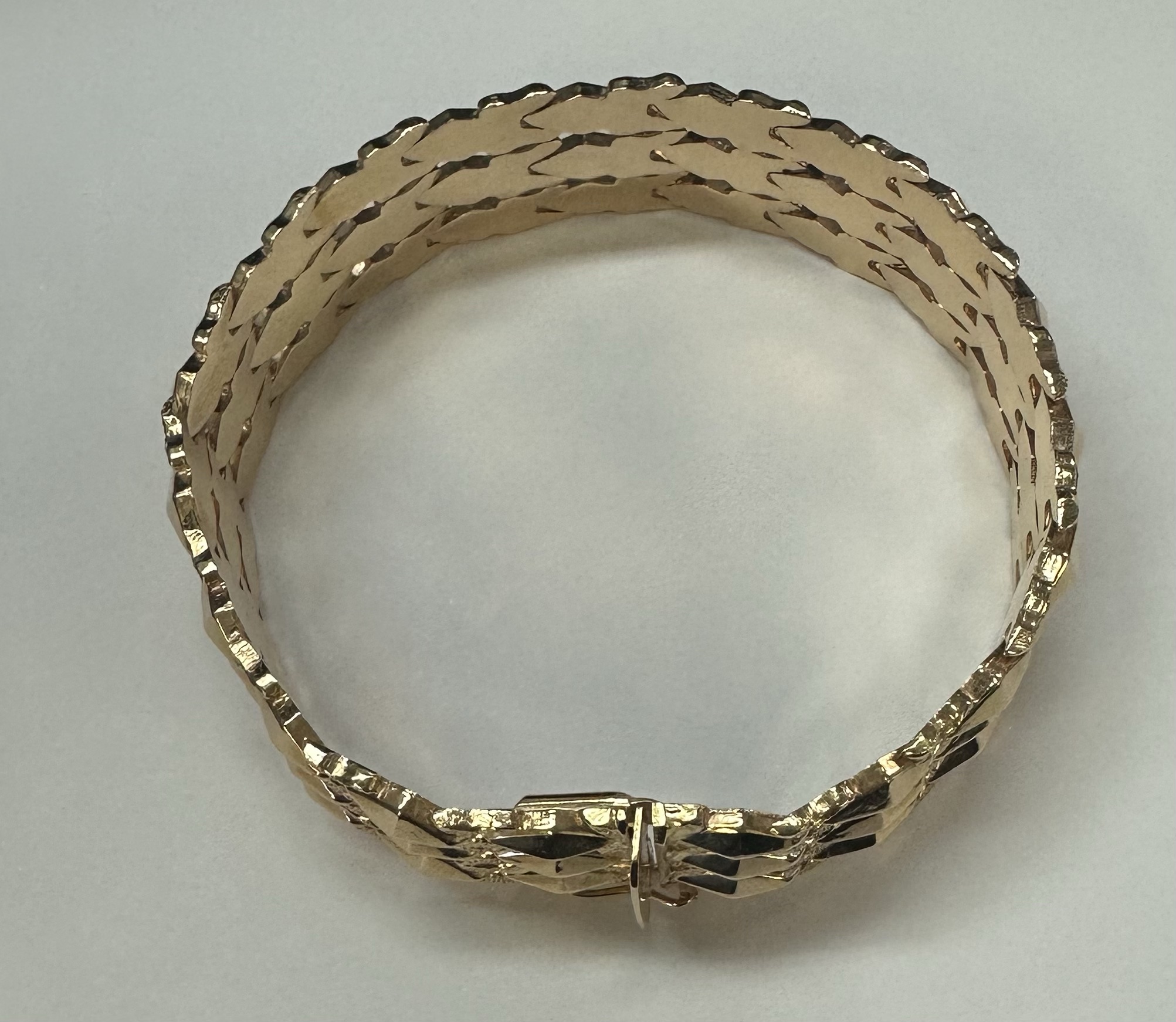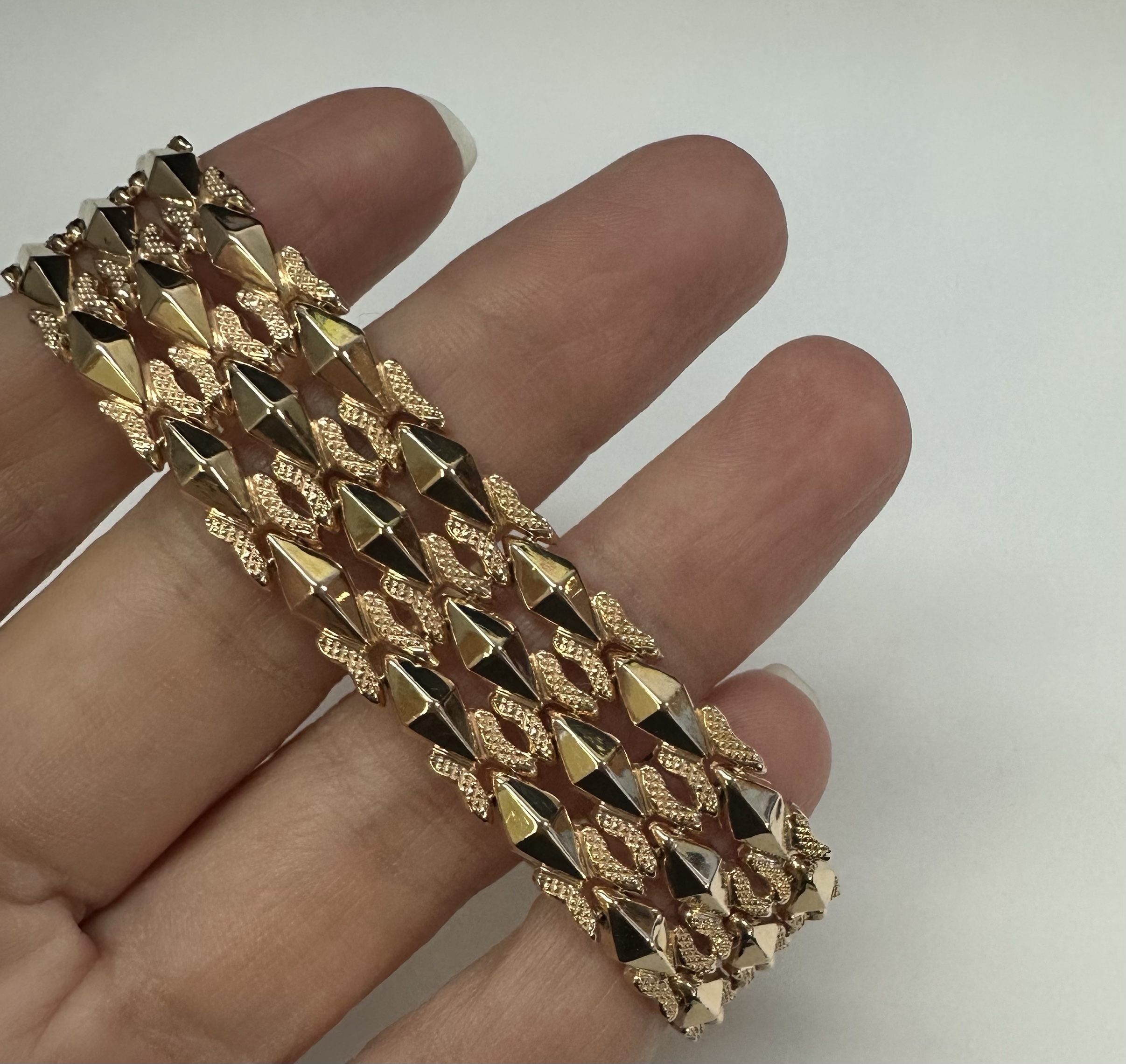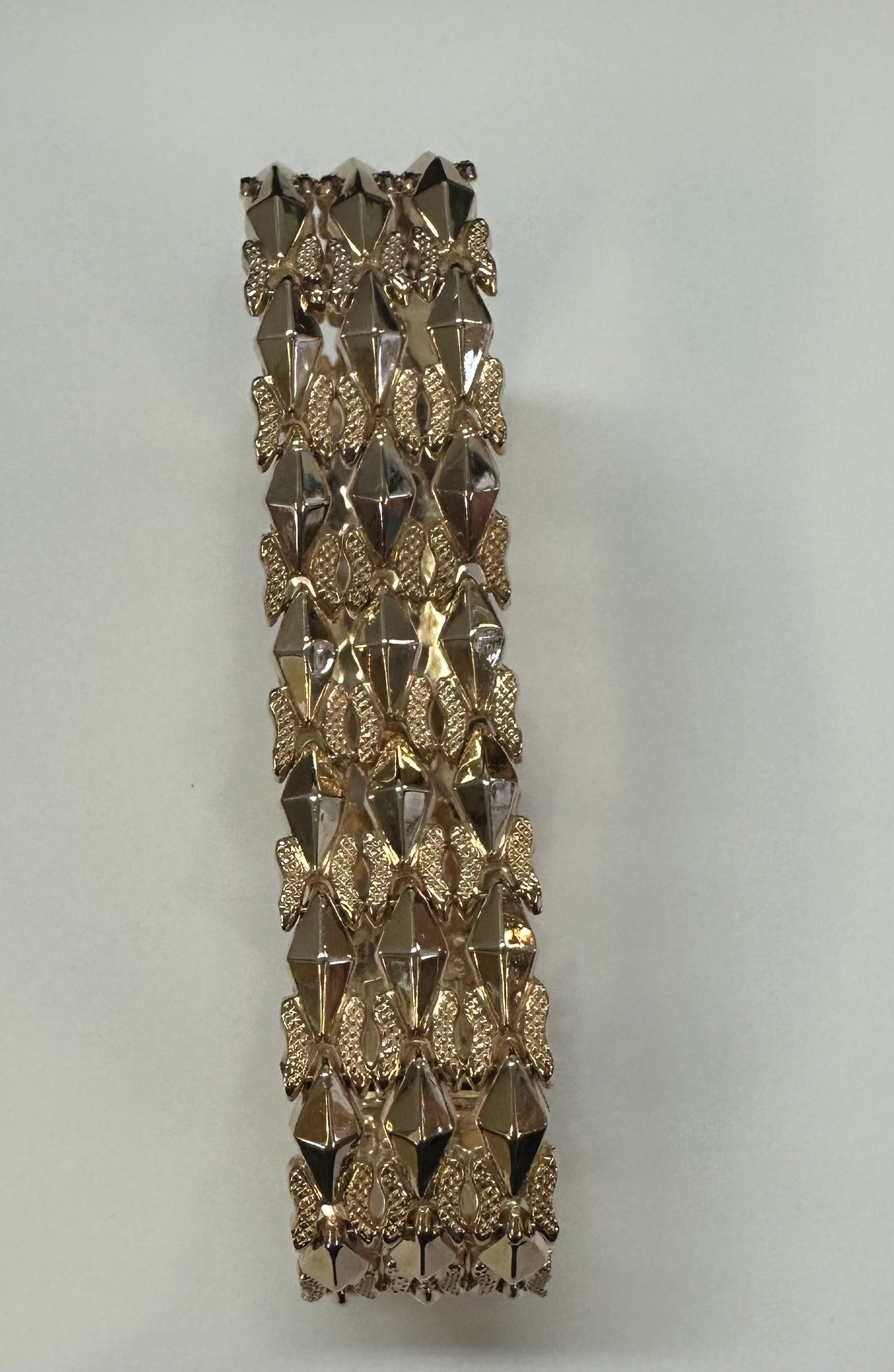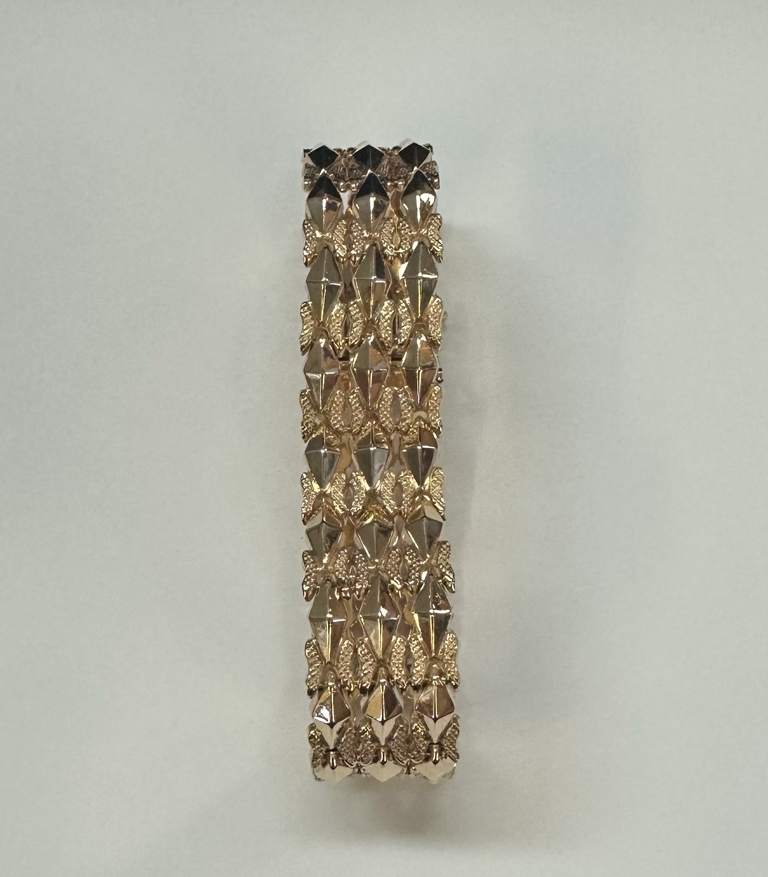 One-of-a-kind 18k rose gold three row diamond shaped link bracelet, 7 1/2”, 16 mm wide, 22.5 grams.