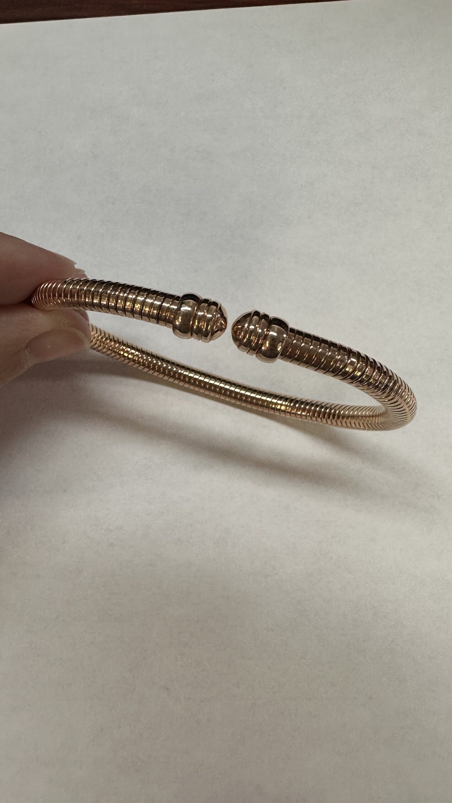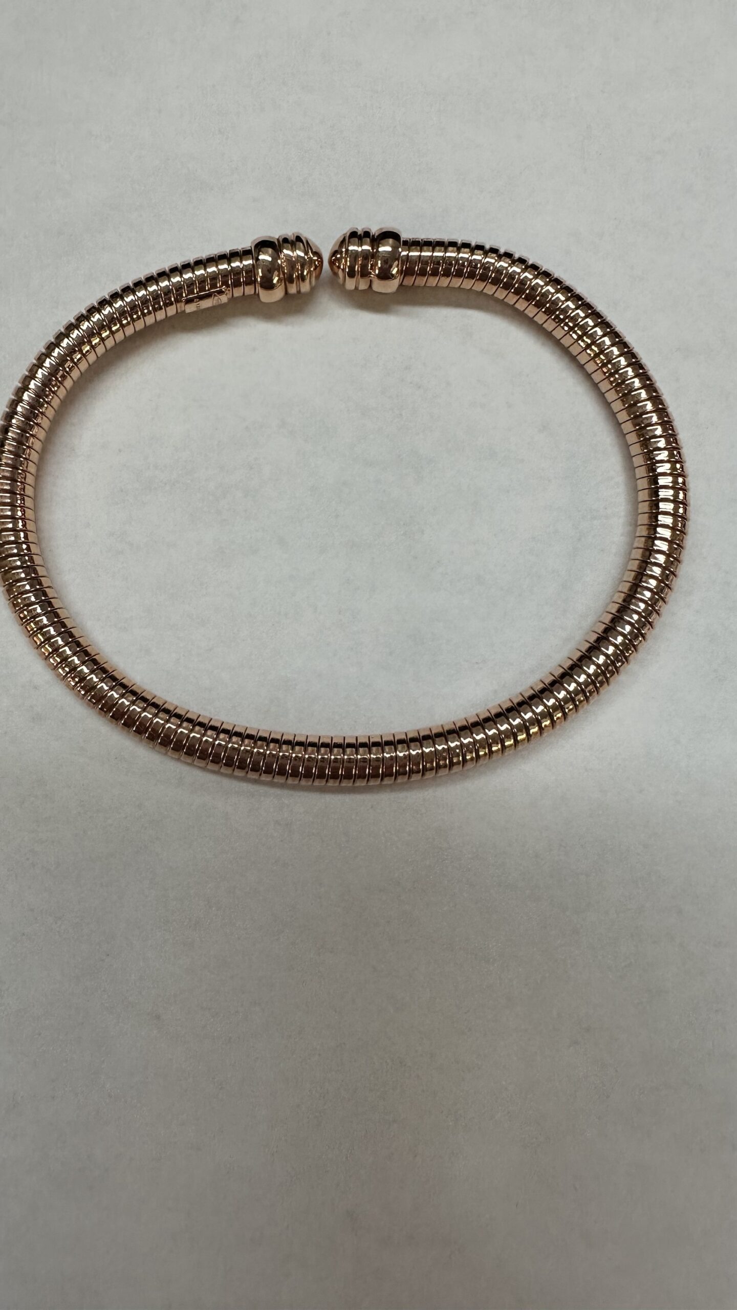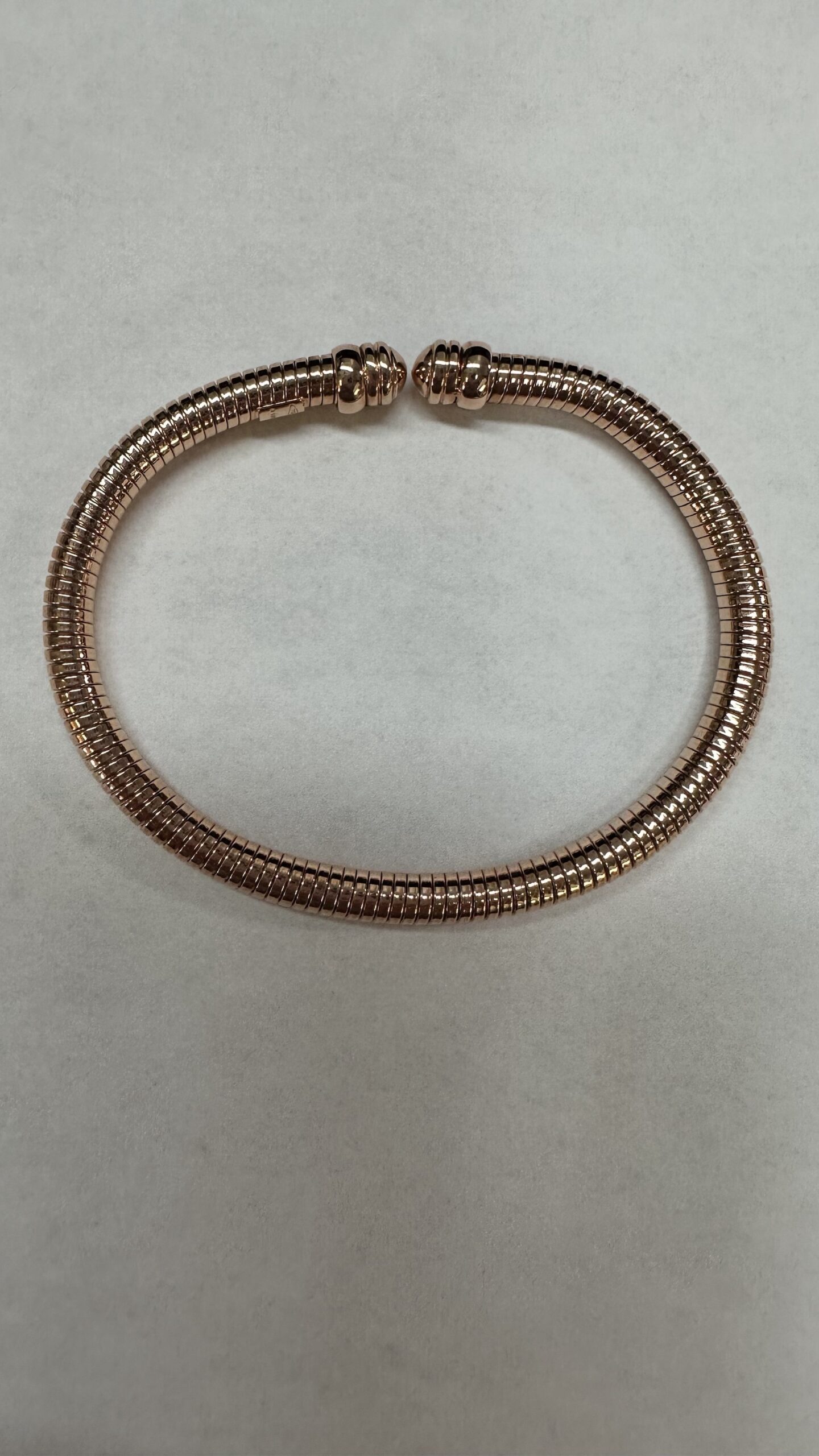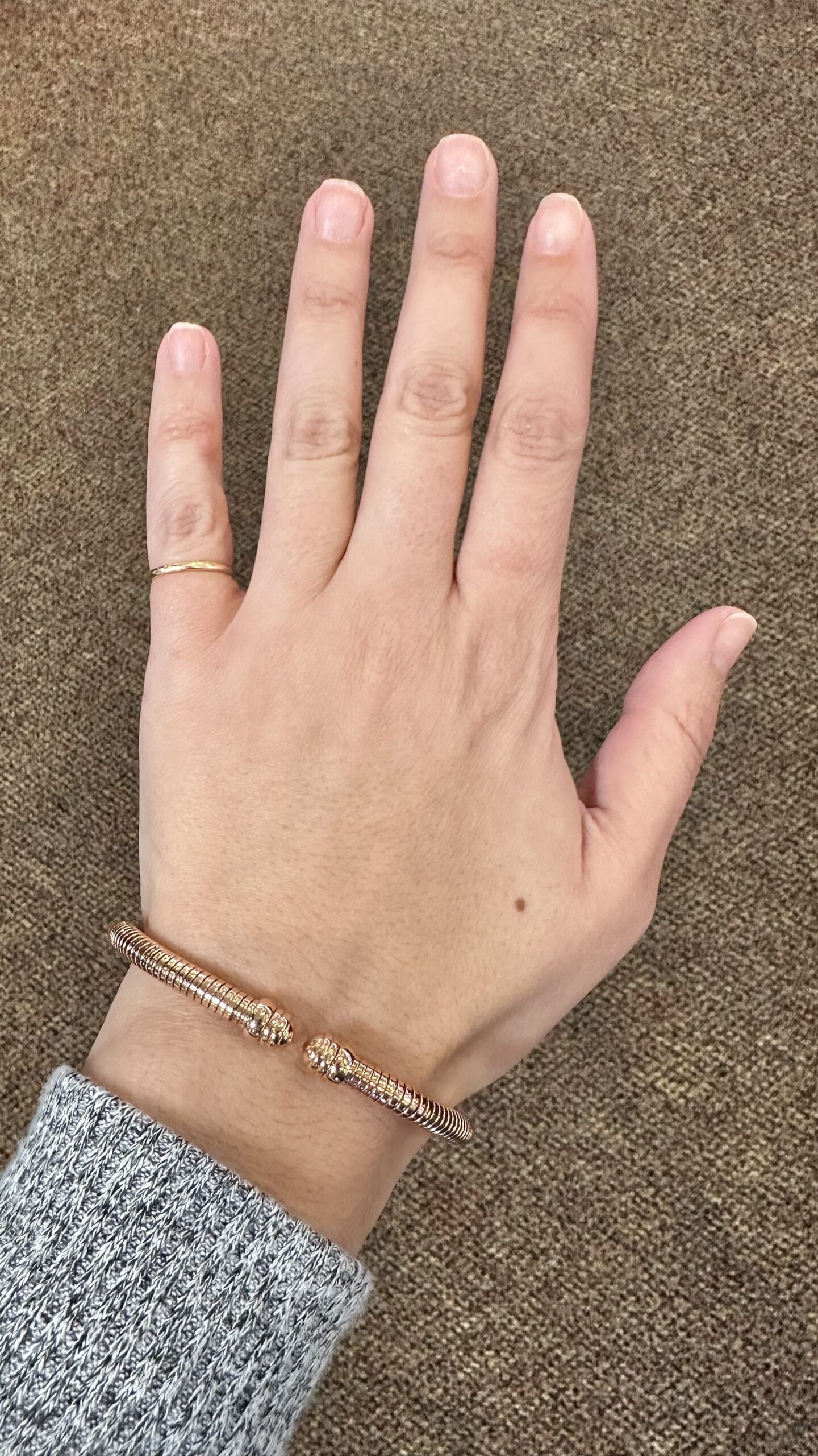 This one is SO comfortable! One-of-a-kind 18k rose gold flexible coil cuff style bracelet directly imported from Italy, 5 mm, 8” when measured all of the way around the outside, 17.67 grams.
