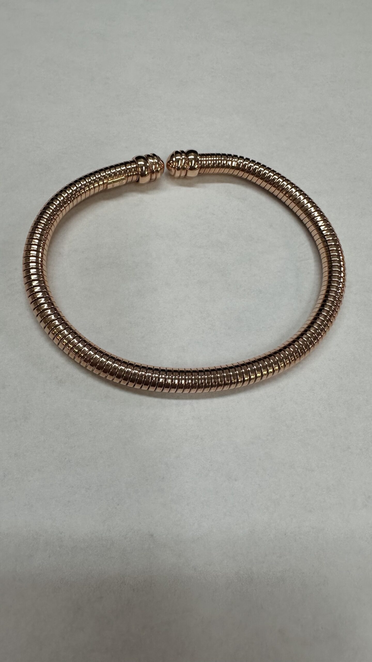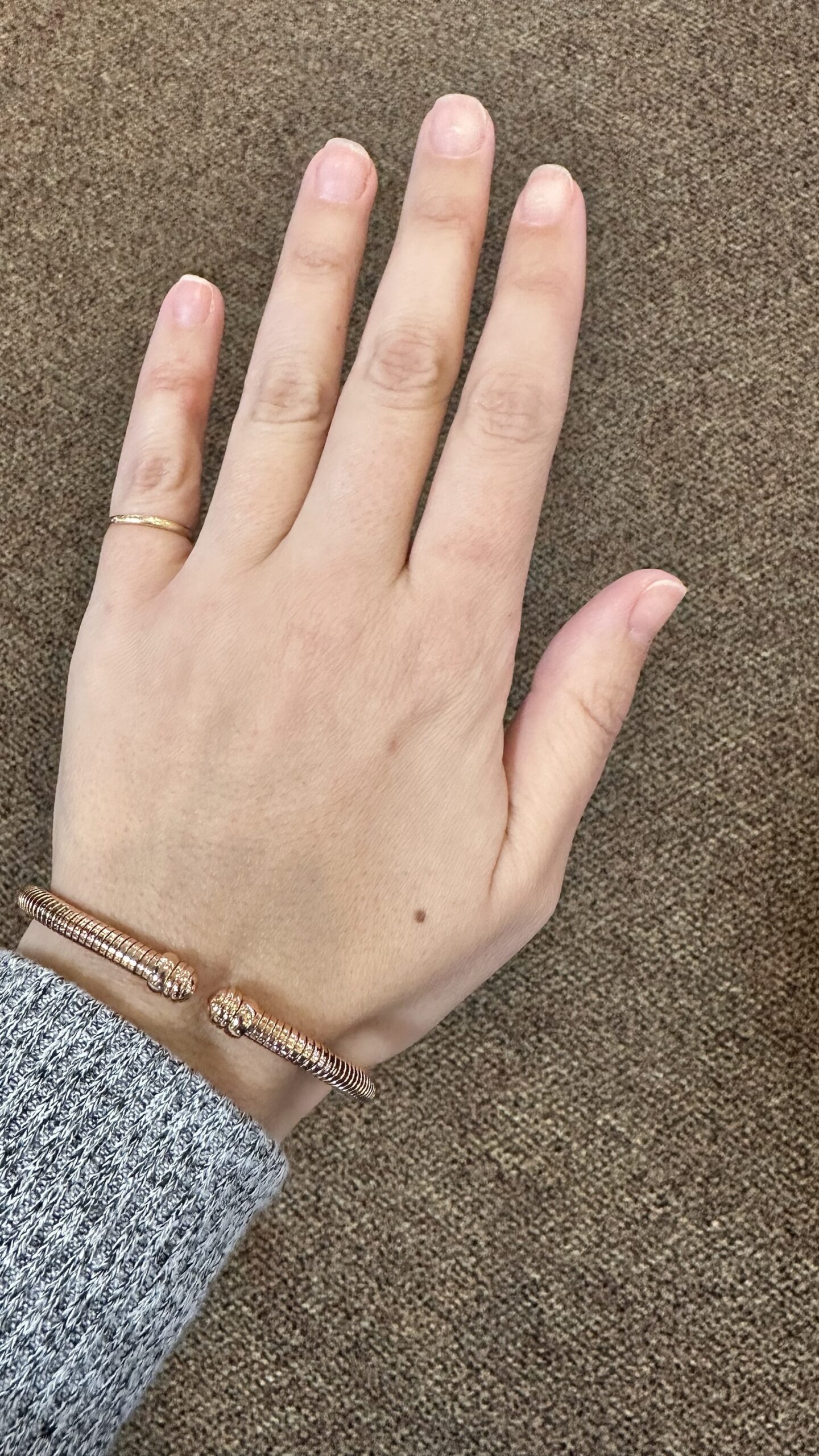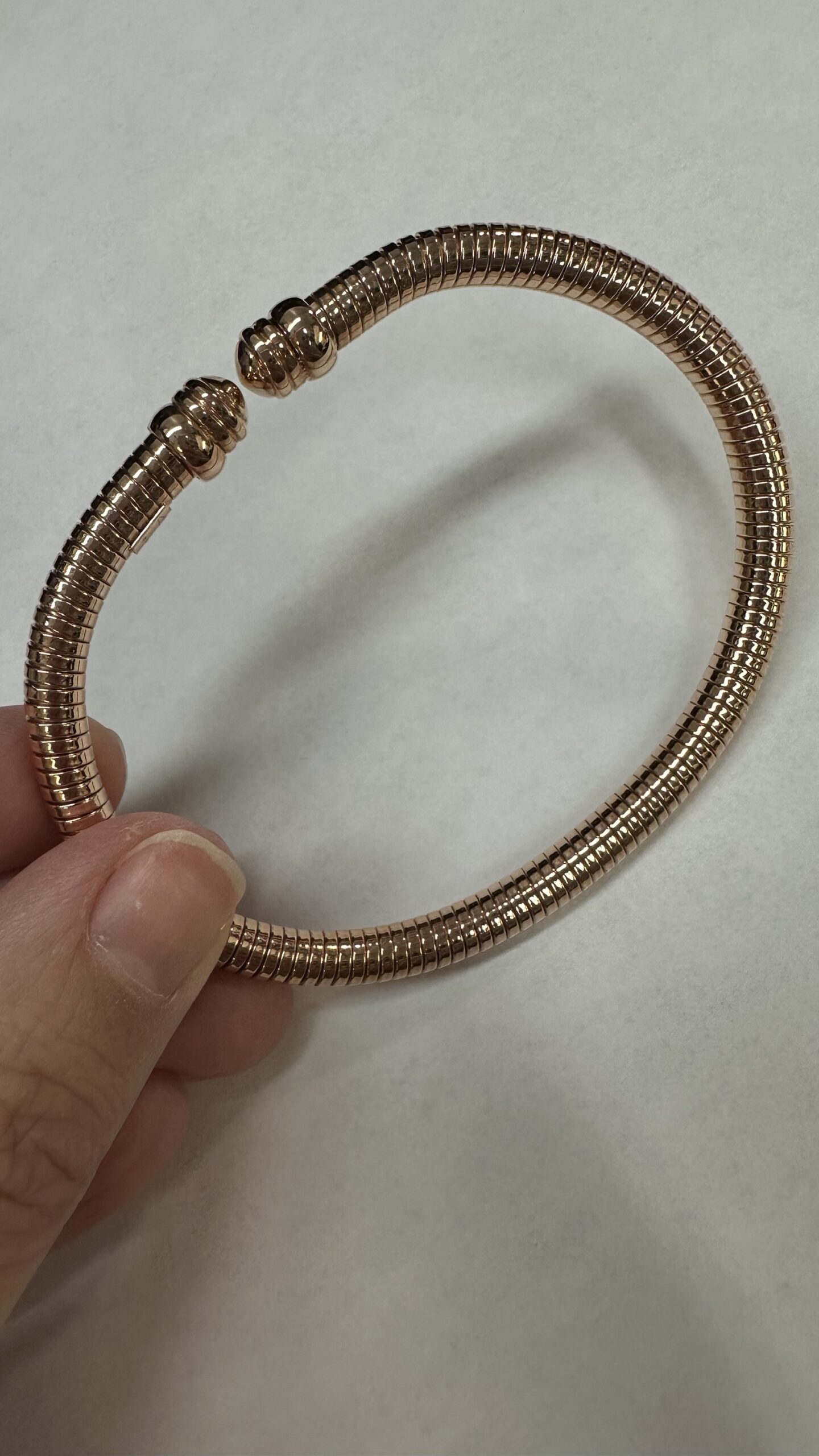 This one is SO comfortable! One-of-a-kind 18k rose gold flexible coil cuff style bracelet directly imported from Italy, 5 mm, 8” when measured all of the way around the outside, 17.67 grams.