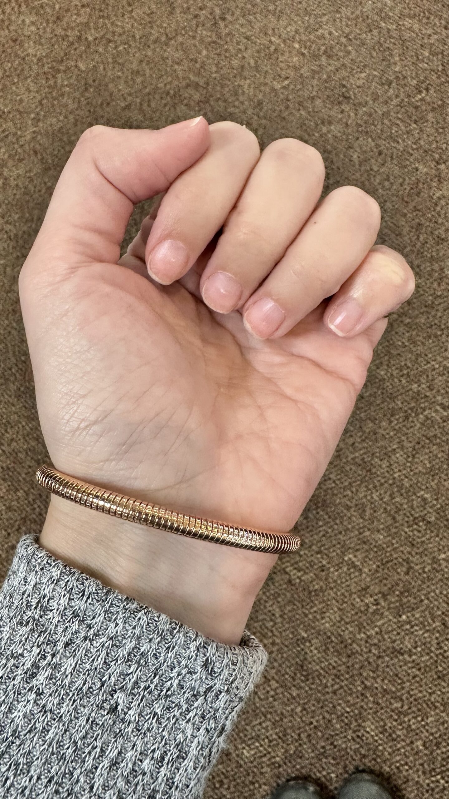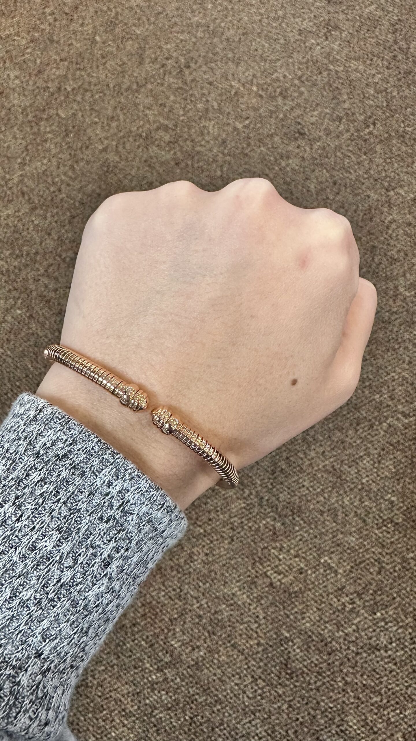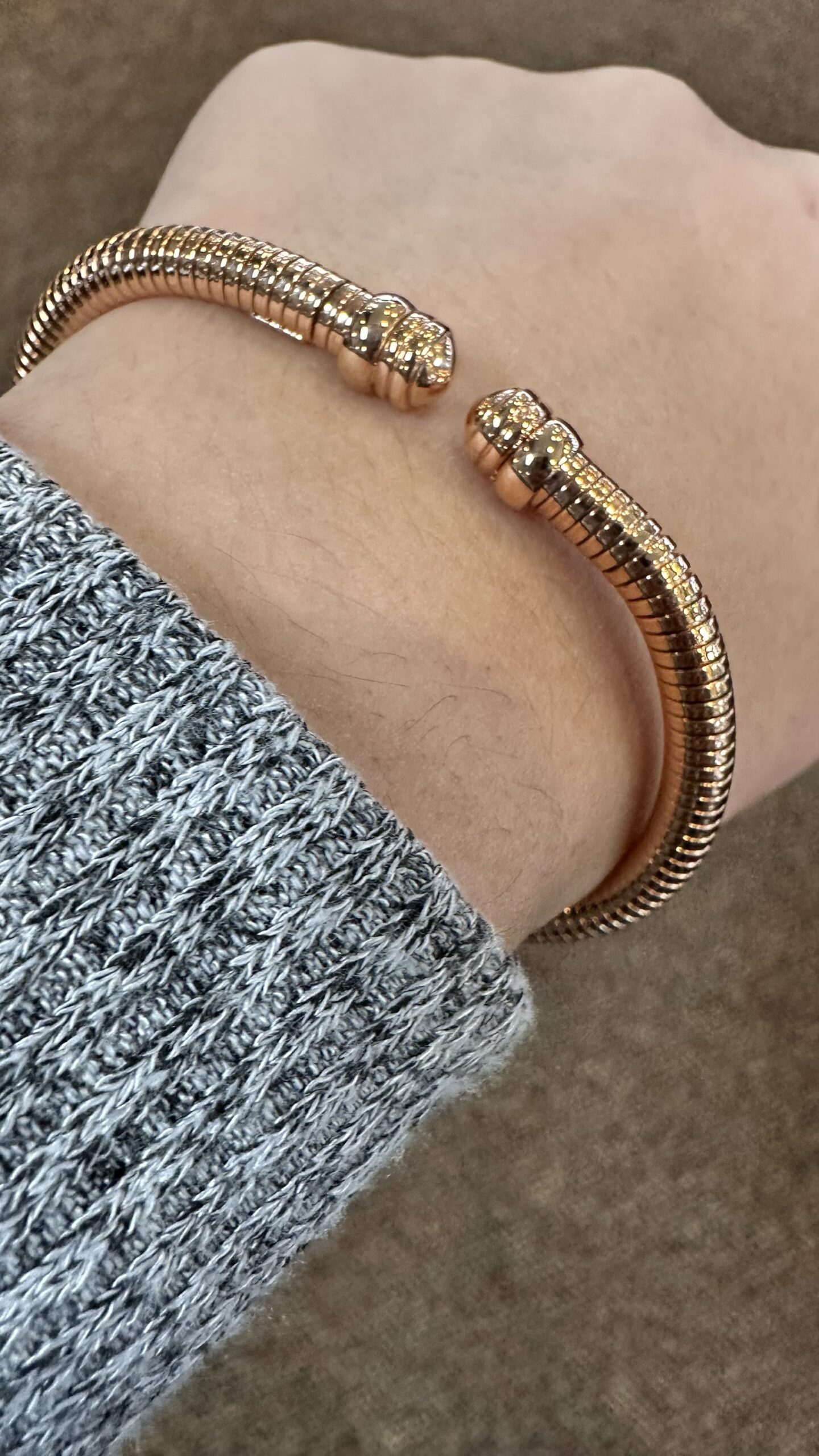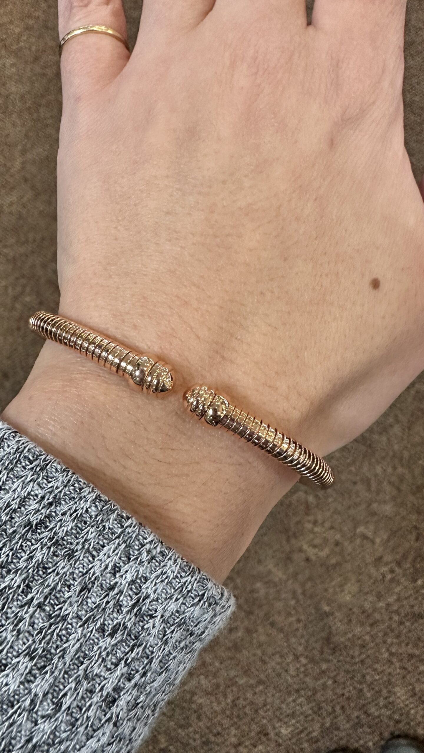 This one is SO comfortable! One-of-a-kind 18k rose gold flexible coil cuff style bracelet directly imported from Italy, 5 mm, 8” when measured all of the way around the outside, 17.67 grams.
