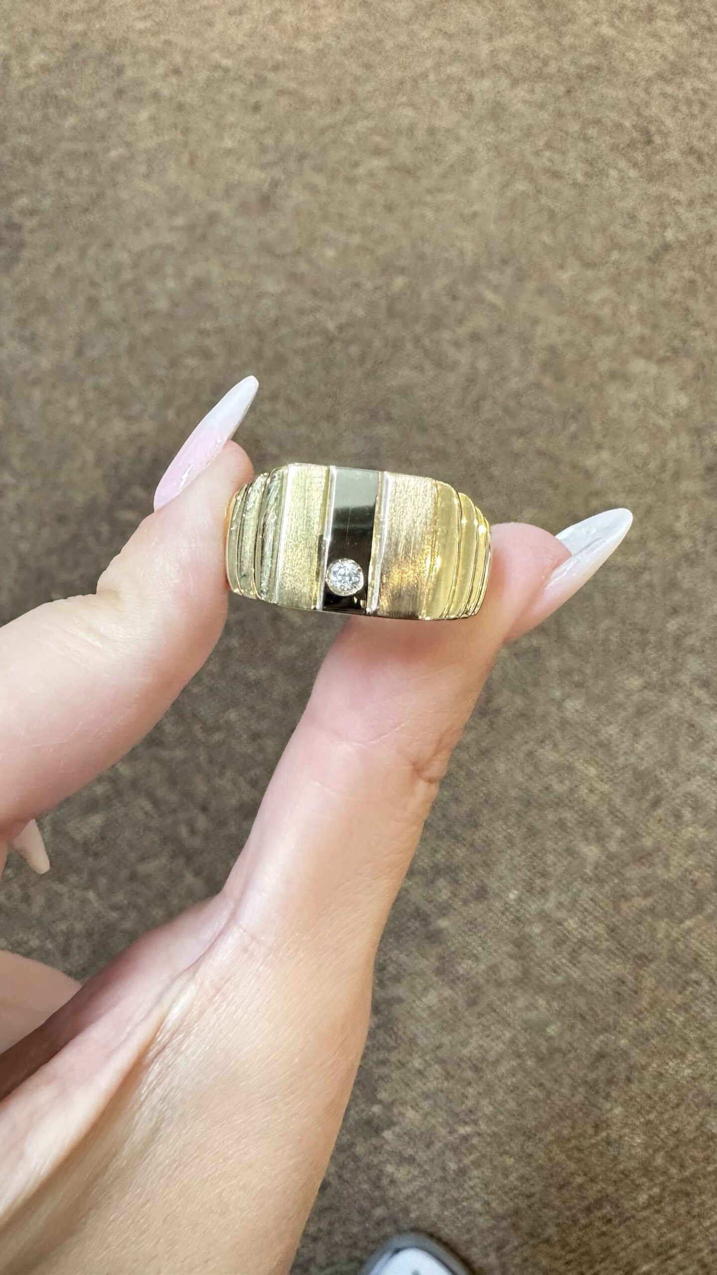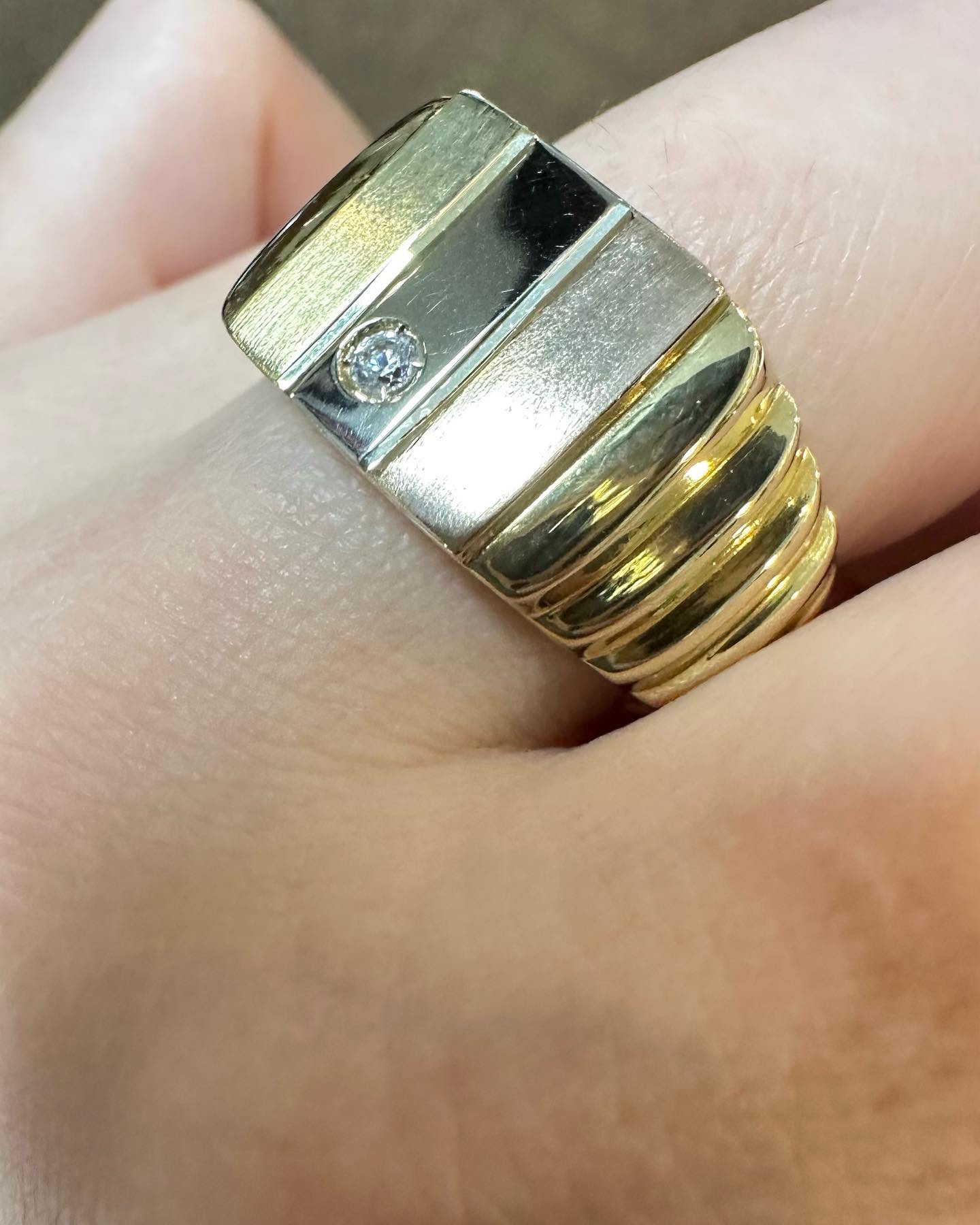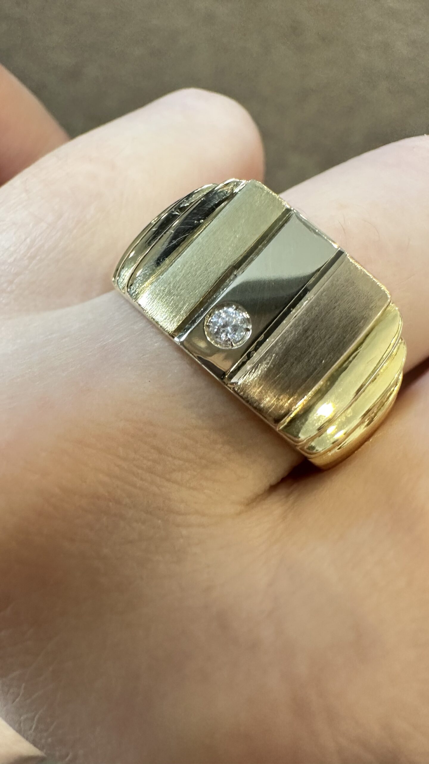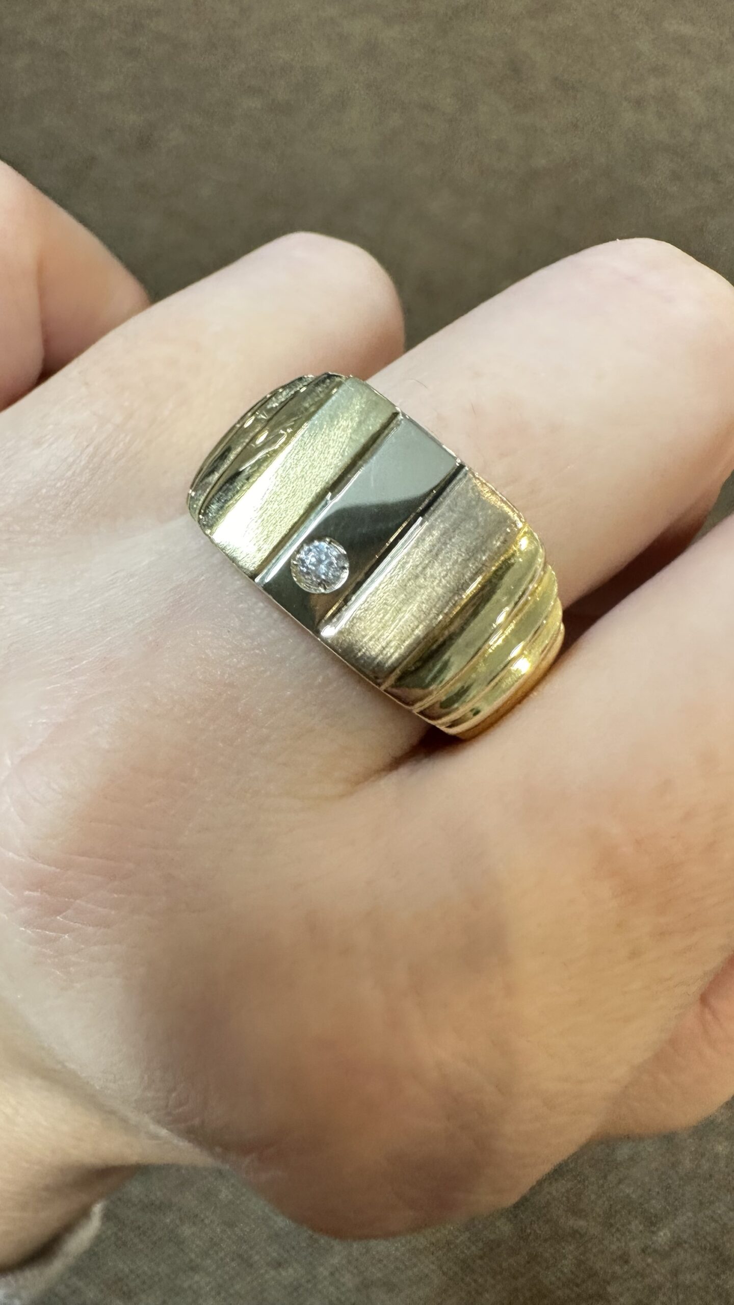 18k tri-color gent’s ring with CZ accent, size 13 (sizeable), 10.9 grams.