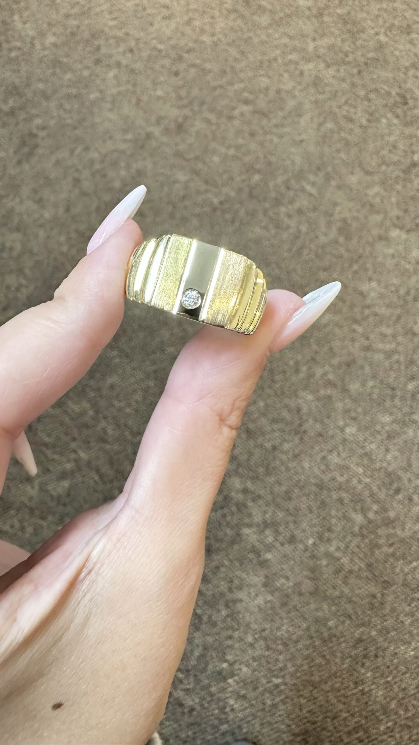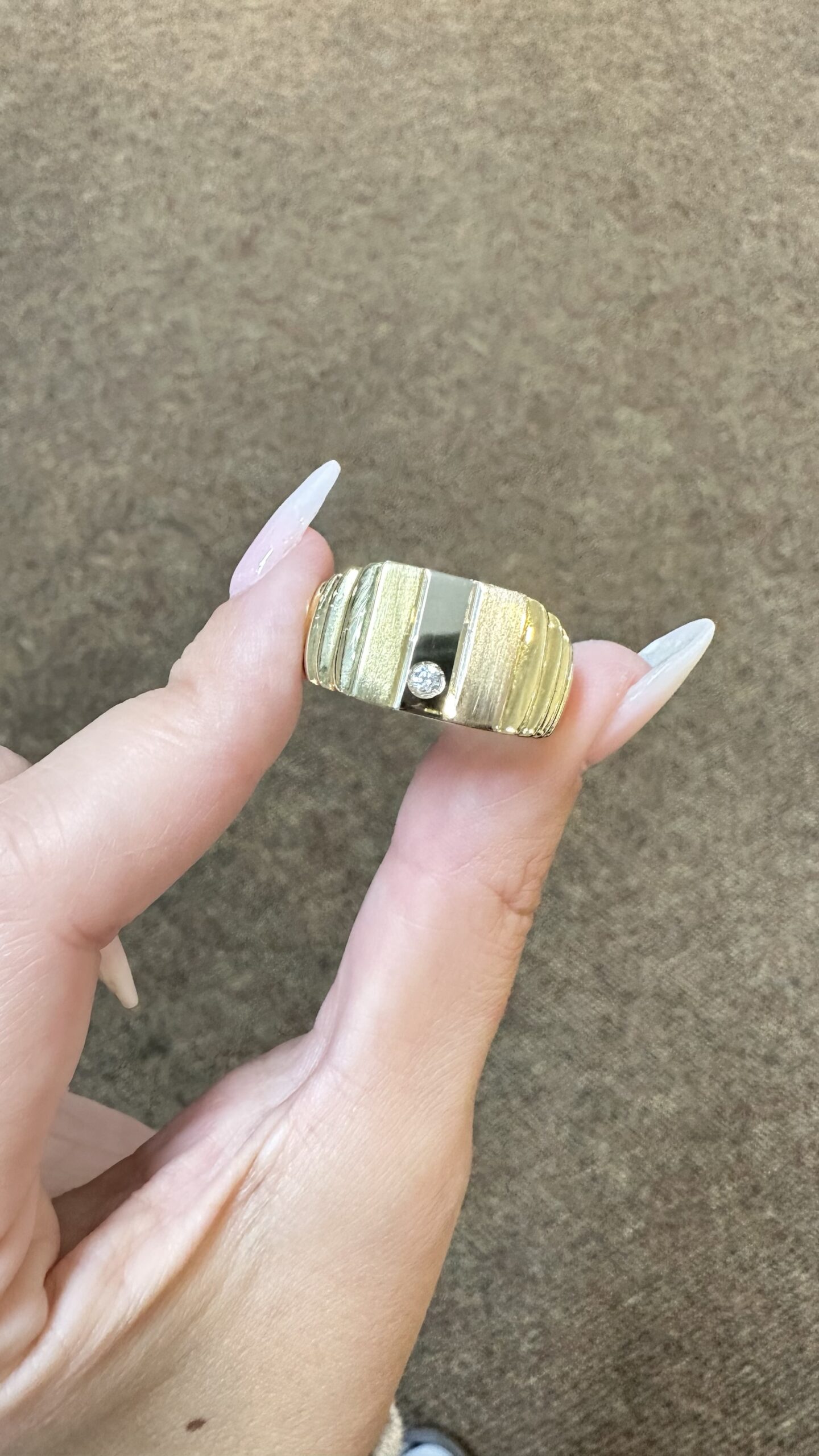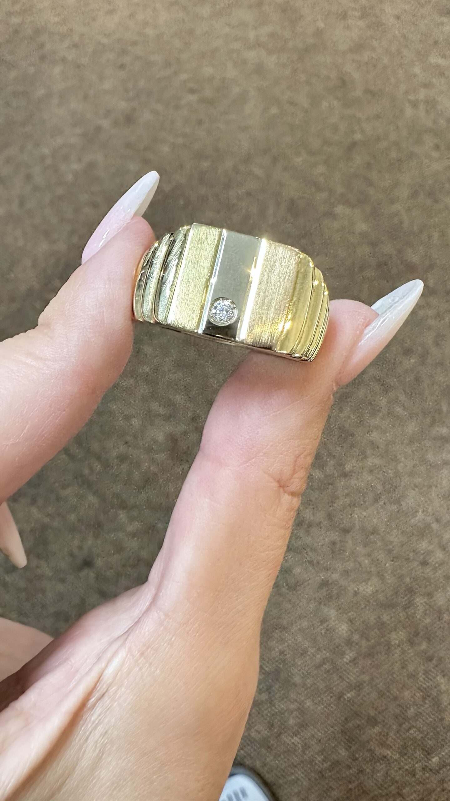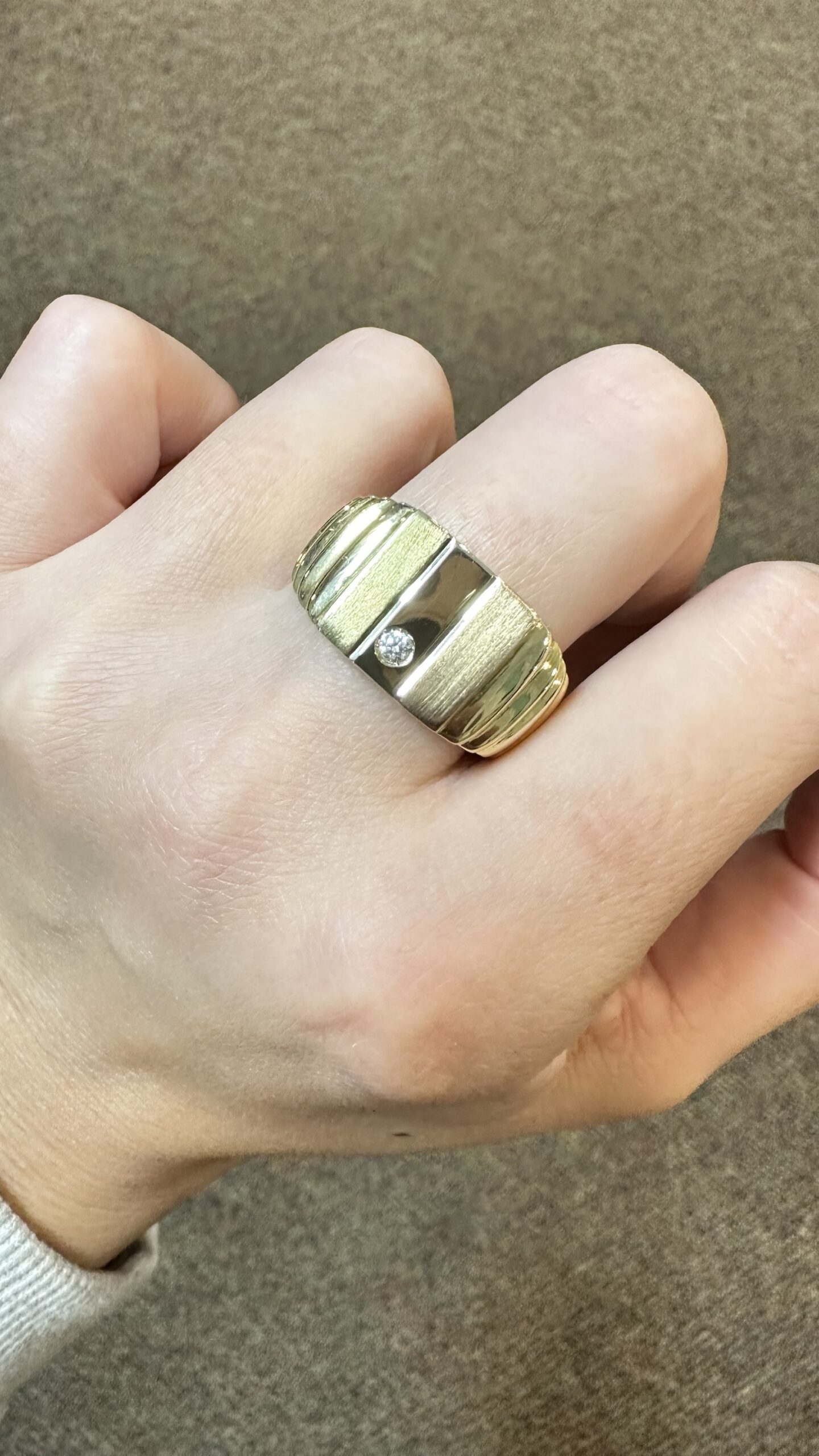 18k tri-color gent’s ring with CZ accent, size 13 (sizeable), 10.9 grams.