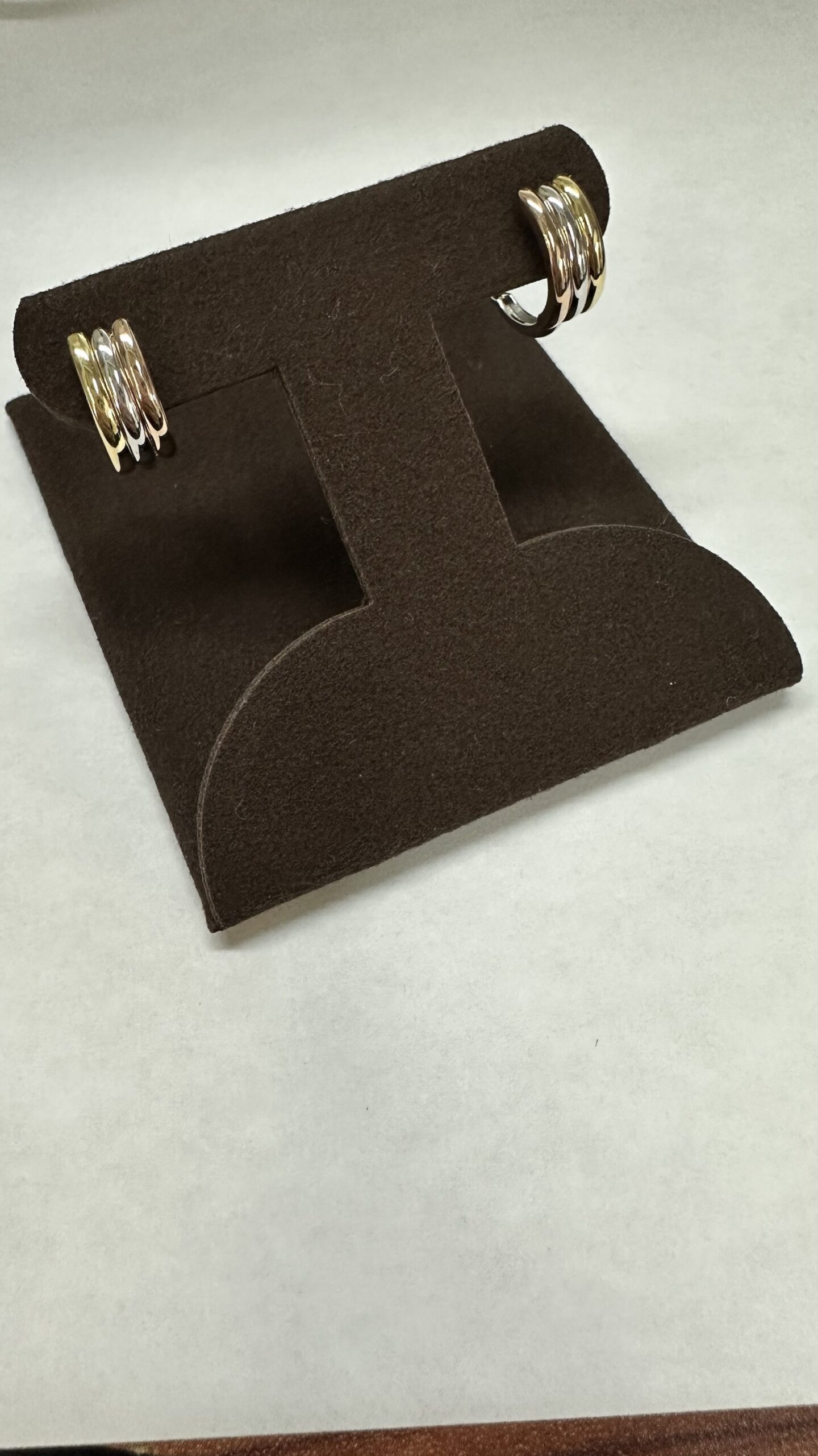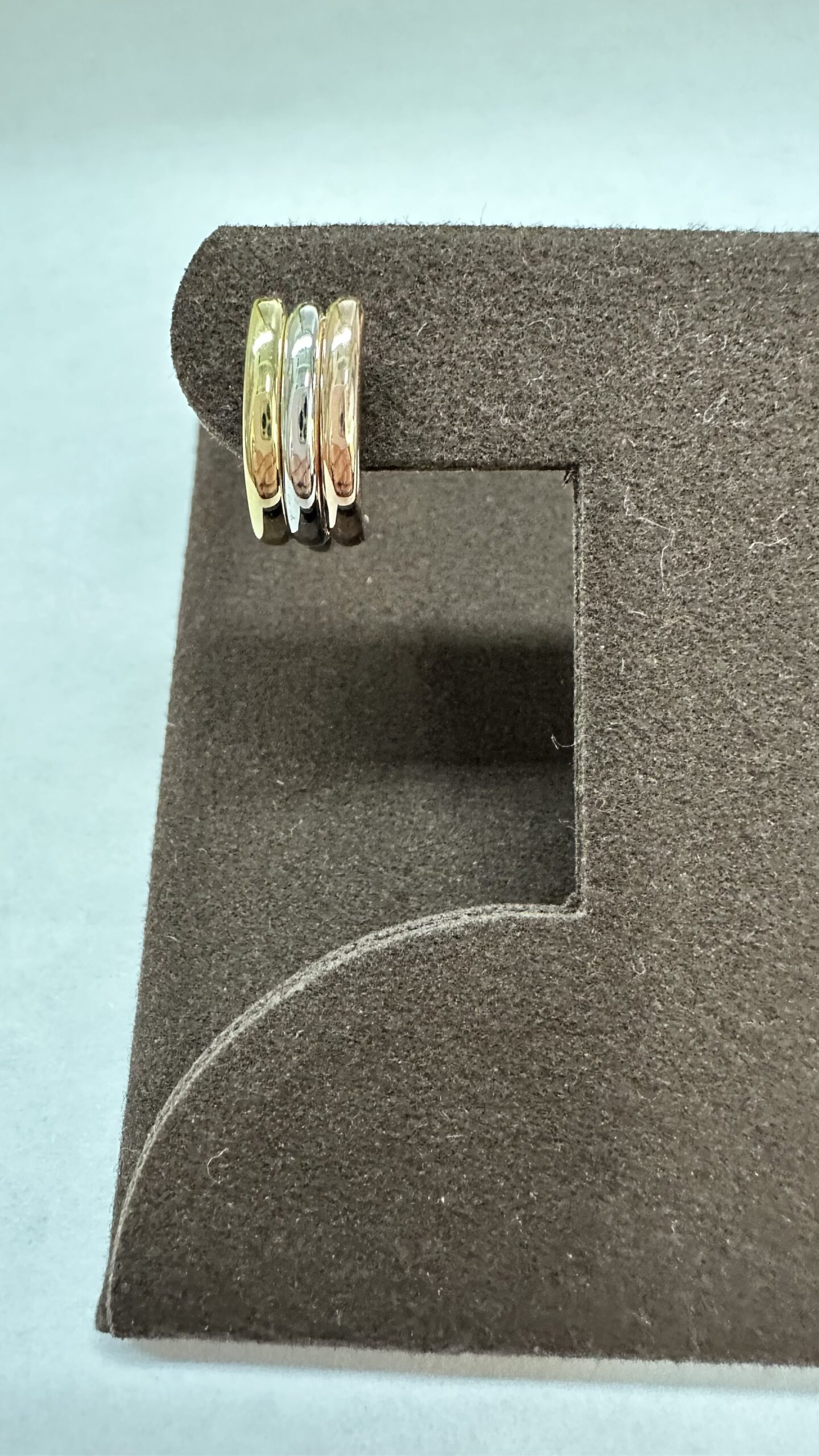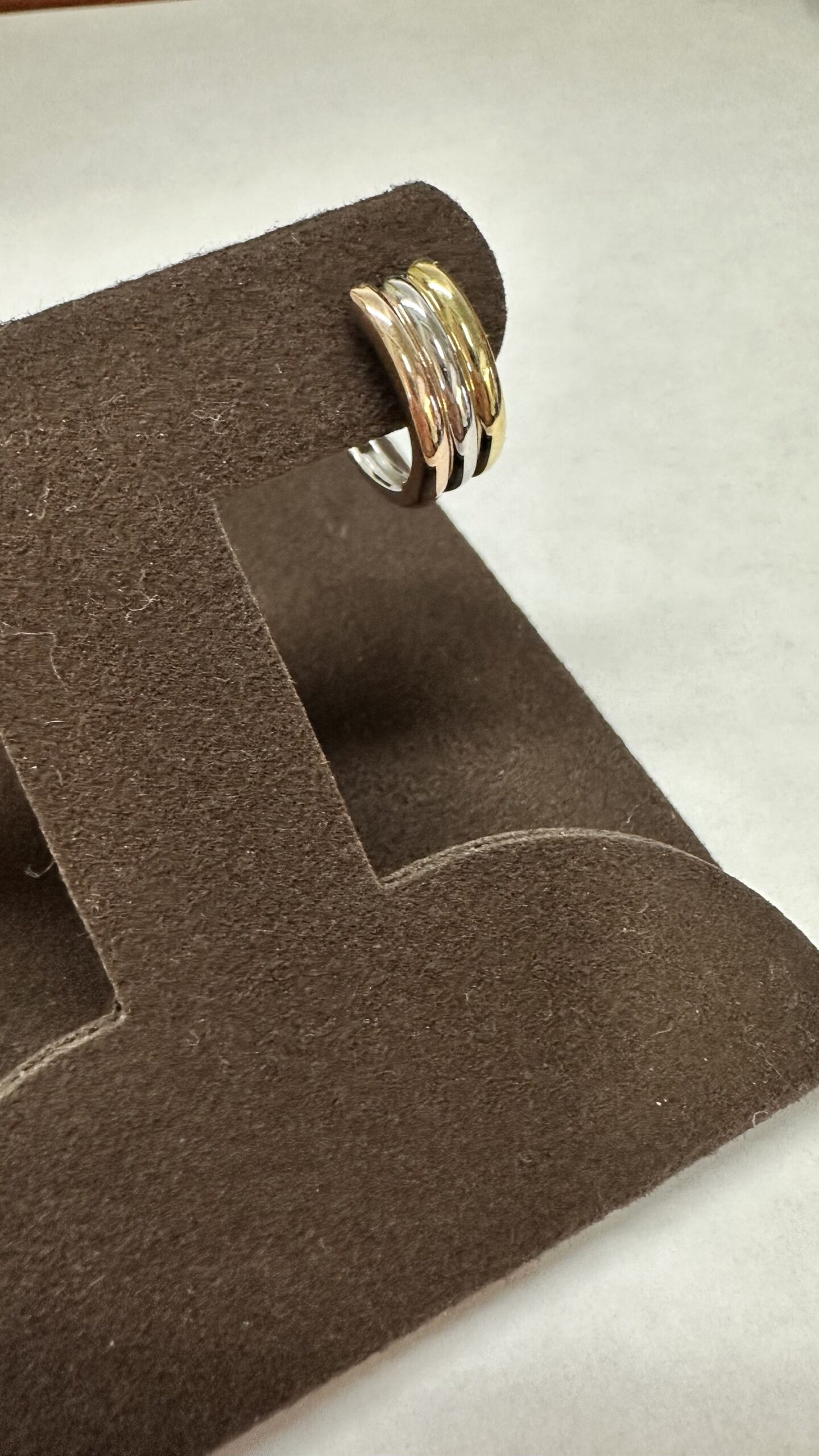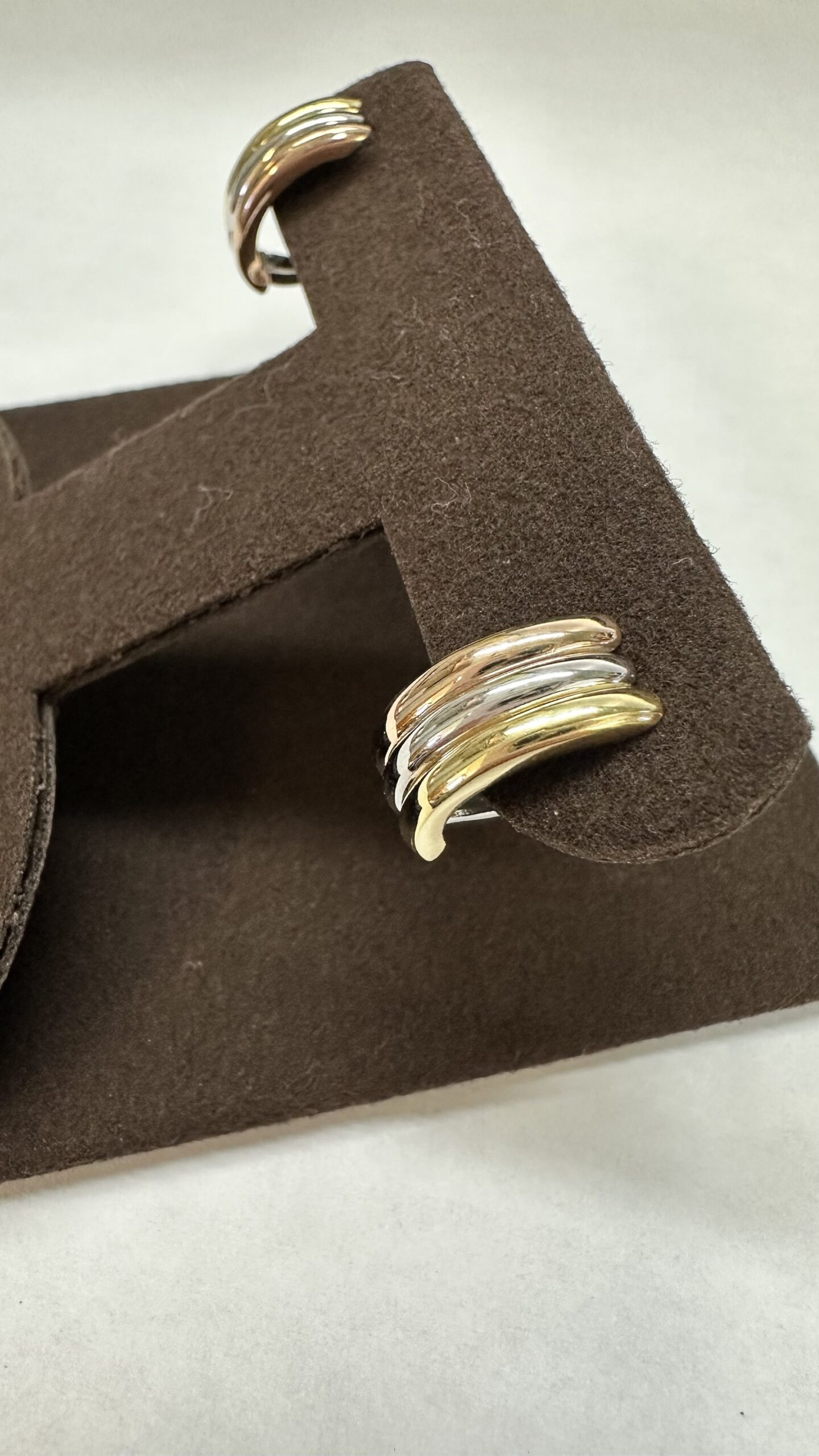 One-of-a-kind 18k tri-color huggy style hoop earrings directly imported from Italy, 12.5 x 14 mm, 3.63 grams.