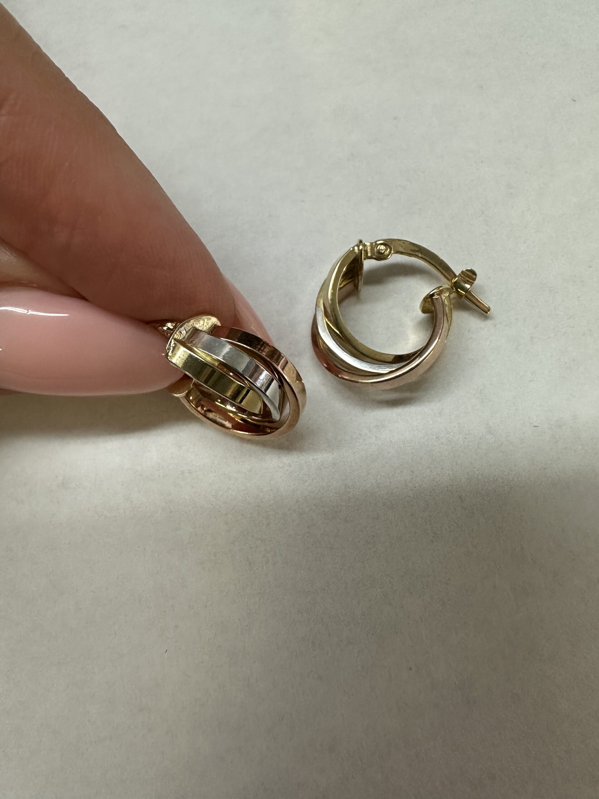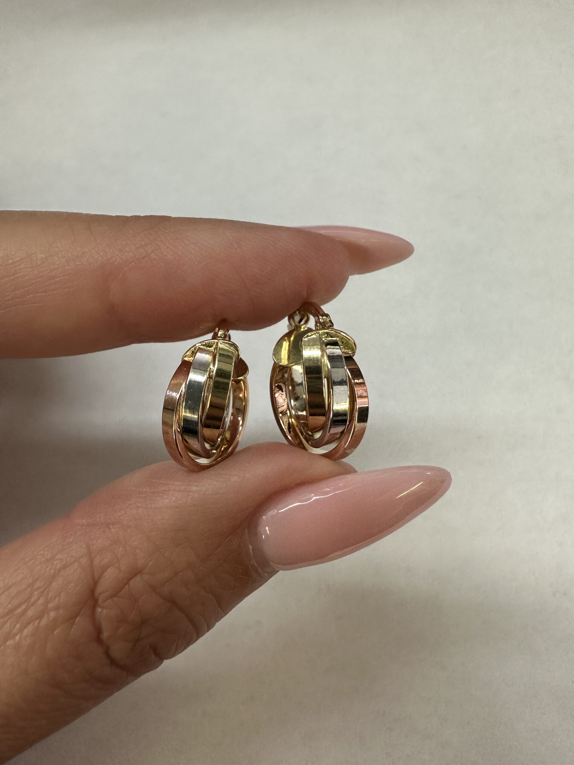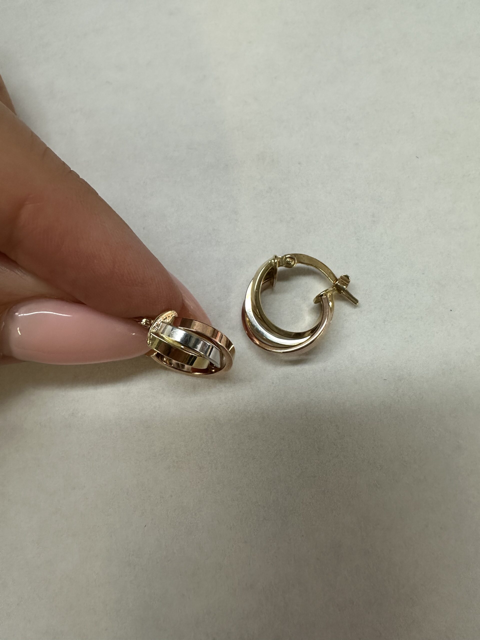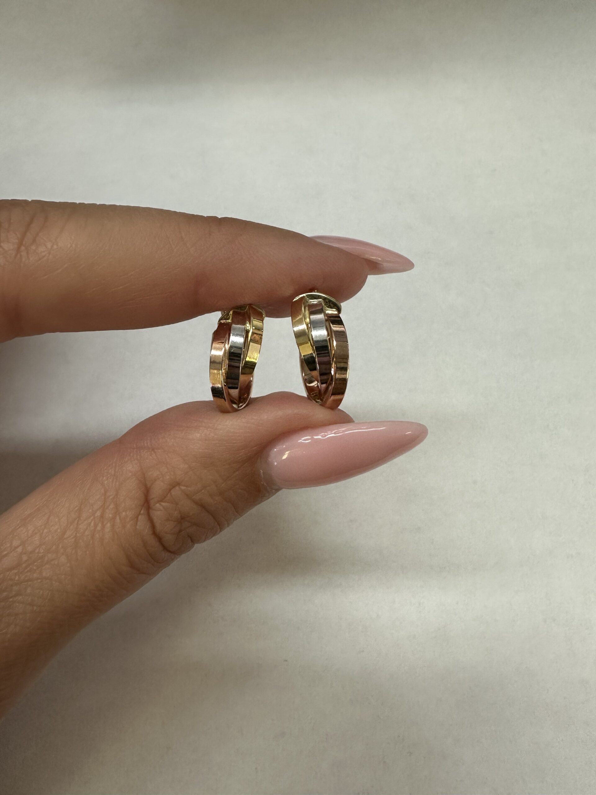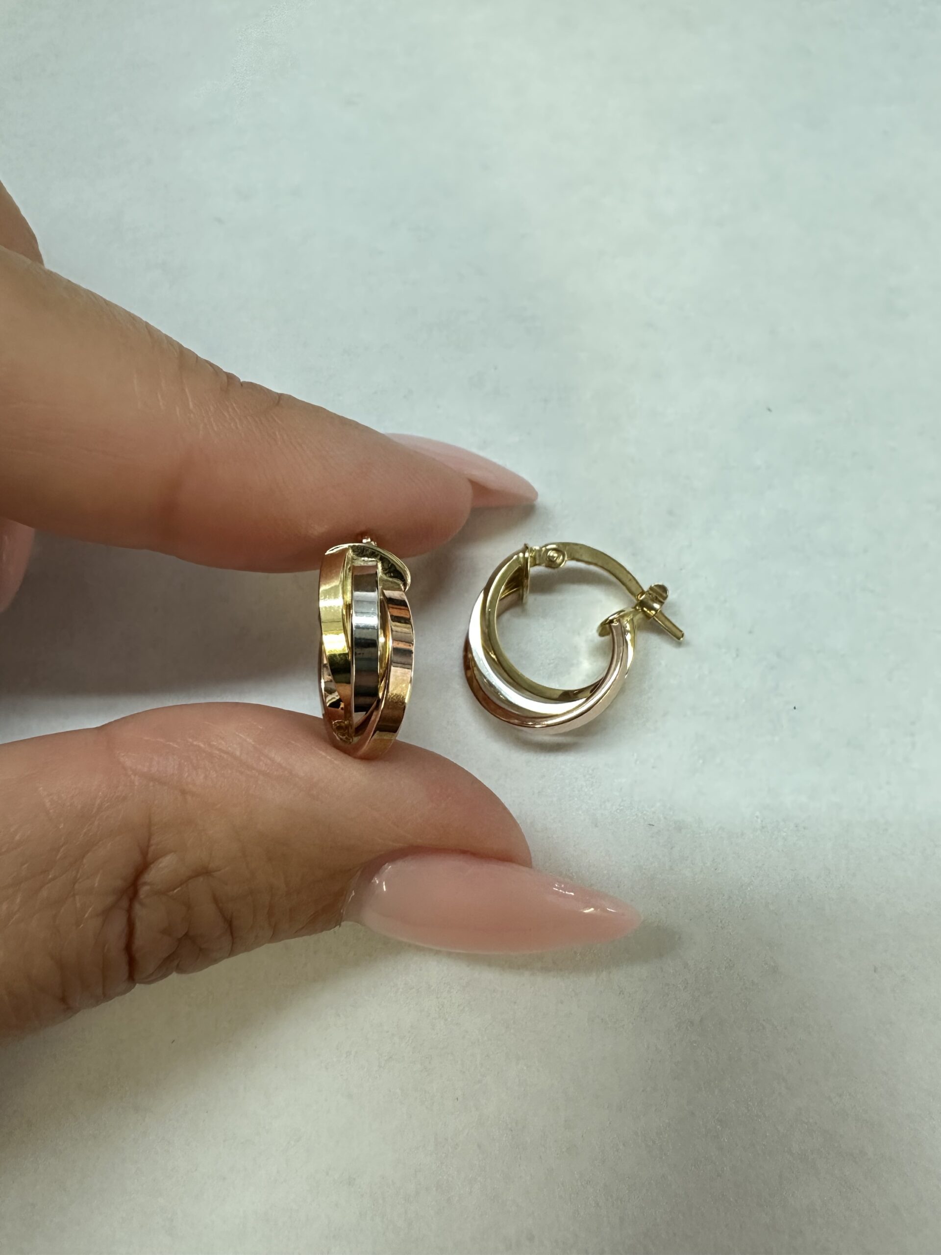 One-of-a-kind 18k tri-color gold small hoop earrings directly imported from Italy. These earrings measure 6 x 12.5 mm in size, and they have an entire weight of 2.31 grams.